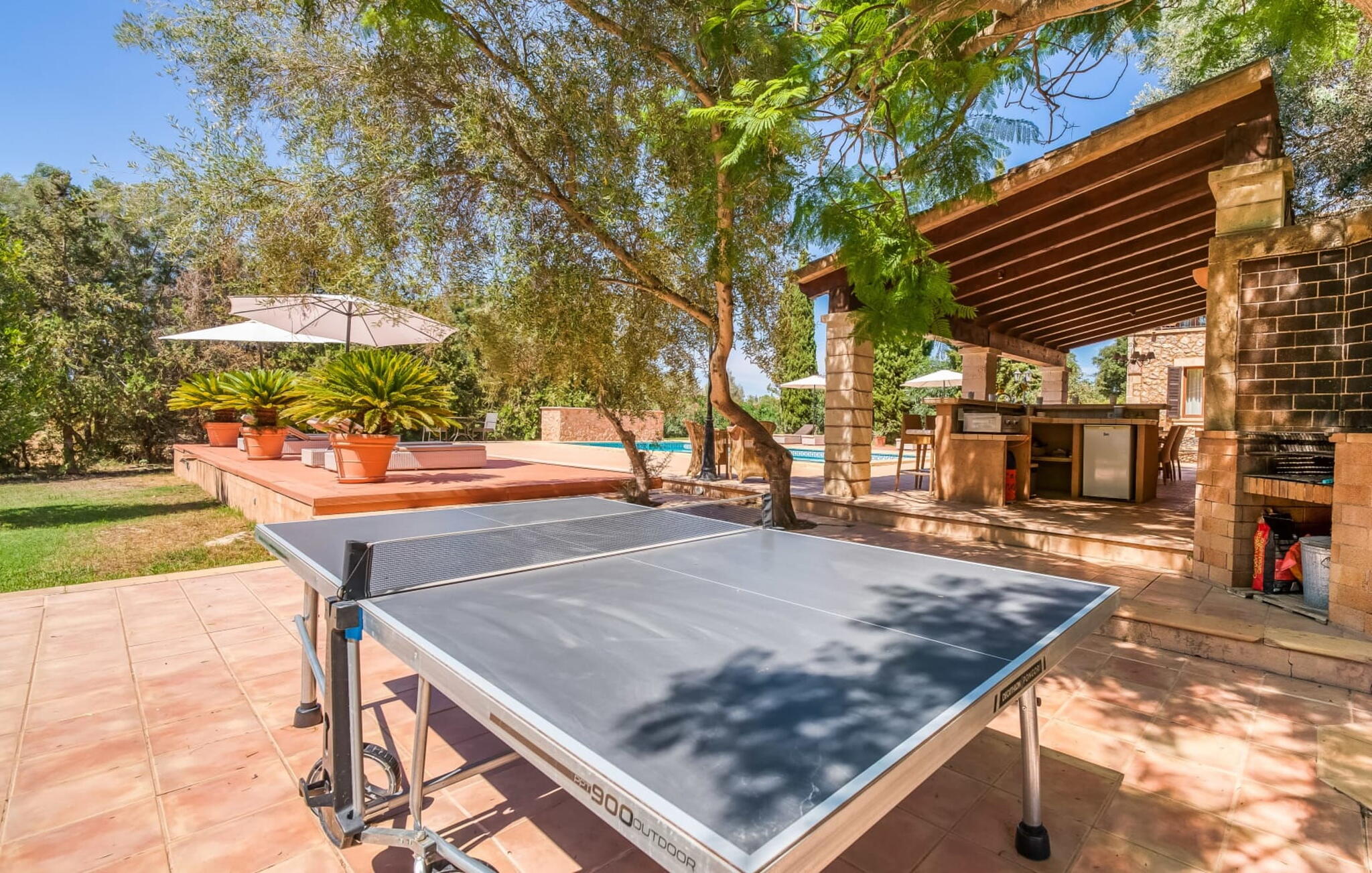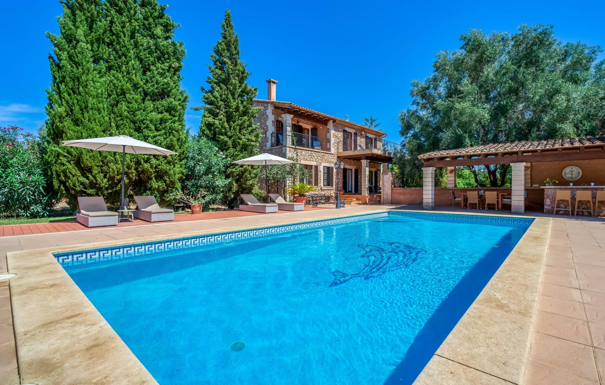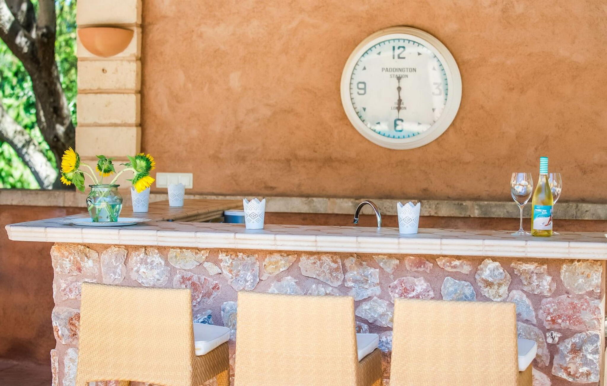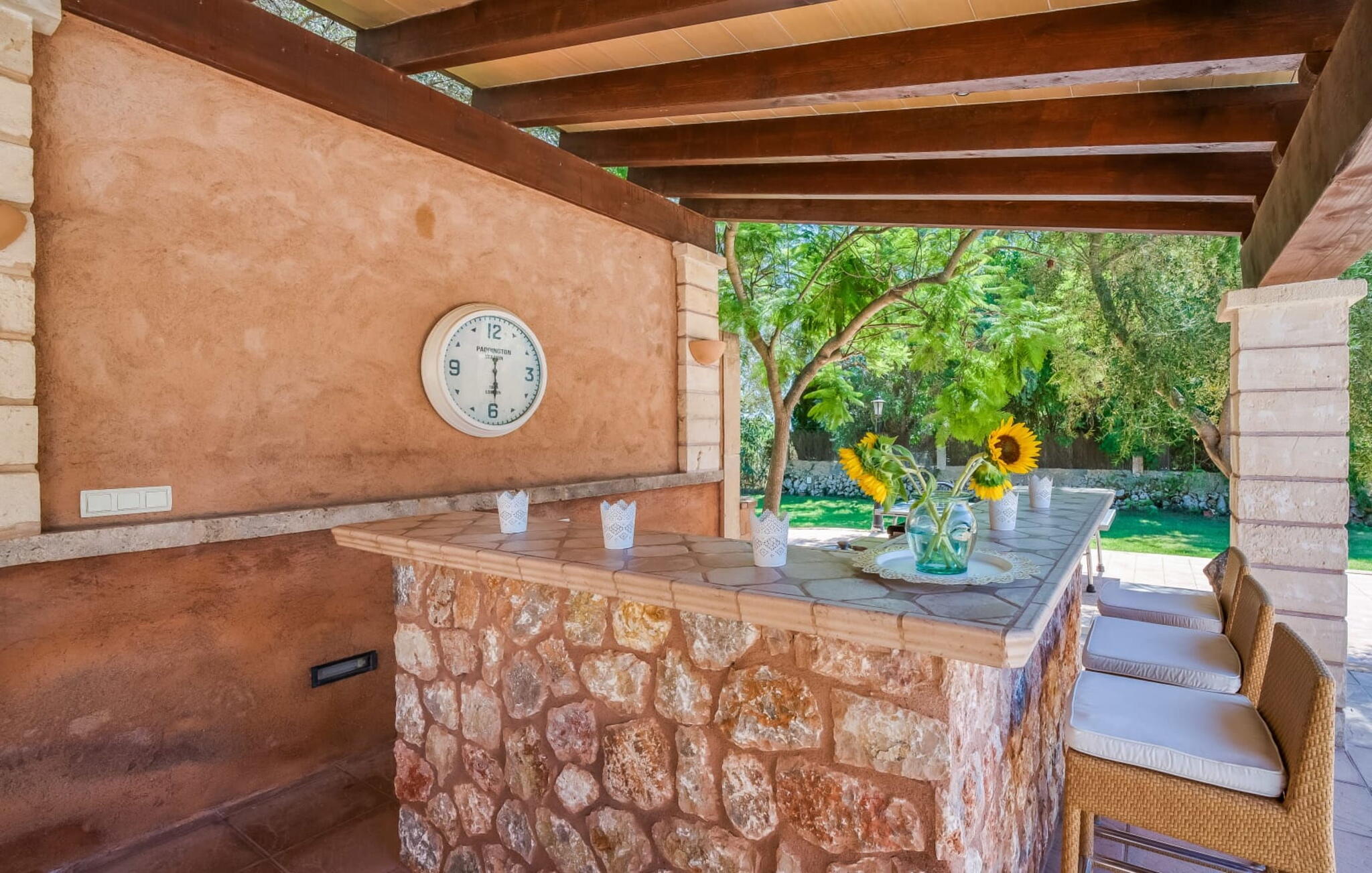 Een Mallorcaanse droomvilla, gebouwd van natuursteen en omgeven door een ruime en goed onderhouden tuin - dat en nog veel meer is Villa Gran Sueno. Het biedt plaats aan maximaal acht personen en twee baby`s. Het prachtige huis met rustieke zuilen heeft twee grote balkons, waarvan een overdekt, en vanaf elk kun je genieten van het uitzicht op de zee, die op slechts 3 kilometer afstand ligt. Bovendien word je verleid door de azuurblauwe schittering van het zwembad, dat wordt omringd door een opmerkelijk terras. Hier kun je een paar baantjes trekken of afkoelen van de zomerhitte voordat je gaat liggen op een van de comfortabele ligstoelen of een mooi plekje in de schaduw vindt - wat dacht je van de gezellige rieten stoelen in de buitenkeuken? De bar met bijbehorende barkrukken wacht op je om `s avonds te genieten van een cocktail of een koude cerveza of twee terwijl je uitkijkt over het verlichte zwembad.