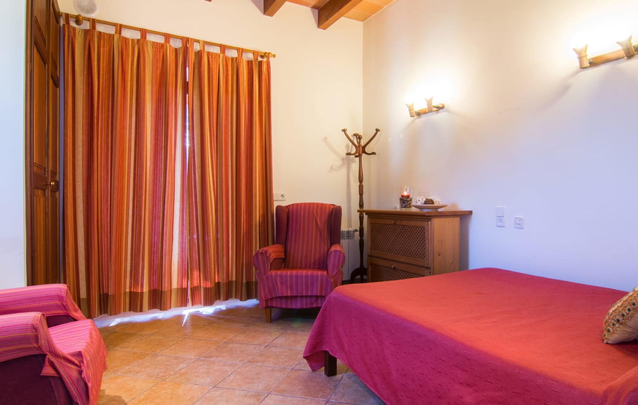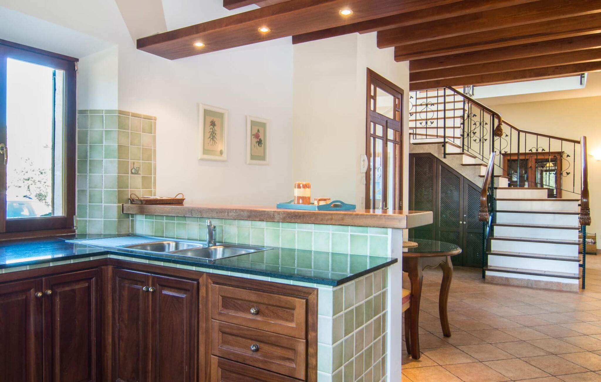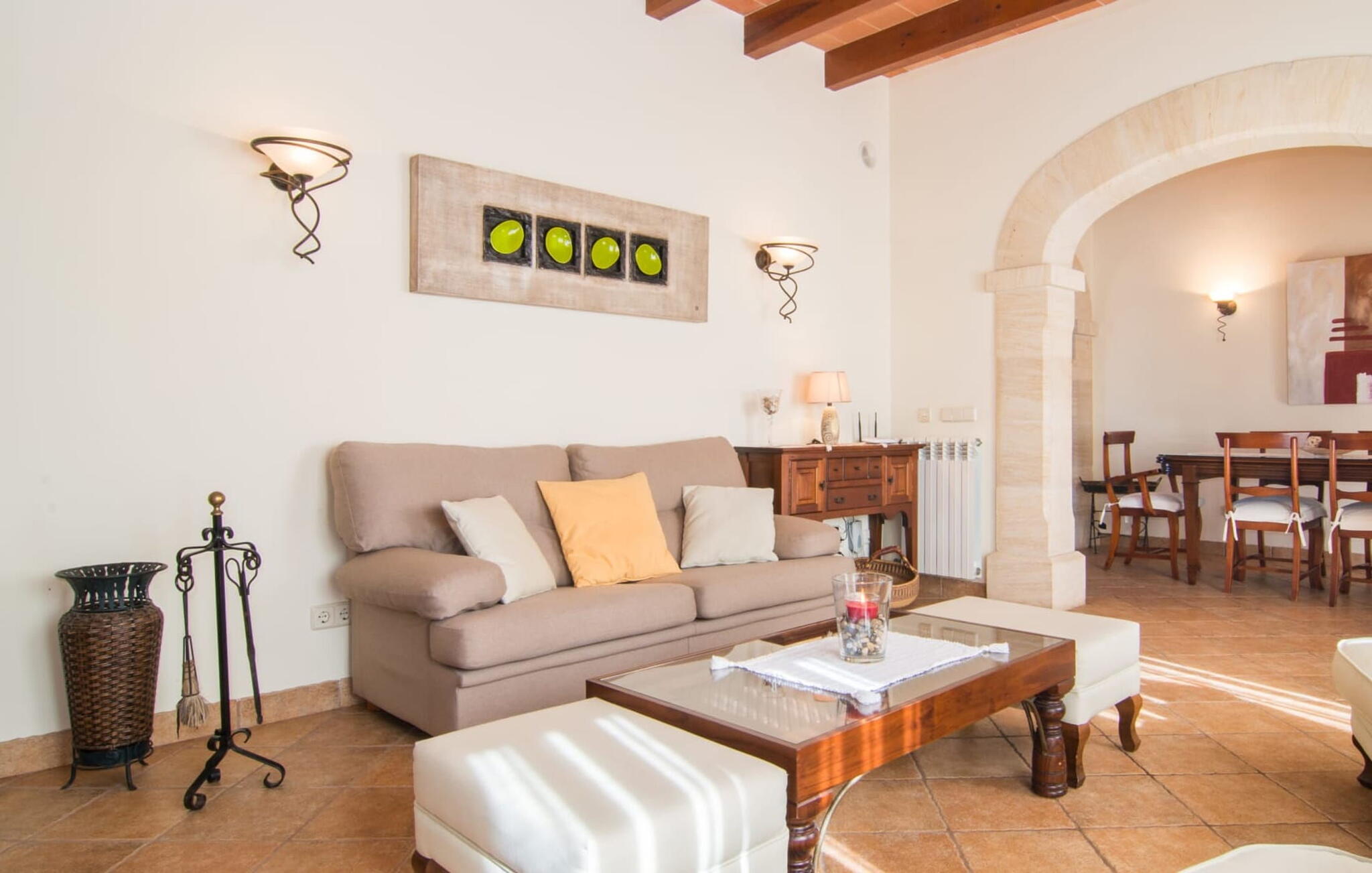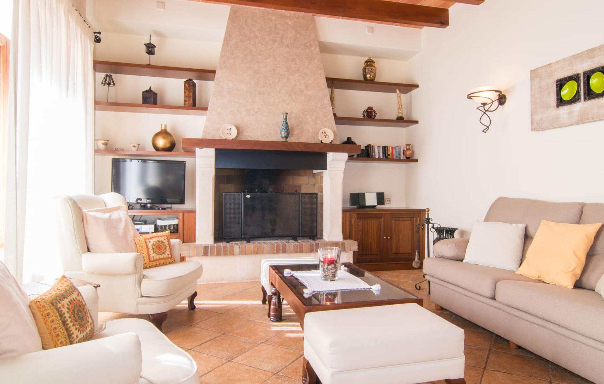 Het interieur van de villa is indrukwekkend: de inrichting is tot in het kleinste detail liefdevol gemodelleerd naar de klassieke Mallorcaanse stijl. Er zijn grote tegels in elke kamer, evenals warm, donkerbruin hout, lichtgekleurde muren en smaakvolle lampen. De begane grond heeft een open ontwerp en stenen bogen verbinden esthetisch de zeer goed uitgeruste keuken, de gezellige eethoek en de woonkamer met zijn extreem zacht gestoffeerde meubels, die rond de eigen open haard van het huis is gerangschikt. Op koudere avonden kun je hier vele aangename uren doorbrengen bij het knisperende haardvuur. Een van de vier tweepersoonsslaapkamers van de villa bevindt zich op de benedenverdieping. De andere drie bevinden zich op de bovenverdieping en zijn bereikbaar via een elegante trap met een sierlijke zwarte leuning. Alle slaapkamers zijn licht, ruim en voorzien van aantrekkelijke bedden; de drie zeer schone badkamers zijn bijzonder indrukwekkend dankzij hun moderne, hoogwaardige inrichting.
