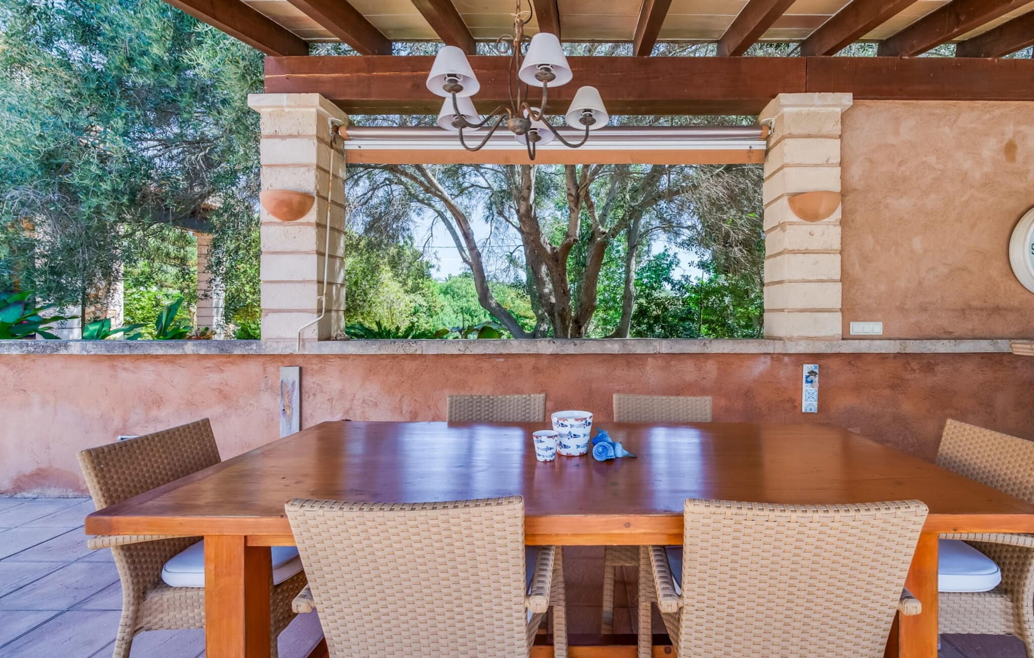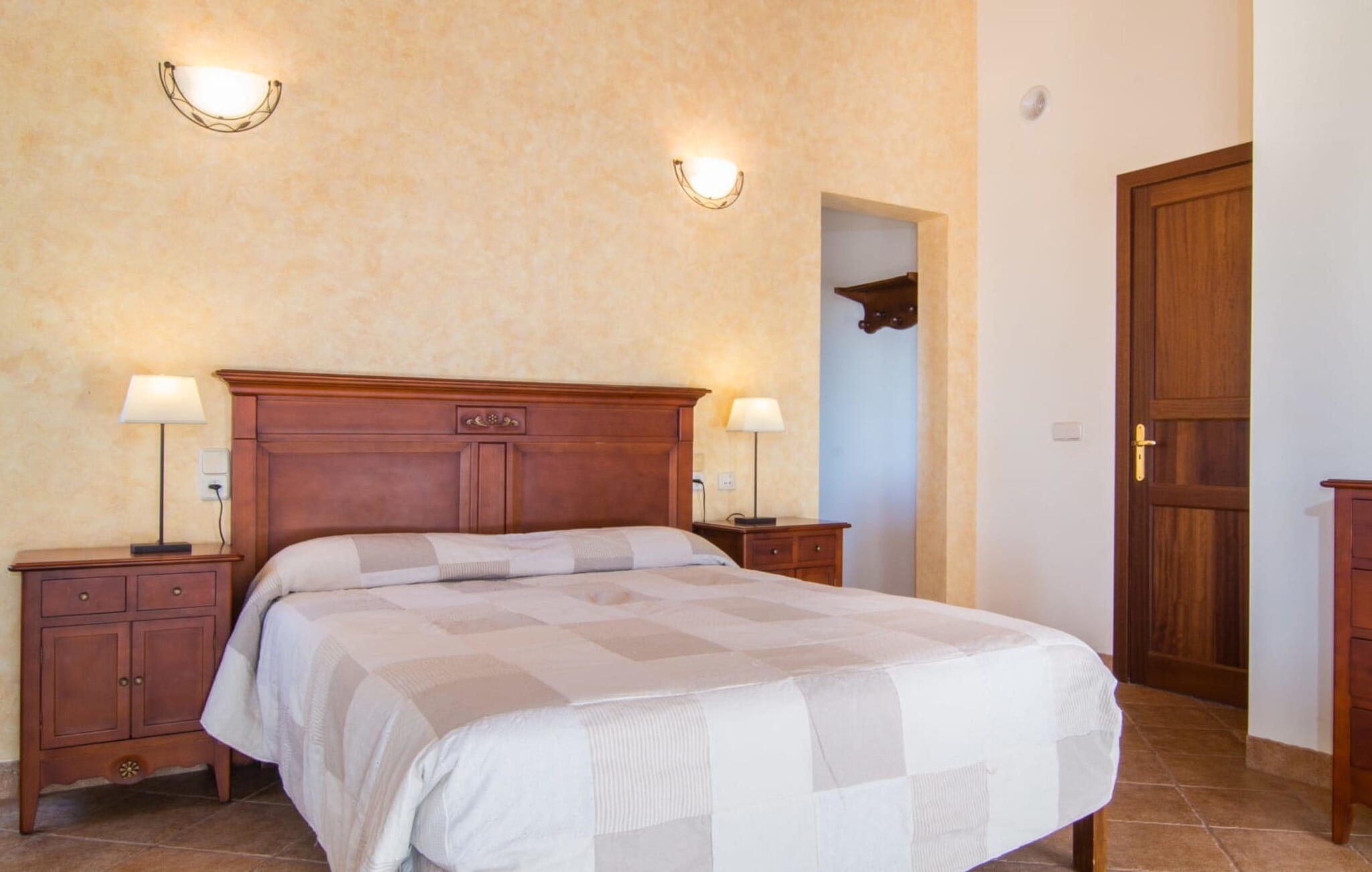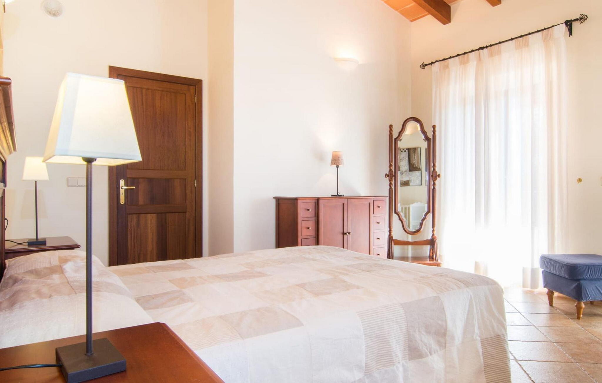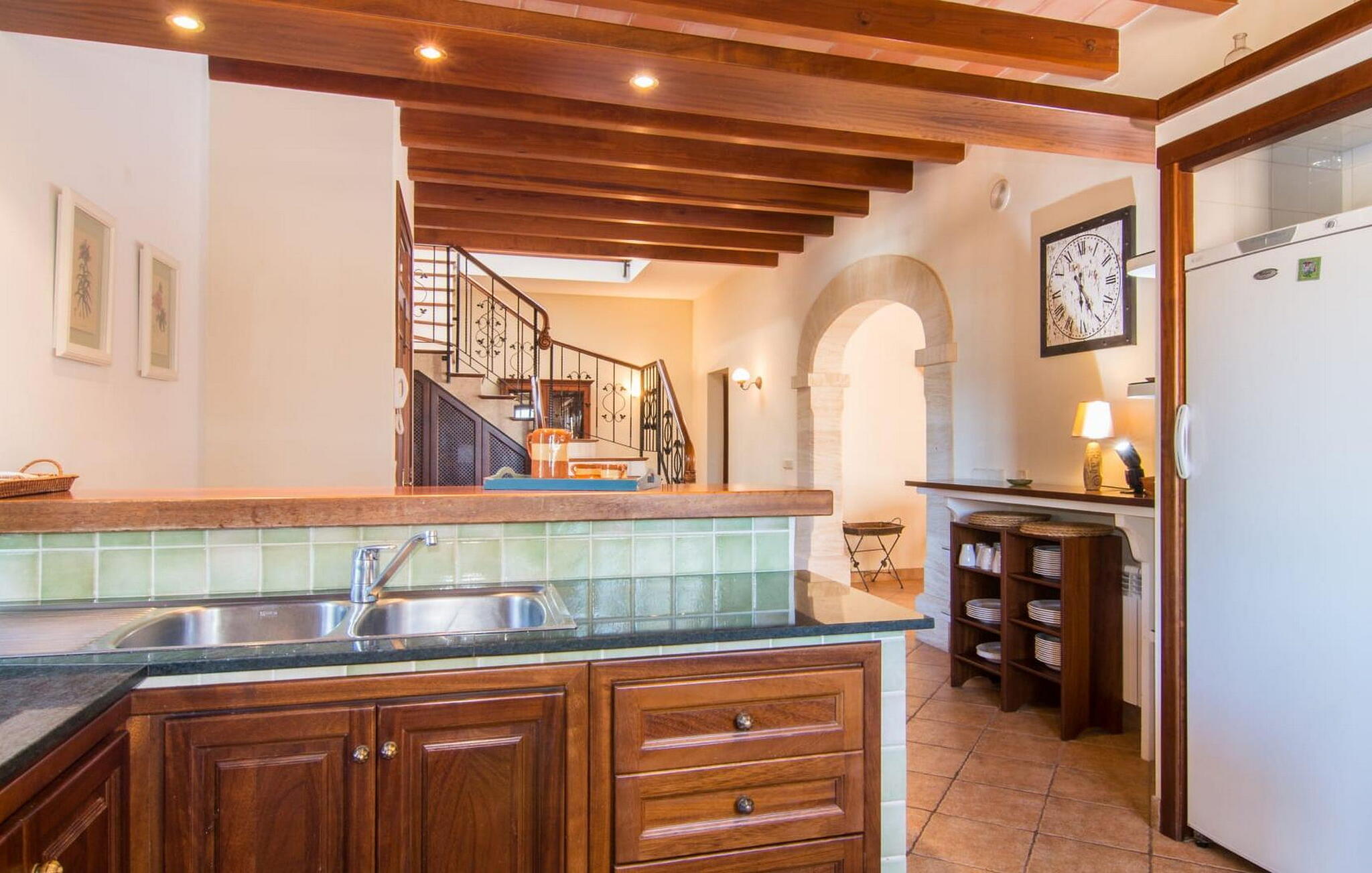 Het interieur van de villa is indrukwekkend: de inrichting is tot in het kleinste detail liefdevol gemodelleerd naar de klassieke Mallorcaanse stijl. Er zijn grote tegels in elke kamer, evenals warm, donkerbruin hout, lichtgekleurde muren en smaakvolle lampen. De begane grond heeft een open ontwerp en stenen bogen verbinden esthetisch de zeer goed uitgeruste keuken, de gezellige eethoek en de woonkamer met zijn extreem zacht gestoffeerde meubels, die rond de eigen open haard van het huis is gerangschikt. Op koudere avonden kun je hier vele aangename uren doorbrengen bij het knisperende haardvuur. Een van de vier tweepersoonsslaapkamers van de villa bevindt zich op de benedenverdieping. De andere drie bevinden zich op de bovenverdieping en zijn bereikbaar via een elegante trap met een sierlijke zwarte leuning. Alle slaapkamers zijn licht, ruim en voorzien van aantrekkelijke bedden; de drie zeer schone badkamers zijn bijzonder indrukwekkend dankzij hun moderne, hoogwaardige inrichting.
