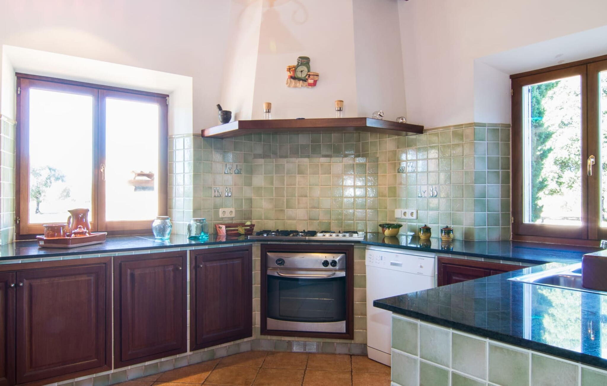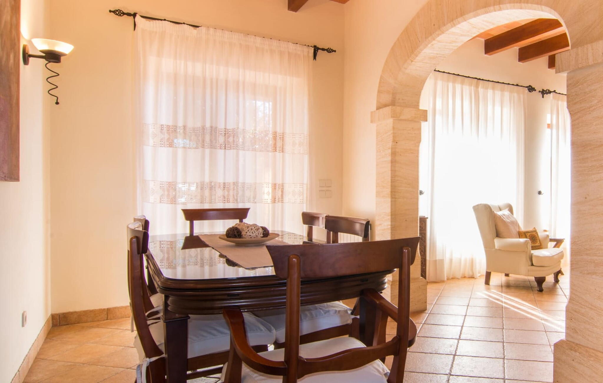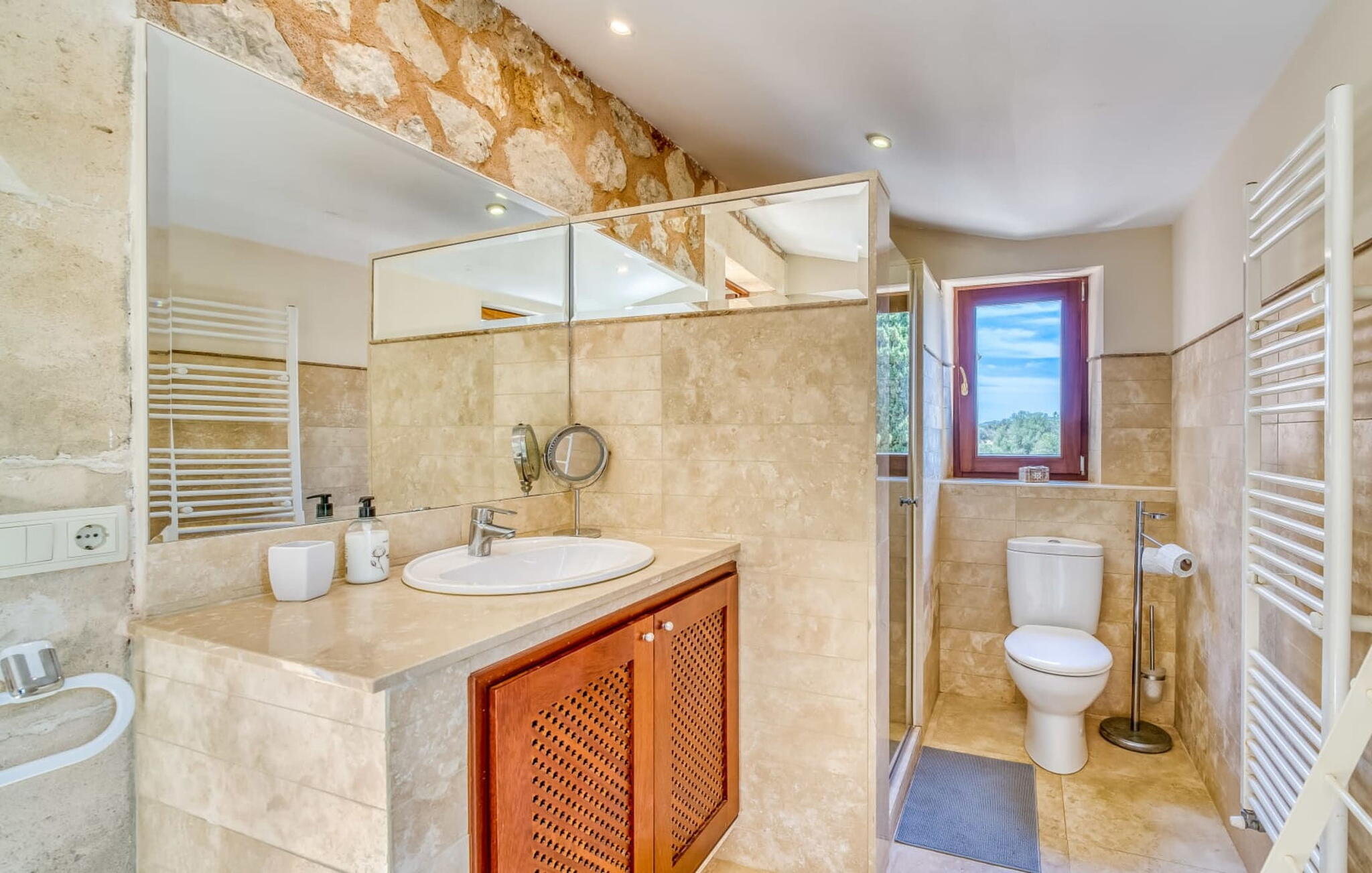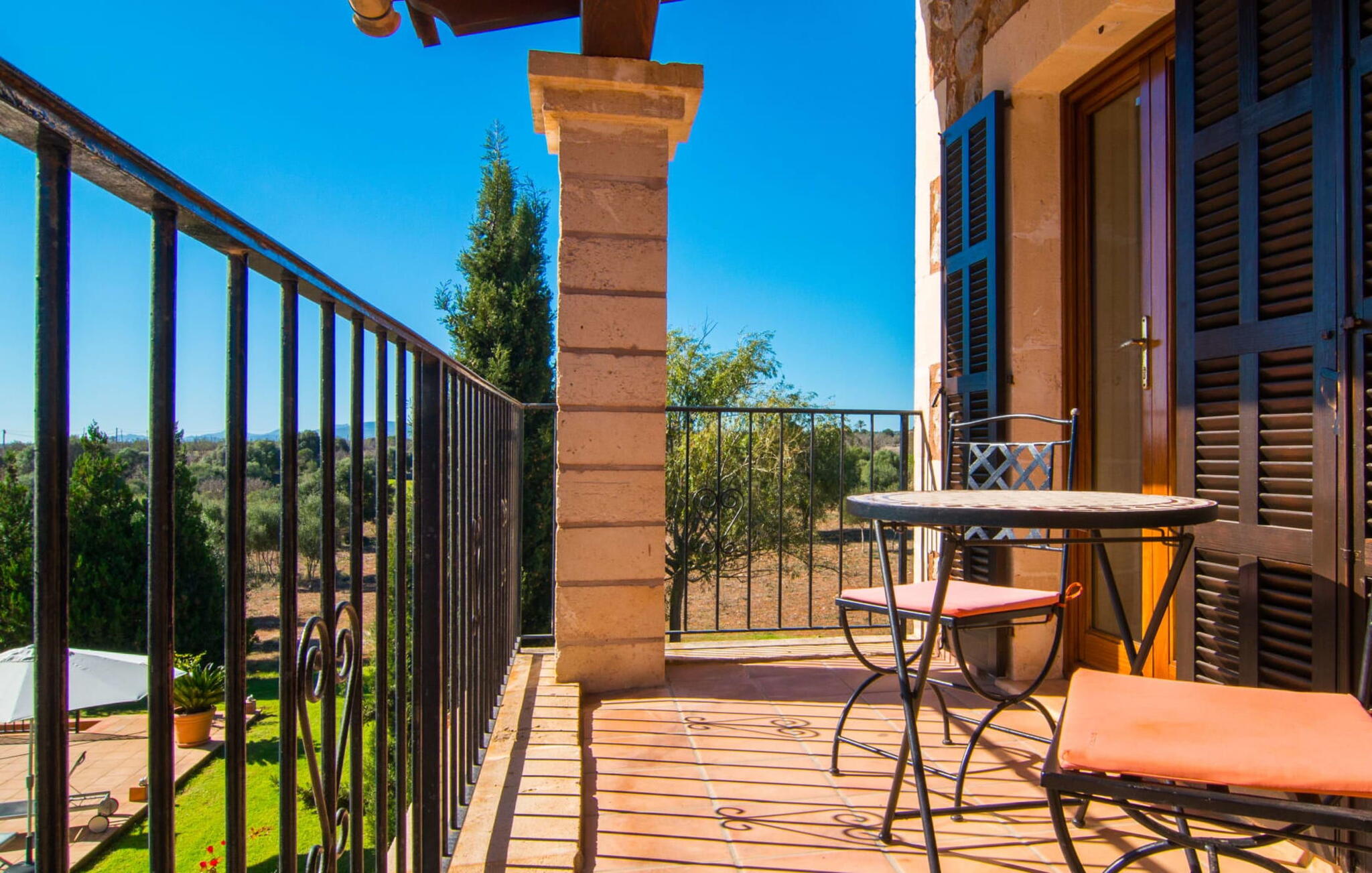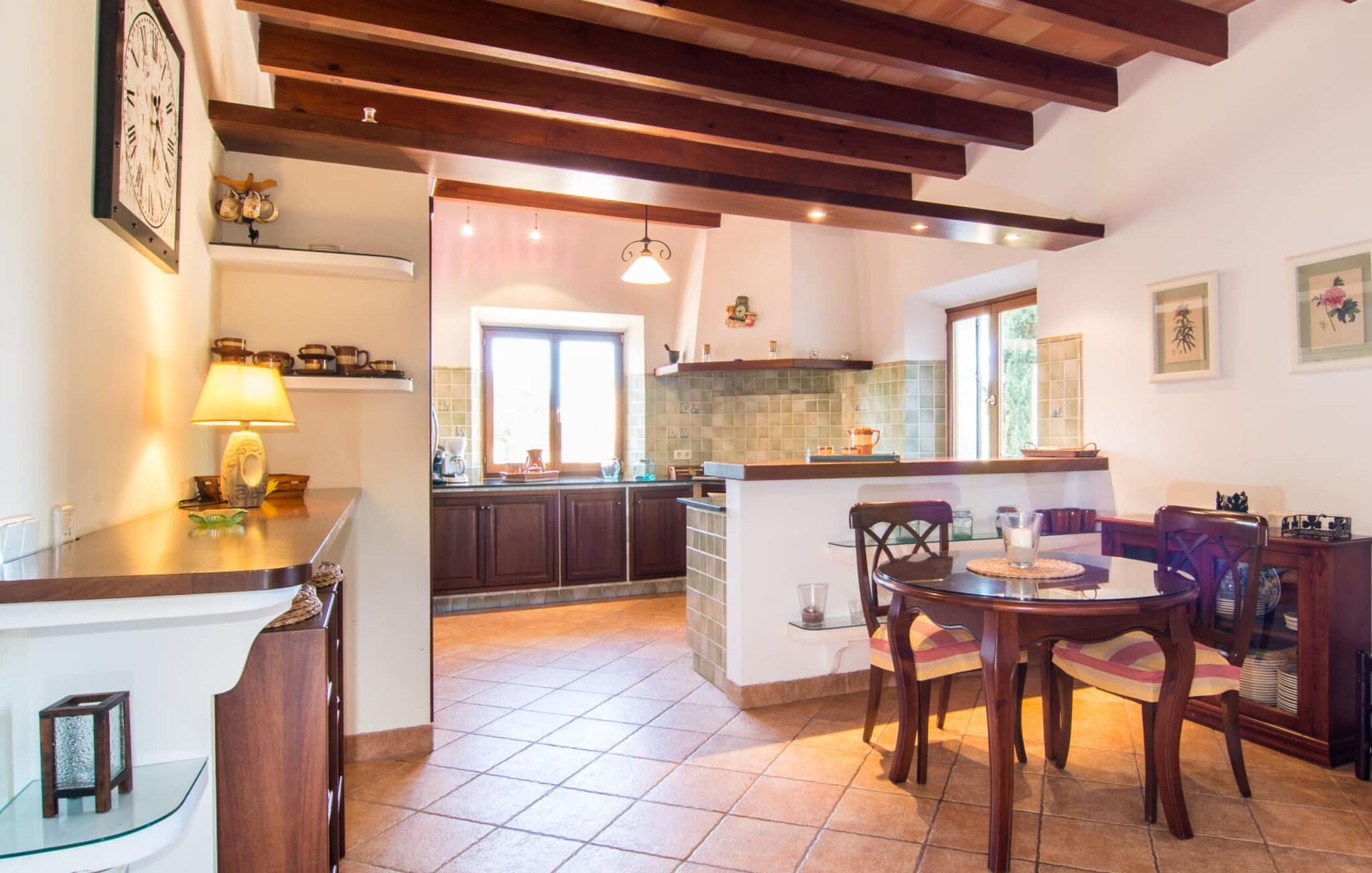 Het interieur van de villa is indrukwekkend: de inrichting is tot in het kleinste detail liefdevol gemodelleerd naar de klassieke Mallorcaanse stijl. Er zijn grote tegels in elke kamer, evenals warm, donkerbruin hout, lichtgekleurde muren en smaakvolle lampen. De begane grond heeft een open ontwerp en stenen bogen verbinden esthetisch de zeer goed uitgeruste keuken, de gezellige eethoek en de woonkamer met zijn extreem zacht gestoffeerde meubels, die rond de eigen open haard van het huis is gerangschikt. Op koudere avonden kun je hier vele aangename uren doorbrengen bij het knisperende haardvuur. Een van de vier tweepersoonsslaapkamers van de villa bevindt zich op de benedenverdieping. De andere drie bevinden zich op de bovenverdieping en zijn bereikbaar via een elegante trap met een sierlijke zwarte leuning. Alle slaapkamers zijn licht, ruim en voorzien van aantrekkelijke bedden; de drie zeer schone badkamers zijn bijzonder indrukwekkend dankzij hun moderne, hoogwaardige inrichting.