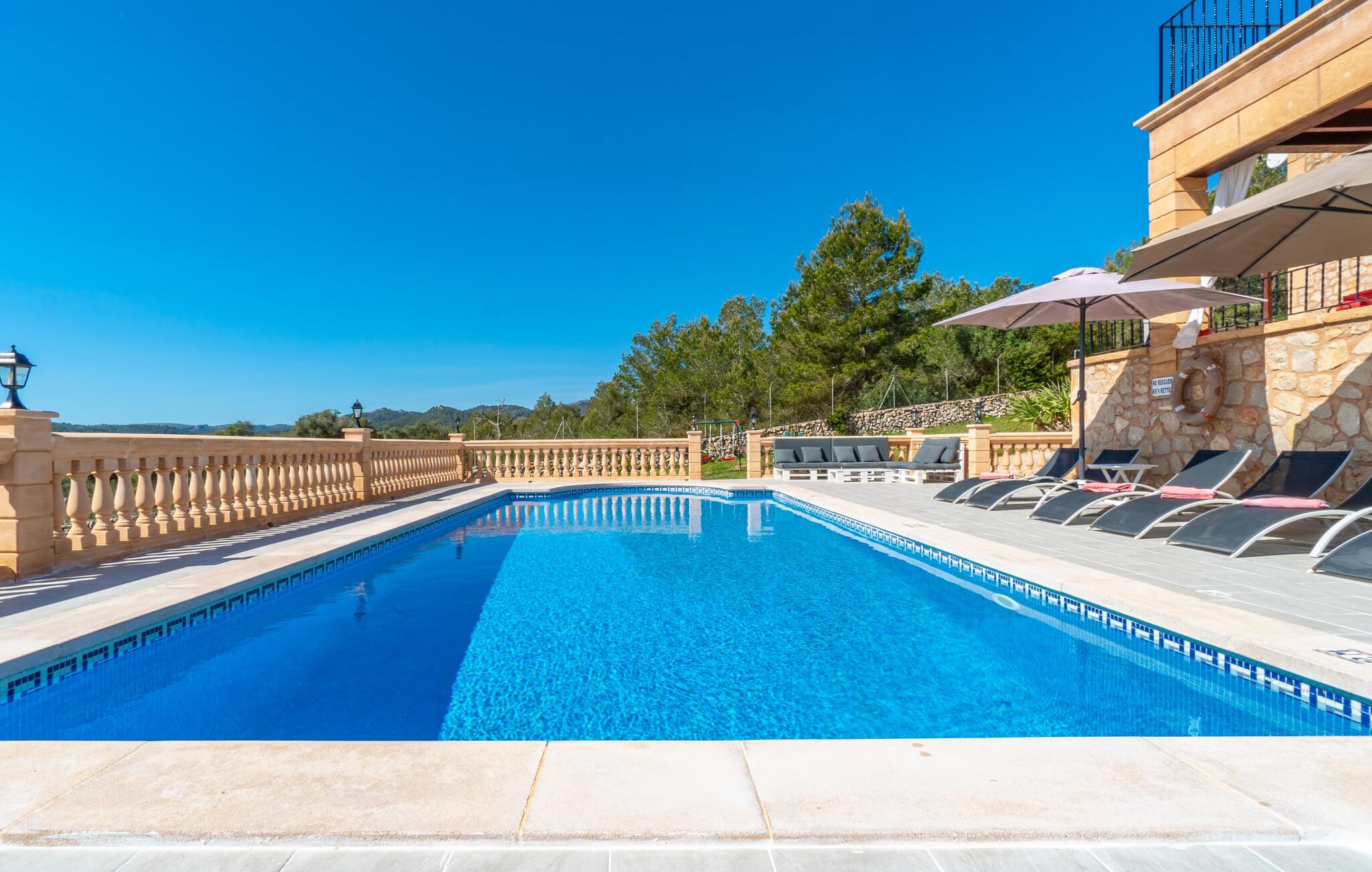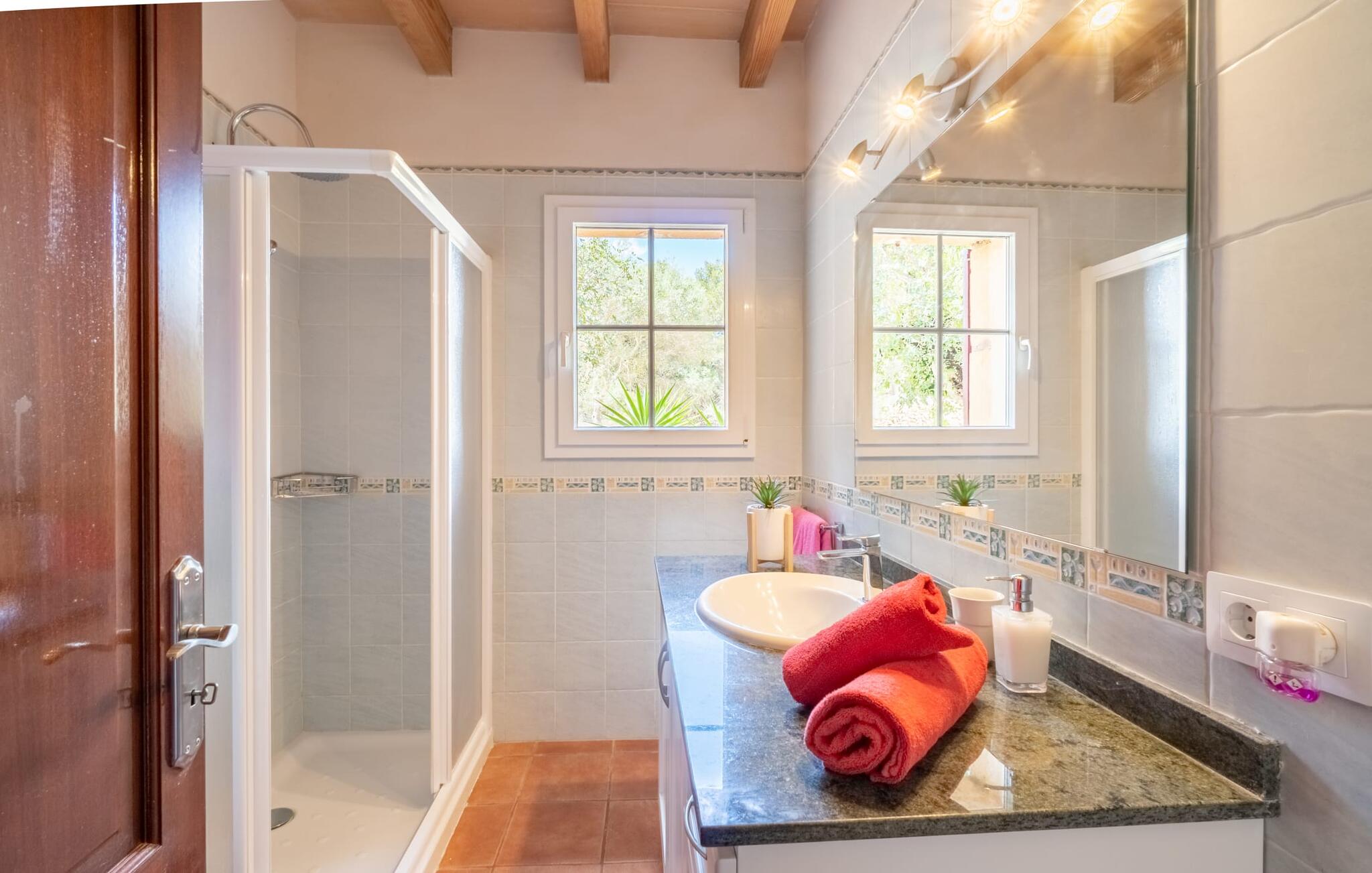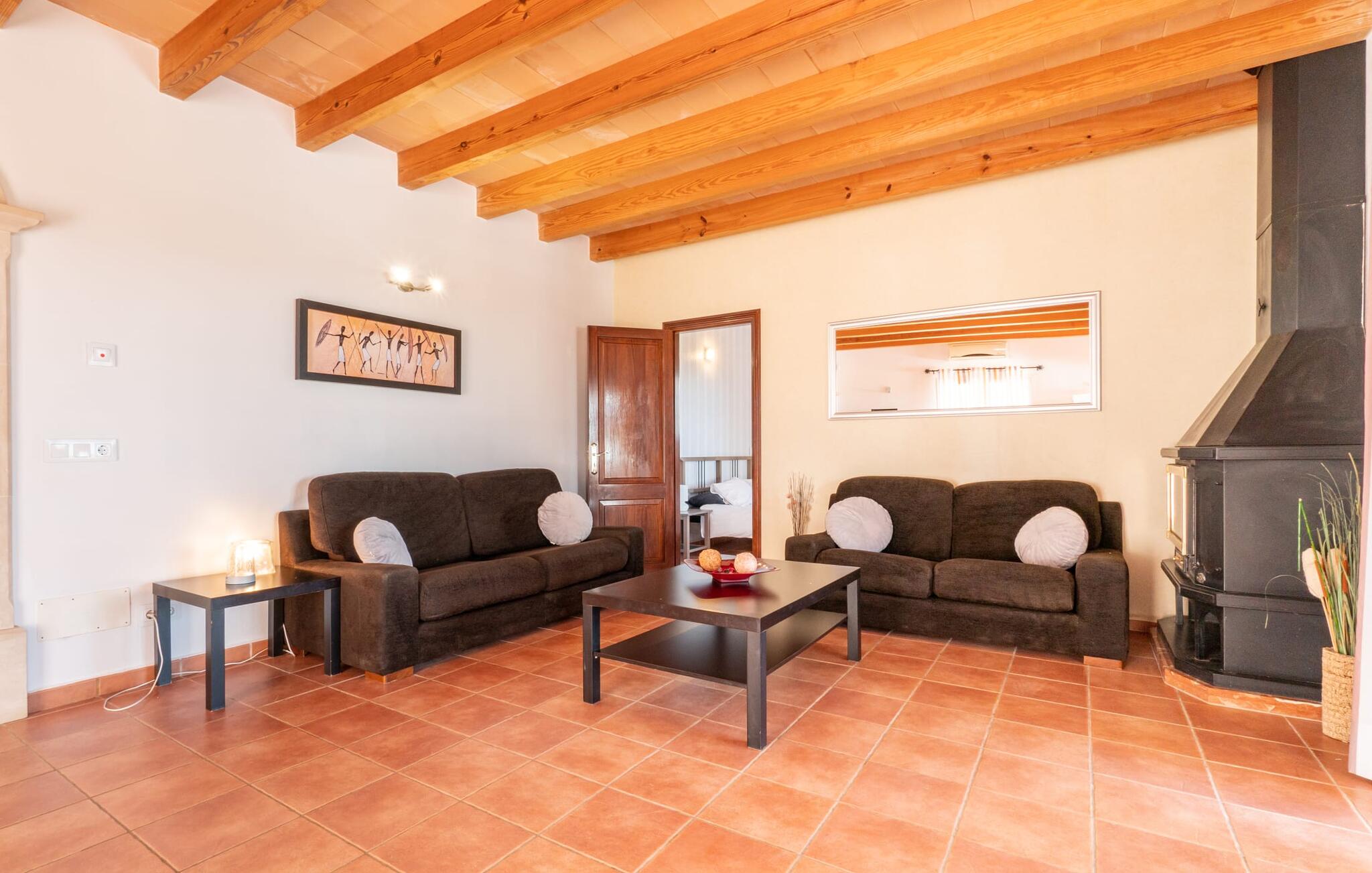 Vanuit het zwembad of het terras bieden verschillende ramen van vloer tot plafond toegang tot het interieur van het huis. De ruime keuken bevindt zich achter grote raamelementen waarvan de gebogen vormen doen denken aan een handvat van een rieten mand en de kamer overspoelen met aangenaam licht. De keuken heeft veel kastjes en een Amerikaans aanrecht met meer dan genoeg opbergruimte. De 3 gekleurde krukjes onderstrepen het moderne en open karakter van deze ruimte. Volledig ingericht betekent niet alleen de permanent geïnstalleerde elektrische apparaten zoals oven, magnetron, grote koelkast met vriesvak en kookplaat, maar ook een blender, koffiezetapparaat, broodrooster, waterkoker en nog veel meer. Het woongedeelte met bruine vloertegels en comfortabele banken rondt de gezellige sfeer af met behulp van een open haard. De slaapkamers hebben allemaal een moderne inrichting, comfortabele bedden en sommige zijn gedecoreerd met behang met patronen van hoge kwaliteit. Sommige slaapkamers op de eerste verdieping hebben toegang tot het grote balkon, dat je zeker moet gebruiken bij zonsondergang om te genieten van de rust en het prachtige uitzicht op de natuur met een goed glas Mallorcaanse rode wijn. Er zijn 4 moderne badkamers, sommige met hoekbad of douche, waarvan 2 en-suite.