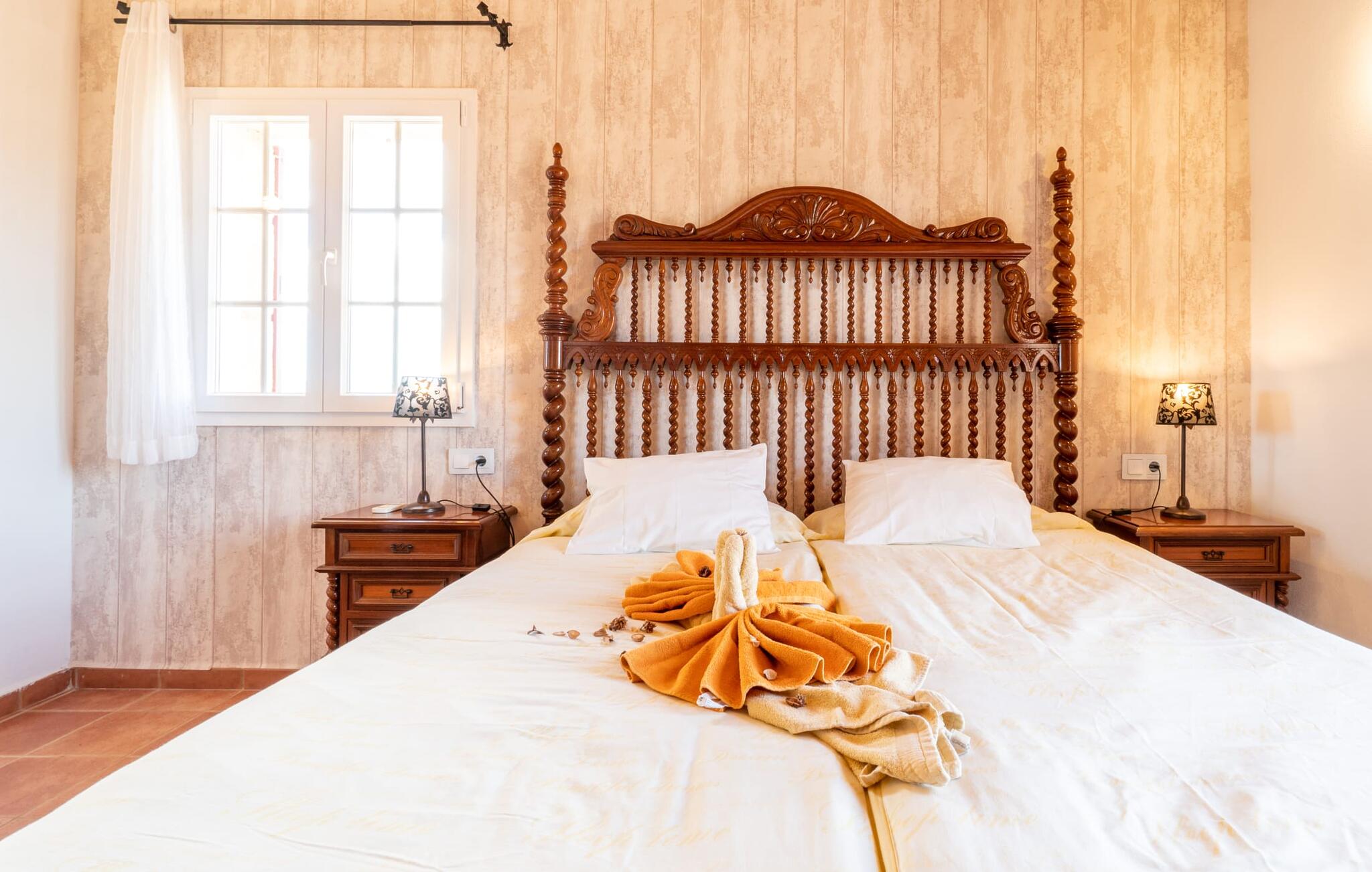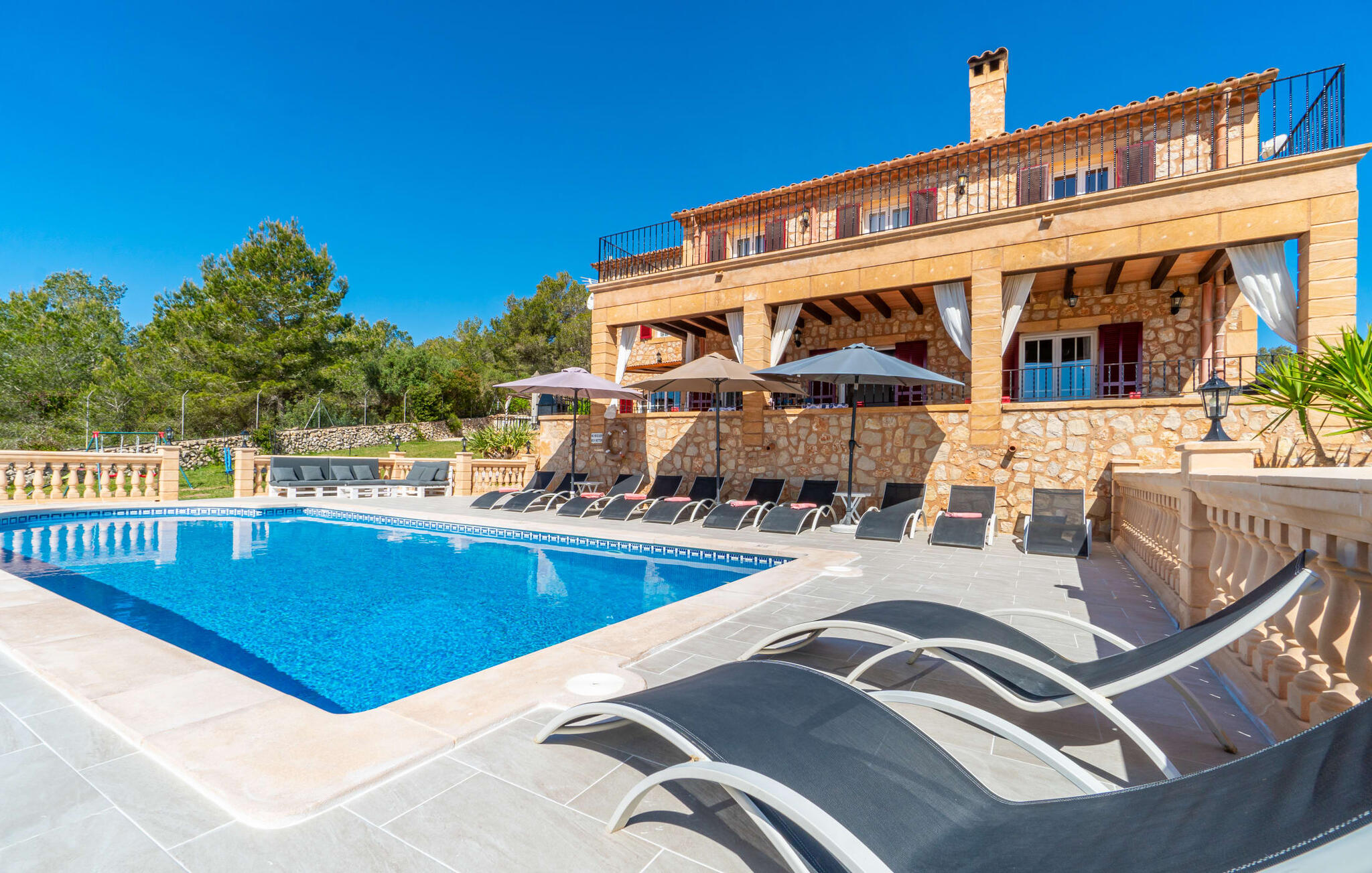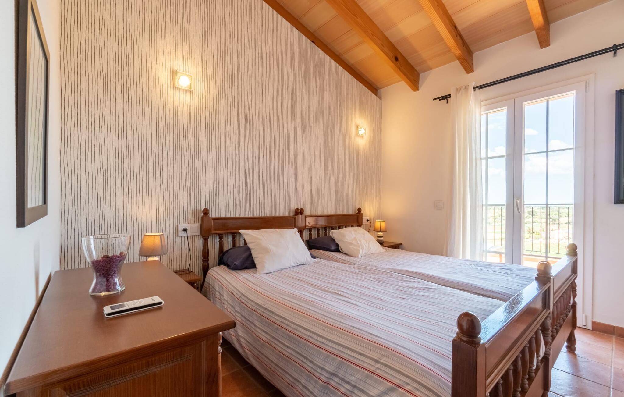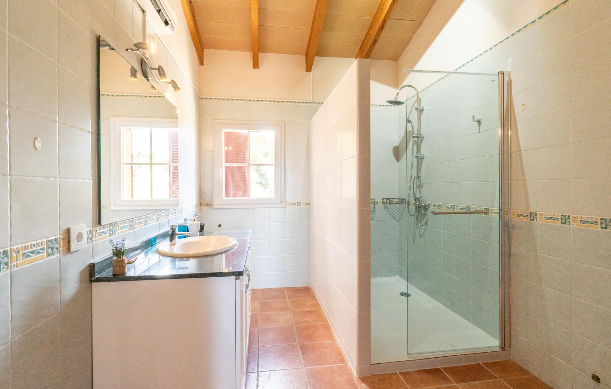 Vanuit het zwembad of het terras bieden verschillende ramen van vloer tot plafond toegang tot het interieur van het huis. De ruime keuken bevindt zich achter grote raamelementen waarvan de gebogen vormen doen denken aan een handvat van een rieten mand en de kamer overspoelen met aangenaam licht. De keuken heeft veel kastjes en een Amerikaans aanrecht met meer dan genoeg opbergruimte. De 3 gekleurde krukjes onderstrepen het moderne en open karakter van deze ruimte. Volledig ingericht betekent niet alleen de permanent geïnstalleerde elektrische apparaten zoals oven, magnetron, grote koelkast met vriesvak en kookplaat, maar ook een blender, koffiezetapparaat, broodrooster, waterkoker en nog veel meer. Het woongedeelte met bruine vloertegels en comfortabele banken rondt de gezellige sfeer af met behulp van een open haard. De slaapkamers hebben allemaal een moderne inrichting, comfortabele bedden en sommige zijn gedecoreerd met behang met patronen van hoge kwaliteit. Sommige slaapkamers op de eerste verdieping hebben toegang tot het grote balkon, dat je zeker moet gebruiken bij zonsondergang om te genieten van de rust en het prachtige uitzicht op de natuur met een goed glas Mallorcaanse rode wijn. Er zijn 4 moderne badkamers, sommige met hoekbad of douche, waarvan 2 en-suite.