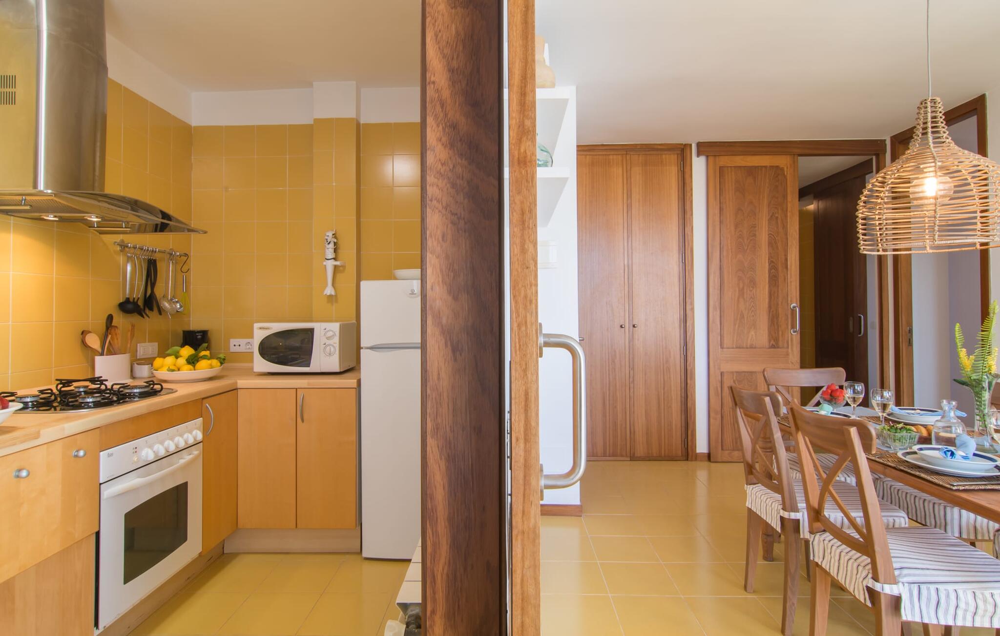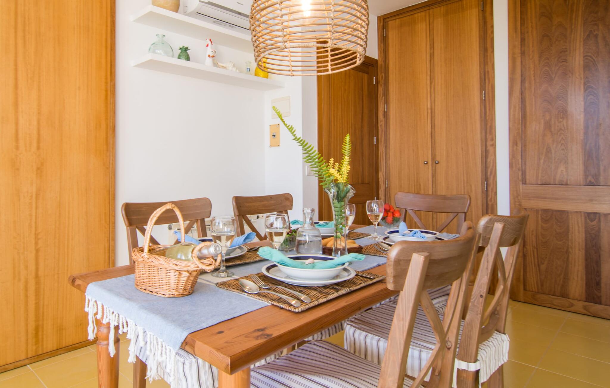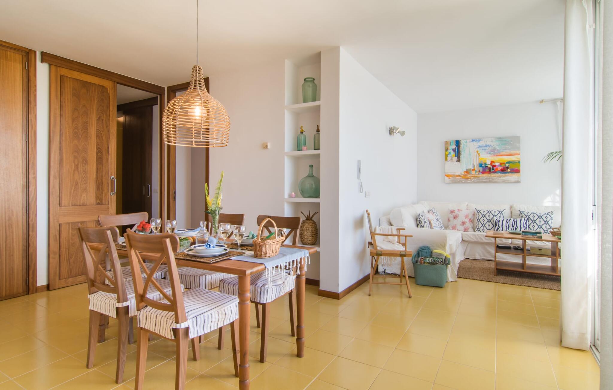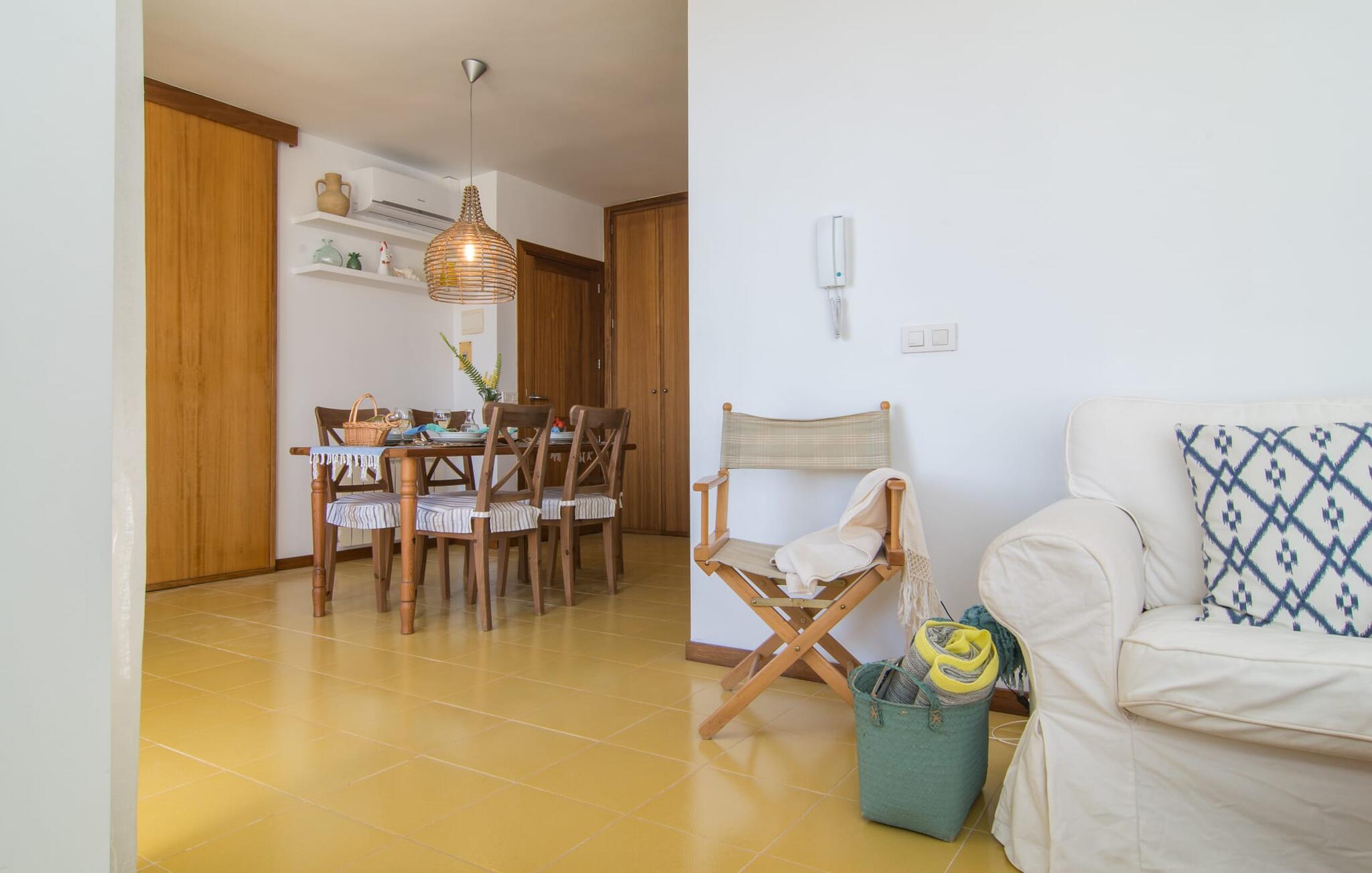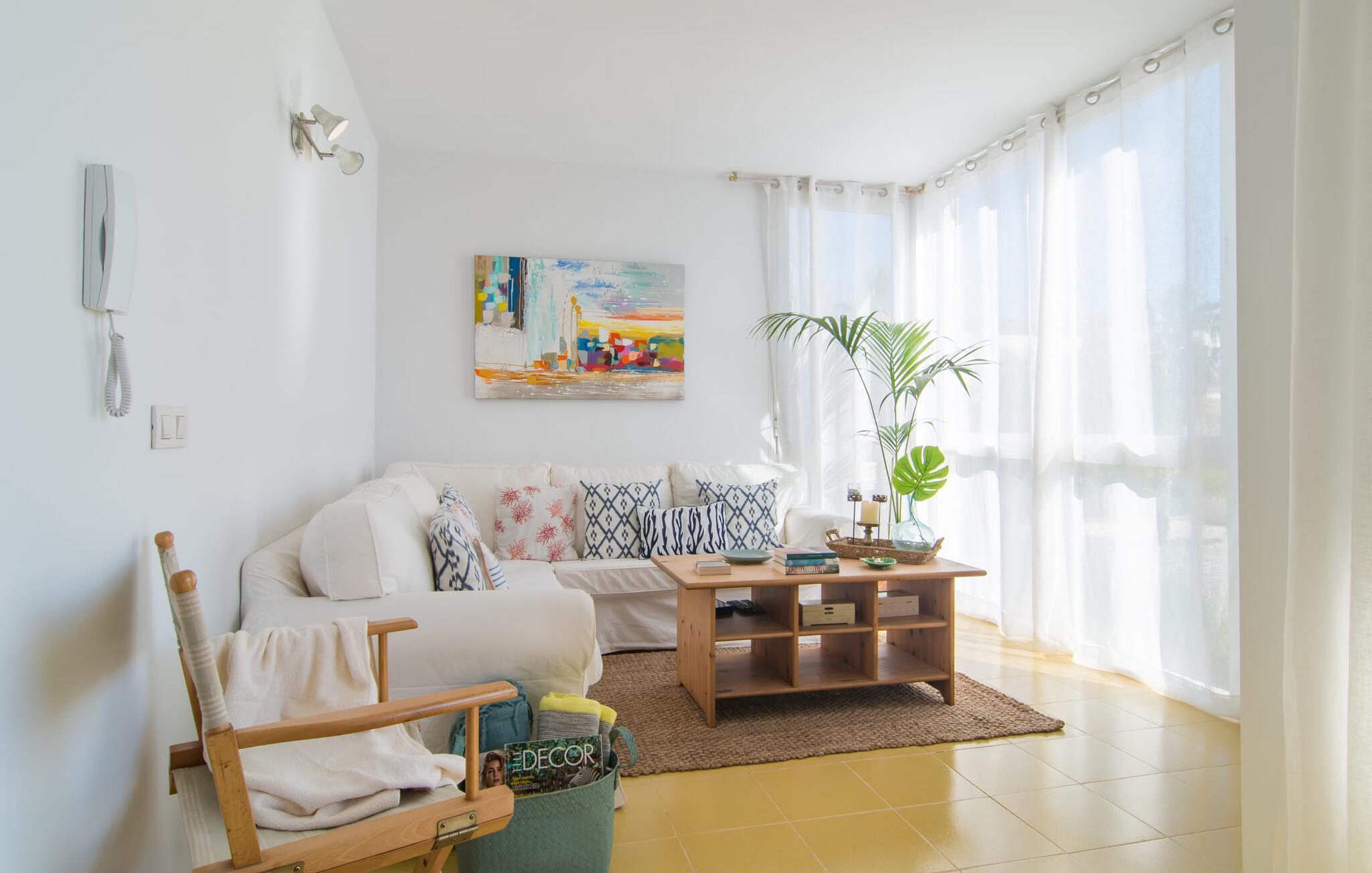 De kamers in het appartement worden gekenmerkt door een eenvoudige esthetiek. Met een L-vormige woon- en eetkamer, een volledig uitgeruste keuken, twee slaapkamers en een badkamer biedt het alles wat je nodig hebt voor de perfecte strandvakantie. De gele tegels die door de kamers lopen benadrukken niet alleen het zonmotief van de woning, maar ook de vrolijke lichtheid die Mirella uitstraalt en een blijvend vakantiegevoel zal oproepen bij de gasten. De ramen van vloer tot plafond bij de bank en de eettafel laten veel licht binnen en openen het zicht op de omgeving, de meubels stralen gezelligheid uit en maken ook de avonden thuis tot een feelgood moment, of het nu met een heerlijk diner is, een boek, je favoriete serie, of een lang gesprek tussen de kleurrijke bankkussens of aan tafel. Een van de slaapkamers heeft een groot bed van 1,50 x 2 meter, terwijl de andere slaapkamer twee eenpersoonsbedden heeft van 0,90 meter breed. De badkamer met dubbele wastafel, douche en apart toilet is ensuite bij één slaapkamer en is ook toegankelijk voor de andere gasten vanuit de woonkamer. Omdat het appartement is uitgerust met warm/koud airconditioning, kun je hier het hele jaar door comfortabel wonen.