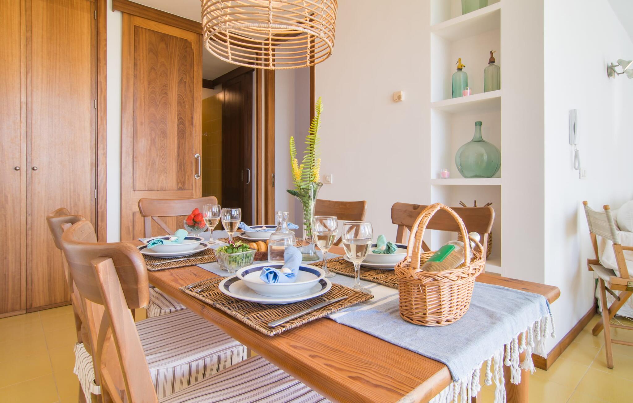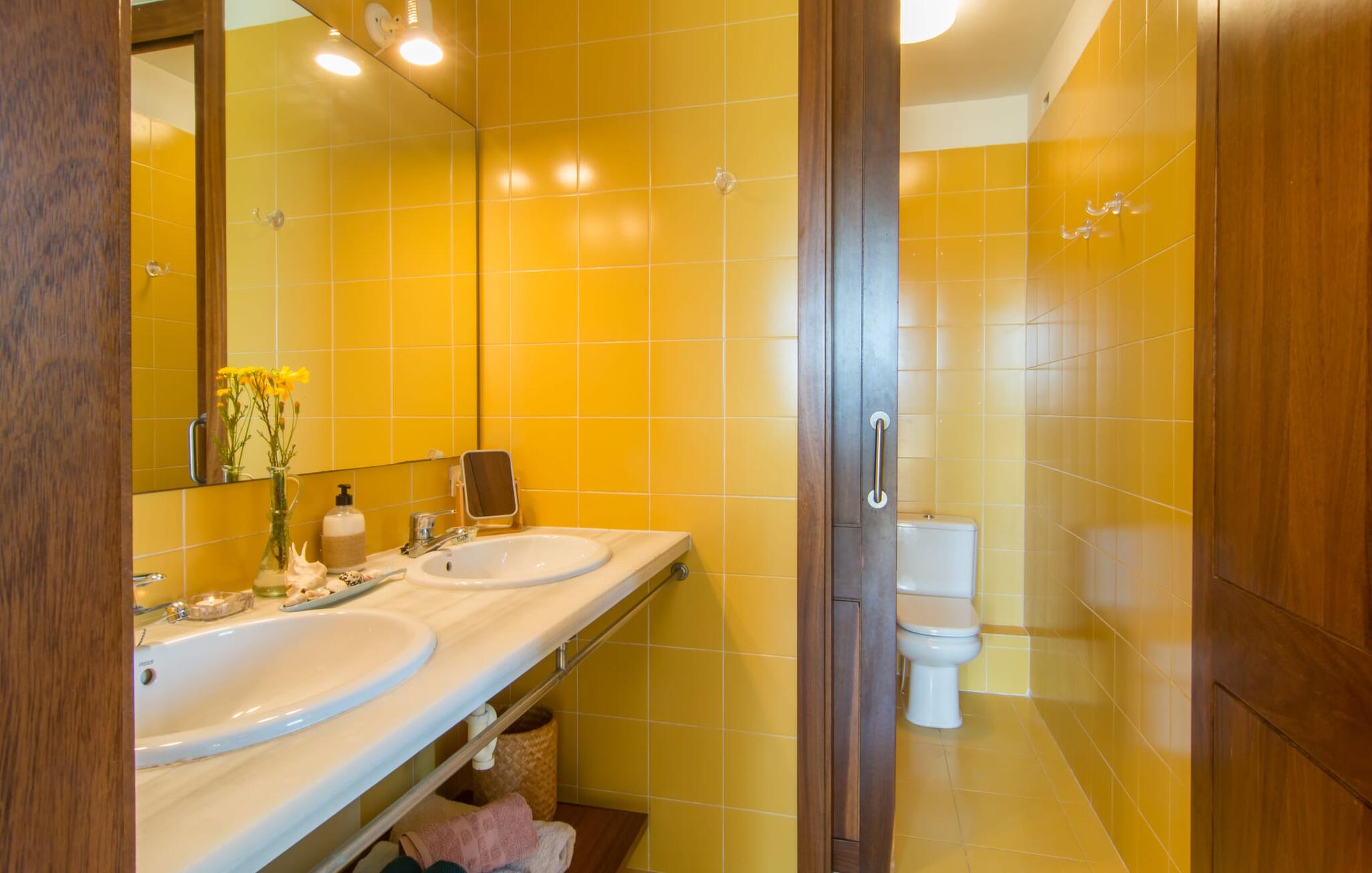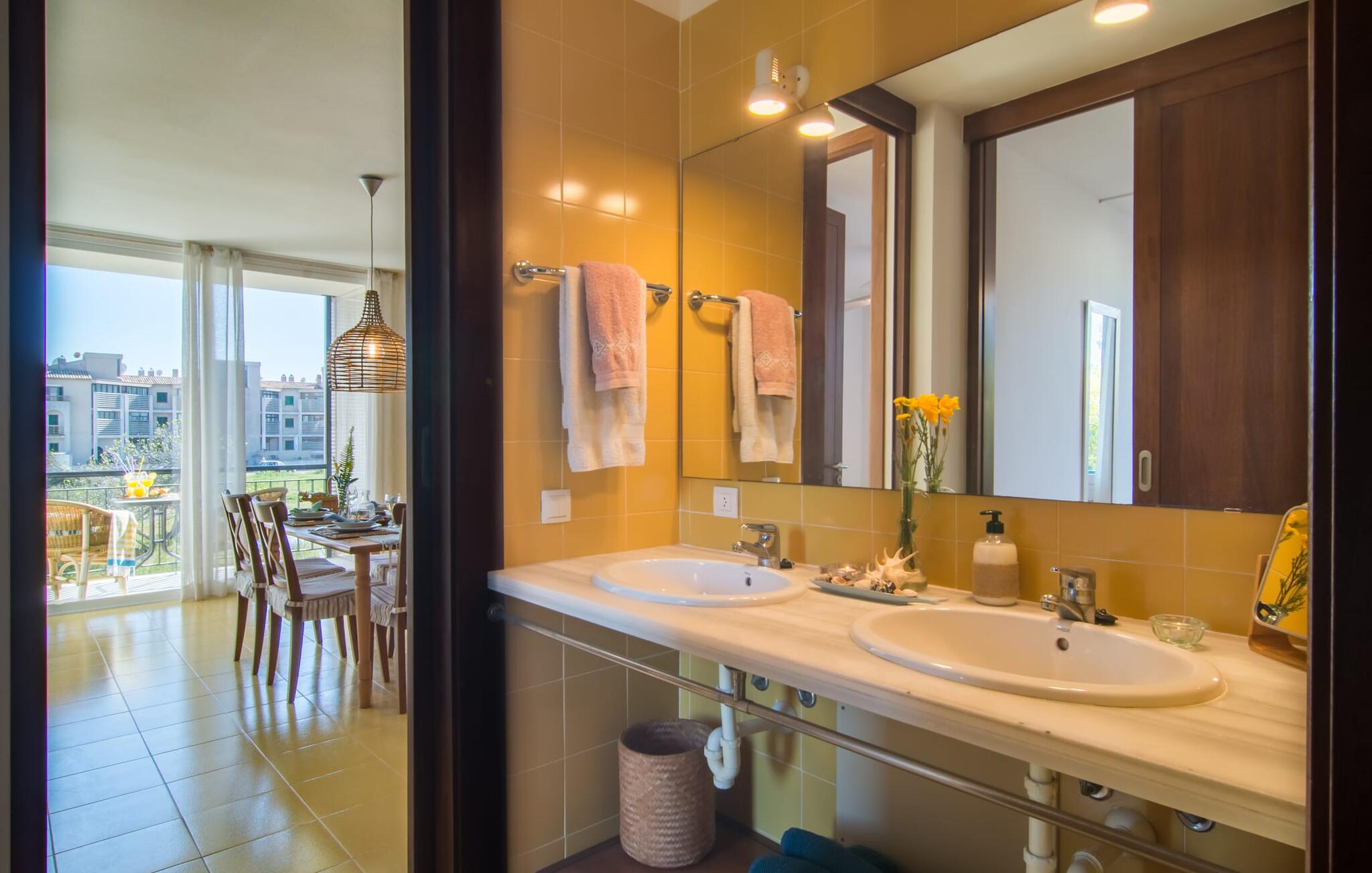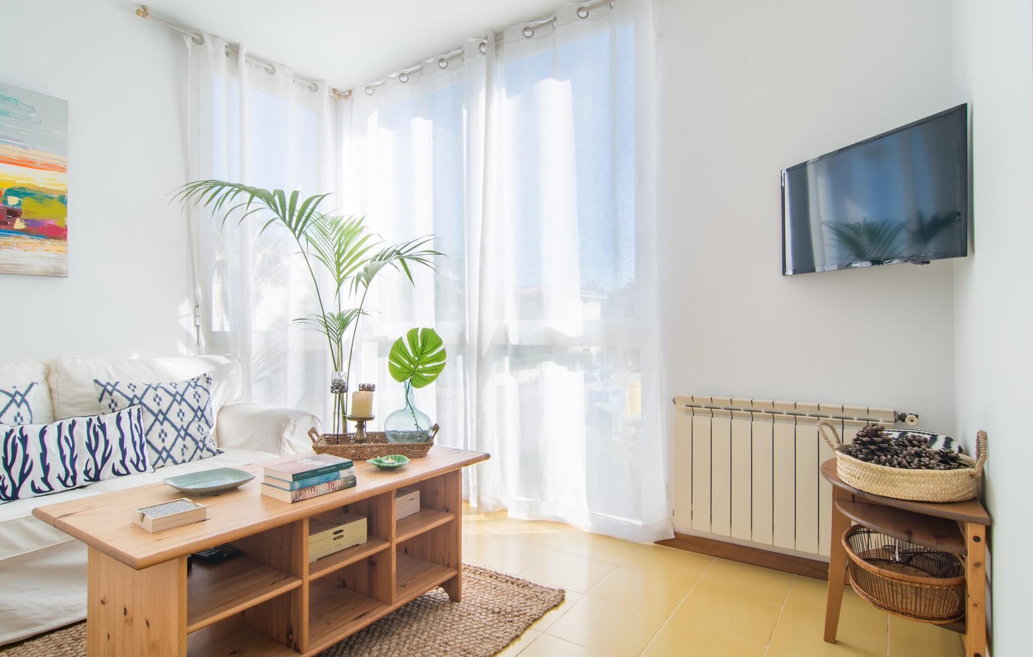 De kamers in het appartement worden gekenmerkt door een eenvoudige esthetiek. Met een L-vormige woon- en eetkamer, een volledig uitgeruste keuken, twee slaapkamers en een badkamer biedt het alles wat je nodig hebt voor de perfecte strandvakantie. De gele tegels die door de kamers lopen benadrukken niet alleen het zonmotief van de woning, maar ook de vrolijke lichtheid die Mirella uitstraalt en een blijvend vakantiegevoel zal oproepen bij de gasten. De ramen van vloer tot plafond bij de bank en de eettafel laten veel licht binnen en openen het zicht op de omgeving, de meubels stralen gezelligheid uit en maken ook de avonden thuis tot een feelgood moment, of het nu met een heerlijk diner is, een boek, je favoriete serie, of een lang gesprek tussen de kleurrijke bankkussens of aan tafel. Een van de slaapkamers heeft een groot bed van 1,50 x 2 meter, terwijl de andere slaapkamer twee eenpersoonsbedden heeft van 0,90 meter breed. De badkamer met dubbele wastafel, douche en apart toilet is ensuite bij één slaapkamer en is ook toegankelijk voor de andere gasten vanuit de woonkamer. Omdat het appartement is uitgerust met warm/koud airconditioning, kun je hier het hele jaar door comfortabel wonen.