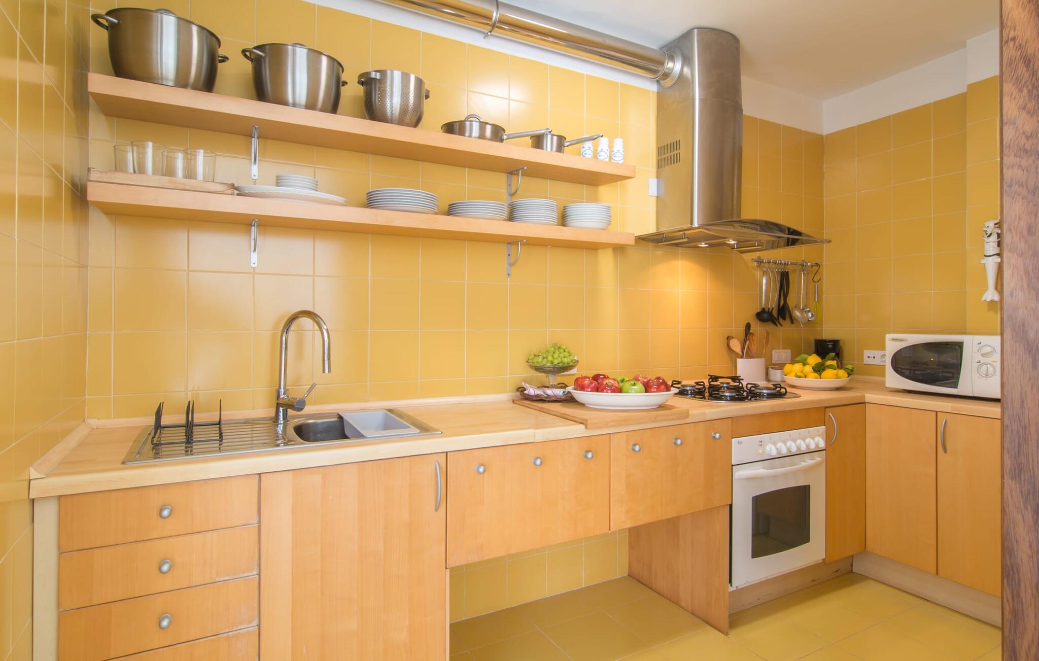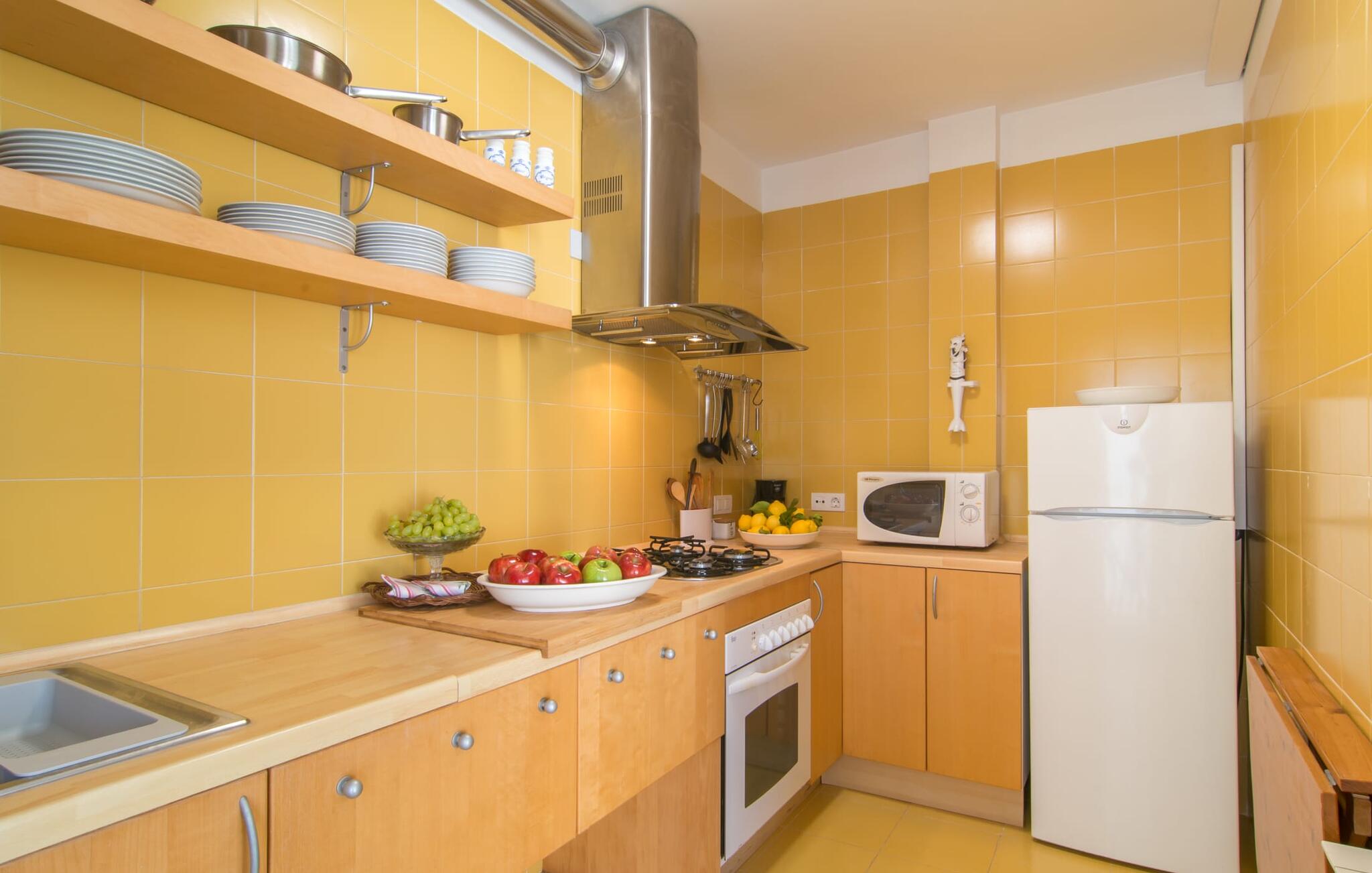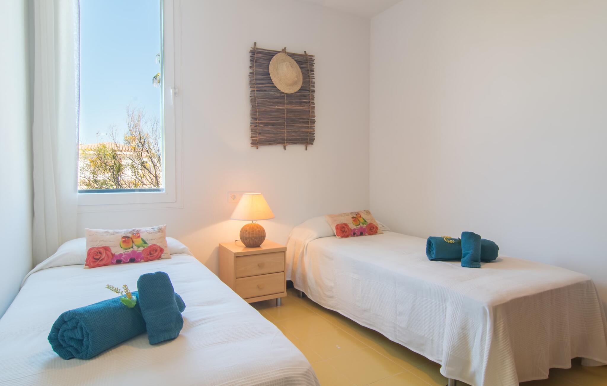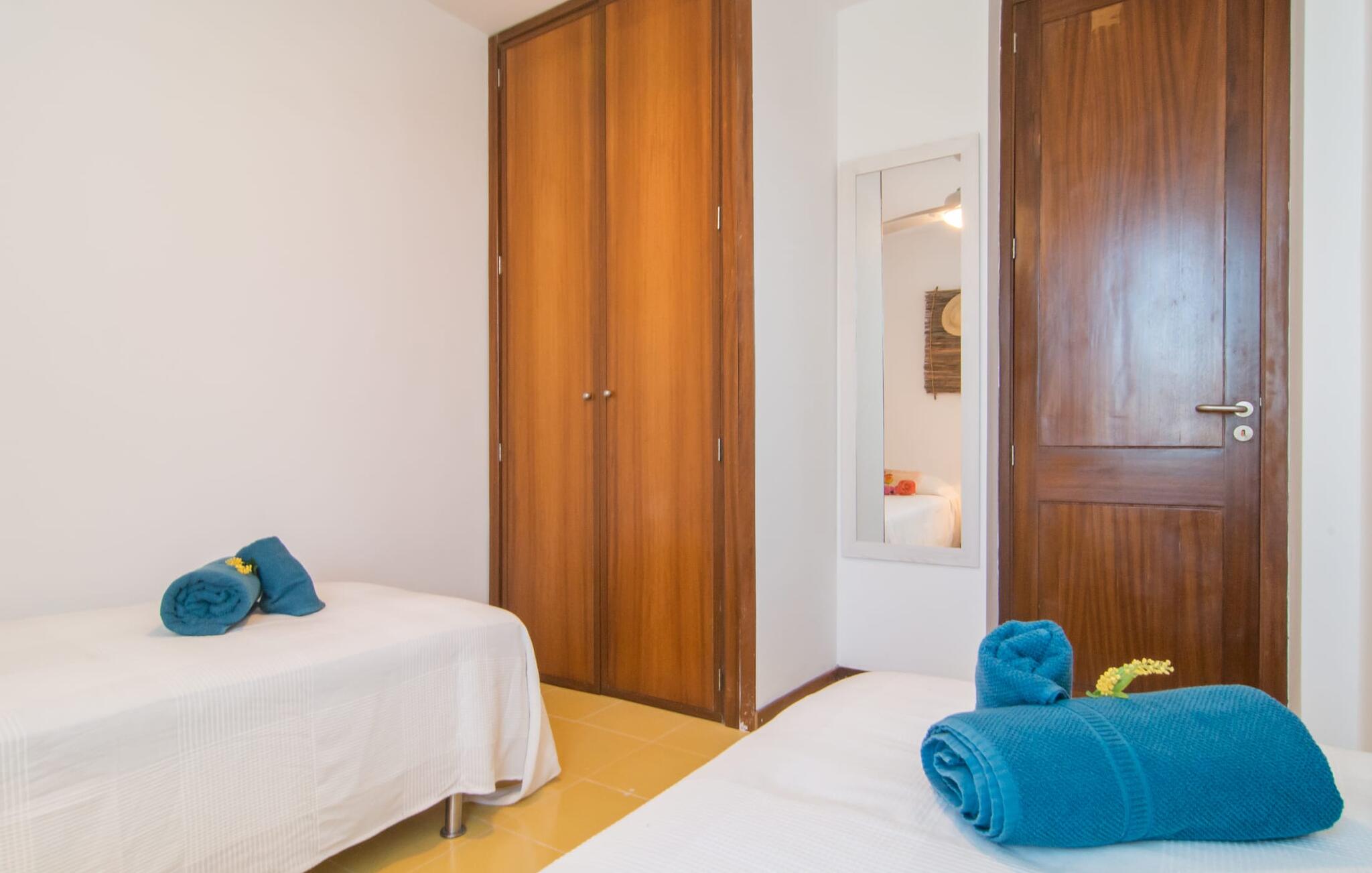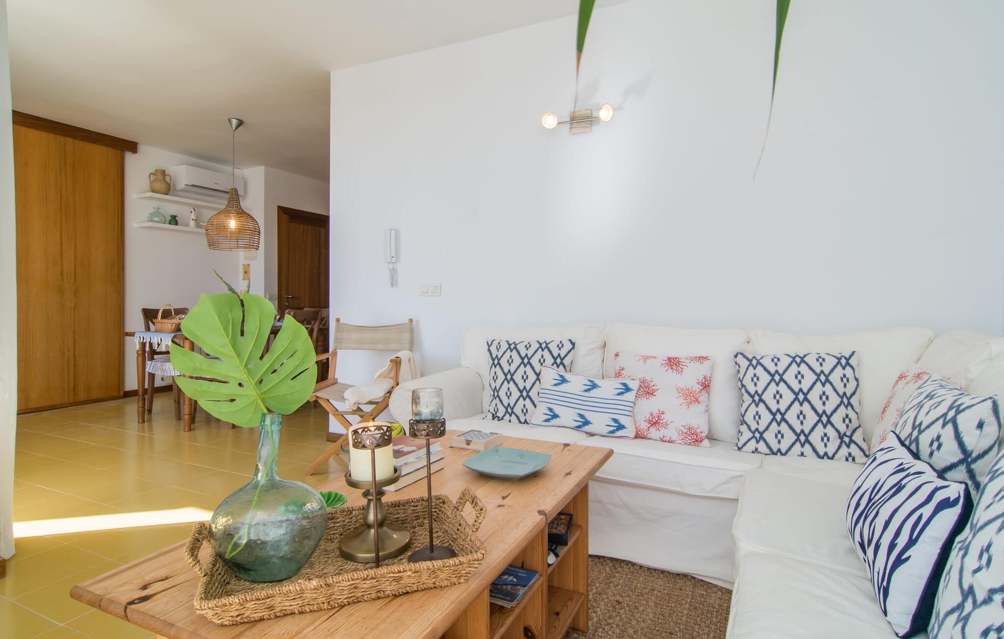 De kamers in het appartement worden gekenmerkt door een eenvoudige esthetiek. Met een L-vormige woon- en eetkamer, een volledig uitgeruste keuken, twee slaapkamers en een badkamer biedt het alles wat je nodig hebt voor de perfecte strandvakantie. De gele tegels die door de kamers lopen benadrukken niet alleen het zonmotief van de woning, maar ook de vrolijke lichtheid die Mirella uitstraalt en een blijvend vakantiegevoel zal oproepen bij de gasten. De ramen van vloer tot plafond bij de bank en de eettafel laten veel licht binnen en openen het zicht op de omgeving, de meubels stralen gezelligheid uit en maken ook de avonden thuis tot een feelgood moment, of het nu met een heerlijk diner is, een boek, je favoriete serie, of een lang gesprek tussen de kleurrijke bankkussens of aan tafel. Een van de slaapkamers heeft een groot bed van 1,50 x 2 meter, terwijl de andere slaapkamer twee eenpersoonsbedden heeft van 0,90 meter breed. De badkamer met dubbele wastafel, douche en apart toilet is ensuite bij één slaapkamer en is ook toegankelijk voor de andere gasten vanuit de woonkamer. Omdat het appartement is uitgerust met warm/koud airconditioning, kun je hier het hele jaar door comfortabel wonen.
