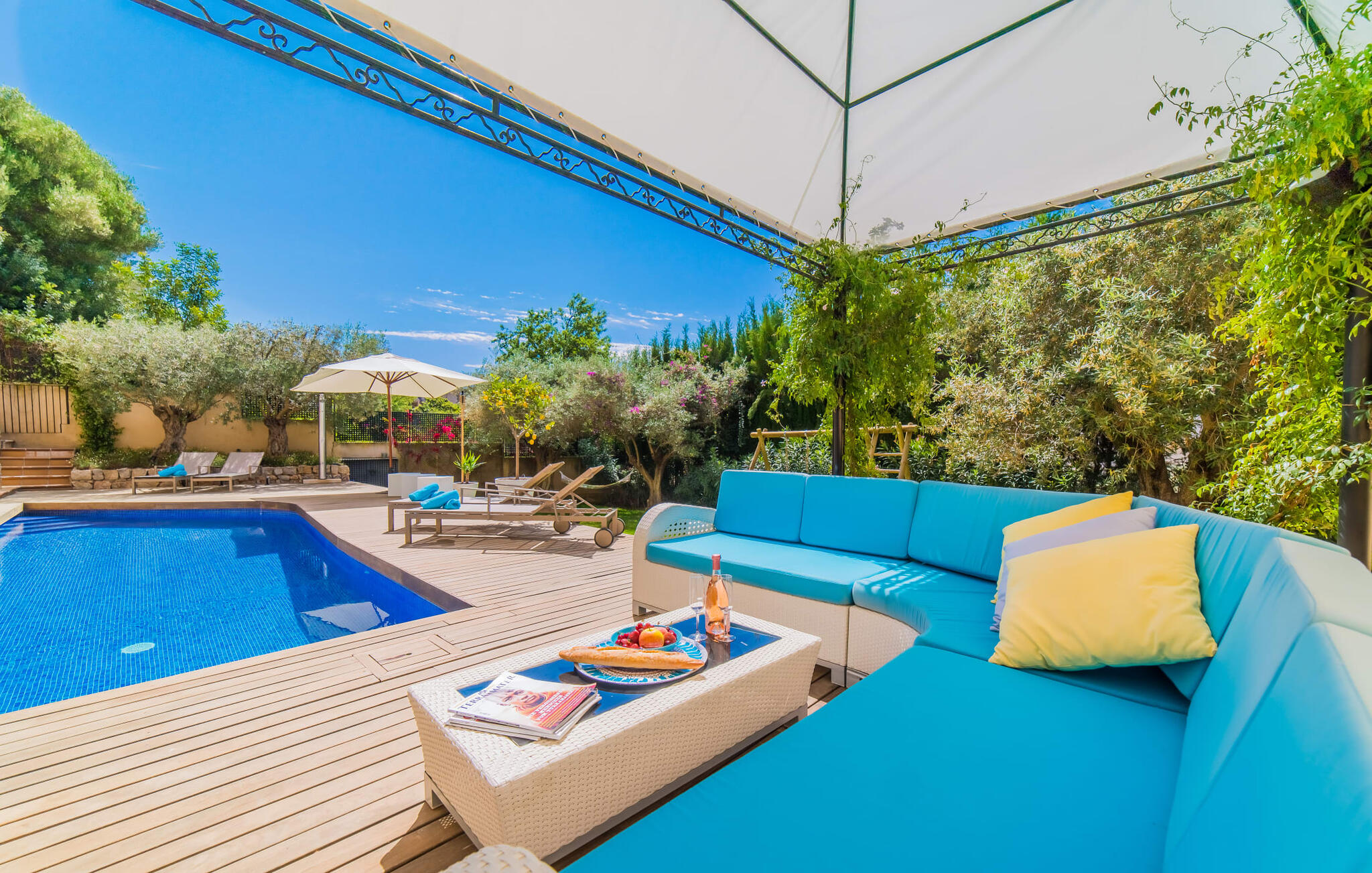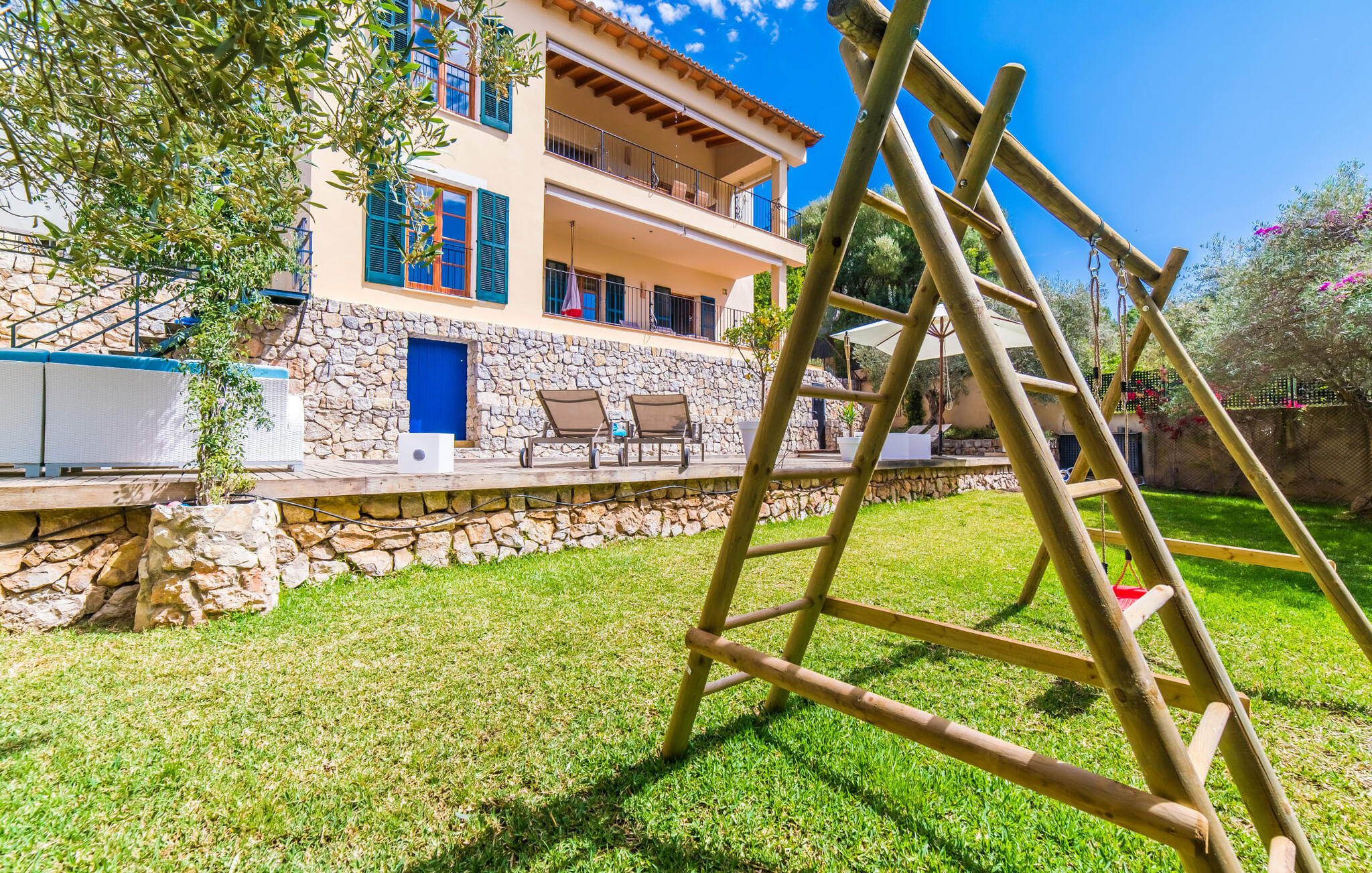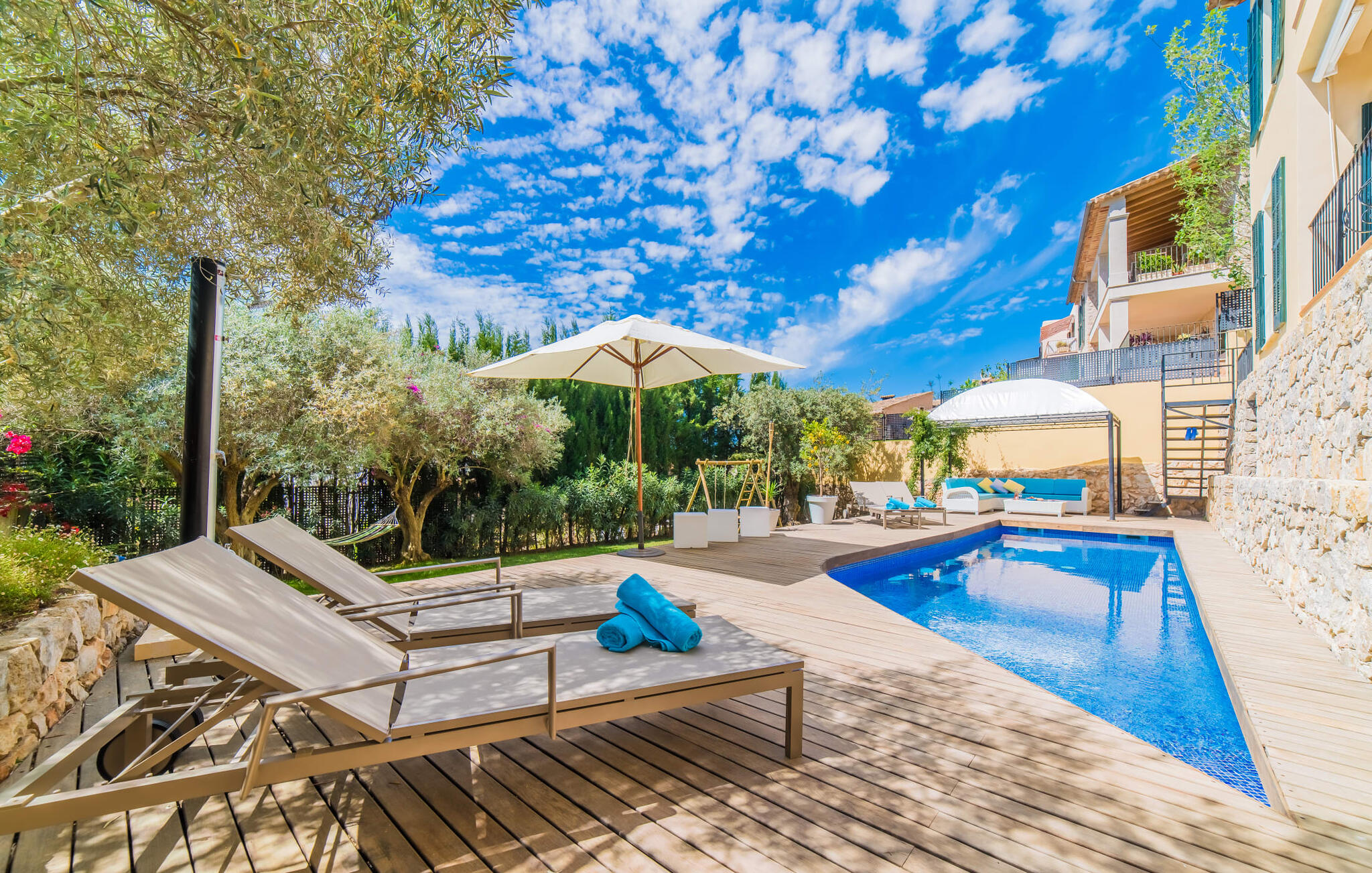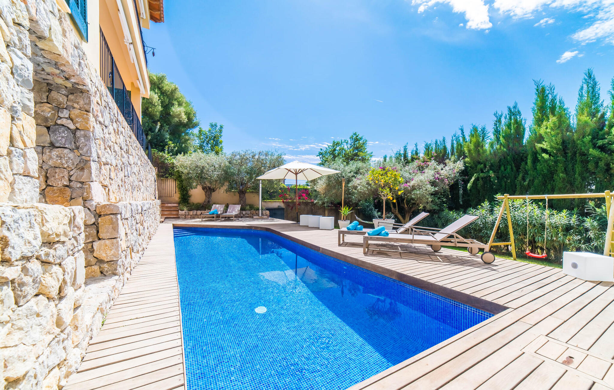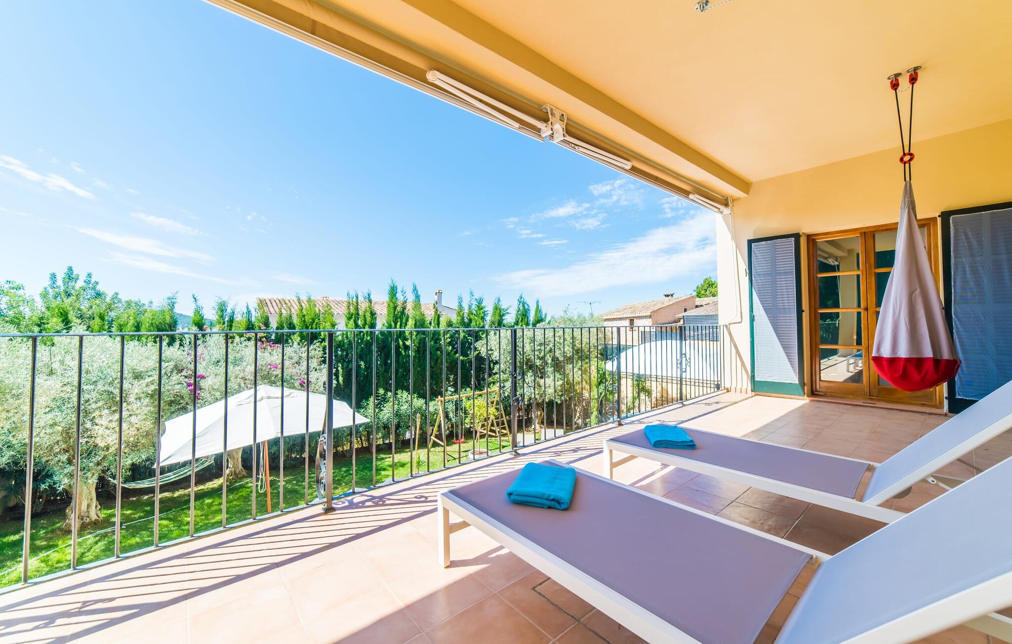 Mama, papa, mogen we hier blijven? De kans is groot dat je kleintjes dat zullen zeggen, want Finca Mofares heeft alles wat een kinderhartje begeert: een klimrek, een schommel en een grote trampoline. Je hoeft deze vakantie niet op zoek naar een speeltuin, maar gaat gewoon de tuin in. Dit zijn de perfecte omstandigheden om vanaf het begin te genieten van alle voordelen van deze accommodatie. Laten we beginnen met het grote terras op de bovenverdieping, vanwaar je een prachtig uitzicht hebt op het centrum van het pittoreske stadje Calvià. Met een glas Mallorcaanse wijn in de hand kun je vanaf hier de omgeving verkennen: Werp je blik over de traditionele okerkleurige huizen naar de twee kleine torens van de Sant Joan kerk, waarachter je het zachte silhouet van de Tramuntata bergketen kunt ontwaren. Welkom op je vakantie! Je zou hier waarschijnlijk eeuwig kunnen blijven, ware het niet dat de charmante pergola met chill-out bank vlak naast het zwembad er zo verleidelijk uitziet. Als je wat tijd voor jezelf wilt, kun je ontspannen in de hangmat die tussen twee knoestige bomen aan het einde van de tuin hangt.