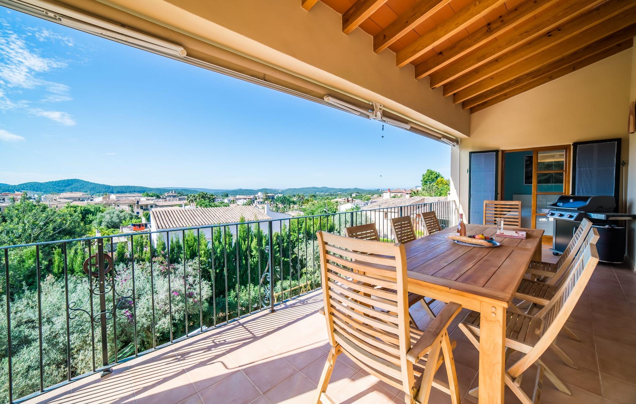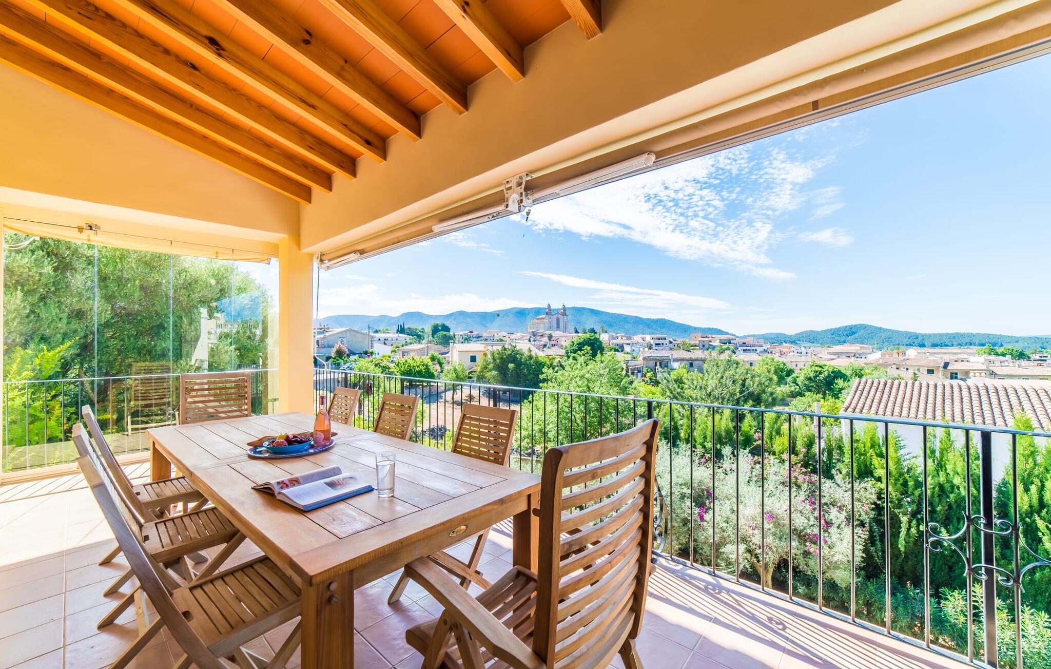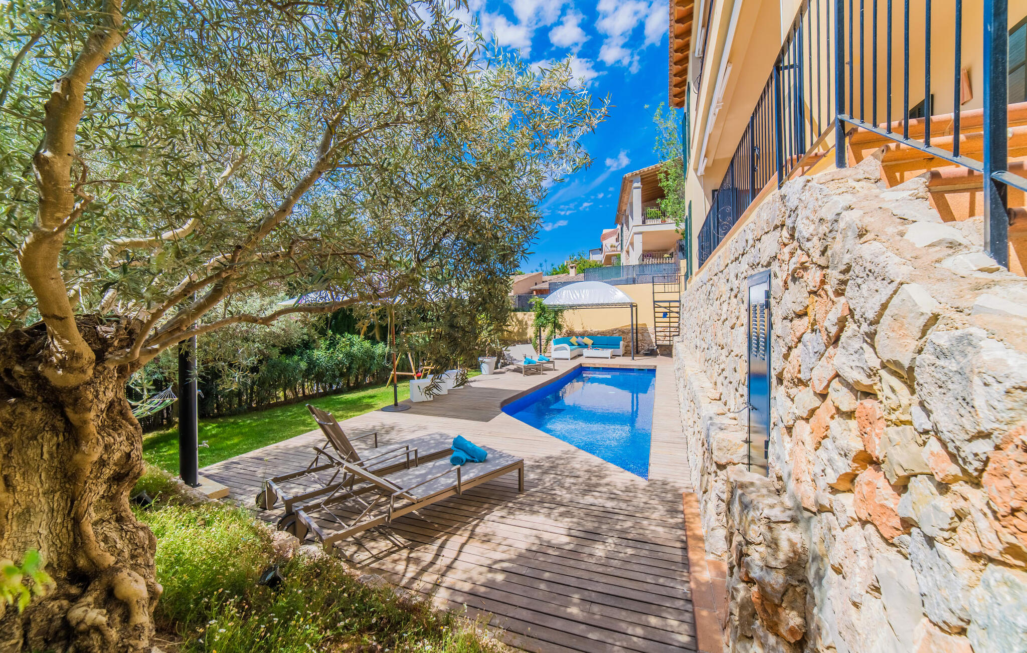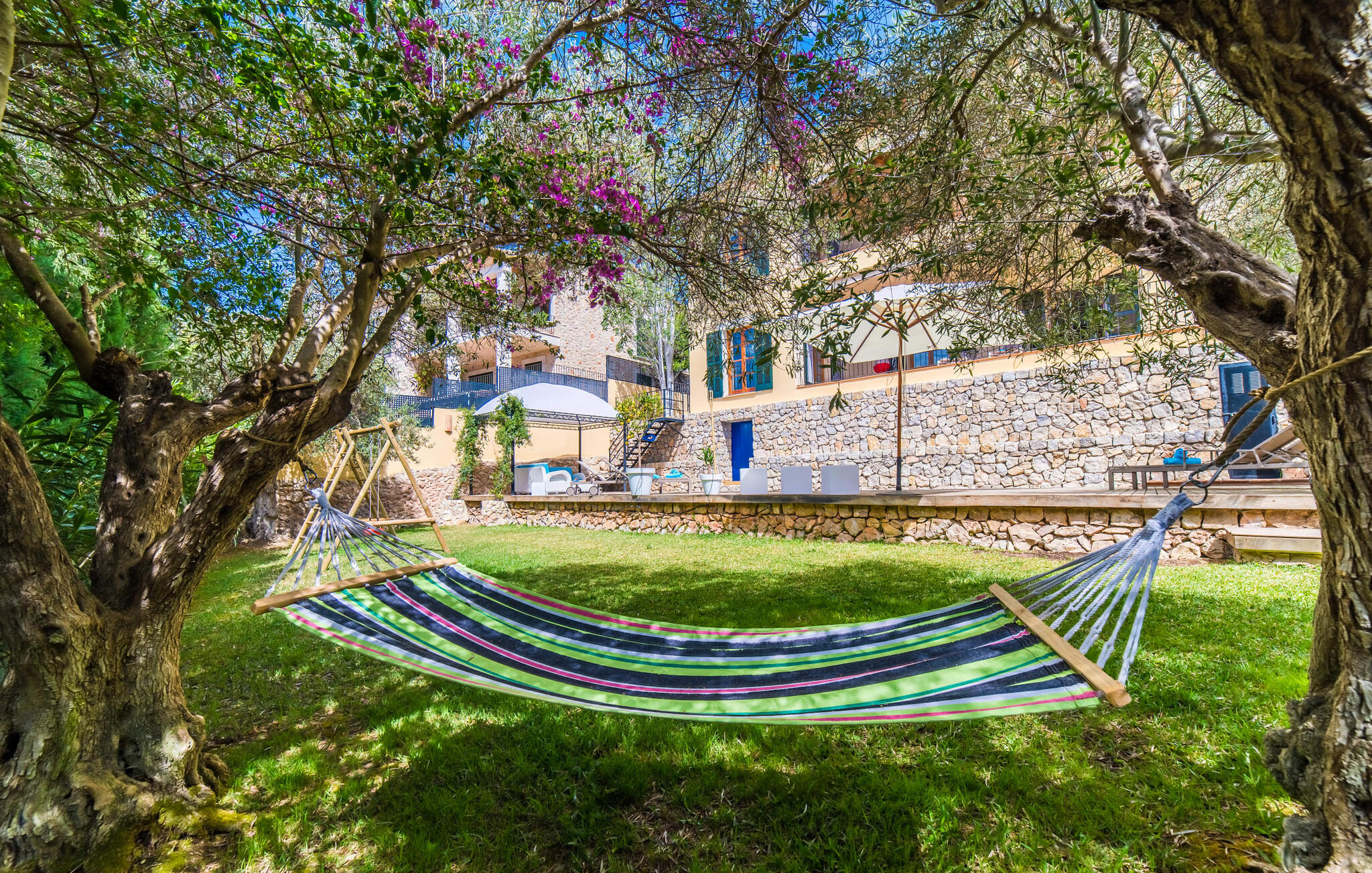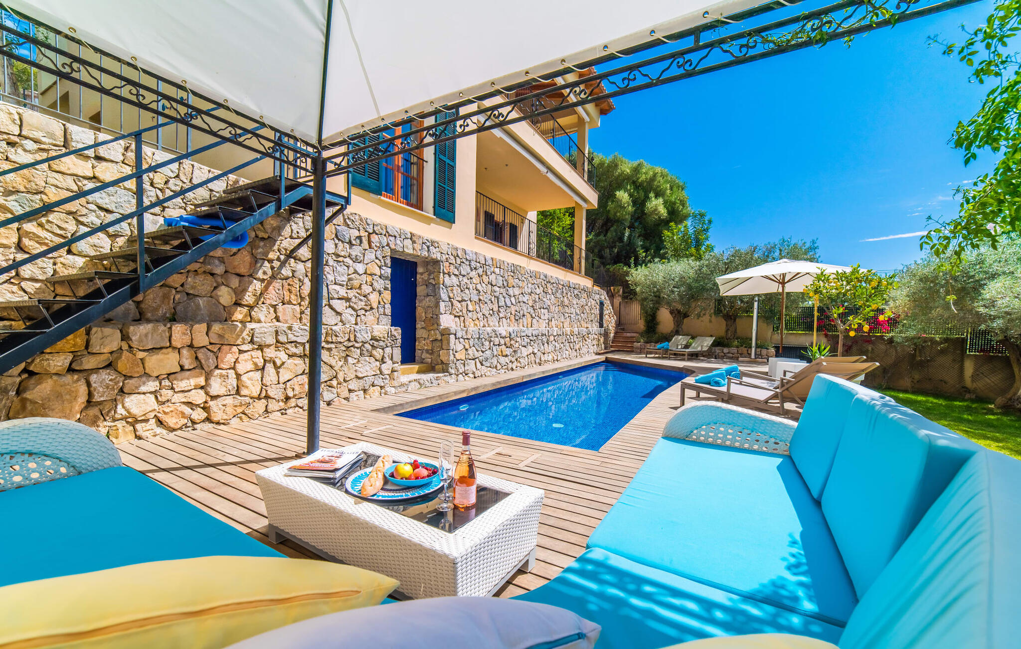 Mama, papa, mogen we hier blijven? De kans is groot dat je kleintjes dat zullen zeggen, want Finca Mofares heeft alles wat een kinderhartje begeert: een klimrek, een schommel en een grote trampoline. Je hoeft deze vakantie niet op zoek naar een speeltuin, maar gaat gewoon de tuin in. Dit zijn de perfecte omstandigheden om vanaf het begin te genieten van alle voordelen van deze accommodatie. Laten we beginnen met het grote terras op de bovenverdieping, vanwaar je een prachtig uitzicht hebt op het centrum van het pittoreske stadje Calvià. Met een glas Mallorcaanse wijn in de hand kun je vanaf hier de omgeving verkennen: Werp je blik over de traditionele okerkleurige huizen naar de twee kleine torens van de Sant Joan kerk, waarachter je het zachte silhouet van de Tramuntata bergketen kunt ontwaren. Welkom op je vakantie! Je zou hier waarschijnlijk eeuwig kunnen blijven, ware het niet dat de charmante pergola met chill-out bank vlak naast het zwembad er zo verleidelijk uitziet. Als je wat tijd voor jezelf wilt, kun je ontspannen in de hangmat die tussen twee knoestige bomen aan het einde van de tuin hangt.