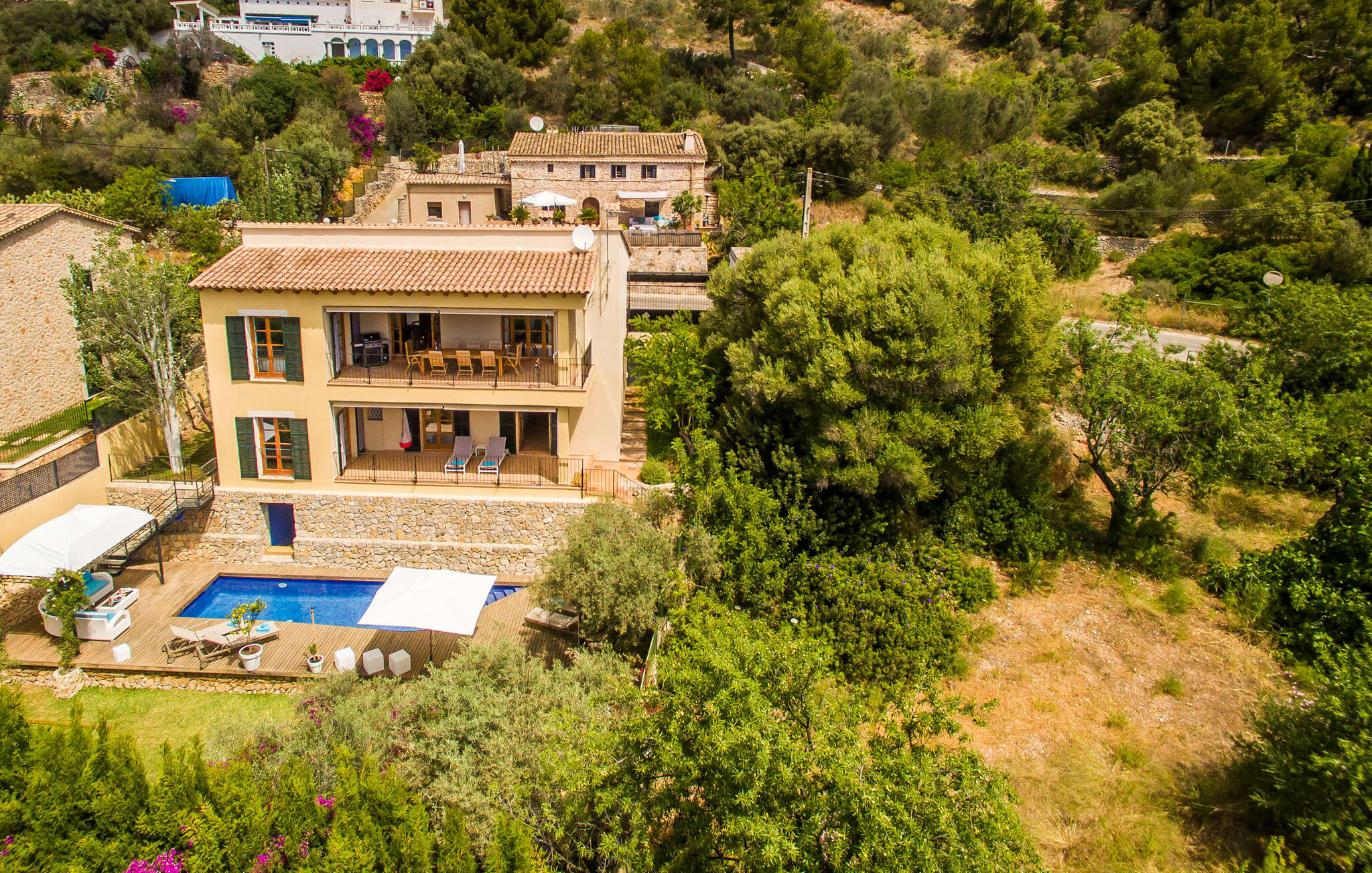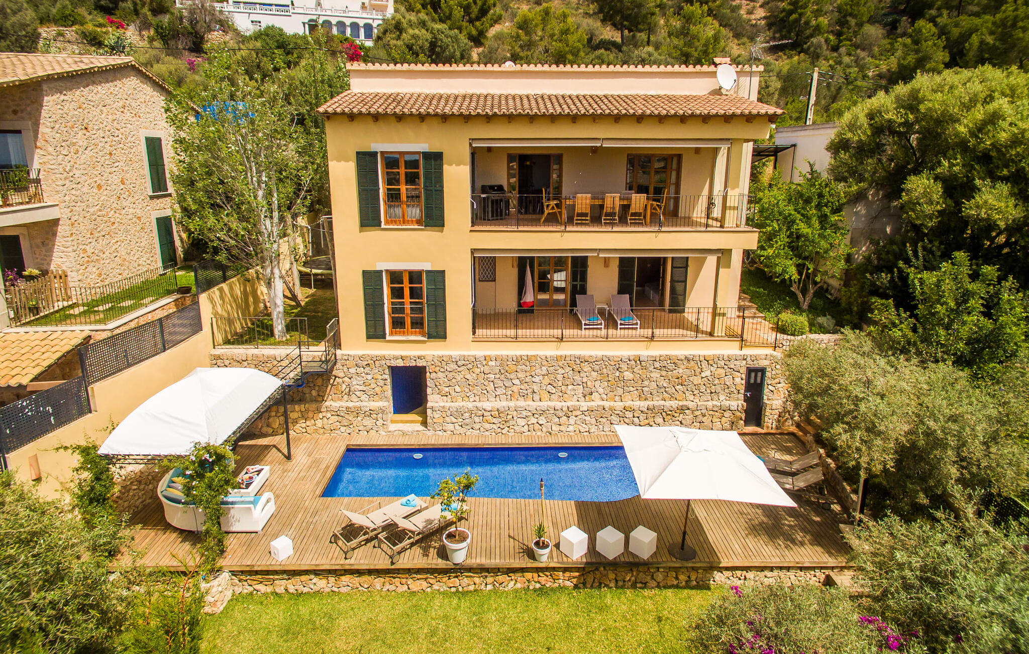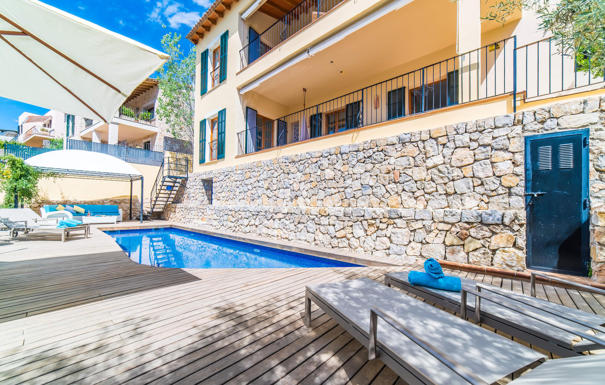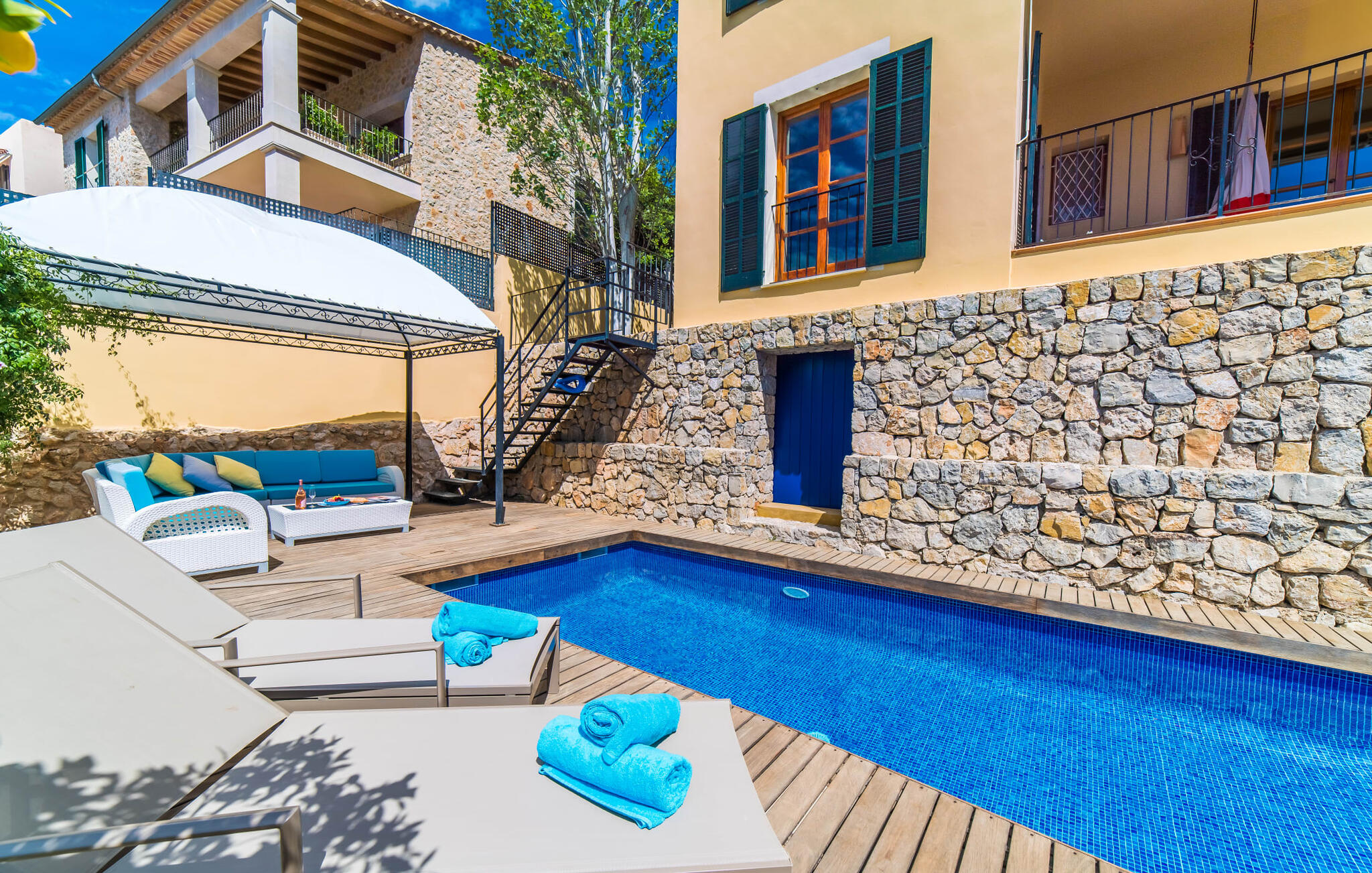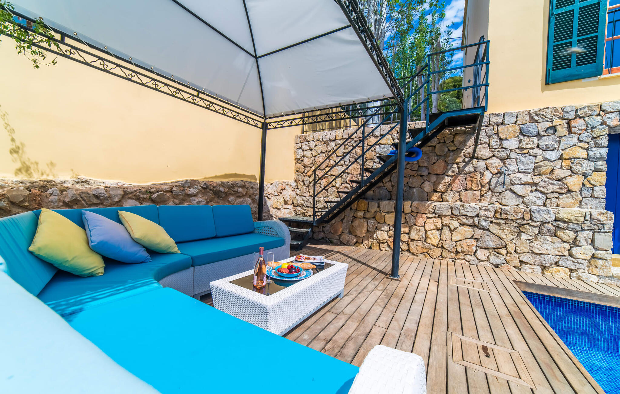 Mama, papa, mogen we hier blijven? De kans is groot dat je kleintjes dat zullen zeggen, want Finca Mofares heeft alles wat een kinderhartje begeert: een klimrek, een schommel en een grote trampoline. Je hoeft deze vakantie niet op zoek naar een speeltuin, maar gaat gewoon de tuin in. Dit zijn de perfecte omstandigheden om vanaf het begin te genieten van alle voordelen van deze accommodatie. Laten we beginnen met het grote terras op de bovenverdieping, vanwaar je een prachtig uitzicht hebt op het centrum van het pittoreske stadje Calvià. Met een glas Mallorcaanse wijn in de hand kun je vanaf hier de omgeving verkennen: Werp je blik over de traditionele okerkleurige huizen naar de twee kleine torens van de Sant Joan kerk, waarachter je het zachte silhouet van de Tramuntata bergketen kunt ontwaren. Welkom op je vakantie! Je zou hier waarschijnlijk eeuwig kunnen blijven, ware het niet dat de charmante pergola met chill-out bank vlak naast het zwembad er zo verleidelijk uitziet. Als je wat tijd voor jezelf wilt, kun je ontspannen in de hangmat die tussen twee knoestige bomen aan het einde van de tuin hangt.