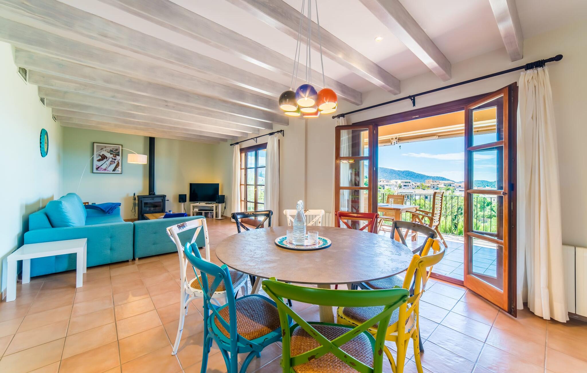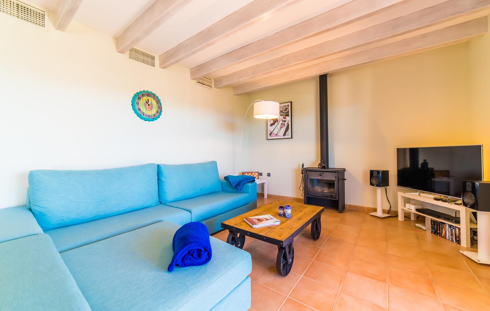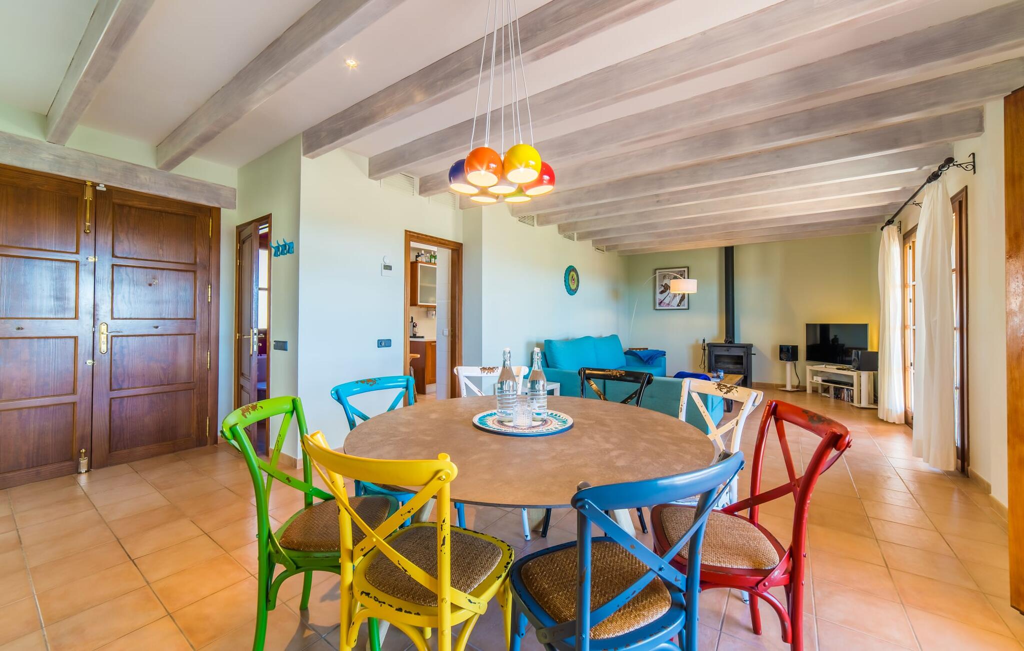 Het interieur van de finca is ook een blikvanger: het hele interieur kan worden omschreven als gezellig en modern; in elke kamer zijn kleurrijke accenten aangebracht met verf of accessoires om de zomerse sfeer die deze accommodatie uitstraalt nog meer te benadrukken. De mooie open woonkamer biedt veel royale ruimte en heeft directe toegang tot het overdekte terras, dat ook ideaal is voor barbecues. De glazen dubbele deuren laten veel licht binnen en rond de ronde tafel staan vrolijke, kleurrijke stoelen op je te wachten. Aan de linkerkant is een gezellige zithoek met een houtkachel, stereo-installatie en tv, zodat er zelfs op dagen met slecht weer altijd een aangename sfeer is en genoeg om je bezig te houden. Net daarachter ligt de volledig uitgeruste keuken, wat de ideale plek is om te beginnen met het voorbereiden van een gezamenlijke BBQ. En als je van een warme kop koffie houdt, staat er een Nespresso-apparaat tot je beschikking. De vier slaapkamers zijn verdeeld over de boven- en benedenverdieping, waarvan er twee een eigen badkamer hebben. Alle slaapkamers zijn voorzien van gloednieuwe matrassen, waardoor het nog comfortabeler is om dromenland binnen te stappen. De twee ruime badkamers hebben een ligbad en het extra toilet heeft een pretty-in-pink look. Nu komen we bij een ander hoogtepunt van dit huis, dat zich in de kelder bevindt: de sauna met een eigen ontspanningsruimte. Als je het huis in de koelere maanden bezoekt, vind je hier je eigen privé wellnessoase.