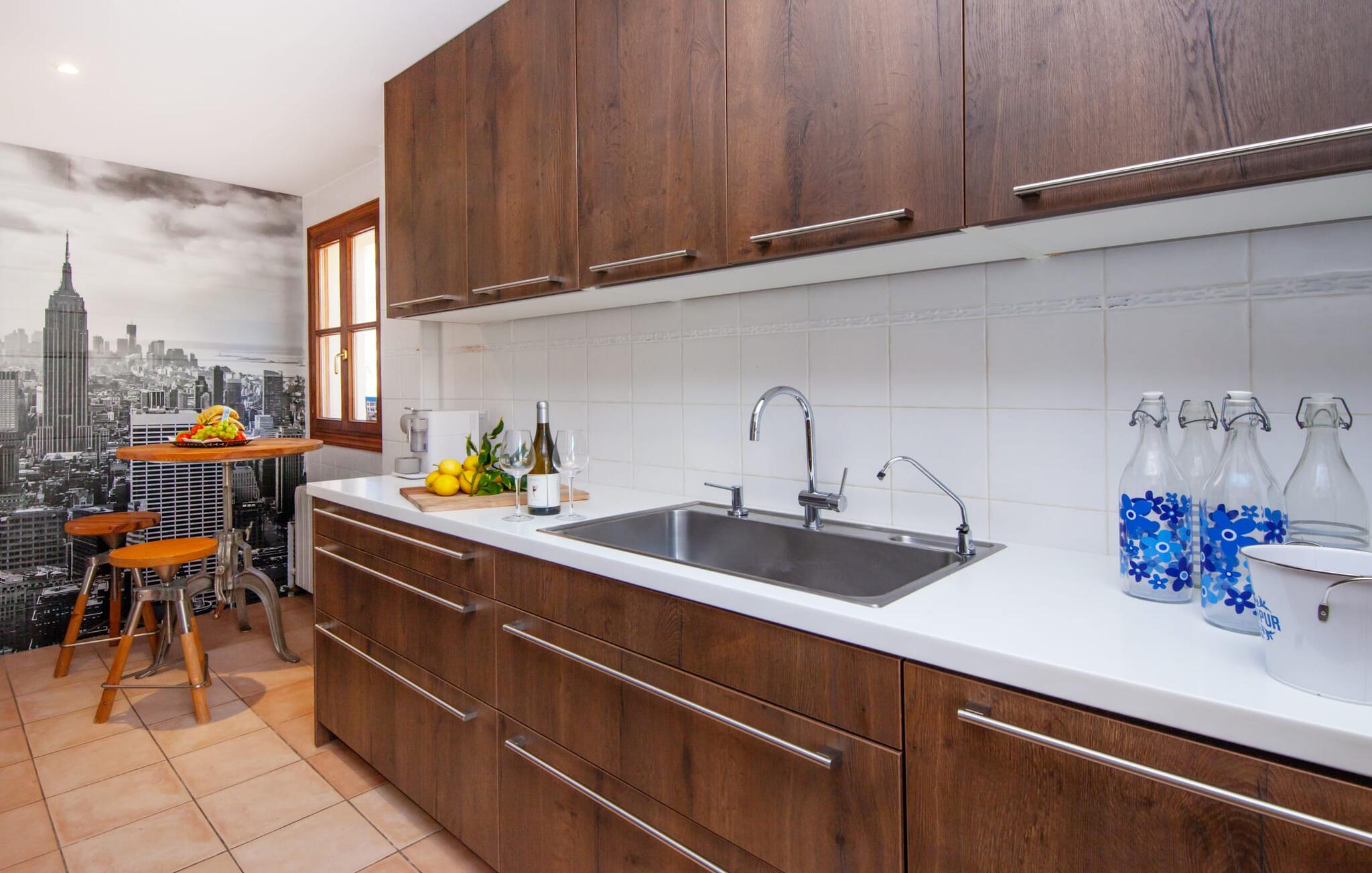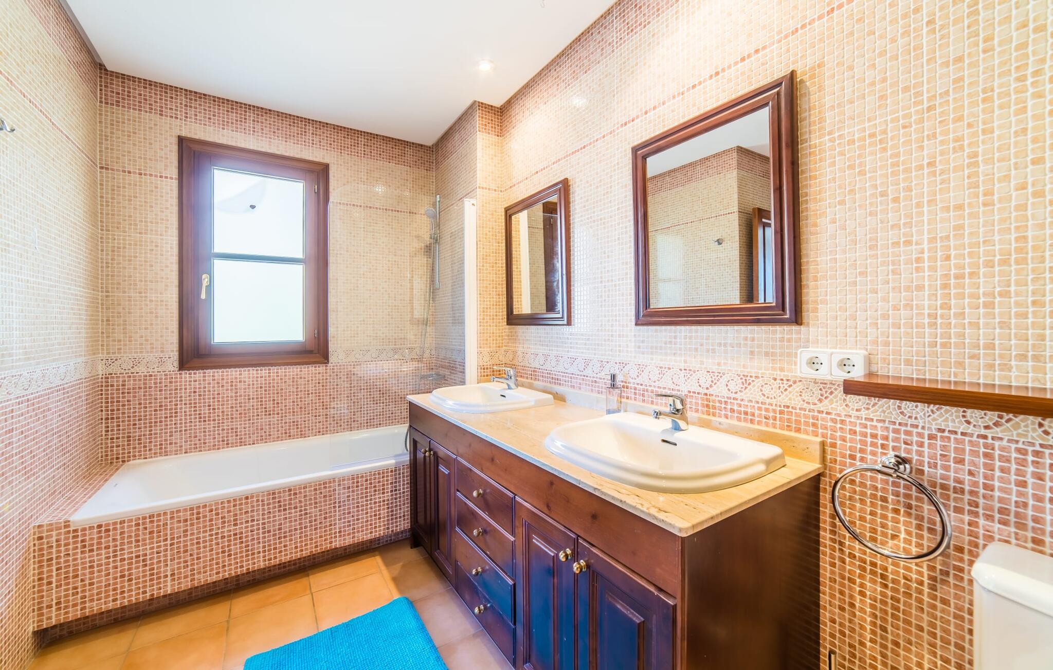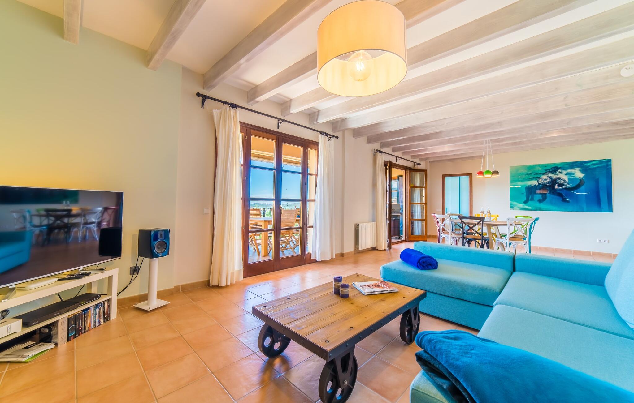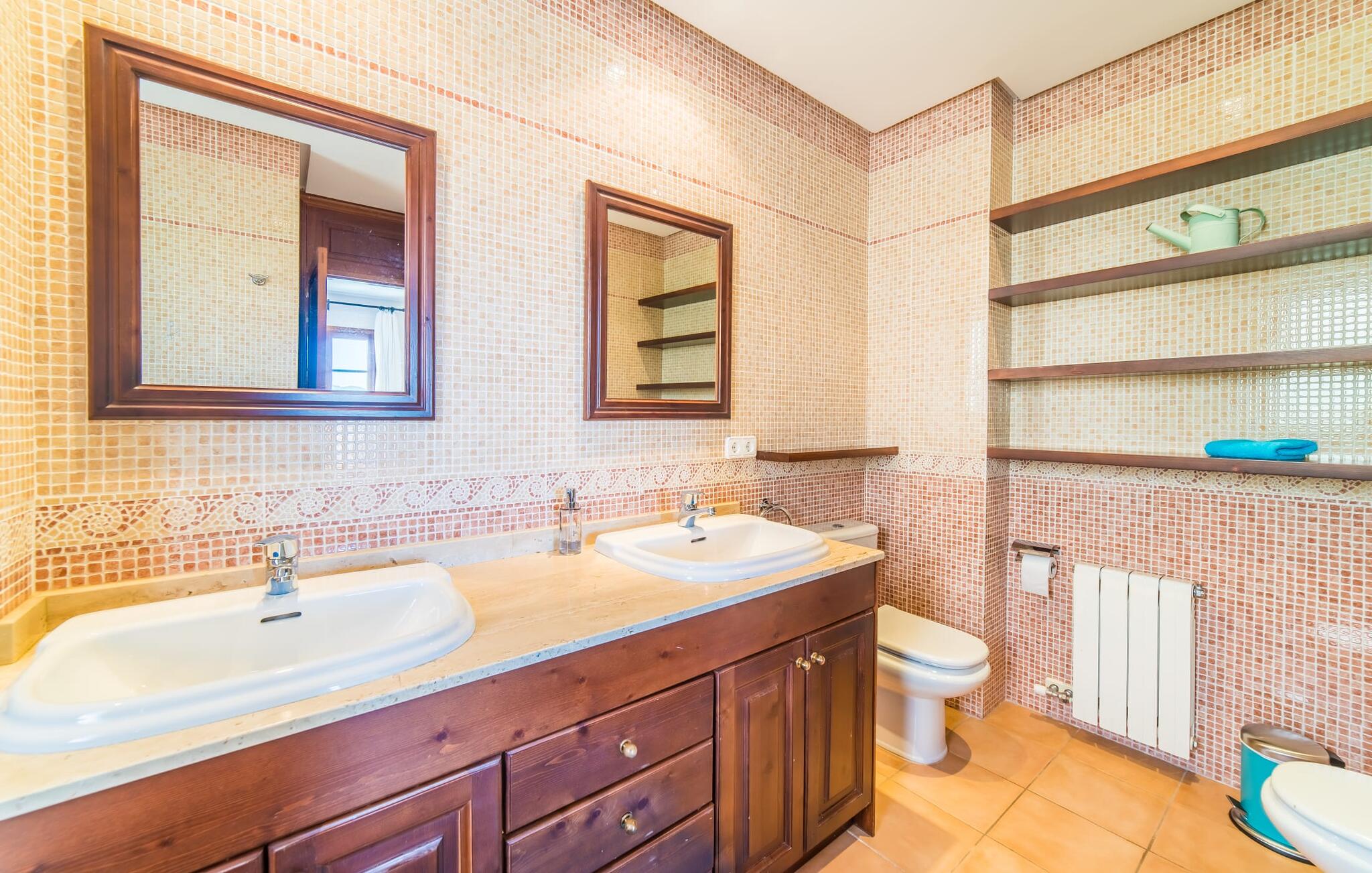 Het interieur van de finca is ook een blikvanger: het hele interieur kan worden omschreven als gezellig en modern; in elke kamer zijn kleurrijke accenten aangebracht met verf of accessoires om de zomerse sfeer die deze accommodatie uitstraalt nog meer te benadrukken. De mooie open woonkamer biedt veel royale ruimte en heeft directe toegang tot het overdekte terras, dat ook ideaal is voor barbecues. De glazen dubbele deuren laten veel licht binnen en rond de ronde tafel staan vrolijke, kleurrijke stoelen op je te wachten. Aan de linkerkant is een gezellige zithoek met een houtkachel, stereo-installatie en tv, zodat er zelfs op dagen met slecht weer altijd een aangename sfeer is en genoeg om je bezig te houden. Net daarachter ligt de volledig uitgeruste keuken, wat de ideale plek is om te beginnen met het voorbereiden van een gezamenlijke BBQ. En als je van een warme kop koffie houdt, staat er een Nespresso-apparaat tot je beschikking. De vier slaapkamers zijn verdeeld over de boven- en benedenverdieping, waarvan er twee een eigen badkamer hebben. Alle slaapkamers zijn voorzien van gloednieuwe matrassen, waardoor het nog comfortabeler is om dromenland binnen te stappen. De twee ruime badkamers hebben een ligbad en het extra toilet heeft een pretty-in-pink look. Nu komen we bij een ander hoogtepunt van dit huis, dat zich in de kelder bevindt: de sauna met een eigen ontspanningsruimte. Als je het huis in de koelere maanden bezoekt, vind je hier je eigen privé wellnessoase.