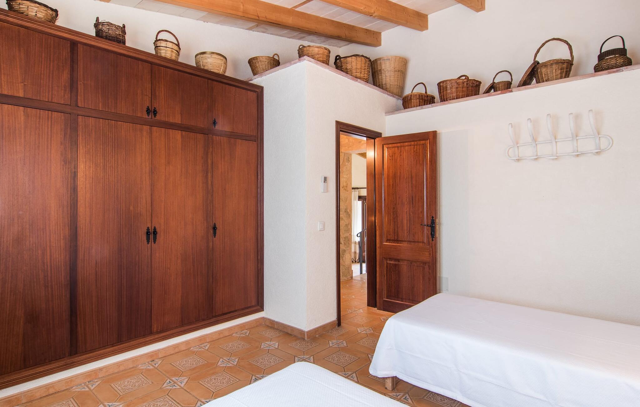 Binnen worden natuurstenen muren afgewisseld met lichte en vrolijke witgekalkte muren. De woonkamer, genesteld onder massieve houten balkenplafonds, is de ideale plek om een paar ontspannen uurtjes door te brengen op de hoekbank terwijl je naar de moderne tv kijkt. De groen betegelde keuken ernaast is nog een mogelijkheid om je thuis te voelen terwijl je je lekkernijen bereidt. Aan de andere kant breng je je vakantie door op een prachtig eiland en in een mooi huis waarvan de inrichting veel van de oorspronkelijke sfeer van het landelijke eilandleven overbrengt. Dus pak je potten en pannen en laat je smaakpapillen de Mallorcaanse manier van leven ontdekken. De keuken is uitgerust met een oven, koelkast, magnetron, wasmachine en vaatwasser en alle moderne gemakken staan tot je beschikking. Luxe vloerverwarming en airconditioning zorgen ervoor dat je bij de ideale temperatuur van je vakantie kunt genieten. Ook de inrichting van de drie gezellige tweepersoonsslaapkamers sluit perfect aan bij het antieke karakter van het huis. Een van de slaapkamers is ingericht met twee eenpersoonsbedden en biedt daardoor verschillende slaapmogelijkheden. De badkamer is ook uitgerust met een bidet en een bad.
