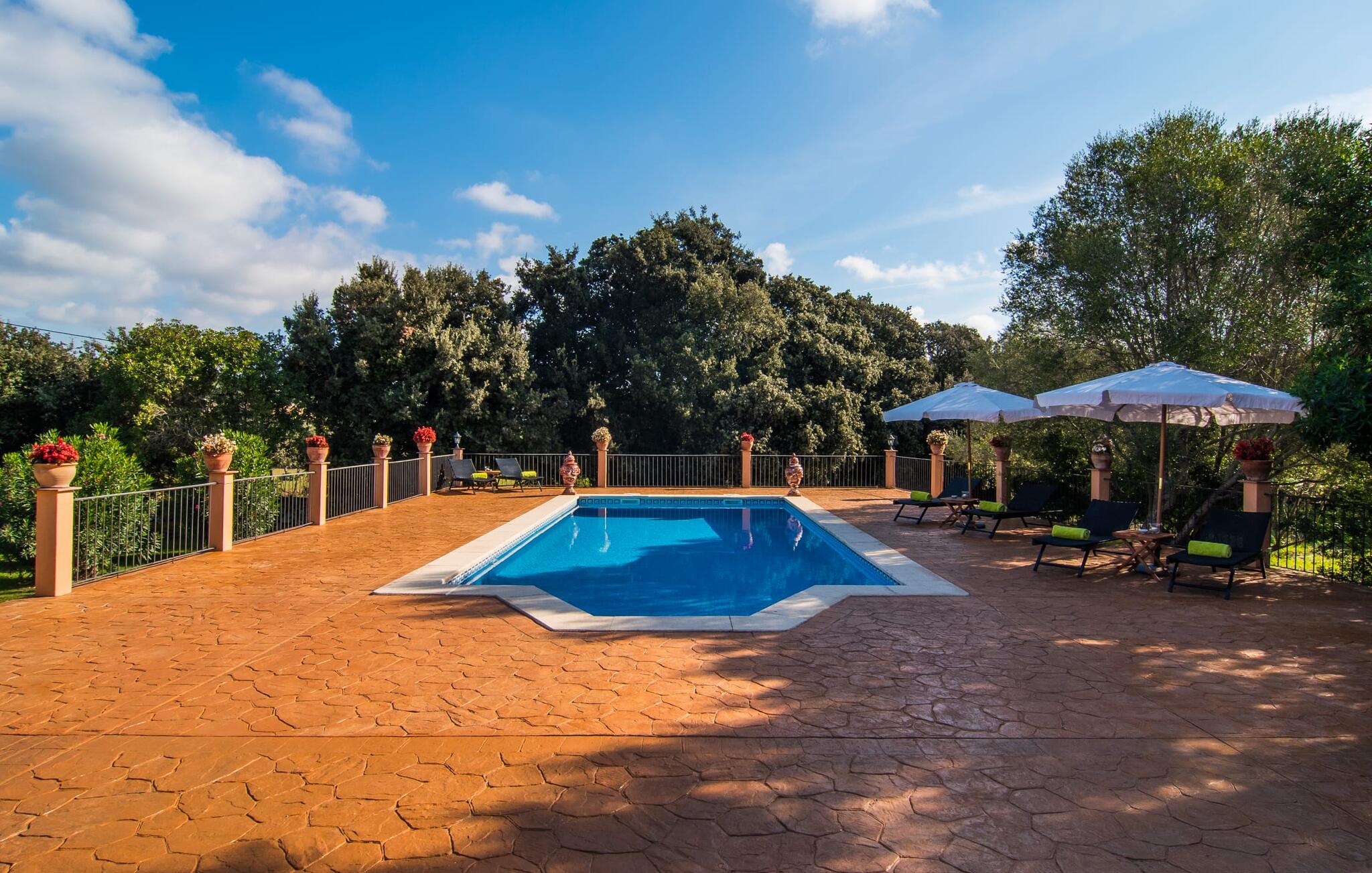 Hou je van warme terracotta kleuren? Dan zul je dol zijn op deze villa! Als je eenmaal de grote tuin bent binnengegaan en het stenen pad naar de ingang hebt gevolgd, is het maar een paar stappen naar de aantrekkelijke ontspanningsruimte met een ruim zwembad, zonneterras voor zonaanbidders en een vast geïnstalleerde barbecue met voldoende ruimte voor je maaltijden. Tot zes personen plus een baby kunnen hier genieten van een echte droomvakantie. Het groen van het pand, dat doet denken aan een oase met een verscheidenheid aan verschillende planten, geeft meteen een gevoel van ontspanning. Het grote overdekte terras met zijn gezellige bank en grote eettafel is ook uiterst comfortabel en een ideale plek om een tuinfeest te organiseren of gewoon tot laat in de avond buiten te zitten en te genieten van de milde eilandlucht. Het pand is ook perfect voor een korte wandeling naar de fontein of om je te vergapen aan enkele van de ingewikkelde details, zoals het fietssculpturenpark of een van de stenen standbeelden.