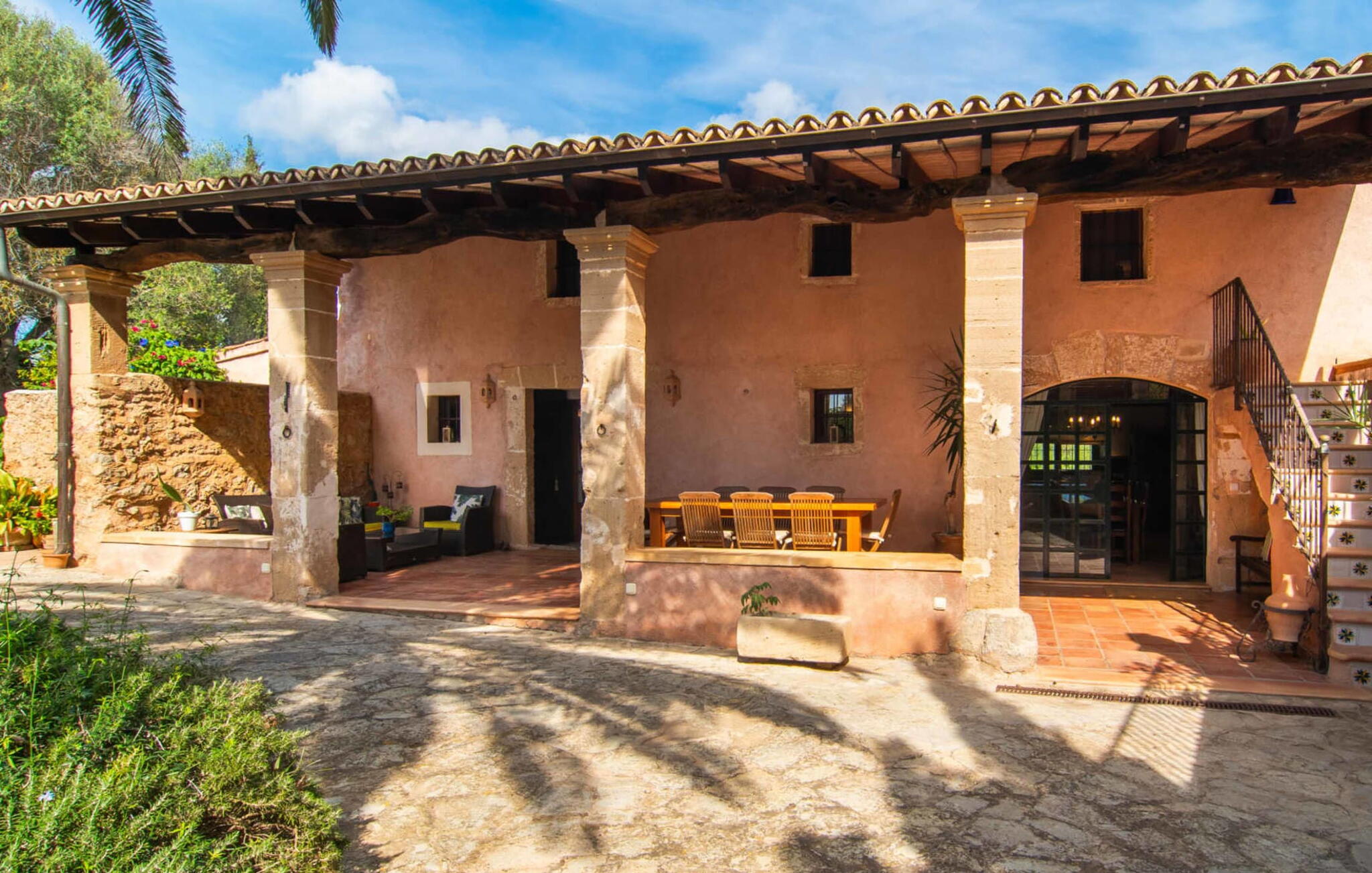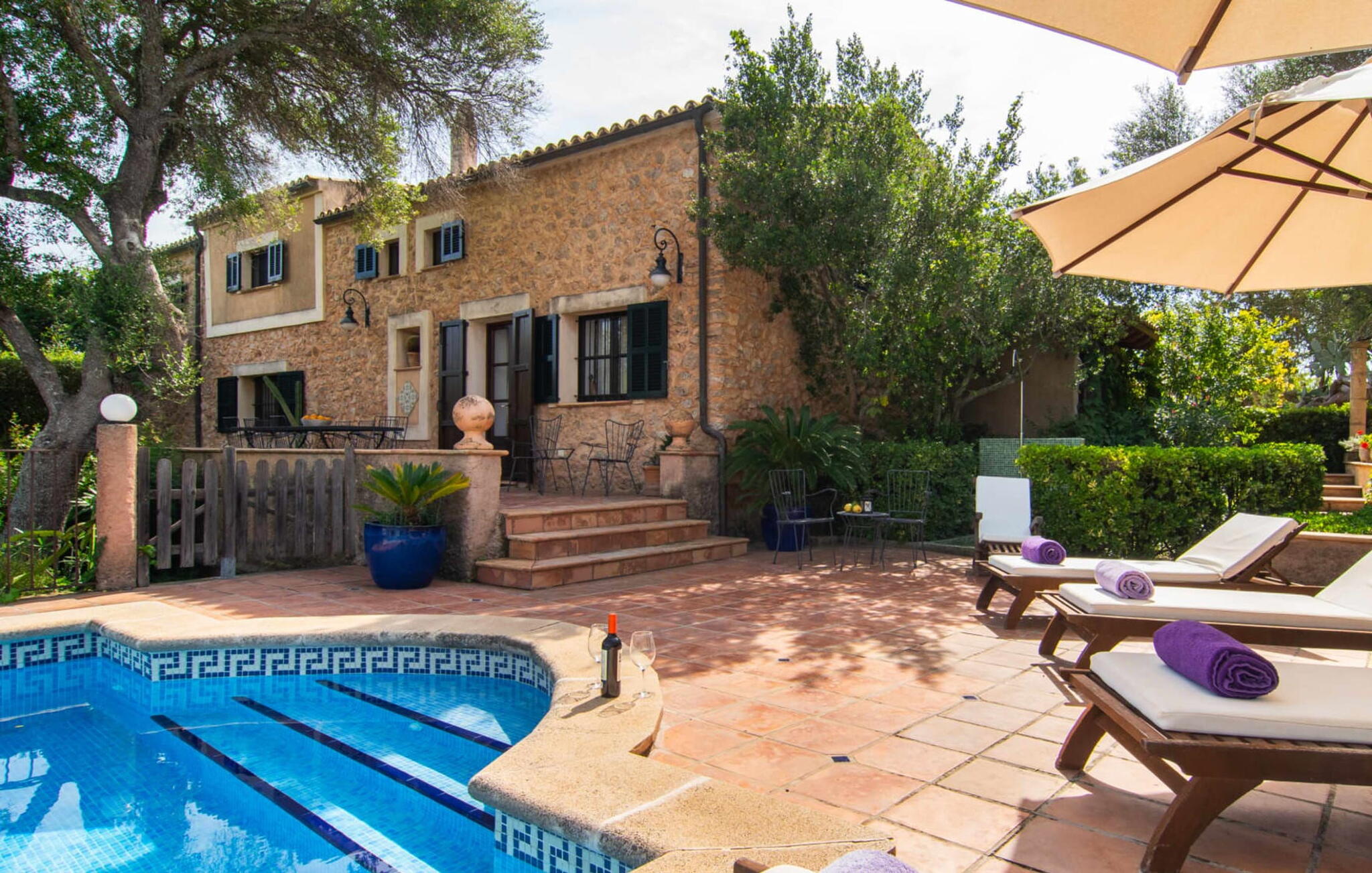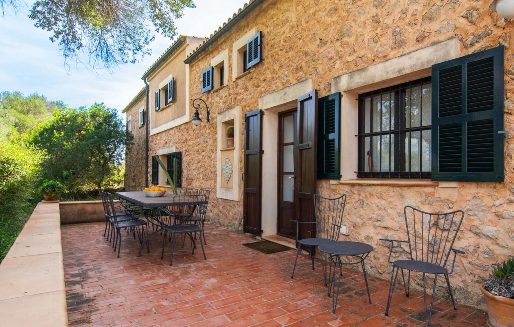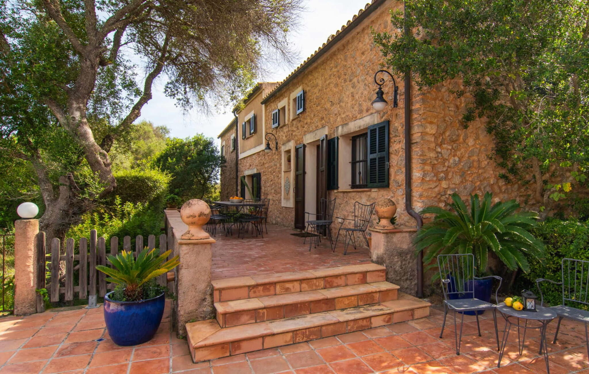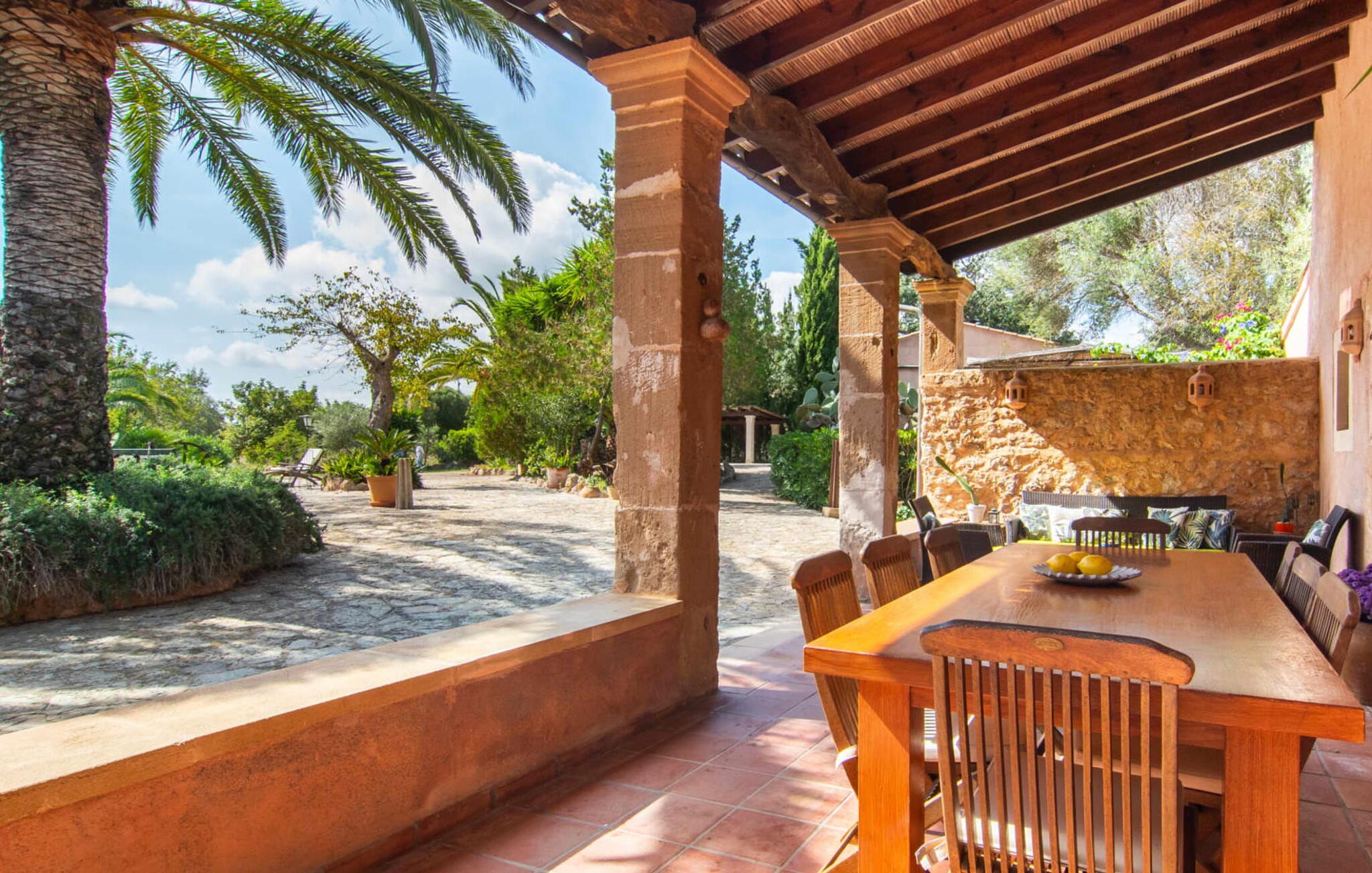 De 18e-eeuwse boerderij Na Mayans is zorgvuldig gerestaureerd. Het wordt omringd door een prachtige, afgelegen tuin en 50.000 m² grond in het oosten van Mallorca. De weelderige vegetatie van palmbomen en bougainvilles biedt talloze gezellige plekjes en terrassen met veel privacy.