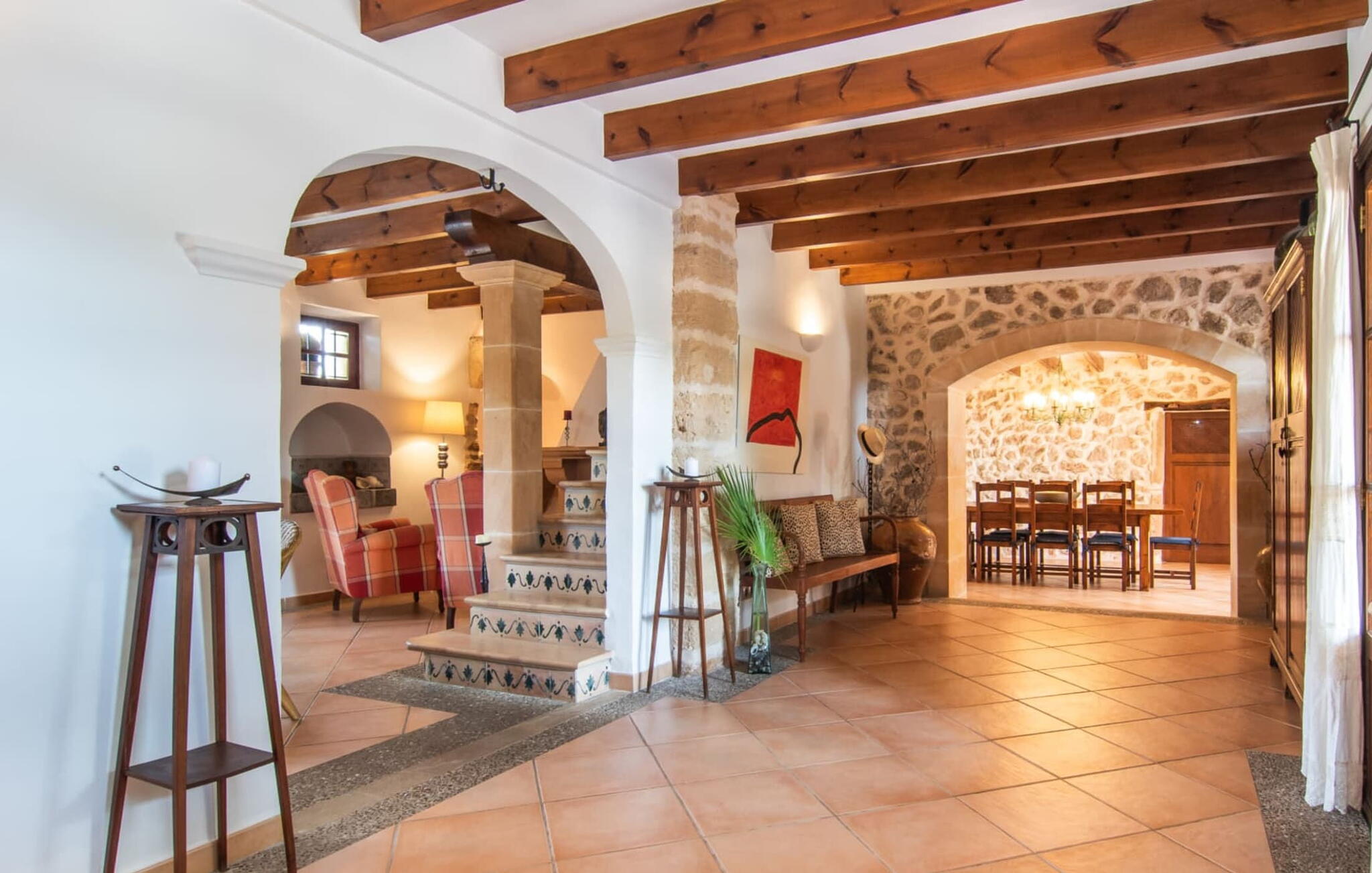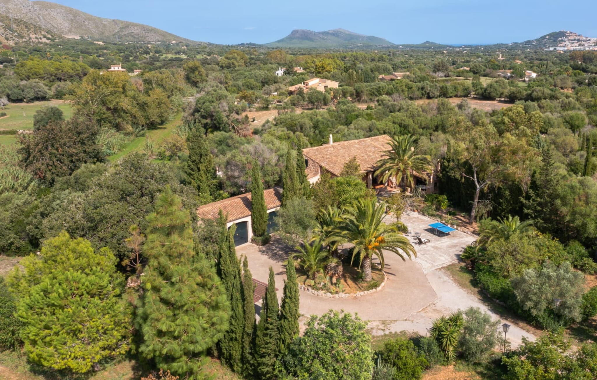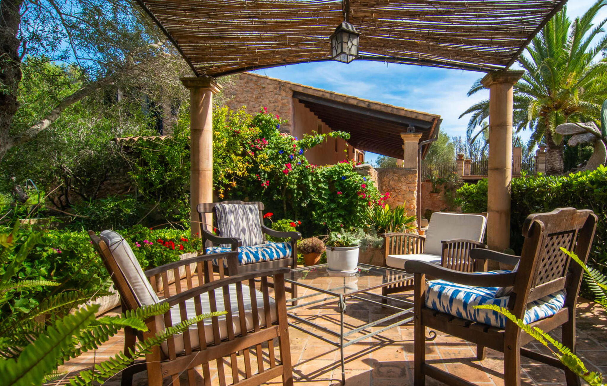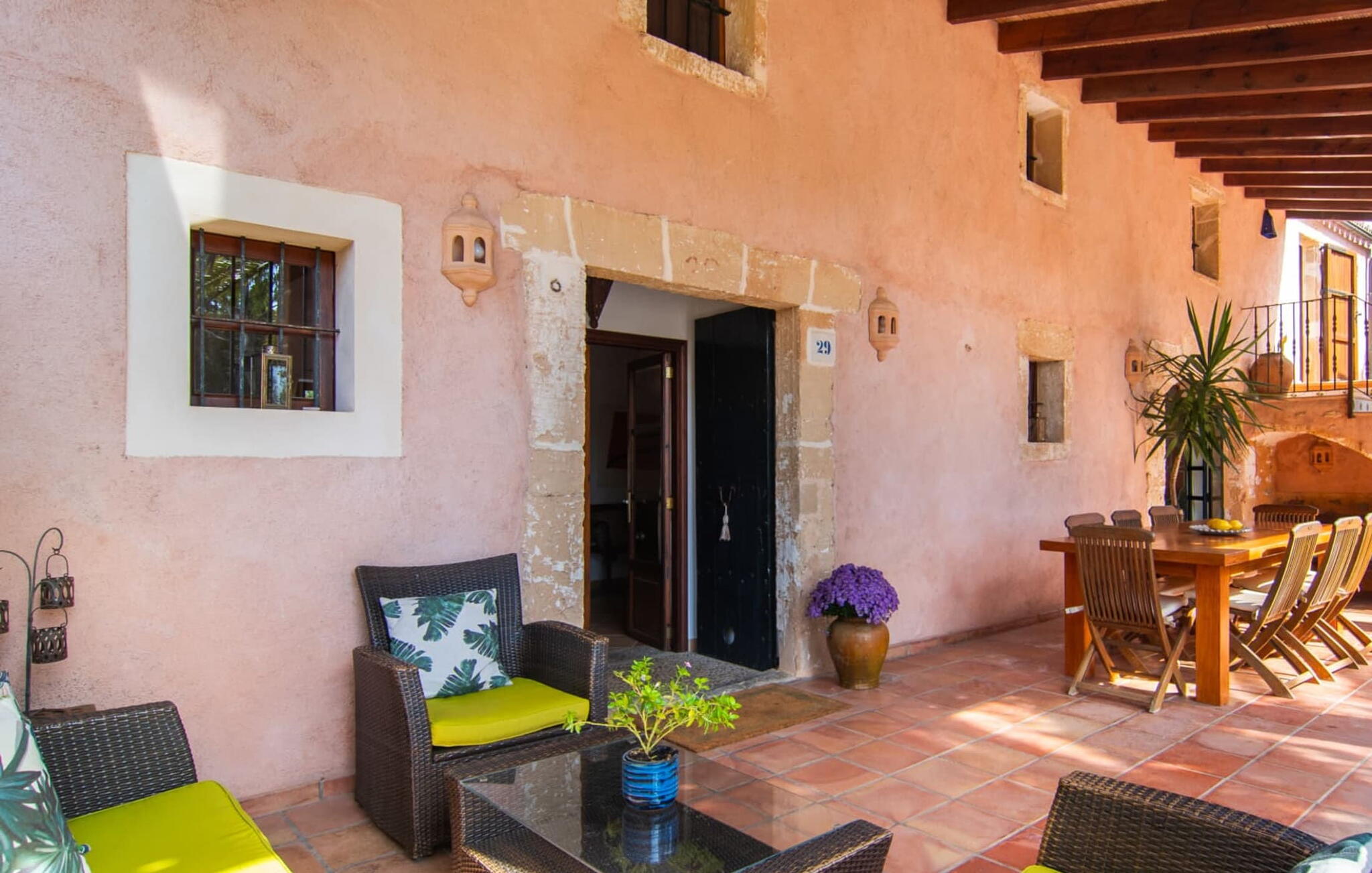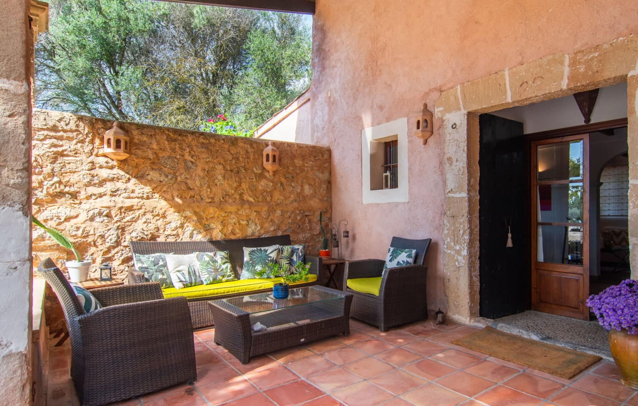 De 18e-eeuwse boerderij Na Mayans is zorgvuldig gerestaureerd. Het wordt omringd door een prachtige, afgelegen tuin en 50.000 m² grond in het oosten van Mallorca. De weelderige vegetatie van palmbomen en bougainvilles biedt talloze gezellige plekjes en terrassen met veel privacy.
