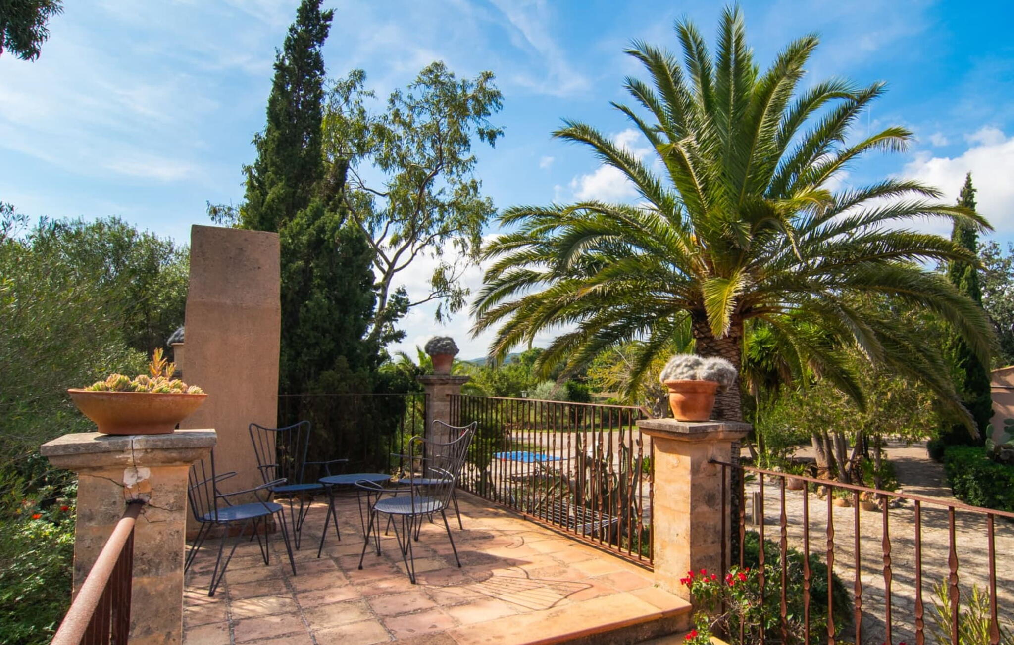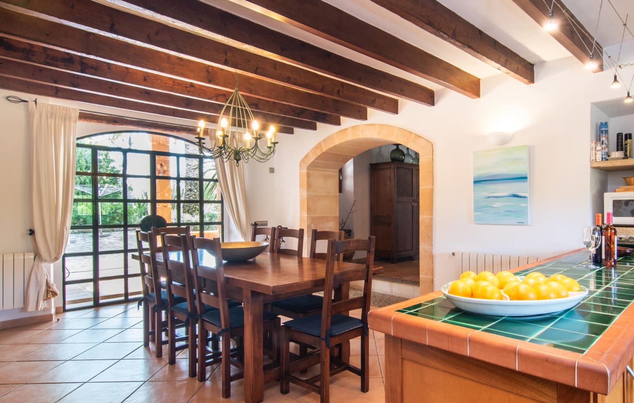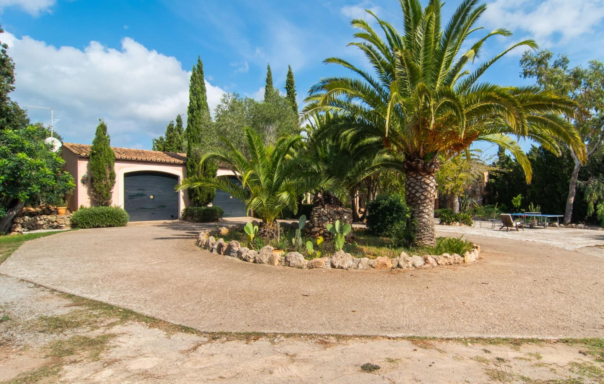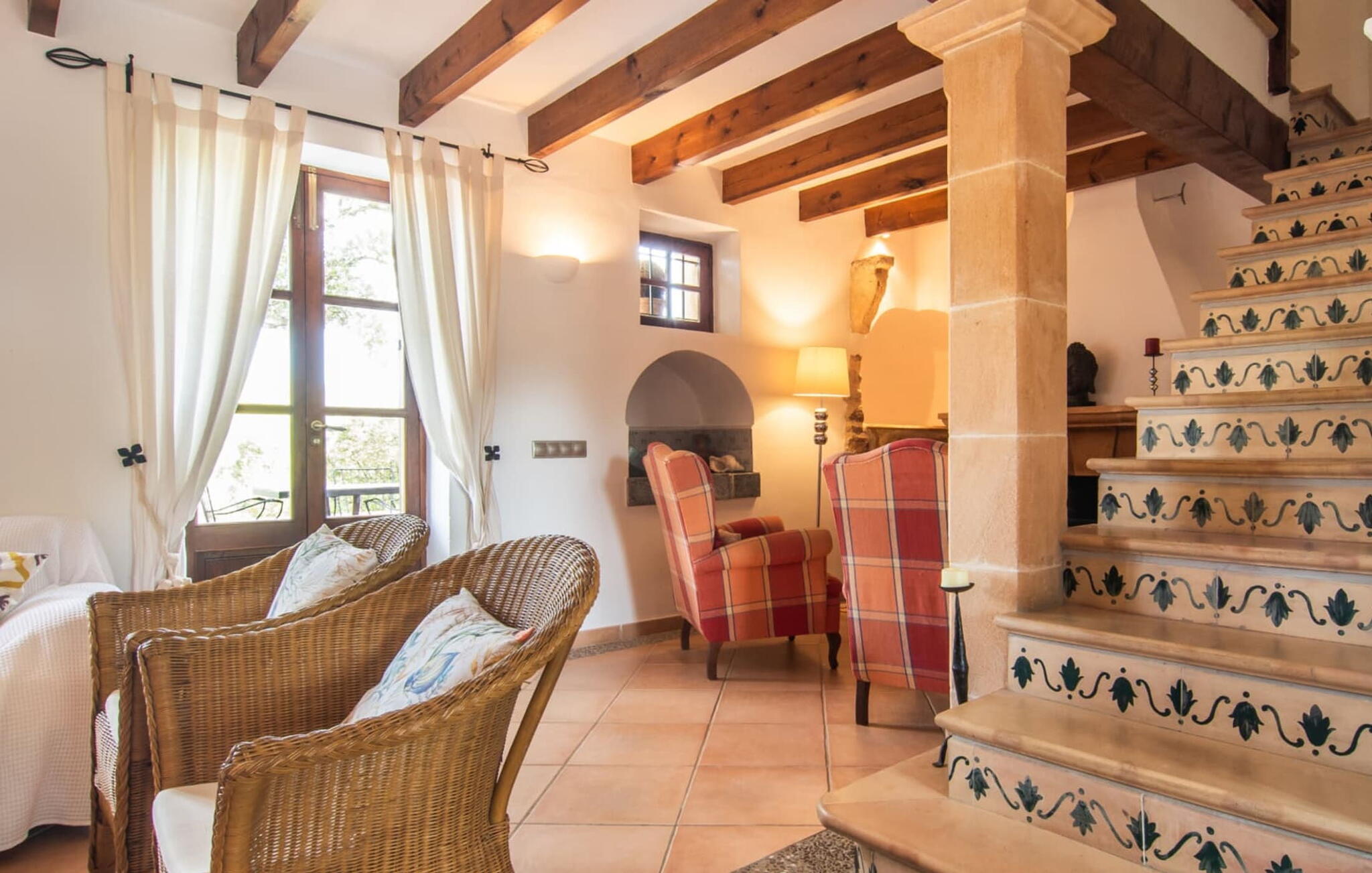 De 18e-eeuwse boerderij Na Mayans is zorgvuldig gerestaureerd. Het wordt omringd door een prachtige, afgelegen tuin en 50.000 m² grond in het oosten van Mallorca. De weelderige vegetatie van palmbomen en bougainvilles biedt talloze gezellige plekjes en terrassen met veel privacy.