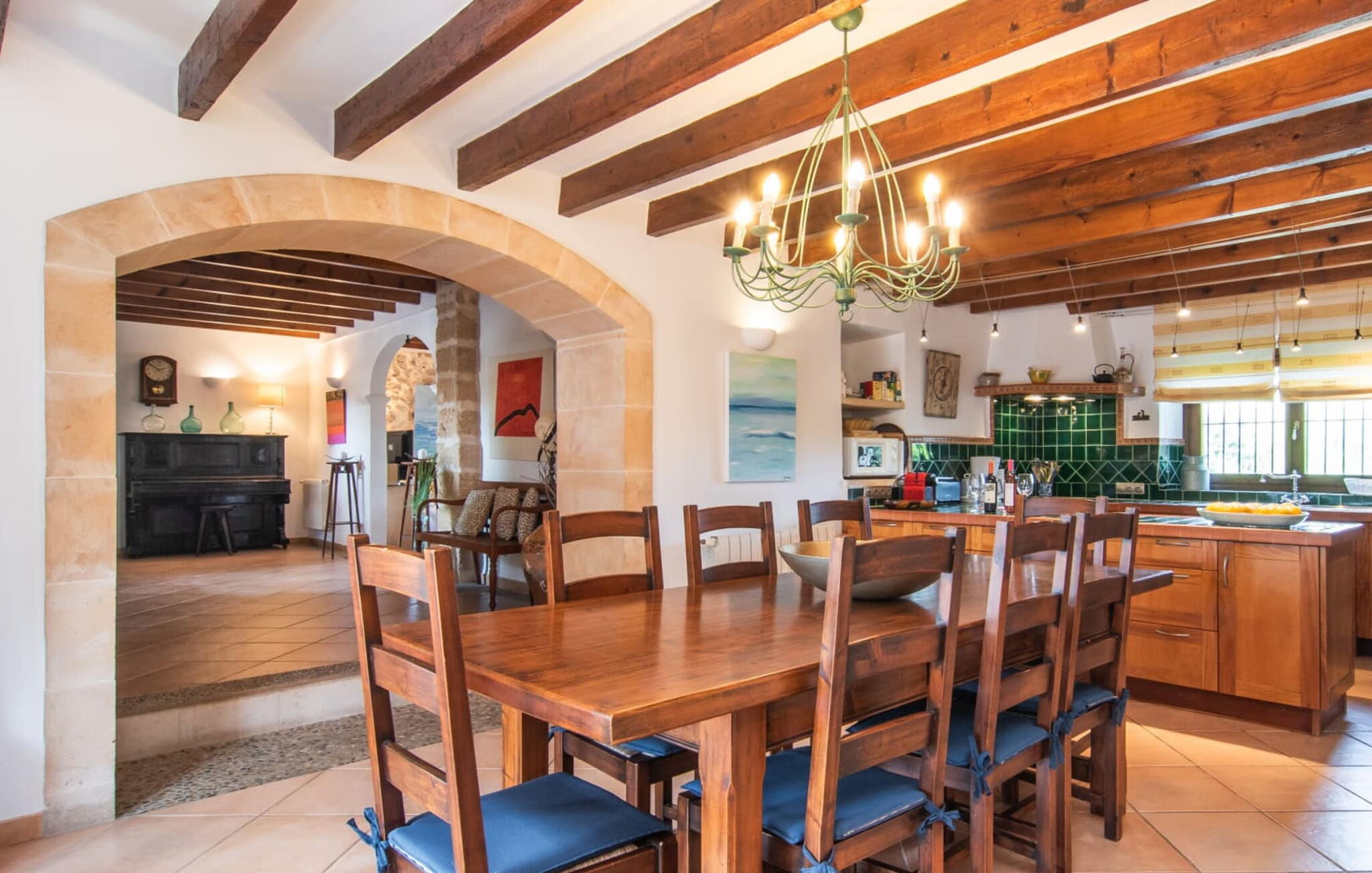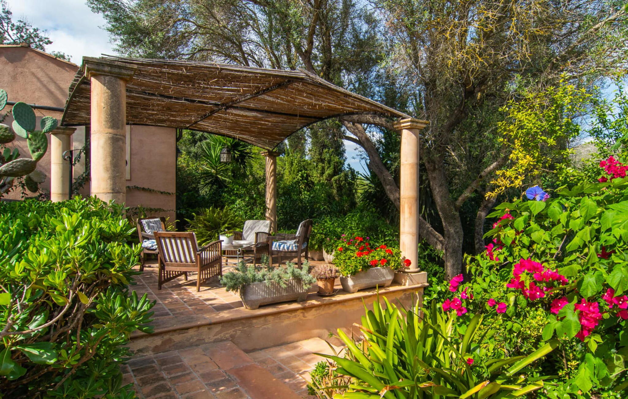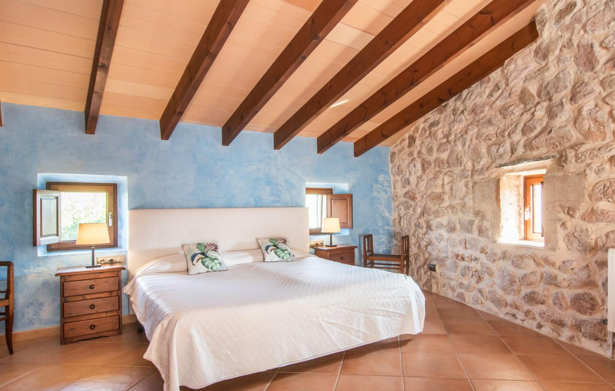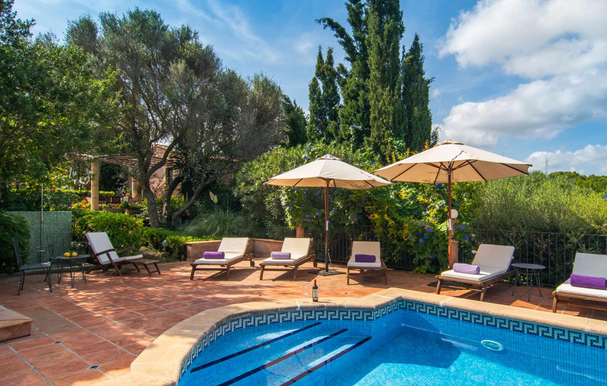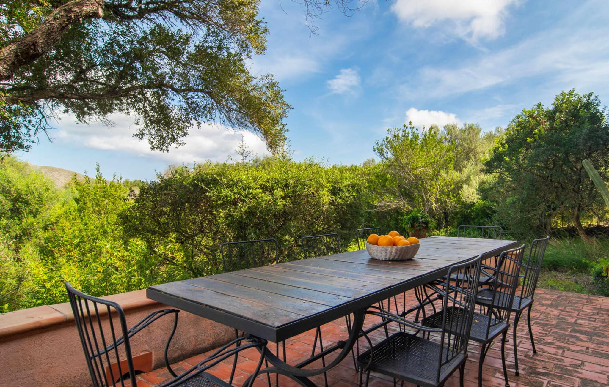 De 18e-eeuwse boerderij Na Mayans is zorgvuldig gerestaureerd. Het wordt omringd door een prachtige, afgelegen tuin en 50.000 m² grond in het oosten van Mallorca. De weelderige vegetatie van palmbomen en bougainvilles biedt talloze gezellige plekjes en terrassen met veel privacy.