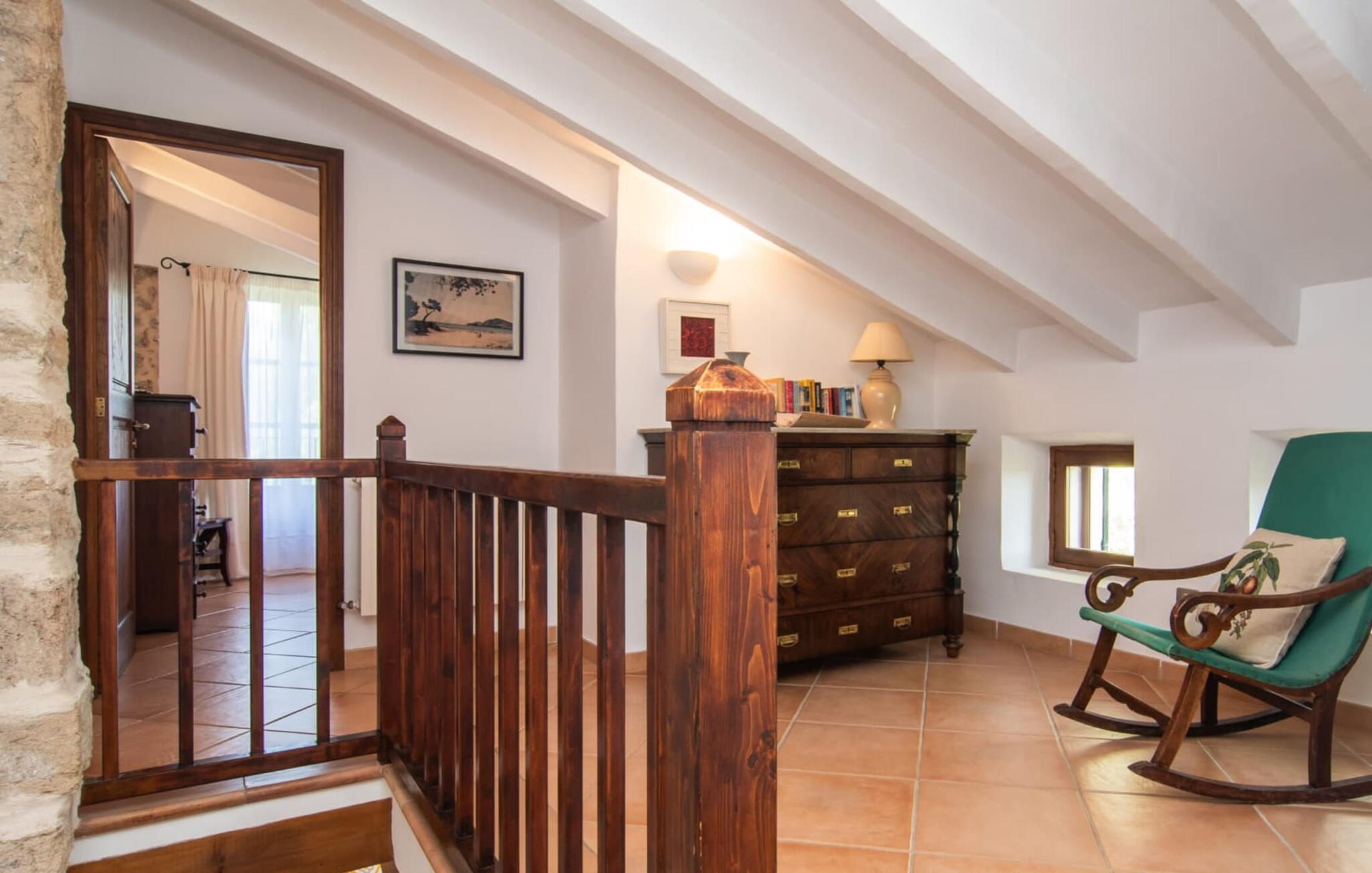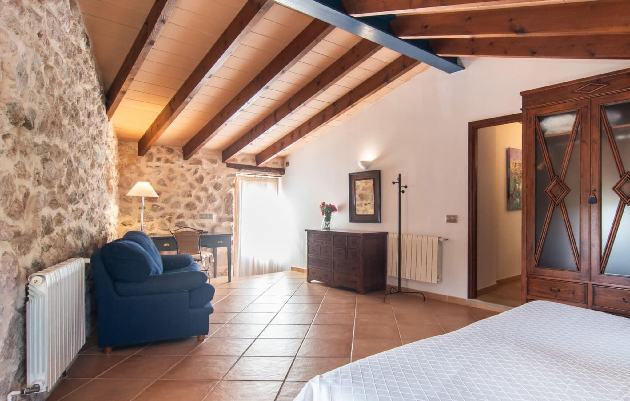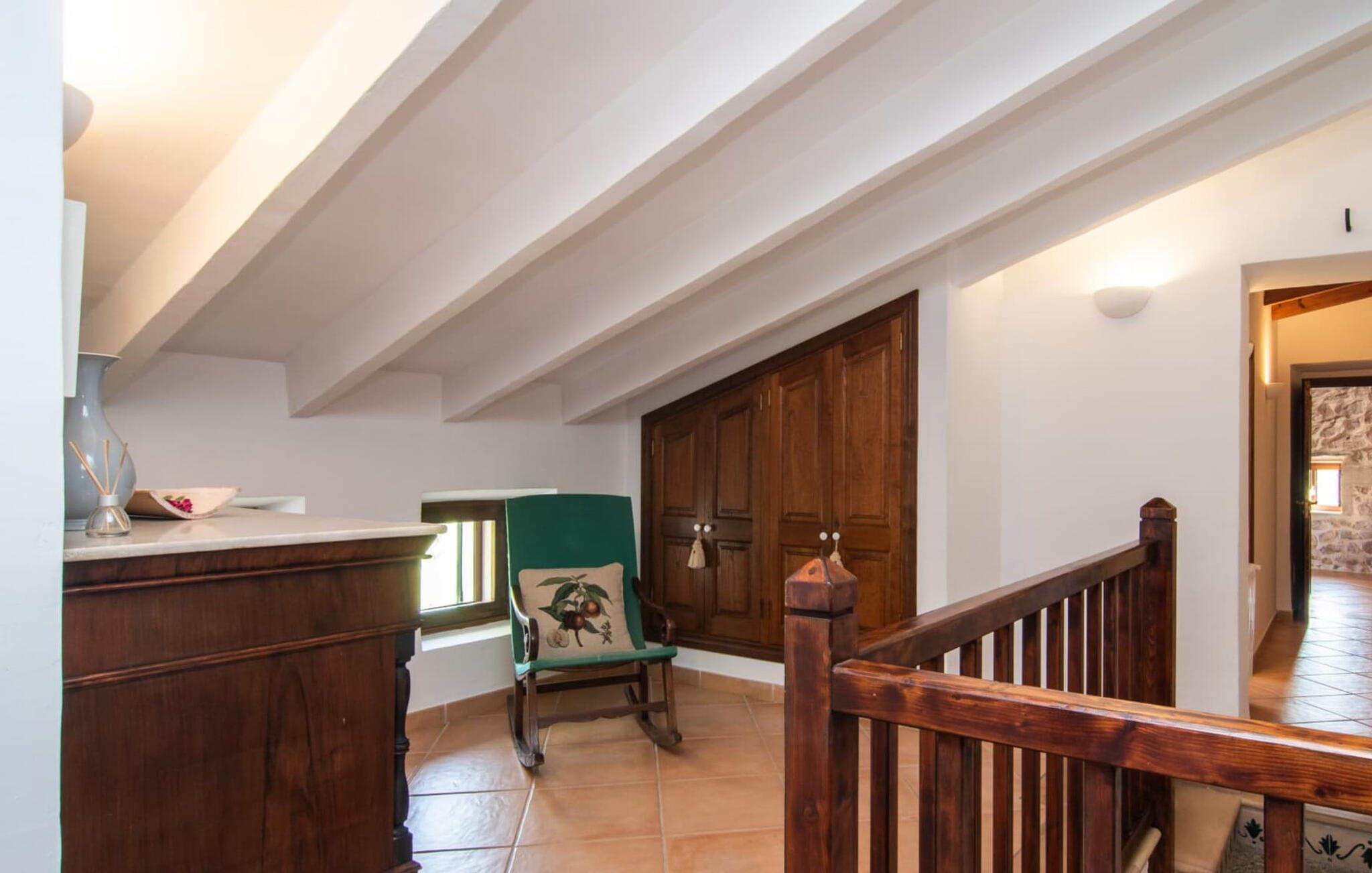 Het interieur maakt indruk met zijn authentieke landhuis sfeer. Originele elementen zijn bewaard gebleven tijdens de renovatie. Natuurstenen muren, houten balkenplafonds en zandstenen bogen zijn met succes gecombineerd met heldere, gezellige decoratie. Een stenen boog leidt vanuit de hal direct naar de gezellige woonkamer met open haard. Rechts van de hal is de eetkamer en een open, goed uitgeruste keuken. De aangrenzende gewelfde kamer is een architectonisch hoogtepunt. Voel je vrij om hier je maaltijden te nuttigen. Er zijn vier gezellige tweepersoonsslaapkamers op de bovenverdieping. Een van de slaapkamers heeft toegang tot een eigen klein terras met een prachtig uitzicht op het platteland.