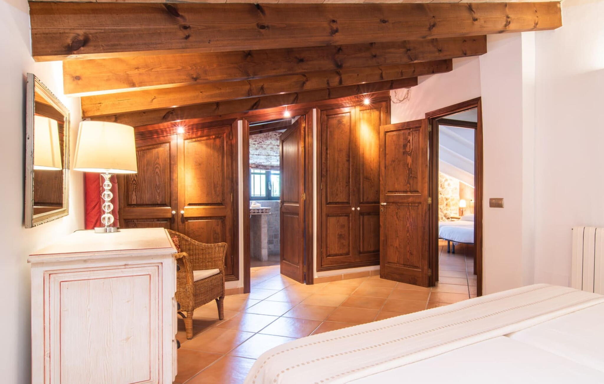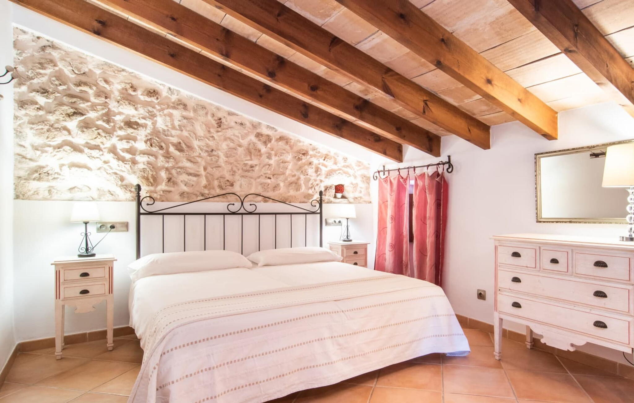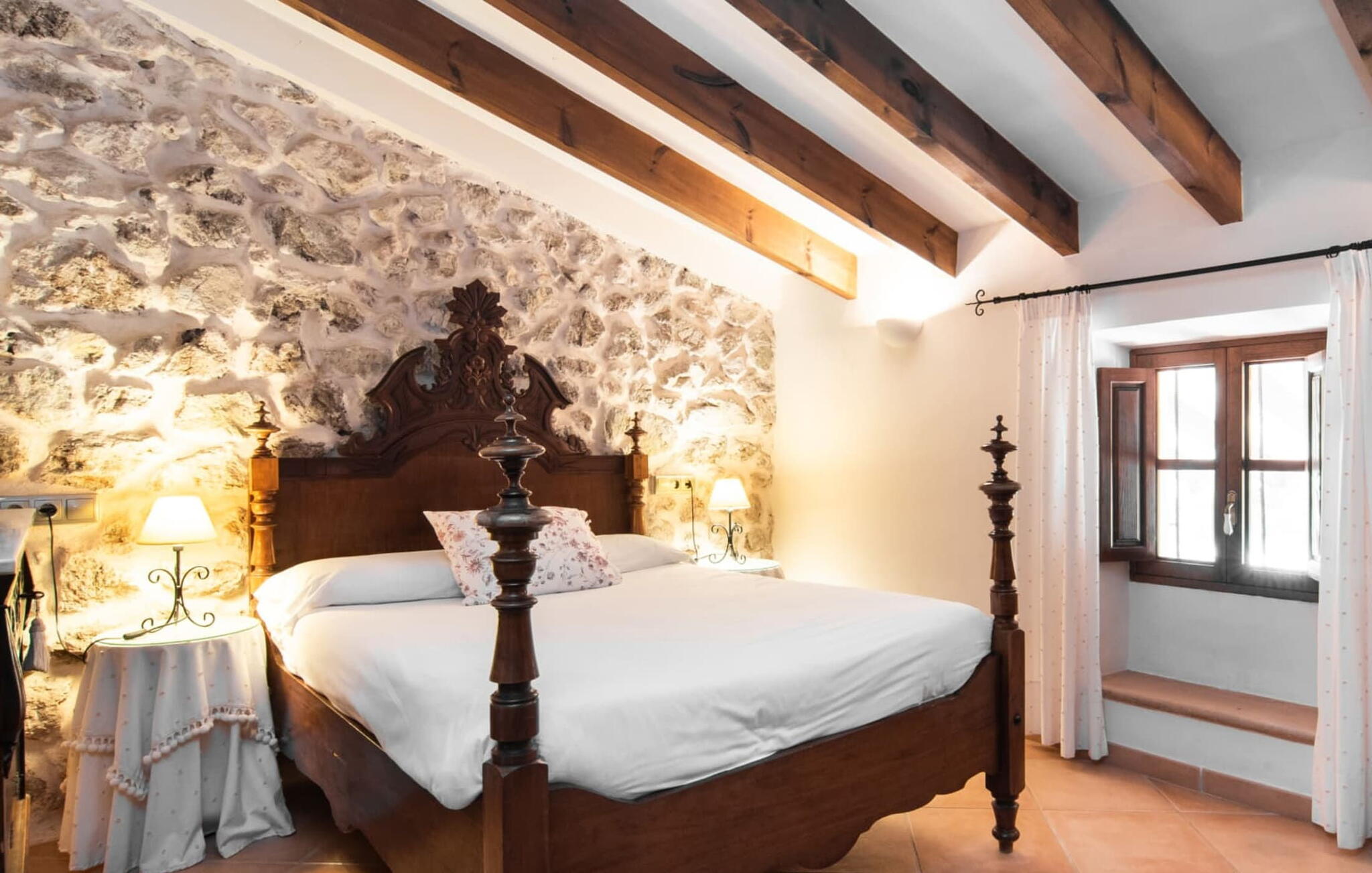 Het interieur maakt indruk met zijn authentieke landhuis sfeer. Originele elementen zijn bewaard gebleven tijdens de renovatie. Natuurstenen muren, houten balkenplafonds en zandstenen bogen zijn met succes gecombineerd met heldere, gezellige decoratie. Een stenen boog leidt vanuit de hal direct naar de gezellige woonkamer met open haard. Rechts van de hal is de eetkamer en een open, goed uitgeruste keuken. De aangrenzende gewelfde kamer is een architectonisch hoogtepunt. Voel je vrij om hier je maaltijden te nuttigen. Er zijn vier gezellige tweepersoonsslaapkamers op de bovenverdieping. Een van de slaapkamers heeft toegang tot een eigen klein terras met een prachtig uitzicht op het platteland.