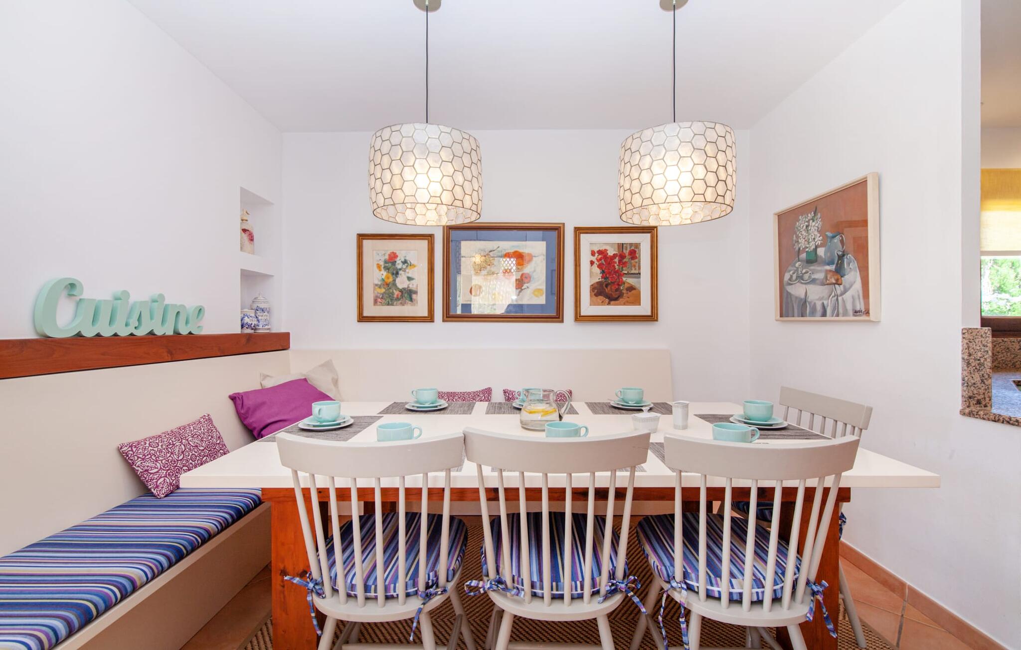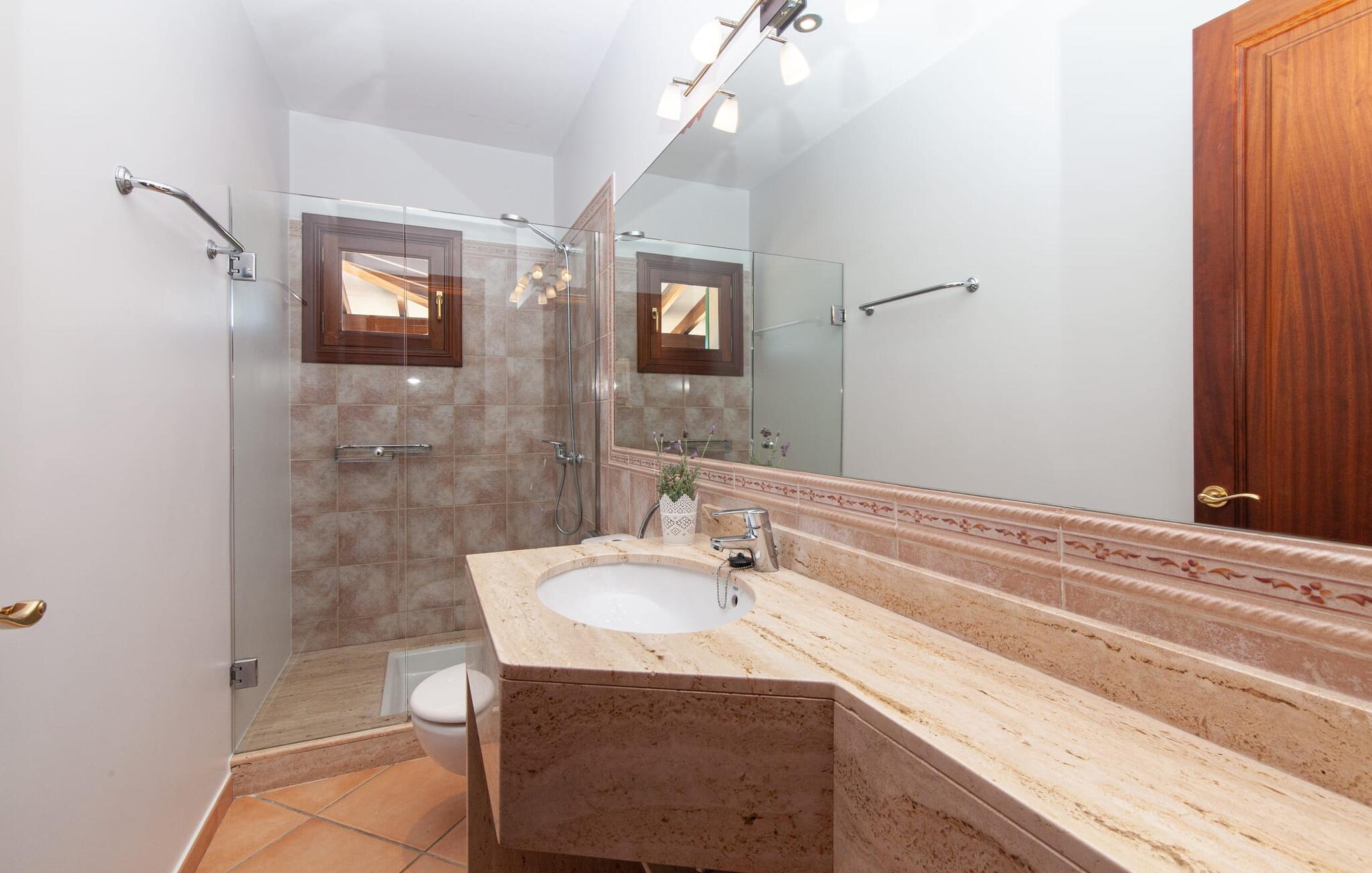 Binnen in de villa ontbreekt het je aan niets. Vanuit de stijlvolle woonkamer, die is uitgerust met een flatscreentelevisie, een moderne open haard en een bank die uitnodigt om te ontspannen en tot rust te komen, kom je in de eetkamer, die overloopt in de open keuken. De kleuren van het houten meubilair harmoniëren met de heldere, strakke lijnen en geven je het gevoel dat je je perfecte tijdelijke thuis hebt gevonden. De grote werkoppervlakken in de keuken bieden je genoeg ruimte om grotere gerechten te bereiden zonder dat je ruimte tekort komt. Naast het gastentoilet vind je ook drie slaapkamers en twee badkamers (waarvan één en-suite) op de begane grond, die aan de achterkant van het huis ligt. De architecten hebben vrijgevigheid laten overheersen in de badkamers, ook in het gebruik van materialen. Houten en marmeren elementen gaan prachtig samen en laten er geen twijfel over bestaan dat je hier voor een eersteklas huis hebt gekozen. Via de trap naar de bovenste verdieping bereik je een warme kandidaat voor je favoriete plekje: hier lopen het slaap- en badkamergedeelte direct in elkaar over. Je kunt genieten van een indrukwekkend uitzicht vanaf het dakterras, de ideale plek voor gezellige bijeenkomsten en het plannen van excursies naar het prachtige oosten van het eiland.