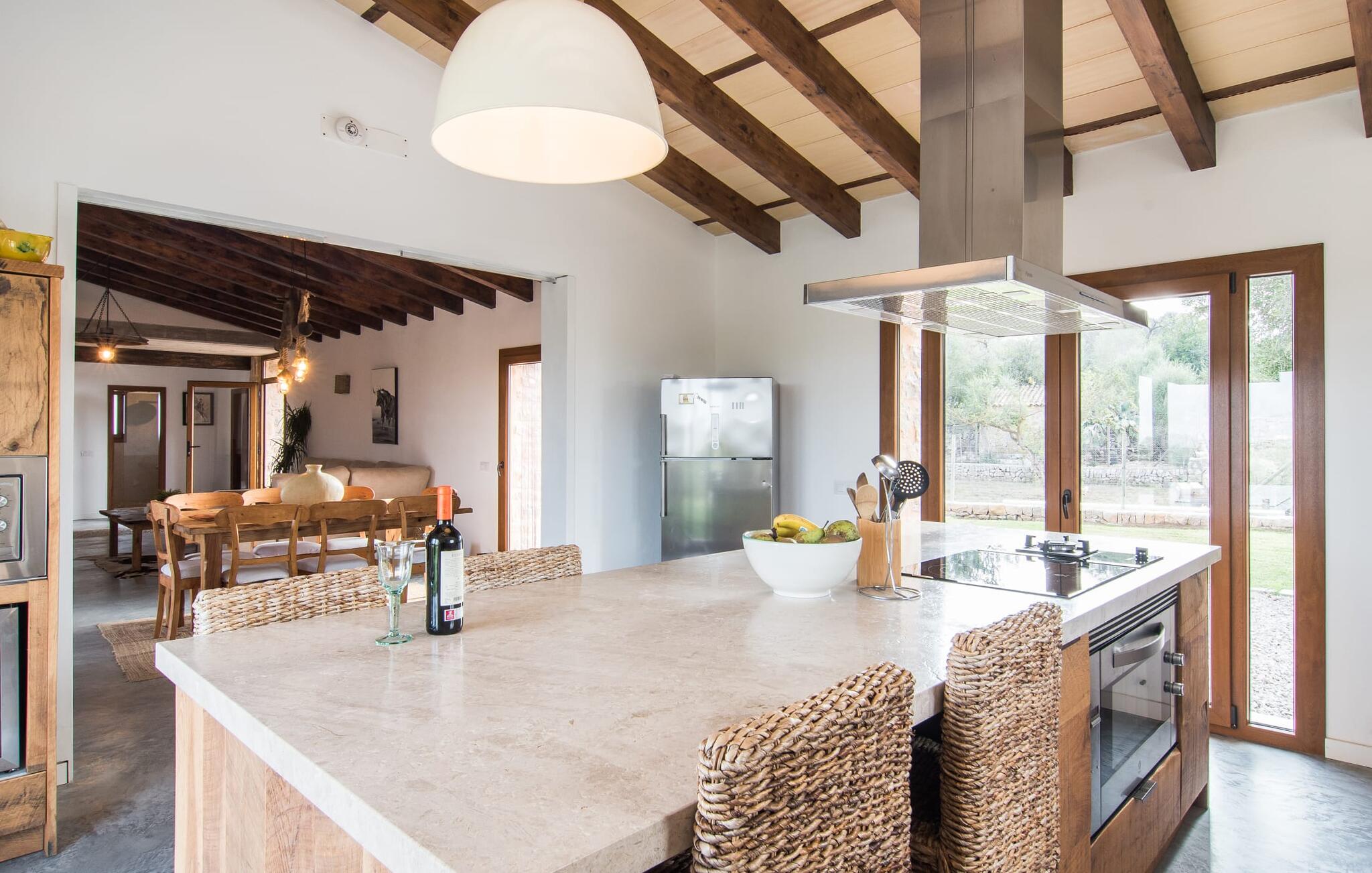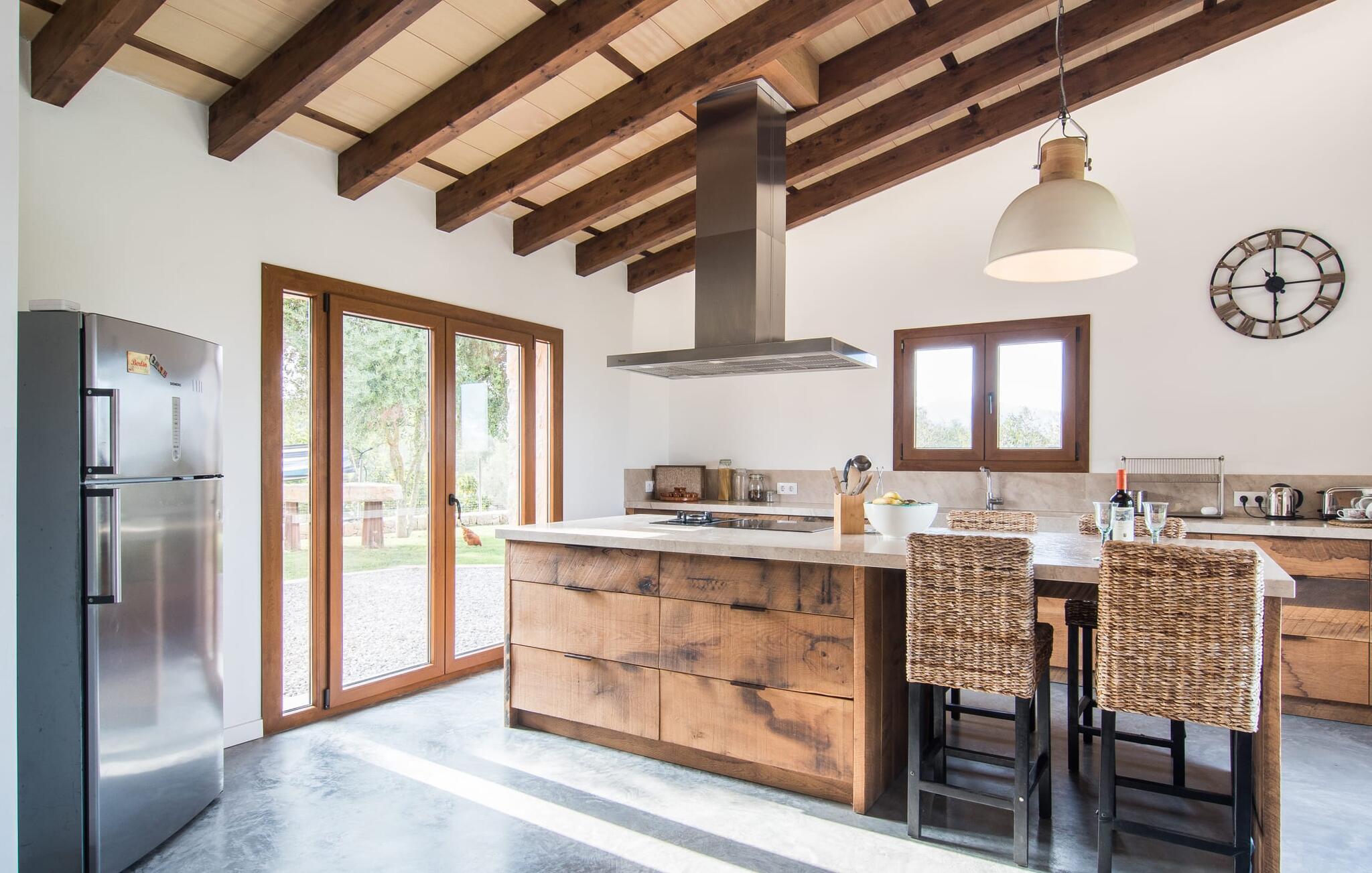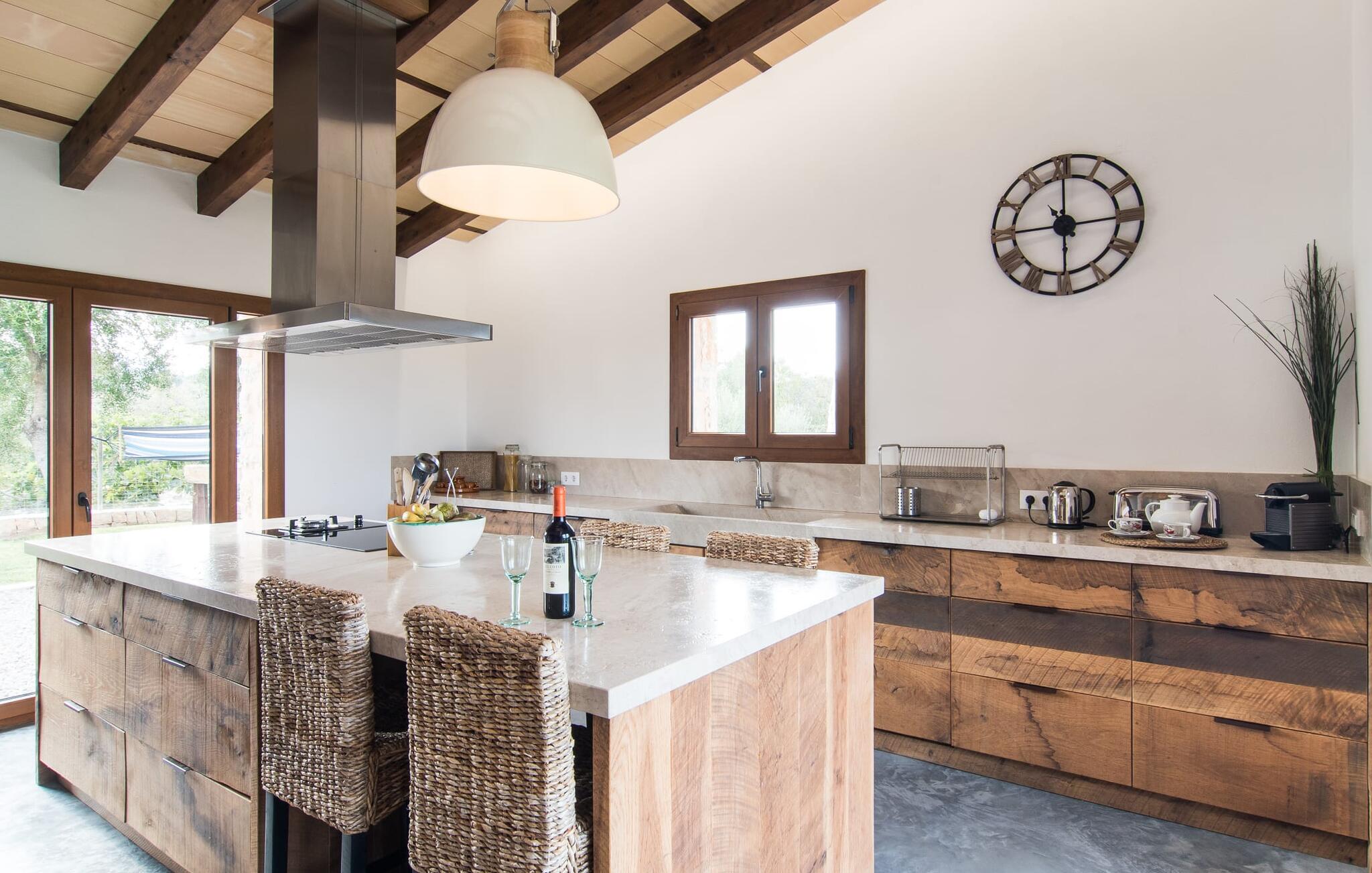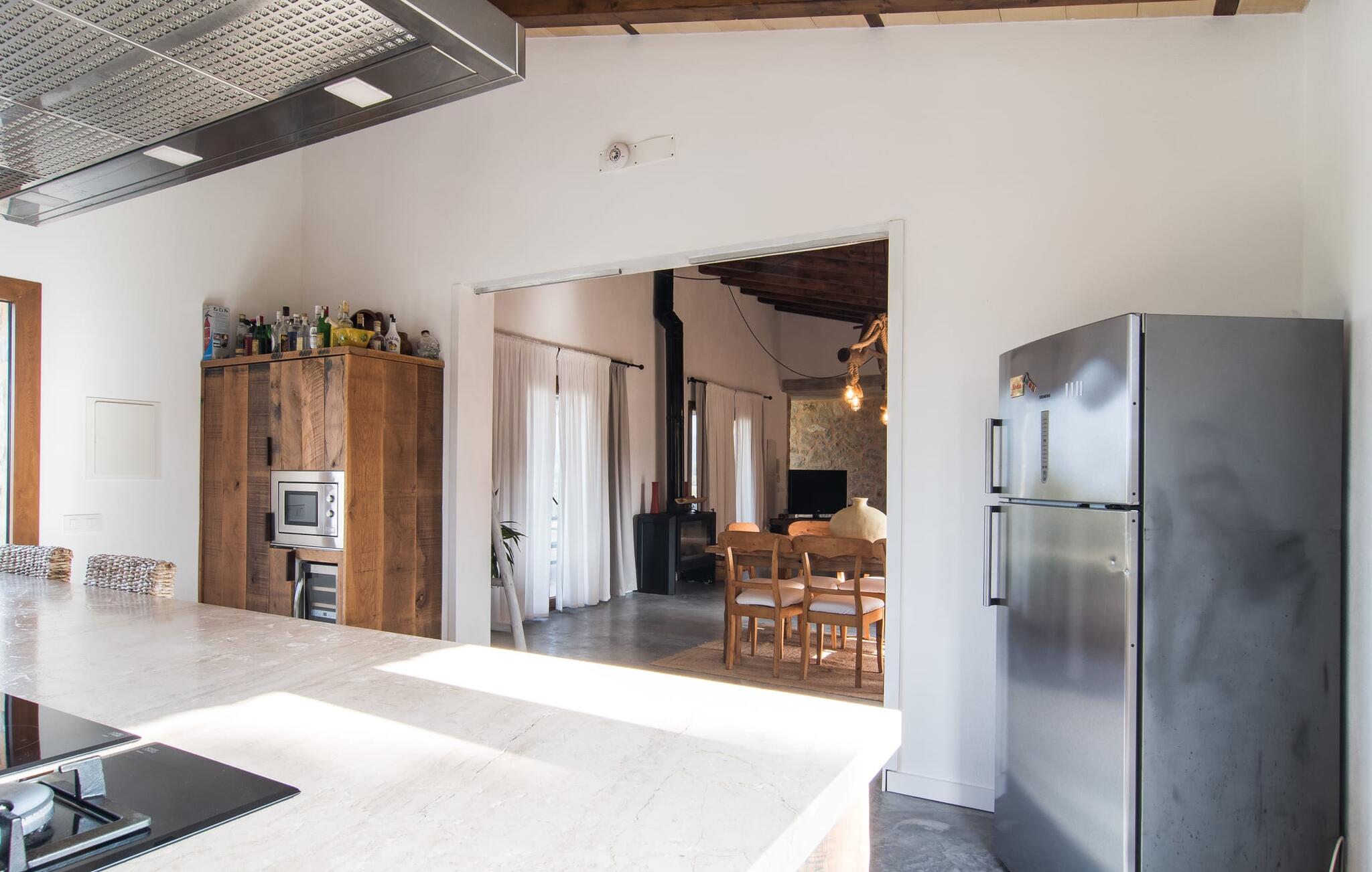 Een kijkje in de natuurstenen villa is een echte traktatie: de vele originele details maken van het moderne huis een plek met een echt feel-good karakter. Een lamp in de vorm van een houten wiel verlicht de ruime woonkamer en het vloerkleed van dierenhuid past er net zo goed bij als de ruwe plafondbalken en de stevige, ruwe grijze vloer. De open haard verwarmt je voeten op koudere avonden en zorgt in combinatie met de lichtgekleurde bank en lichte gordijnen voor een bijzonder knusse sfeer. Deze kamer heeft ook een eettafel en een grote, open doorgang naar de keuken direct erachter. Charmante uitstraling, stijlvol kookeiland met barkrukken, directe toegang tot de tuin - deze keuken maakt van elke tapasdag samen een bijzondere ervaring. Je vindt hier alles wat je nodig hebt: een moderne koelkast, magnetron, waterkoker, broodrooster en meer. Het huis heeft in totaal drie lichte, aantrekkelijk ontworpen tweepersoonsslaapkamers en twee badkamers. Praktisch: De villa is volledig gelijkvloers gebouwd en heeft dus geen trappen.