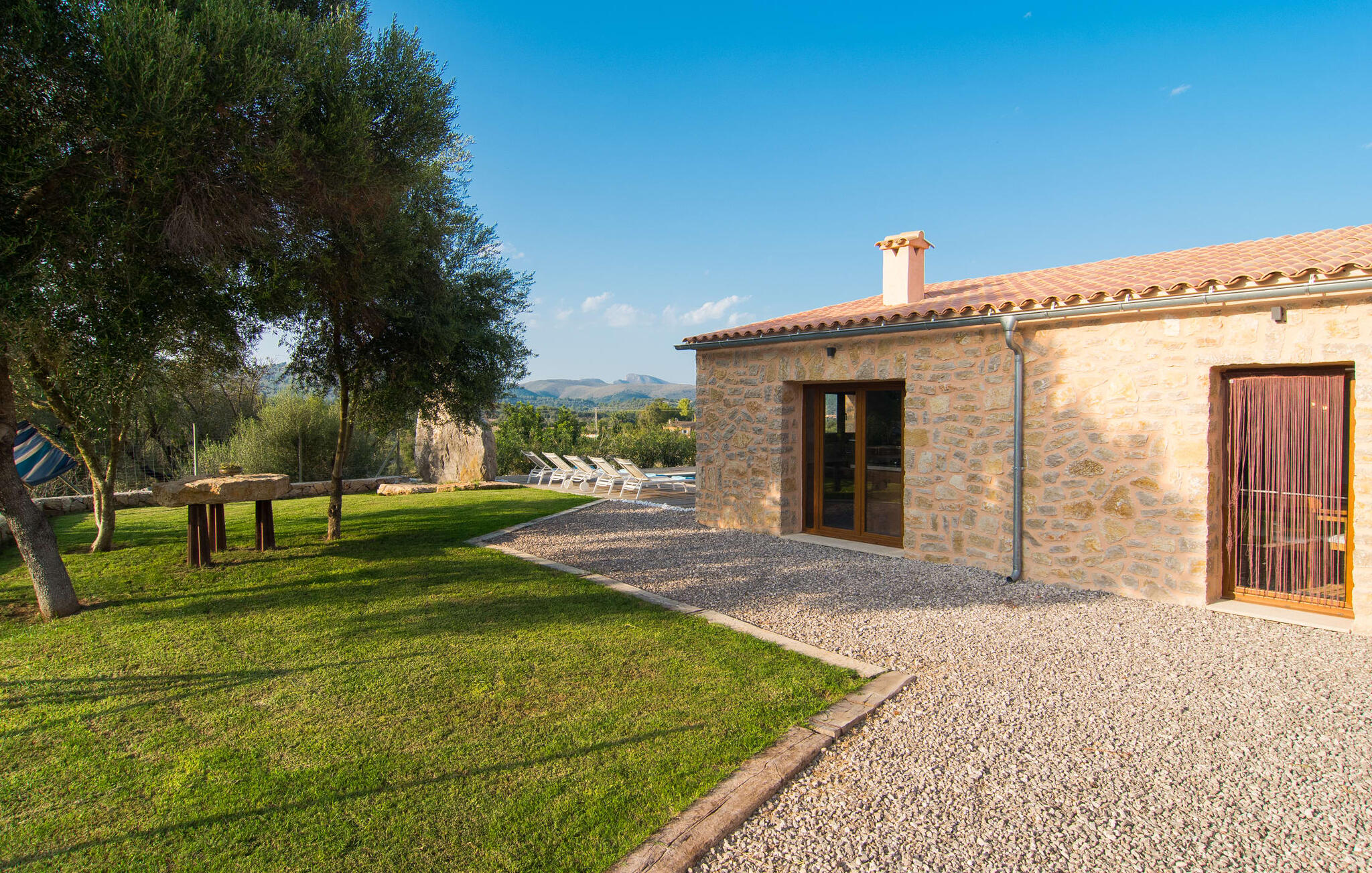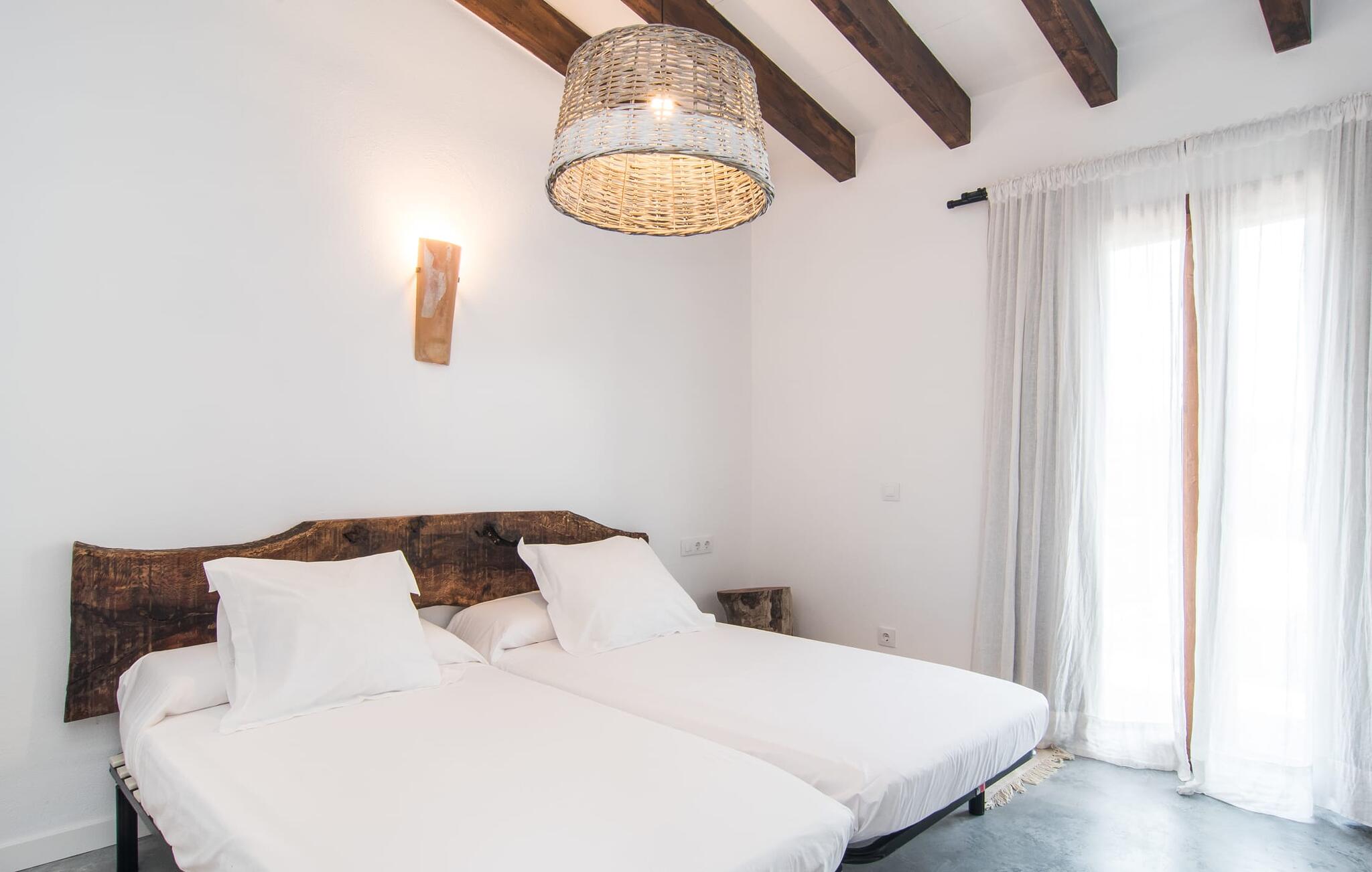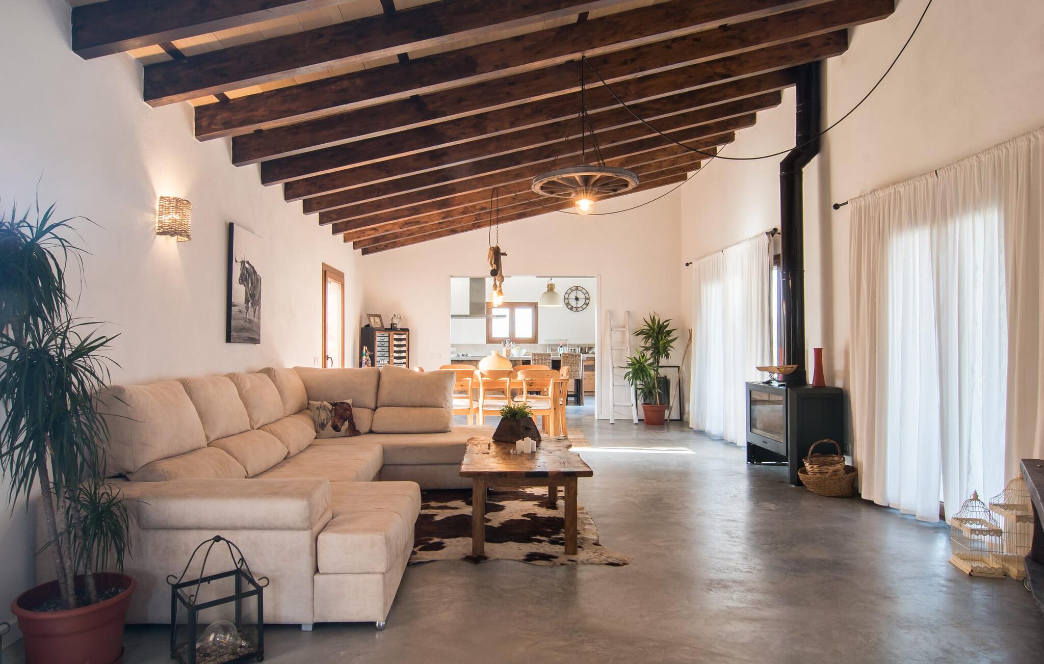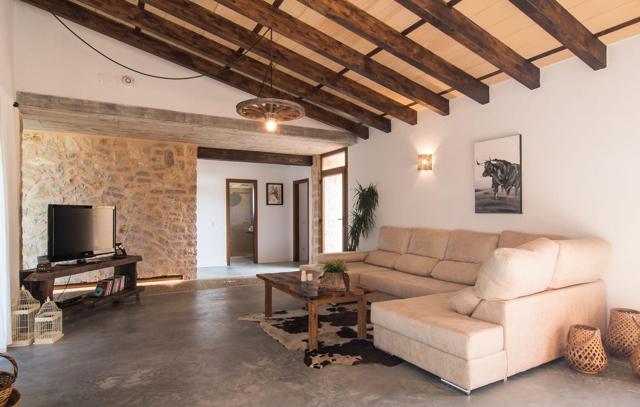 Een kijkje in de natuurstenen villa is een echte traktatie: de vele originele details maken van het moderne huis een plek met een echt feel-good karakter. Een lamp in de vorm van een houten wiel verlicht de ruime woonkamer en het vloerkleed van dierenhuid past er net zo goed bij als de ruwe plafondbalken en de stevige, ruwe grijze vloer. De open haard verwarmt je voeten op koudere avonden en zorgt in combinatie met de lichtgekleurde bank en lichte gordijnen voor een bijzonder knusse sfeer. Deze kamer heeft ook een eettafel en een grote, open doorgang naar de keuken direct erachter. Charmante uitstraling, stijlvol kookeiland met barkrukken, directe toegang tot de tuin - deze keuken maakt van elke tapasdag samen een bijzondere ervaring. Je vindt hier alles wat je nodig hebt: een moderne koelkast, magnetron, waterkoker, broodrooster en meer. Het huis heeft in totaal drie lichte, aantrekkelijk ontworpen tweepersoonsslaapkamers en twee badkamers. Praktisch: De villa is volledig gelijkvloers gebouwd en heeft dus geen trappen.
