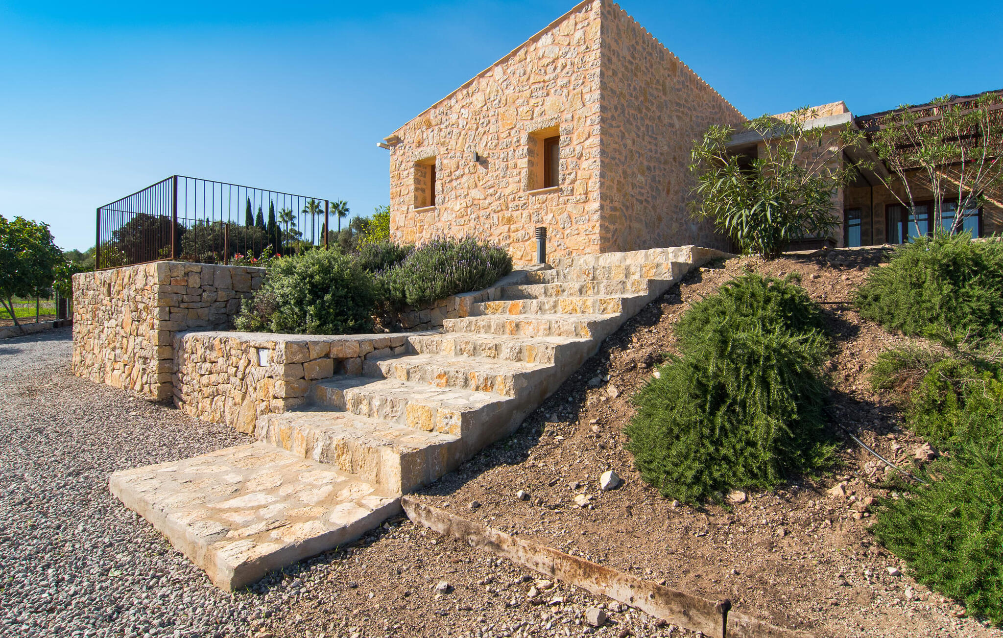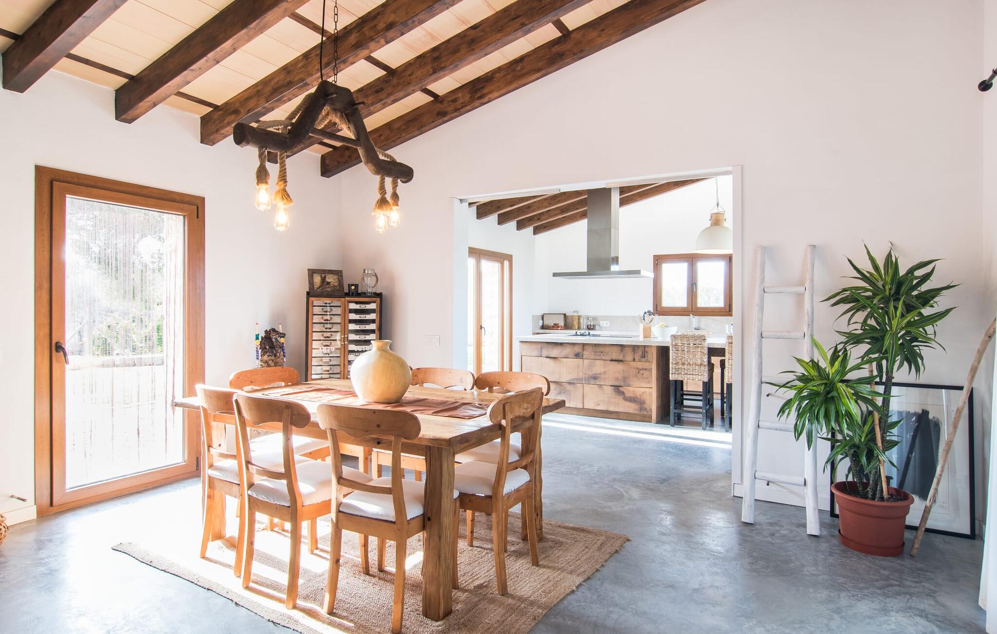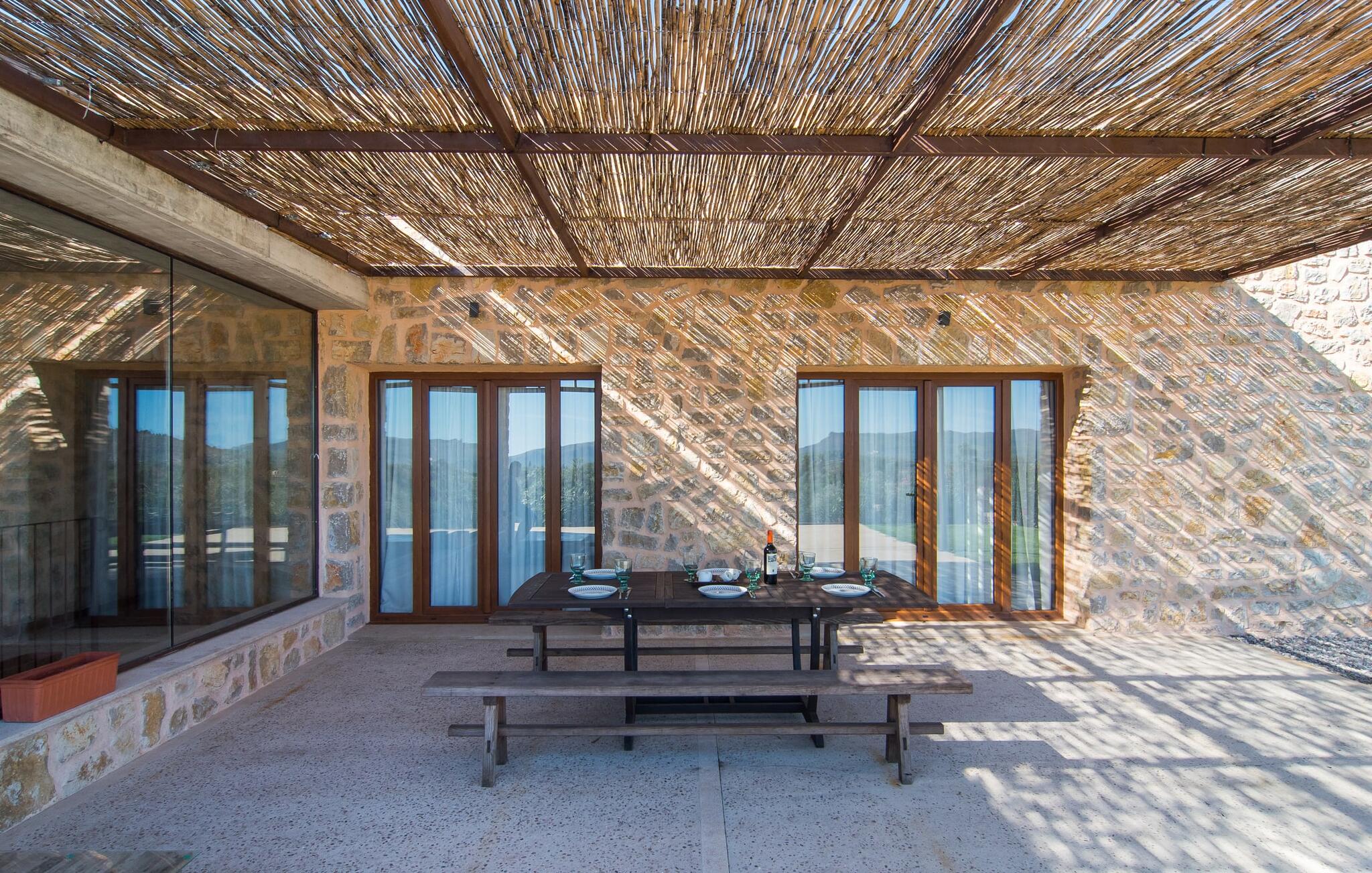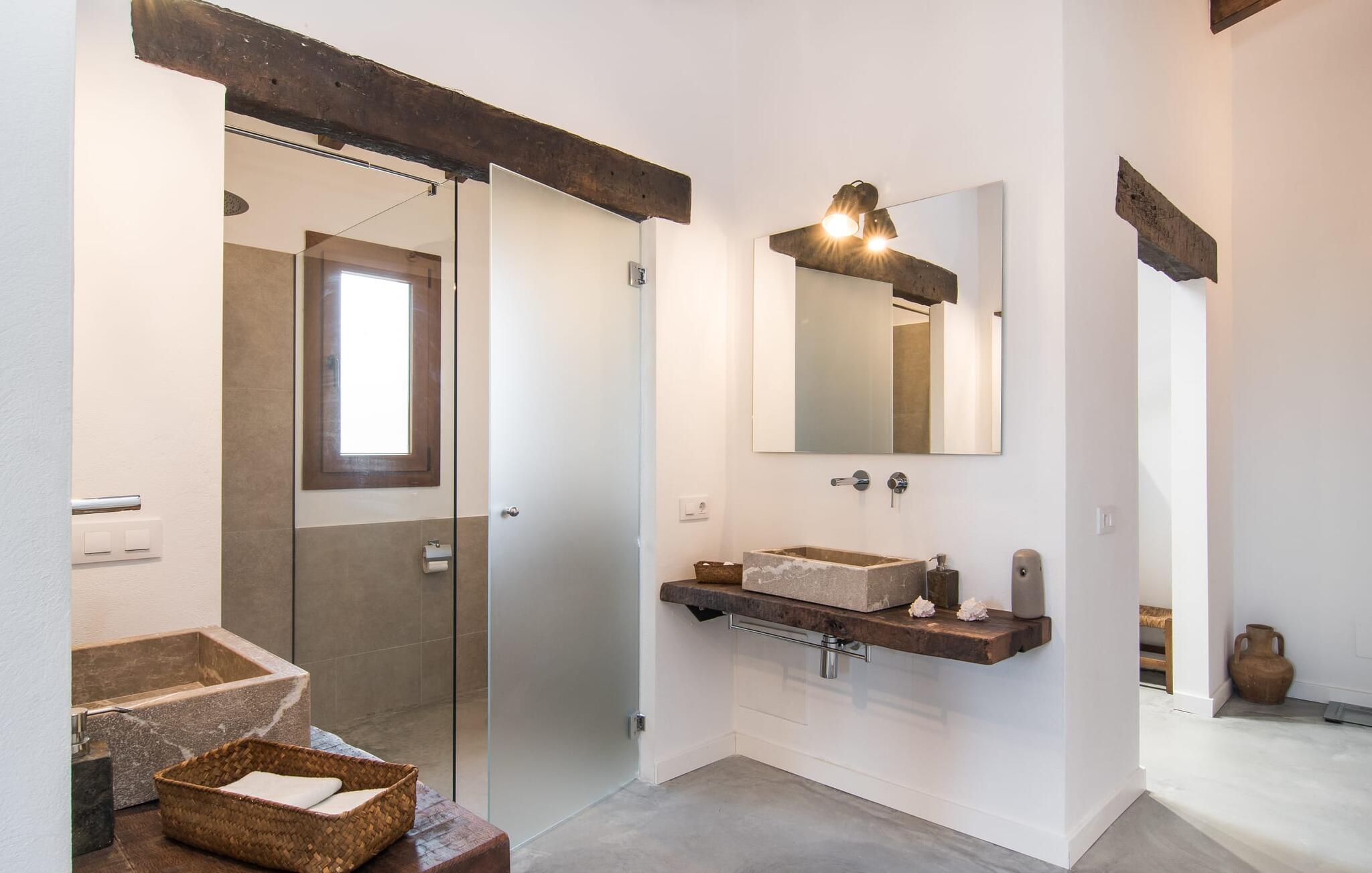 Een kijkje in de natuurstenen villa is een echte traktatie: de vele originele details maken van het moderne huis een plek met een echt feel-good karakter. Een lamp in de vorm van een houten wiel verlicht de ruime woonkamer en het vloerkleed van dierenhuid past er net zo goed bij als de ruwe plafondbalken en de stevige, ruwe grijze vloer. De open haard verwarmt je voeten op koudere avonden en zorgt in combinatie met de lichtgekleurde bank en lichte gordijnen voor een bijzonder knusse sfeer. Deze kamer heeft ook een eettafel en een grote, open doorgang naar de keuken direct erachter. Charmante uitstraling, stijlvol kookeiland met barkrukken, directe toegang tot de tuin - deze keuken maakt van elke tapasdag samen een bijzondere ervaring. Je vindt hier alles wat je nodig hebt: een moderne koelkast, magnetron, waterkoker, broodrooster en meer. Het huis heeft in totaal drie lichte, aantrekkelijk ontworpen tweepersoonsslaapkamers en twee badkamers. Praktisch: De villa is volledig gelijkvloers gebouwd en heeft dus geen trappen.