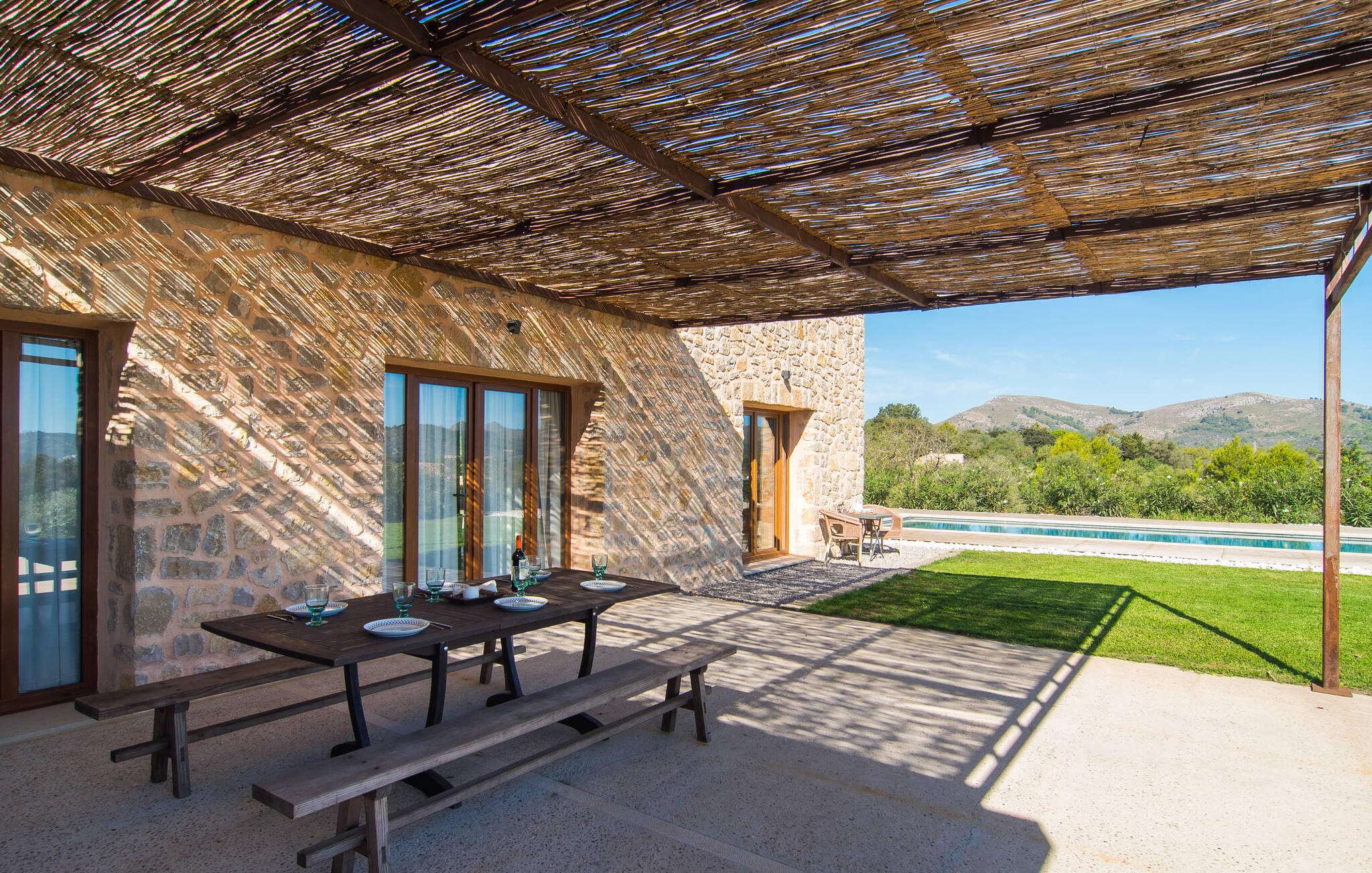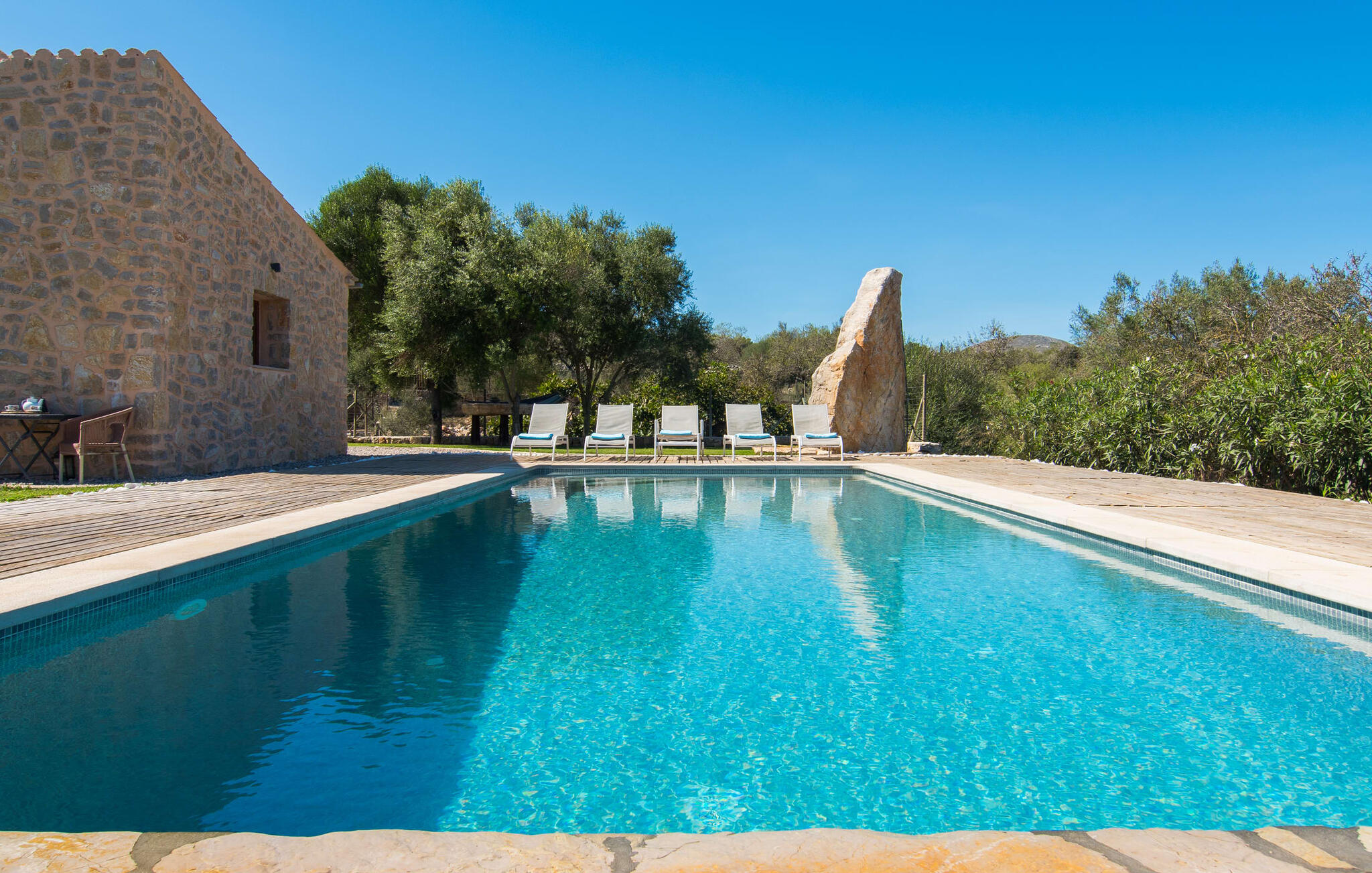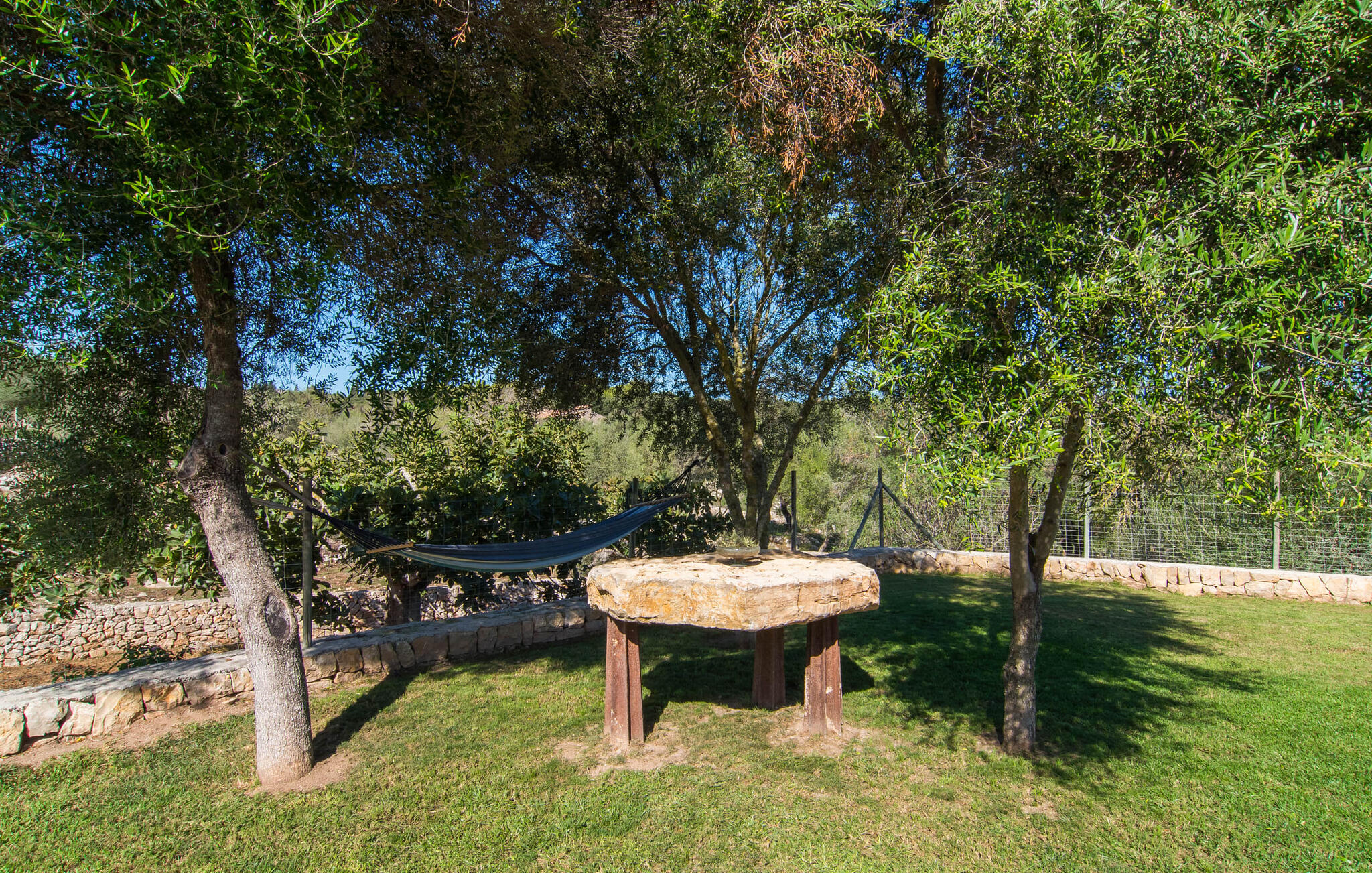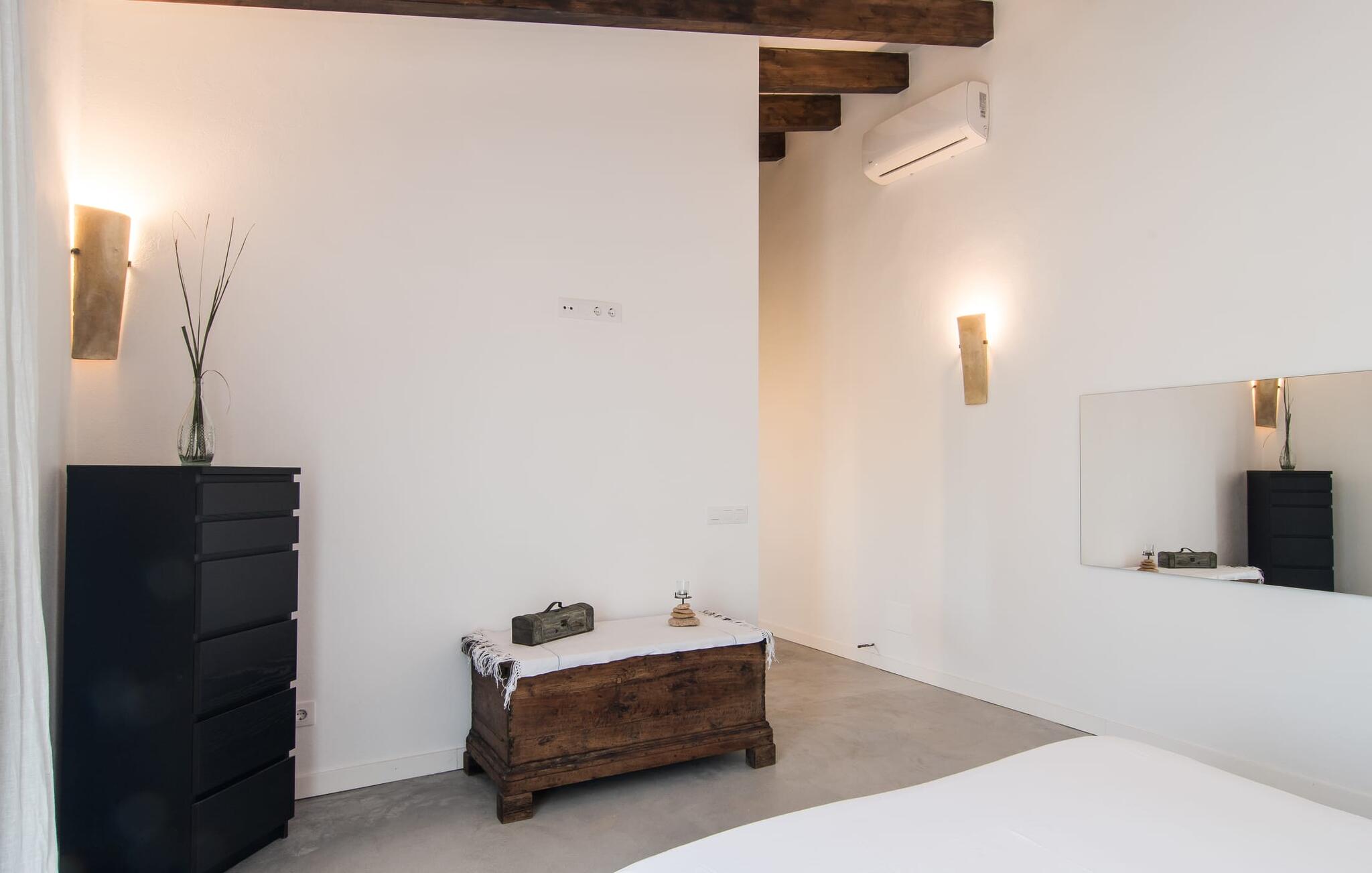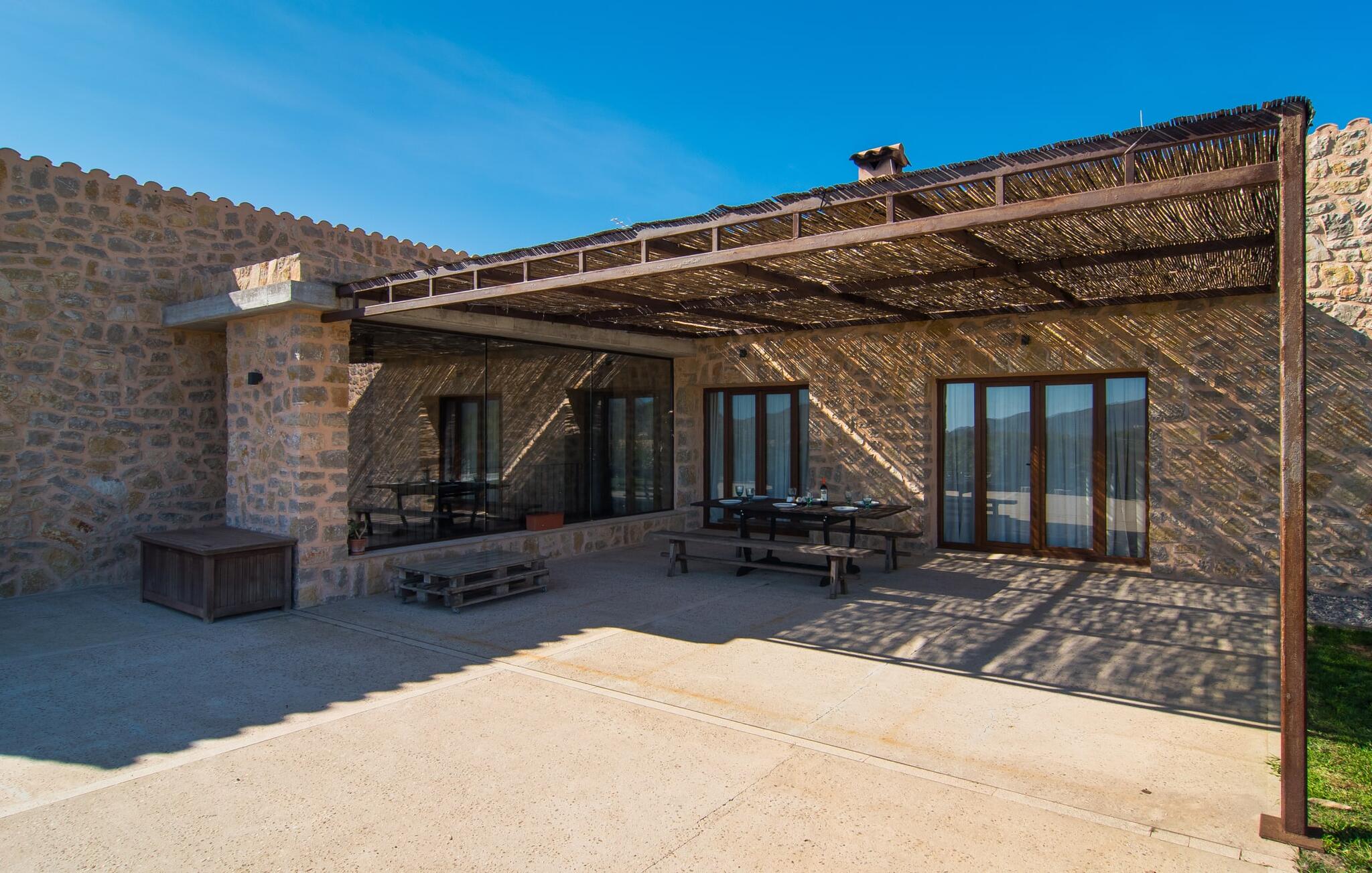 Parkeer je huurauto snel op de grindparkeerplaats en klim dan een paar treden op naar de villa en het vakantieplezier kan beginnen in je nieuwe droomhuis. Als je aankomt bij Sa Carbona, valt je meteen de uitstekend onderhouden, no-frills stijl op. Een kijkje achter de schermen zal deze indruk snel bevestigen. Je kunt naar hartenlust spetteren in het 11 meter lange zwembad, maar ook een paar baantjes trekken. Vanuit de ligstoel direct het koele water in en dan weer terug de zon in - wat een geweldige manier om hier hele dagen door te brengen. Charmante houten pallets omlijsten de oase van verfrissing en lage struiken bieden uitzicht op de prachtige omgeving: Hier kun je genieten van een fantastisch uitzicht over de vlakke bergen tot aan het kasteel van Artà. Het met raffia overdekte terras biedt schaduw en ruimte voor een tafel met banken - eenvoudig, minimalistisch, mooi. Om de hoek zorgt de hangmat onder de bomen voor ontspannende pauzes. En terwijl de dieren vredig grazen in het omheinde gebied, kun je hier ook de barbecue aansteken.