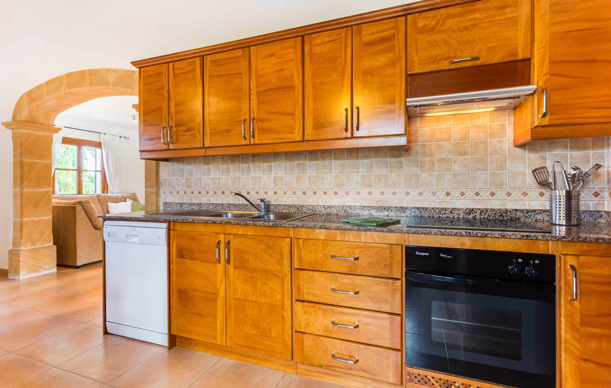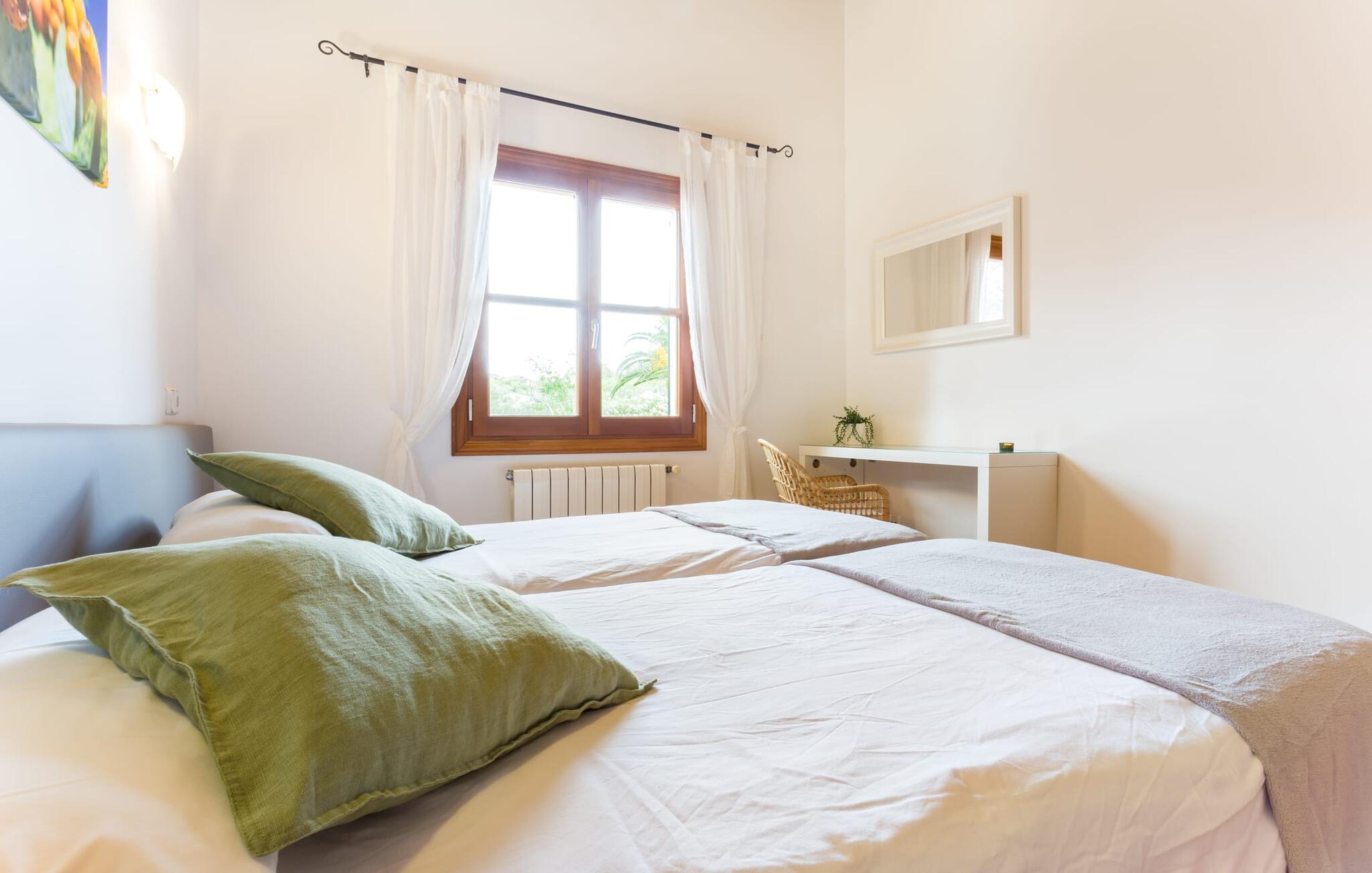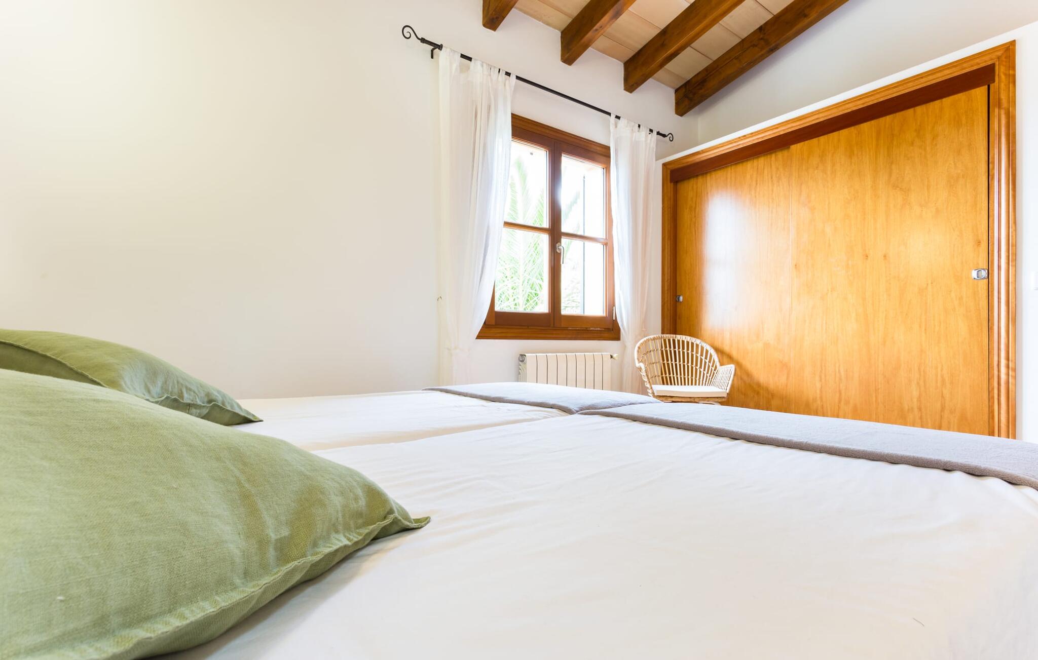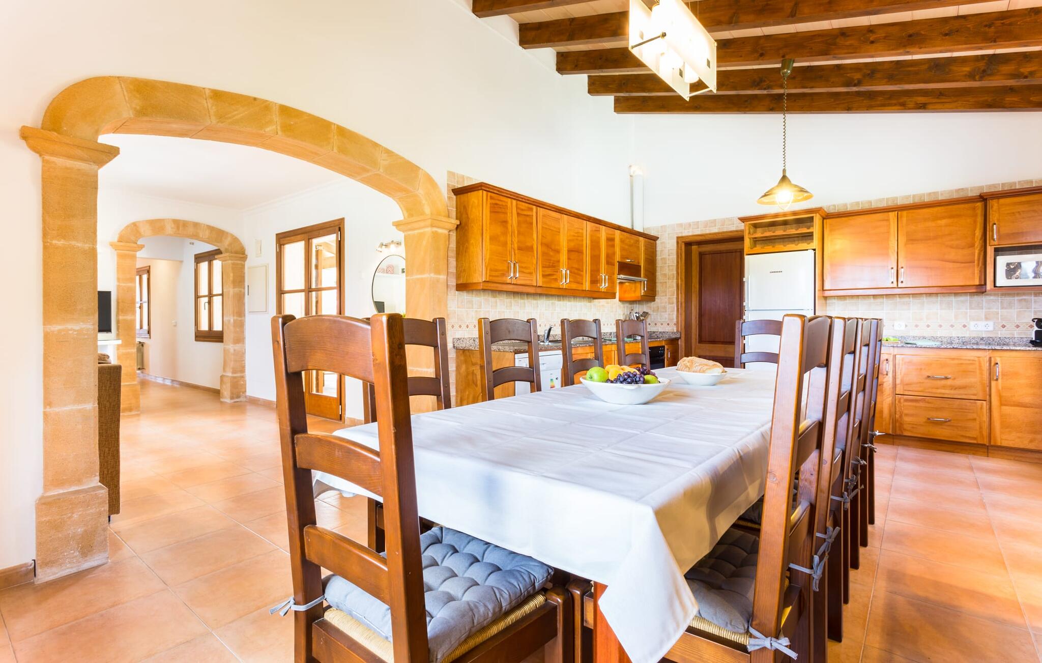 Binnen beschikt de ruime villa over voorzieningen van hoge kwaliteit. Lichte kamers met houten plafonds en prachtige vloertegels creëren een vrolijke sfeer. De grote woonkamer heeft een open haard en een gezellige zithoek. De volledig uitgeruste keuken heeft een eettafel voor maximaal tien personen en een bijkeuken met wasmachine. Vier slaapkamers met daglicht, gecombineerd met vier badkamers en centrale verwarming zorgen voor een ontspannen verblijf het hele jaar door.