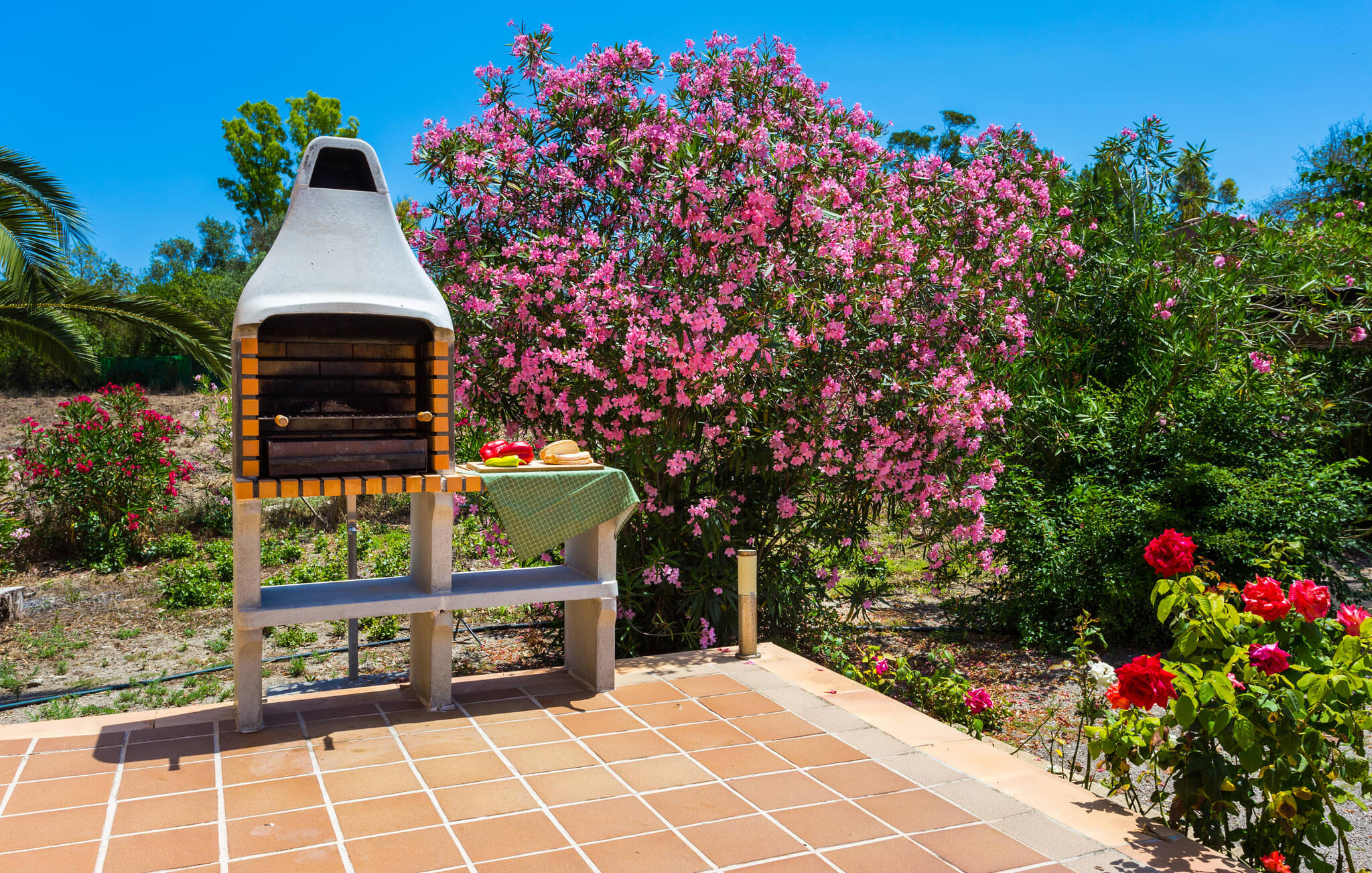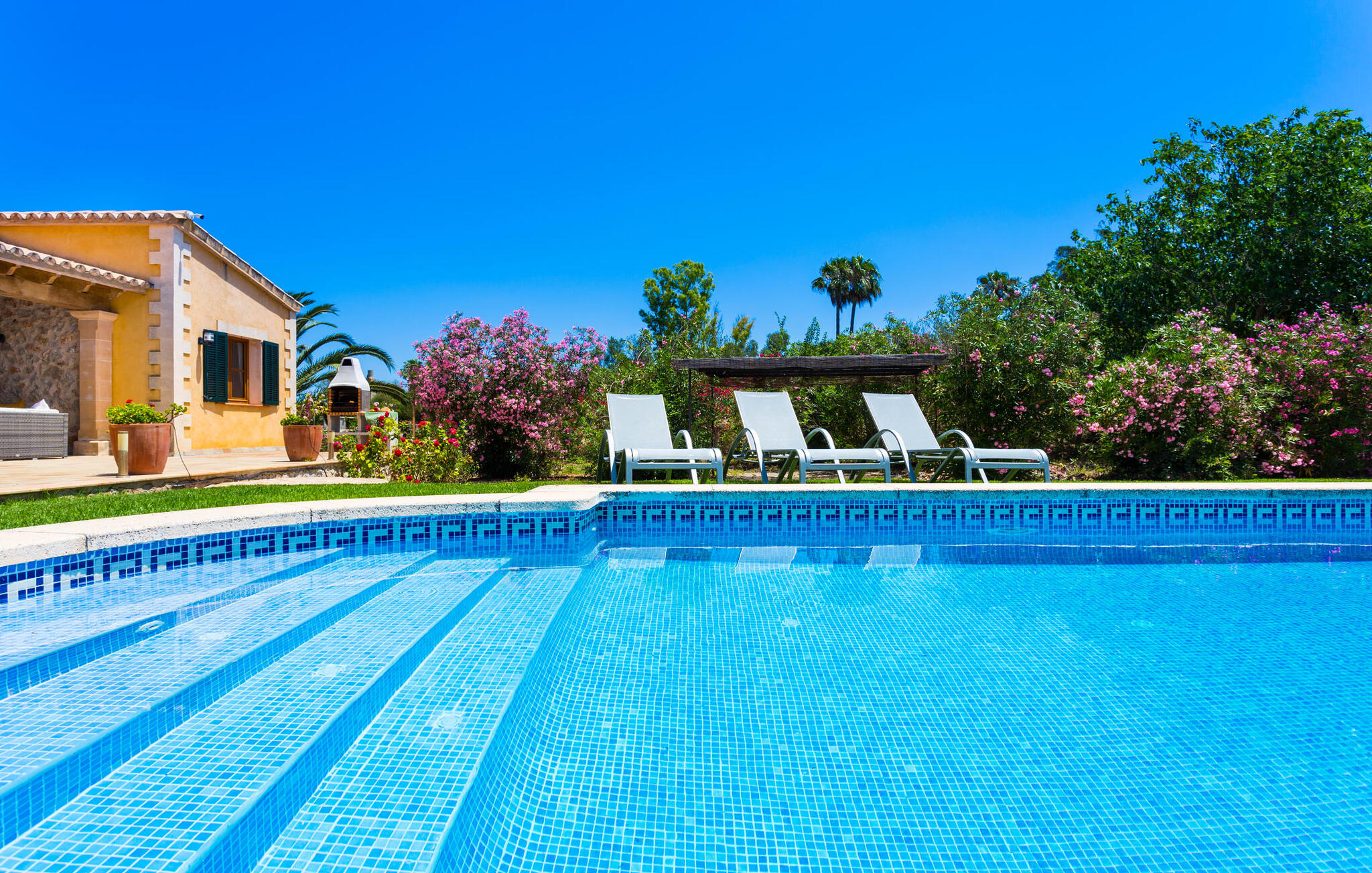 De goed onderhouden tuin is beplant met een verscheidenheid aan bomen en biedt een idyllische buitenruimte voor een ontspannen vakantie. Tussen het huis en het zwembad ligt een ruim, gedeeltelijk overdekt terras, dat perfecte schaduw biedt op zonnige dagen. Ontspan op stijlvolle buitenbanken of verzamel je rond de grote eettafel voor een gezellige barbecue-avond. Comfortabele ligstoelen op het gazon nodigen zonaanbidders uit om te ontspannen na een verfrissende duik in het meanderende zwembad, dat bereikbaar is via een halfronde trap.