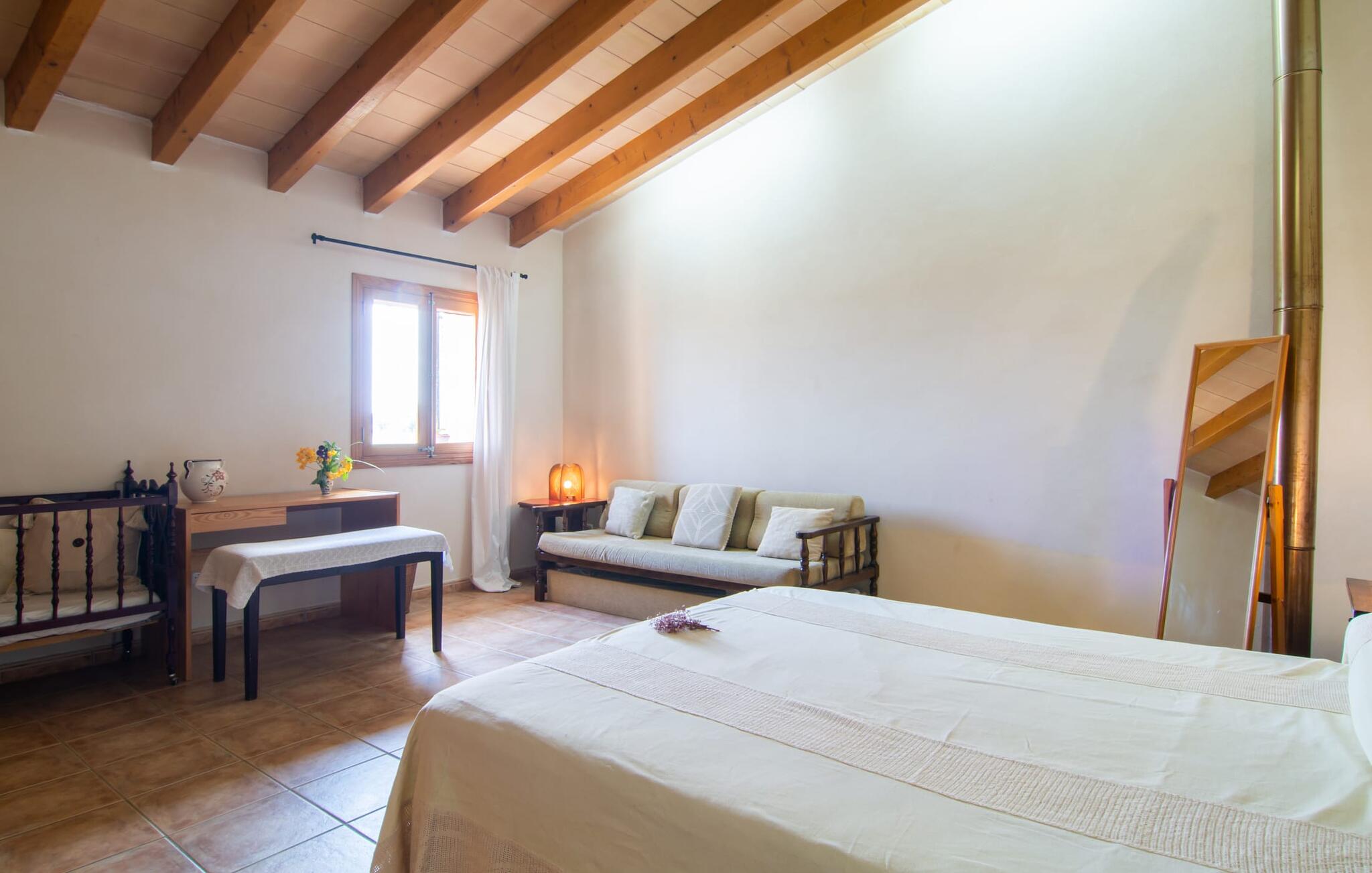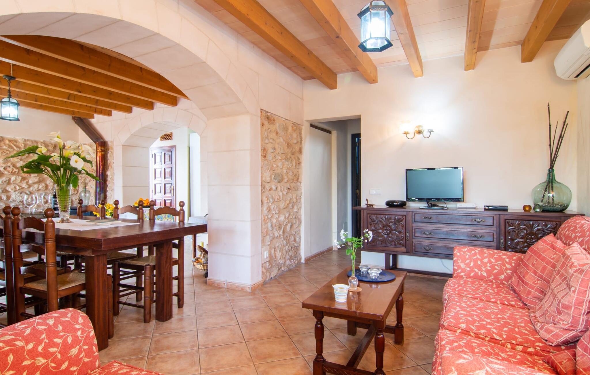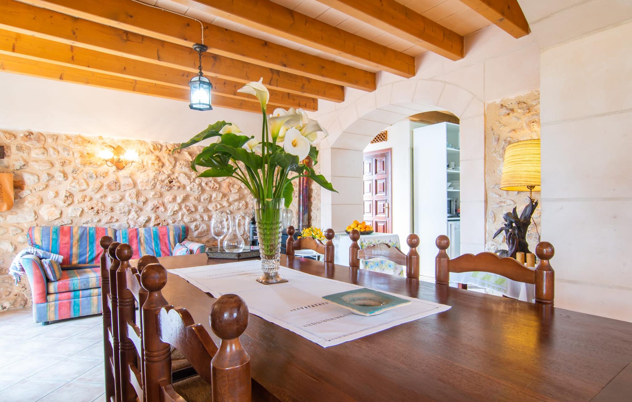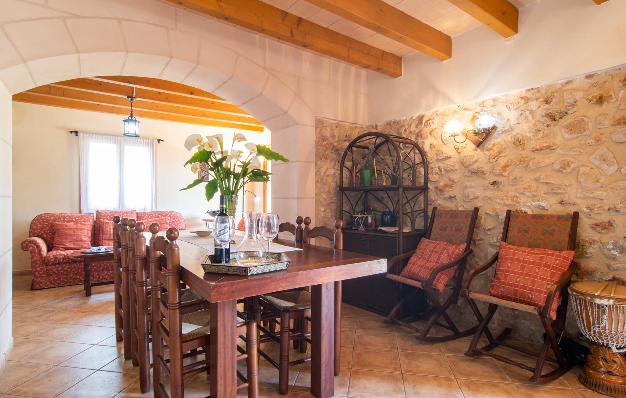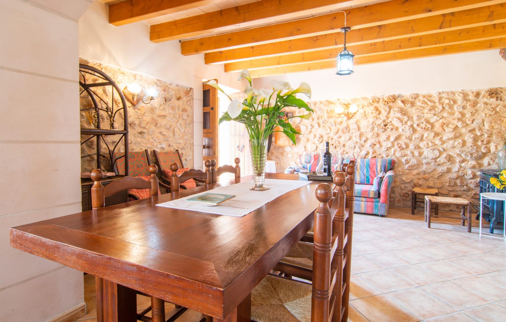 Het gezellige interieur van de finca is heel pretentieloos. Natuurstenen elementen vormen hier een aangename voortzetting, harmonieus gerangschikt met plafonds met zichtbare balken, terracottakleurige tegels en lichtgekleurde muren. Indrukwekkend: de brede boogdoorgang tussen de woon- en eetgedeeltes. Verschillende gezellige zithoeken nodigen je ook uit om binnen te ontspannen. De mooie grote eettafel is perfect om binnen aan te eten en de volledig uitgeruste keuken met bakstenen elementen bevindt zich direct ernaast. Een praktische berging met wasmachine en een badkamer bevinden zich ook op de begane grond, terwijl de drie slaapkamers - twee met eenpersoonsbedden van elk 0,90 x 2,10 meter, een met een tweepersoonsbed van 2 x 2,20 meter en nog een badkamer - zich op de bovenverdieping bevinden.