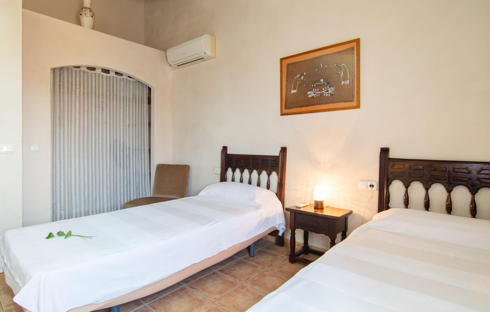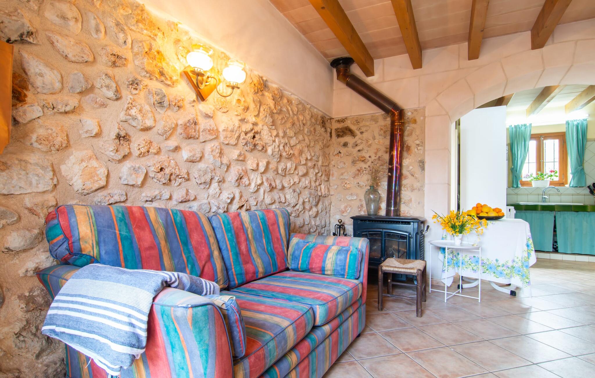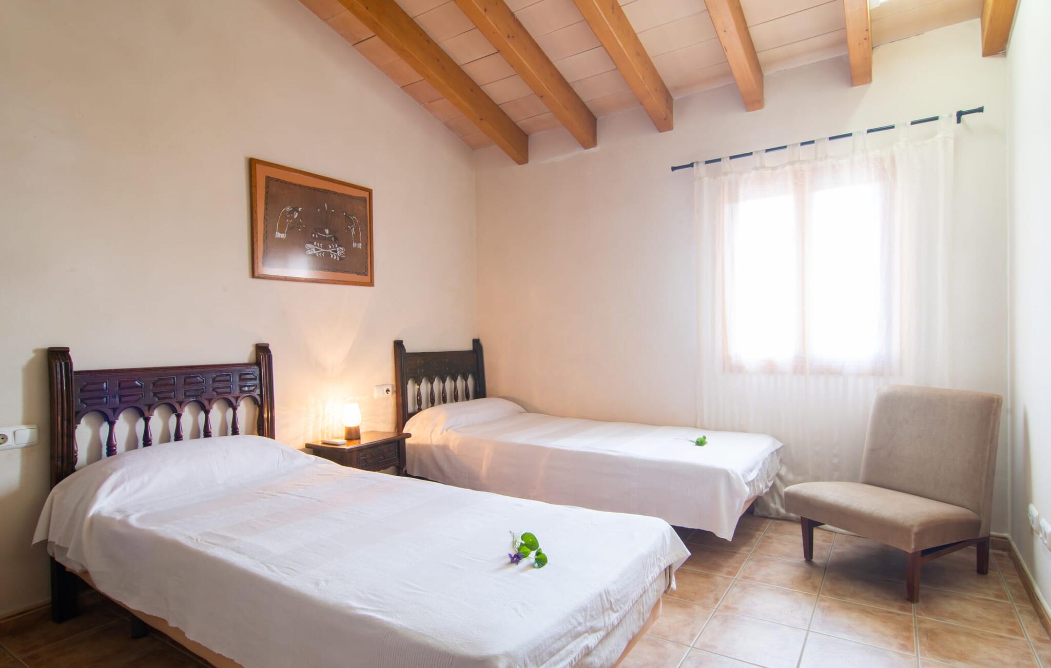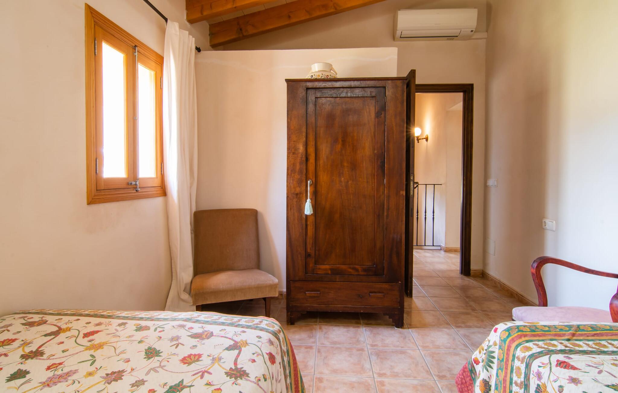 Het gezellige interieur van de finca is heel pretentieloos. Natuurstenen elementen vormen hier een aangename voortzetting, harmonieus gerangschikt met plafonds met zichtbare balken, terracottakleurige tegels en lichtgekleurde muren. Indrukwekkend: de brede boogdoorgang tussen de woon- en eetgedeeltes. Verschillende gezellige zithoeken nodigen je ook uit om binnen te ontspannen. De mooie grote eettafel is perfect om binnen aan te eten en de volledig uitgeruste keuken met bakstenen elementen bevindt zich direct ernaast. Een praktische berging met wasmachine en een badkamer bevinden zich ook op de begane grond, terwijl de drie slaapkamers - twee met eenpersoonsbedden van elk 0,90 x 2,10 meter, een met een tweepersoonsbed van 2 x 2,20 meter en nog een badkamer - zich op de bovenverdieping bevinden.
