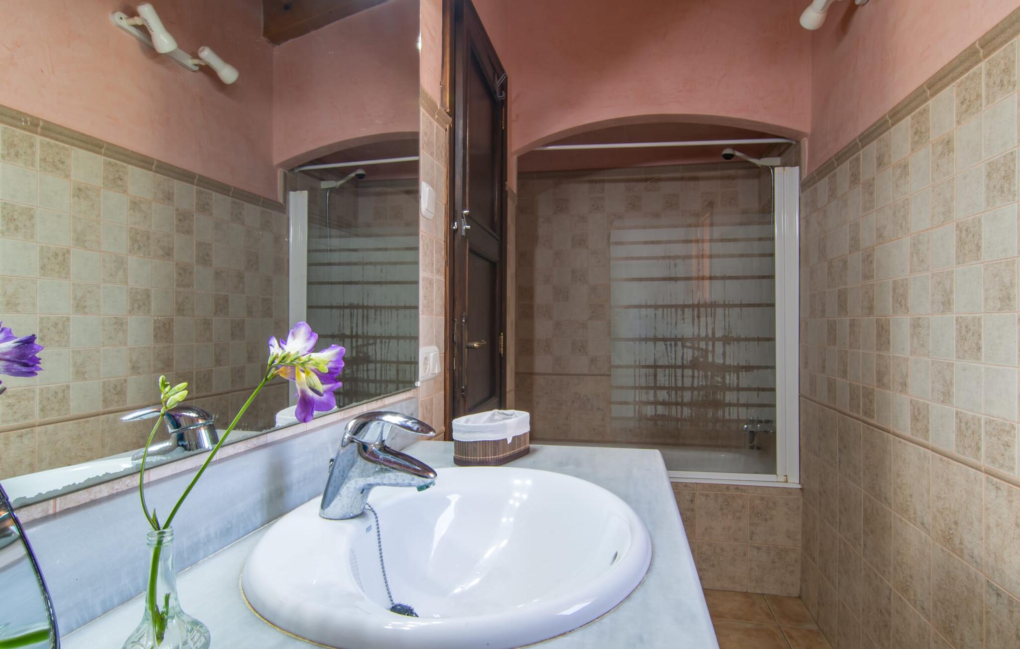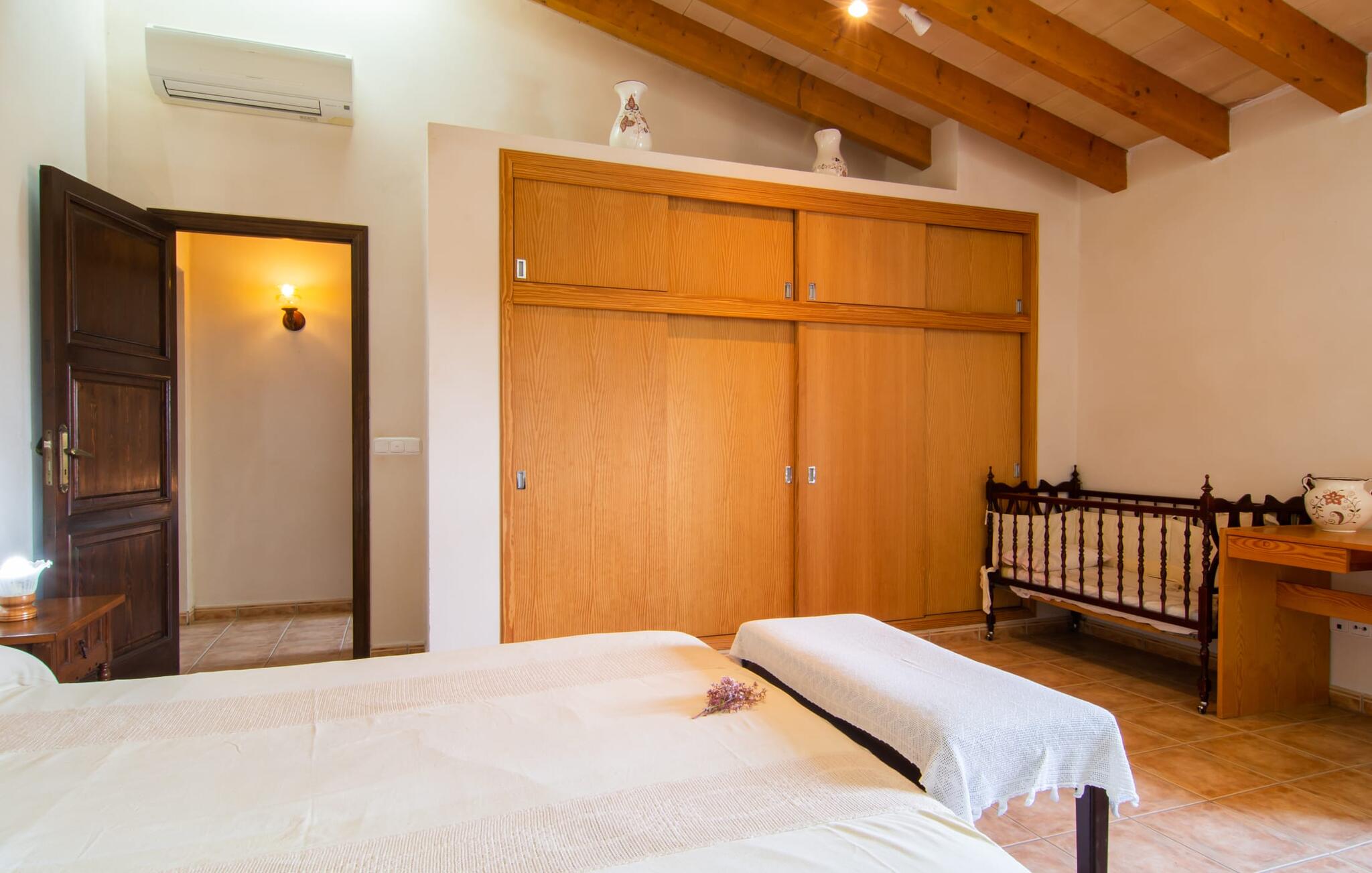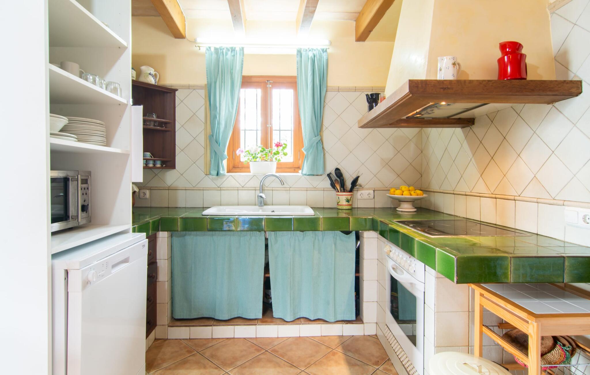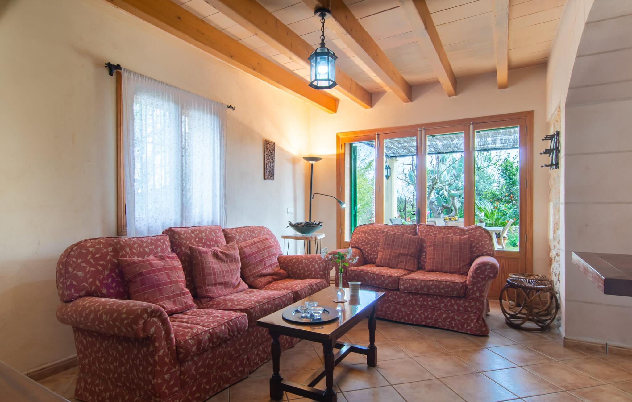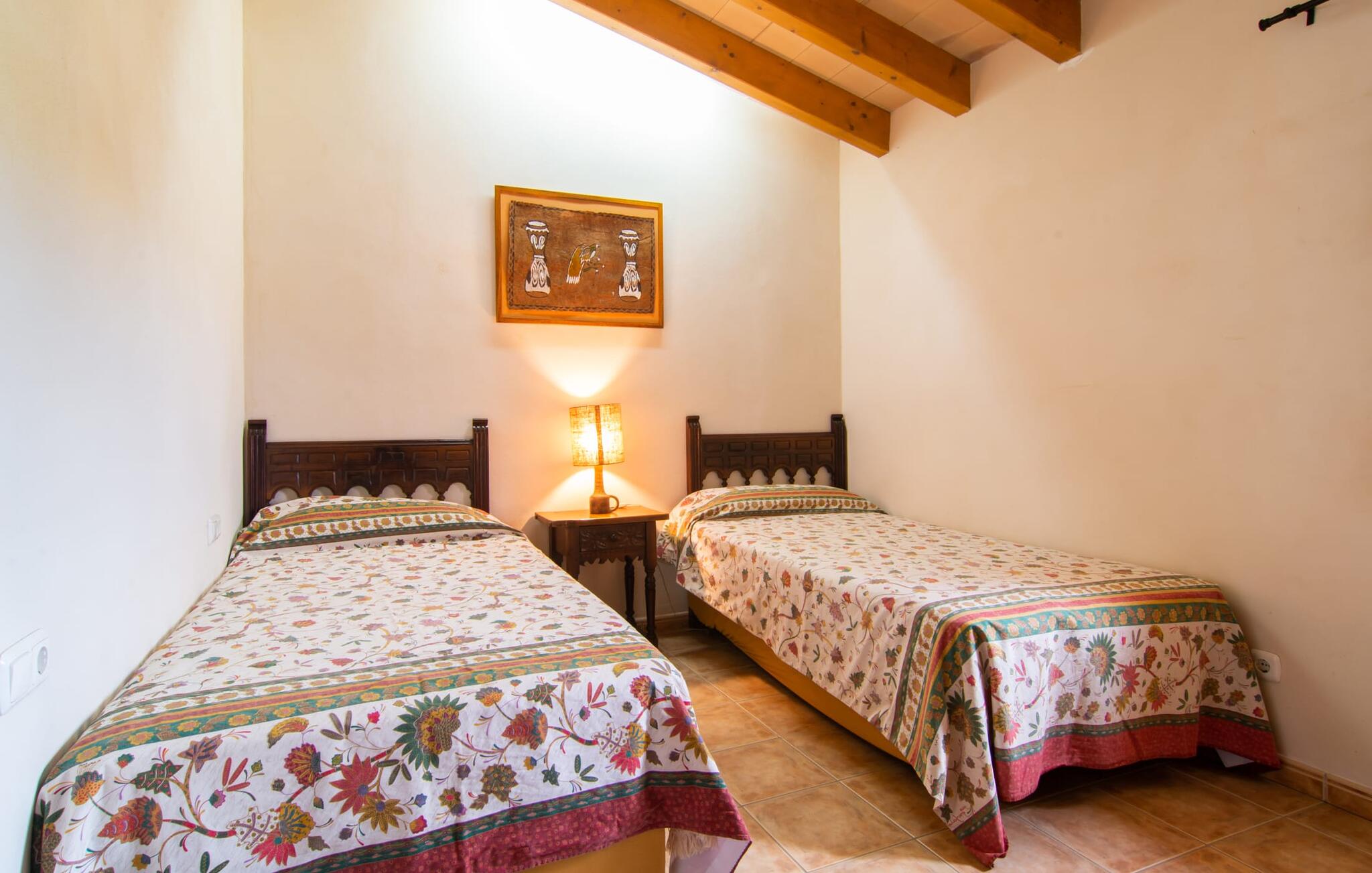 Het gezellige interieur van de finca is heel pretentieloos. Natuurstenen elementen vormen hier een aangename voortzetting, harmonieus gerangschikt met plafonds met zichtbare balken, terracottakleurige tegels en lichtgekleurde muren. Indrukwekkend: de brede boogdoorgang tussen de woon- en eetgedeeltes. Verschillende gezellige zithoeken nodigen je ook uit om binnen te ontspannen. De mooie grote eettafel is perfect om binnen aan te eten en de volledig uitgeruste keuken met bakstenen elementen bevindt zich direct ernaast. Een praktische berging met wasmachine en een badkamer bevinden zich ook op de begane grond, terwijl de drie slaapkamers - twee met eenpersoonsbedden van elk 0,90 x 2,10 meter, een met een tweepersoonsbed van 2 x 2,20 meter en nog een badkamer - zich op de bovenverdieping bevinden.