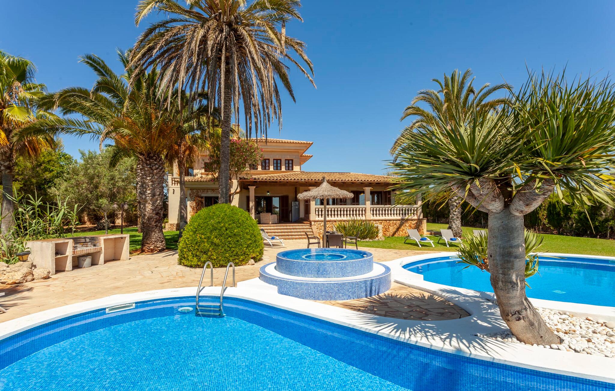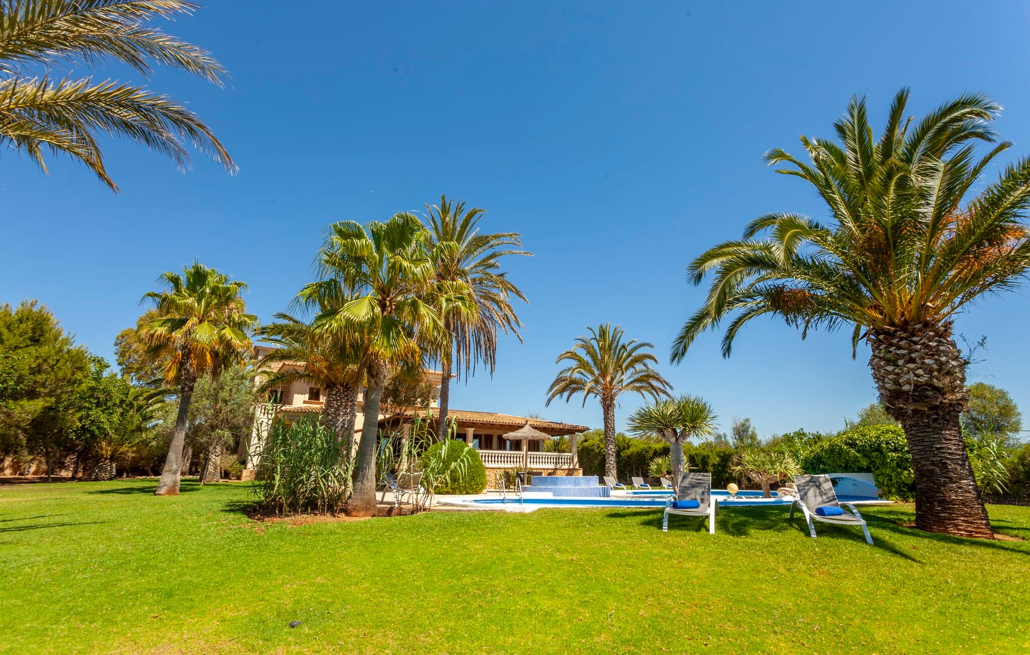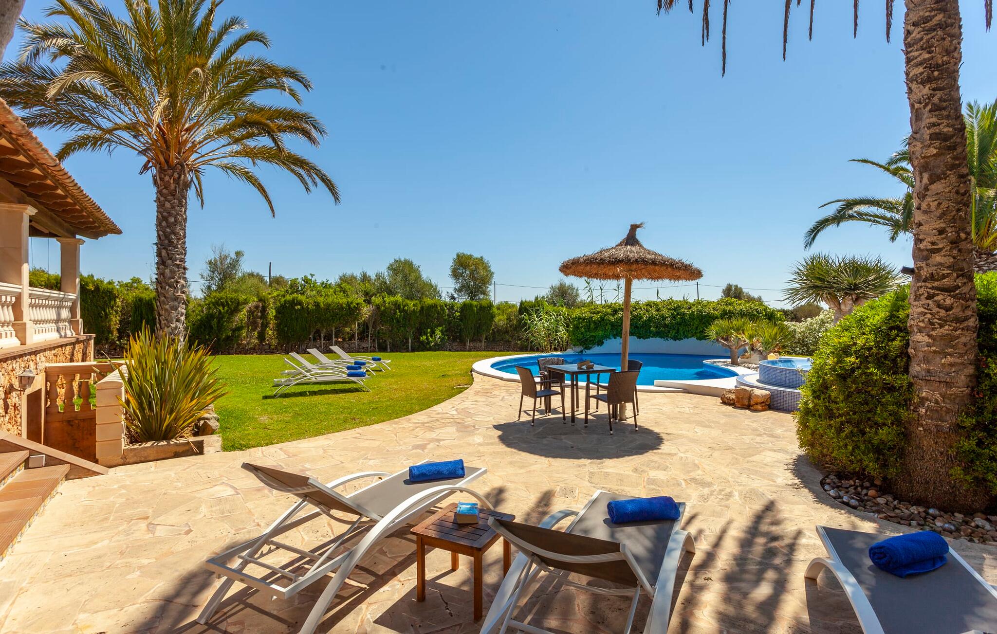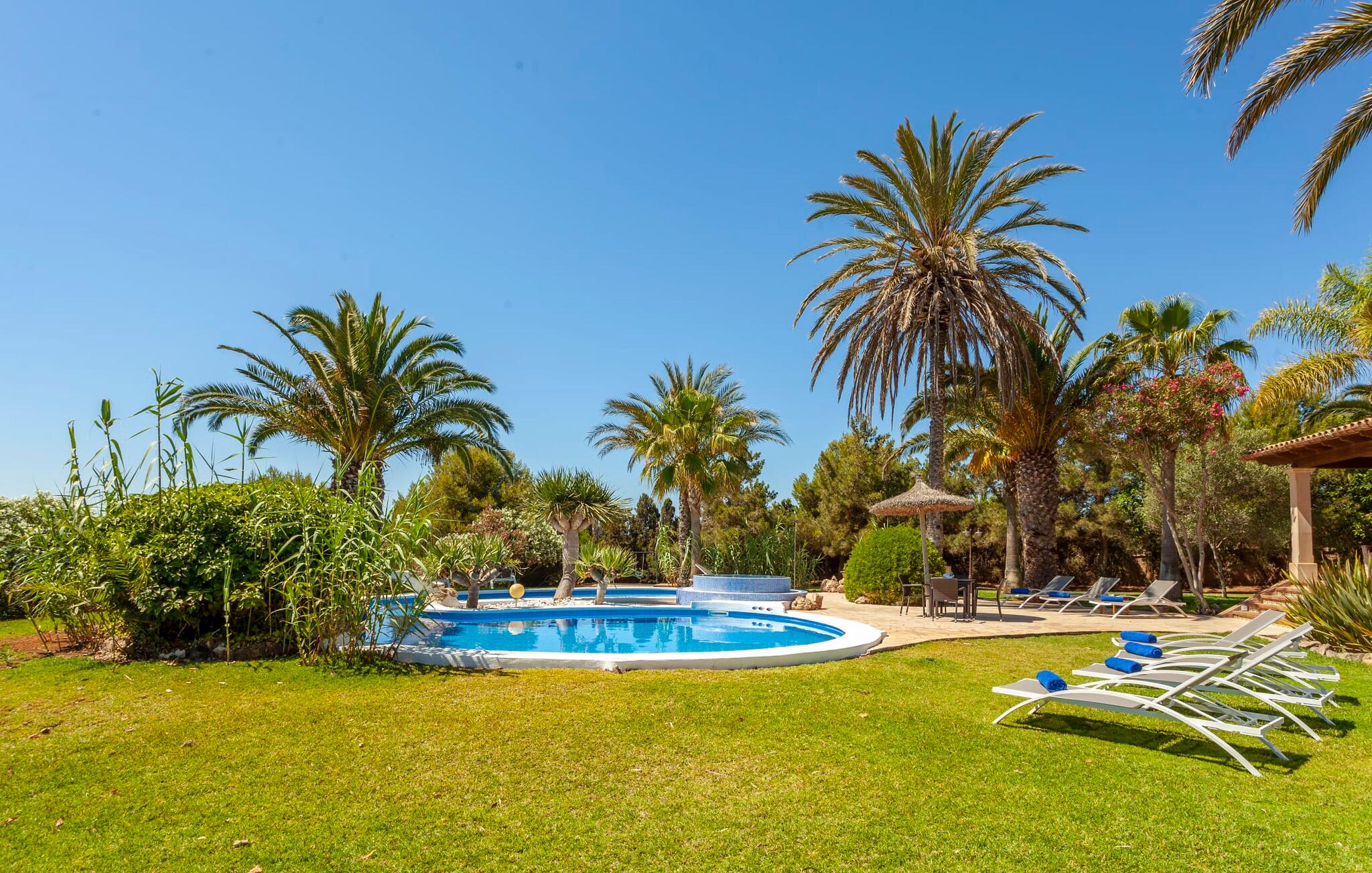 Hier kun je echt genieten van het plattelandsleven: in de uitstekend onderhouden, ruime Villa Sa Tanca Nova op een groot landgoed met indrukwekkende palmbomen en een liefdevol ontworpen zwembad dat zich kan meten met een sterrenhotel. Het zandkleurige huis met het bijzonder mooie overdekte terras, vanwaar je een geweldig uitzicht hebt op de tuin, zal je in alle opzichten overtuigen. Als je vanaf het terras een paar treden naar beneden gaat, kom je al bij het zacht glooiende zwembad, dat turquoise glinstert in de zon, en dit zwembad is allesbehalve een saaie rechthoek. Het heeft niet alleen een buitenwhirlpool, maar ook een cirkelvormige lay-out met een mooi eilandje in het midden en een brug als extra hoogtepunt. Niet alleen de kinderen zullen hier graag een paar baantjes trekken! En als je geen zin hebt in een frisse duik, kun je ontspannen op een van de comfortabele ligstoelen of een spelletje tafeltennis spelen met je medereizigers aan de eigen tafel. Geniet daarna van vers bereide lekkernijen van de gemetselde barbecue en een slaapmutsje op de gezellige rieten stoelen op het terras - de perfecte afsluiting van je dag!