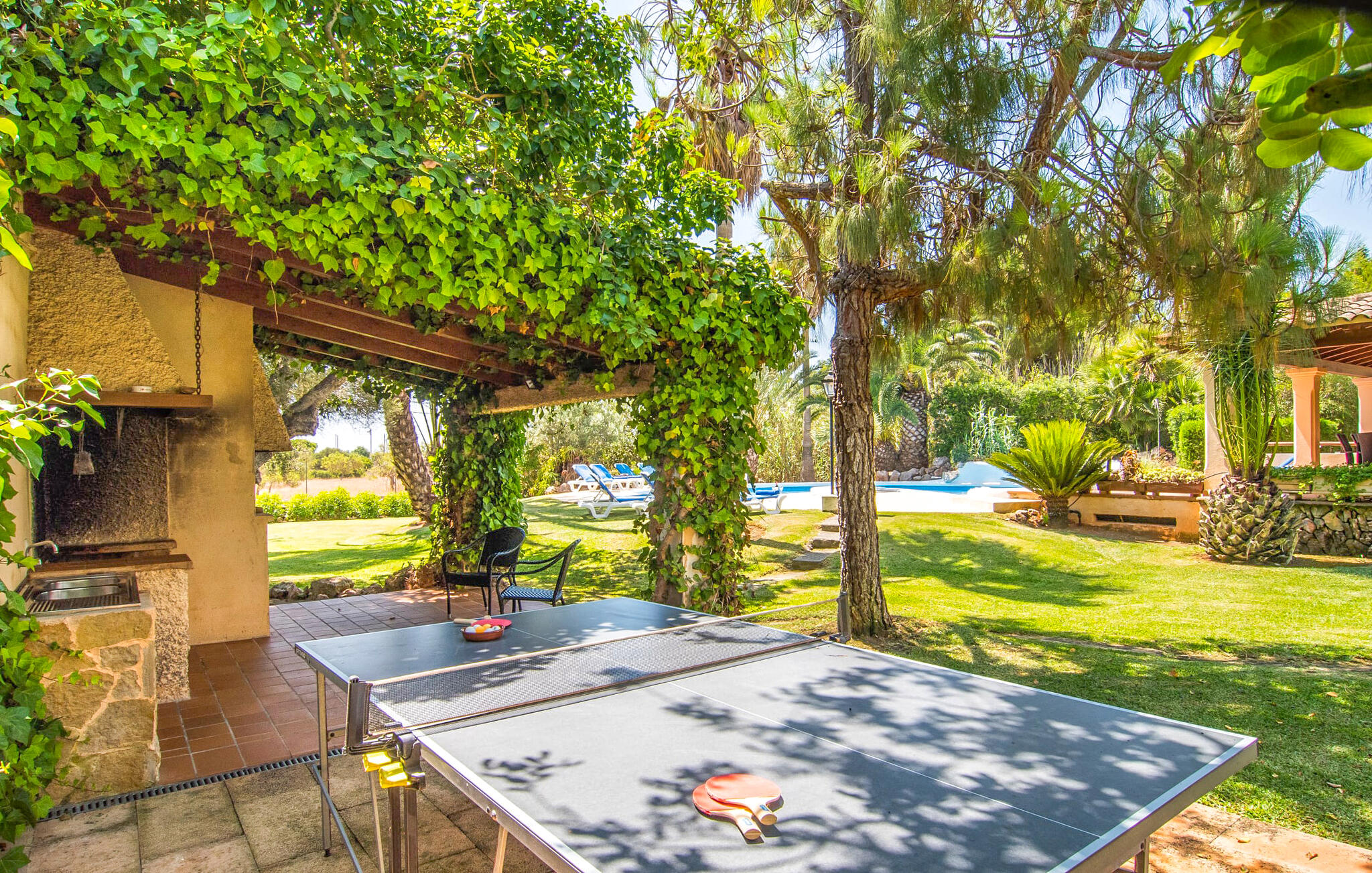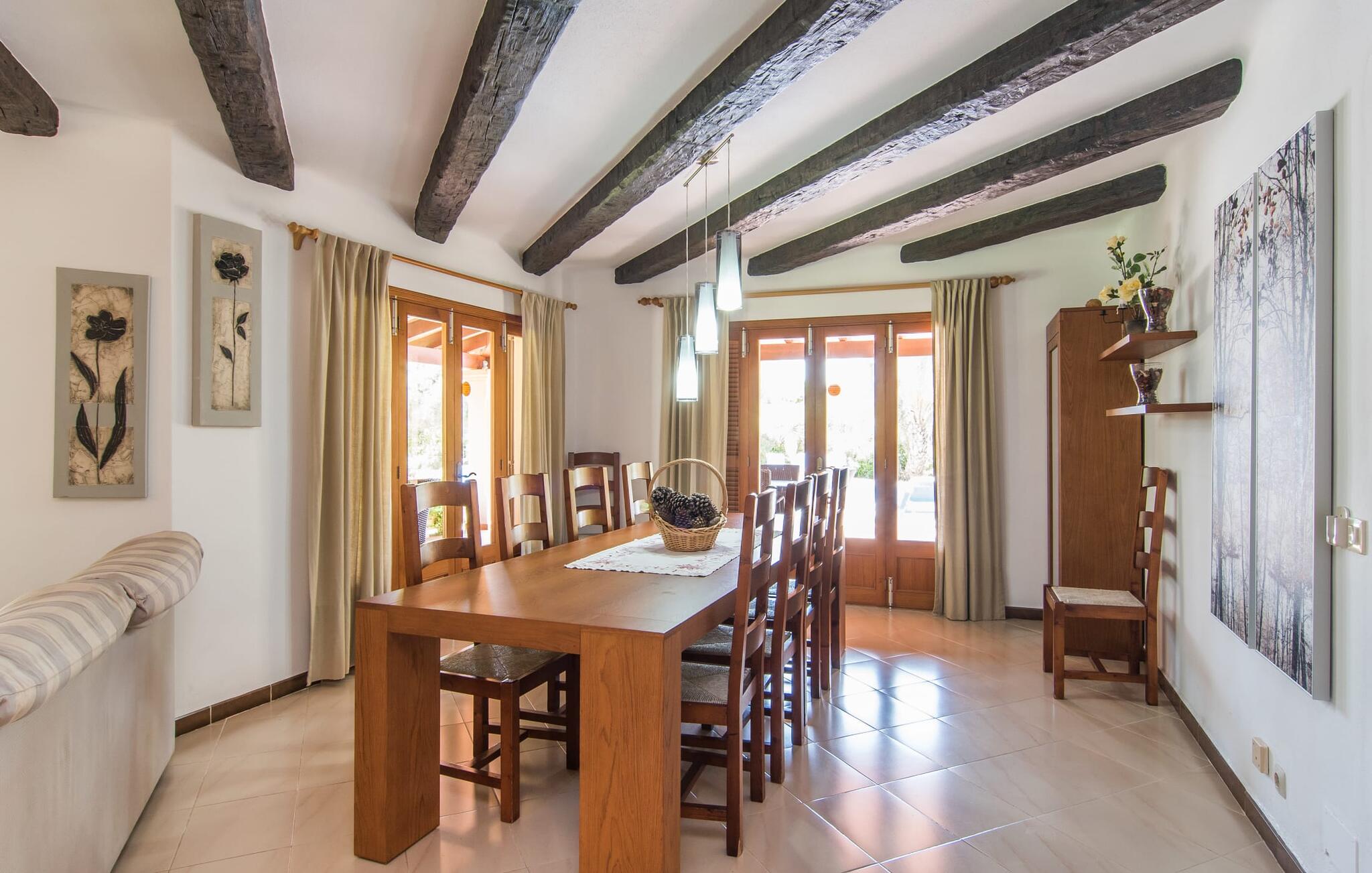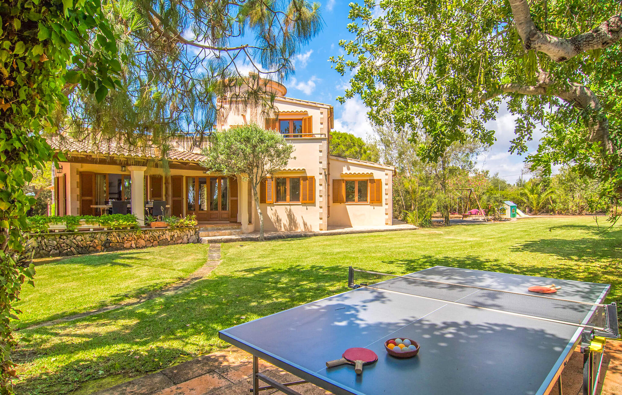Mallorca is meer dan alleen een zonnig eiland in de Middellandse Zee. Mallorca is een levensstijl die je snel zult ontdekken in deze rustieke, charmante stenen villa vlakbij S`Horta. De idyllische tuin verwelkomt je met een kleine palmenoase die je onmiddellijk zal opvrolijken. Het zwembad lijkt op een golf en is omringd door terracotta tegels en zandsteen. Pak je favoriete drankje en kom de dag gewoon door. De tuin is zo liefdevol aangelegd dat je snel kunt ontspannen en nieuwe energie kunt opdoen op een van de zwembadterrassen. Kinderen kunnen spelen op de schommels of een partijtje tafeltennis spelen, wat voor sommige volwassenen natuurlijk ook herinneringen oproept. Onder het overdekte terras kun je tijdens een siësta genieten van vers fruit of lekkere vis en je bijna een echte eilandbewoner voelen. De schattige houten luiken doen hun uiterste best om een natuurlijke Spaanse flair te creëren.