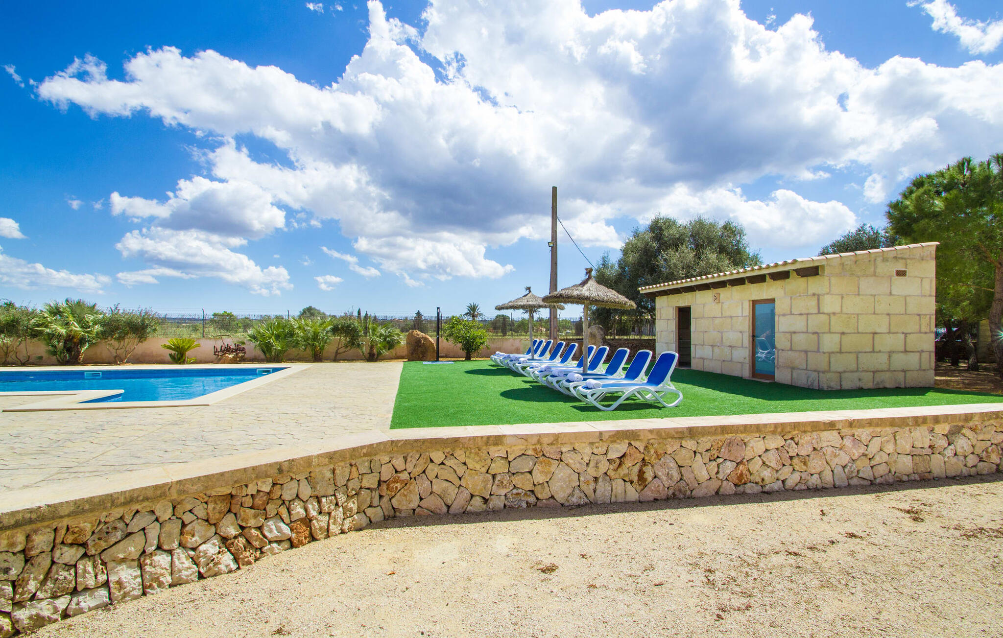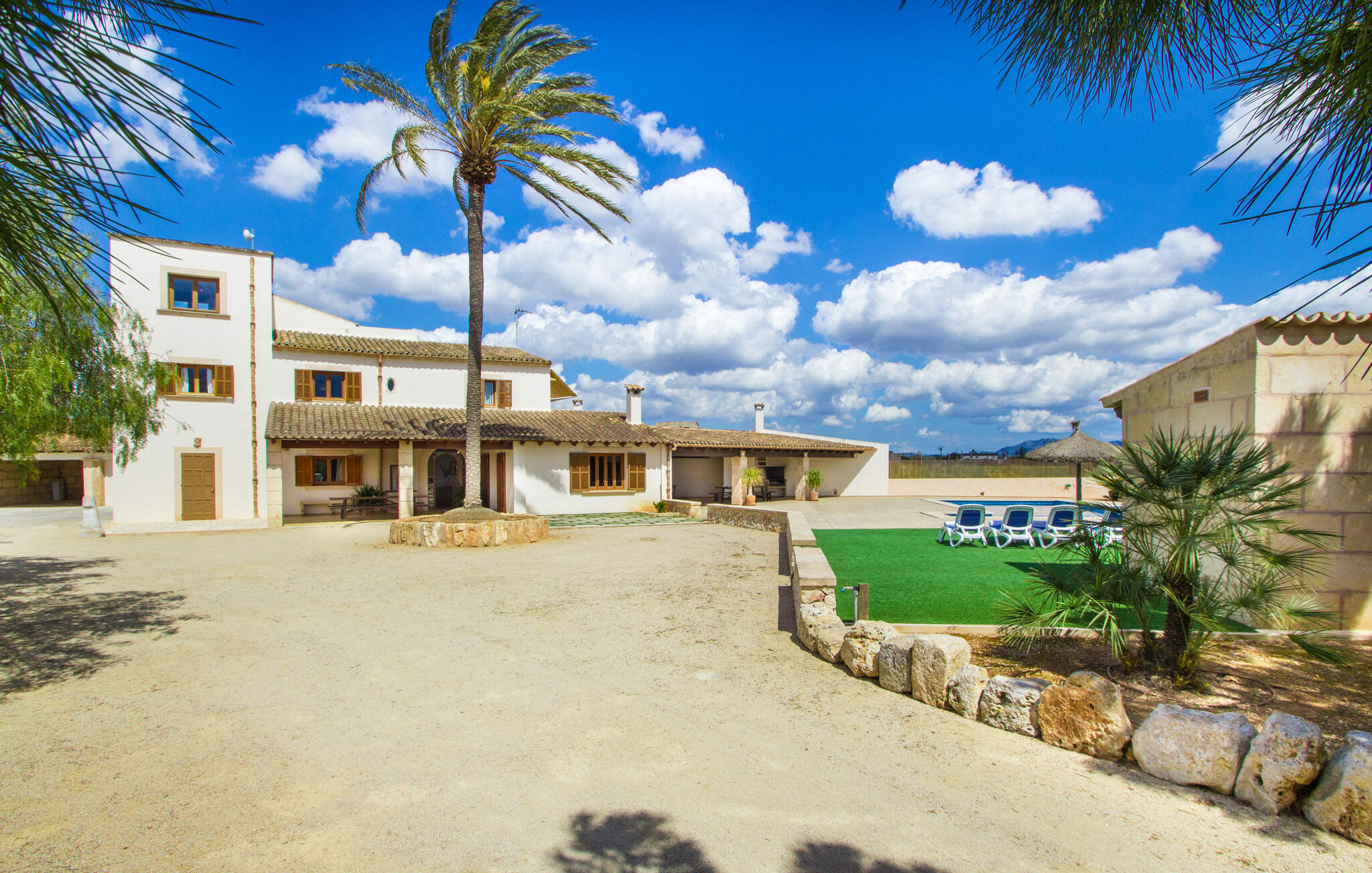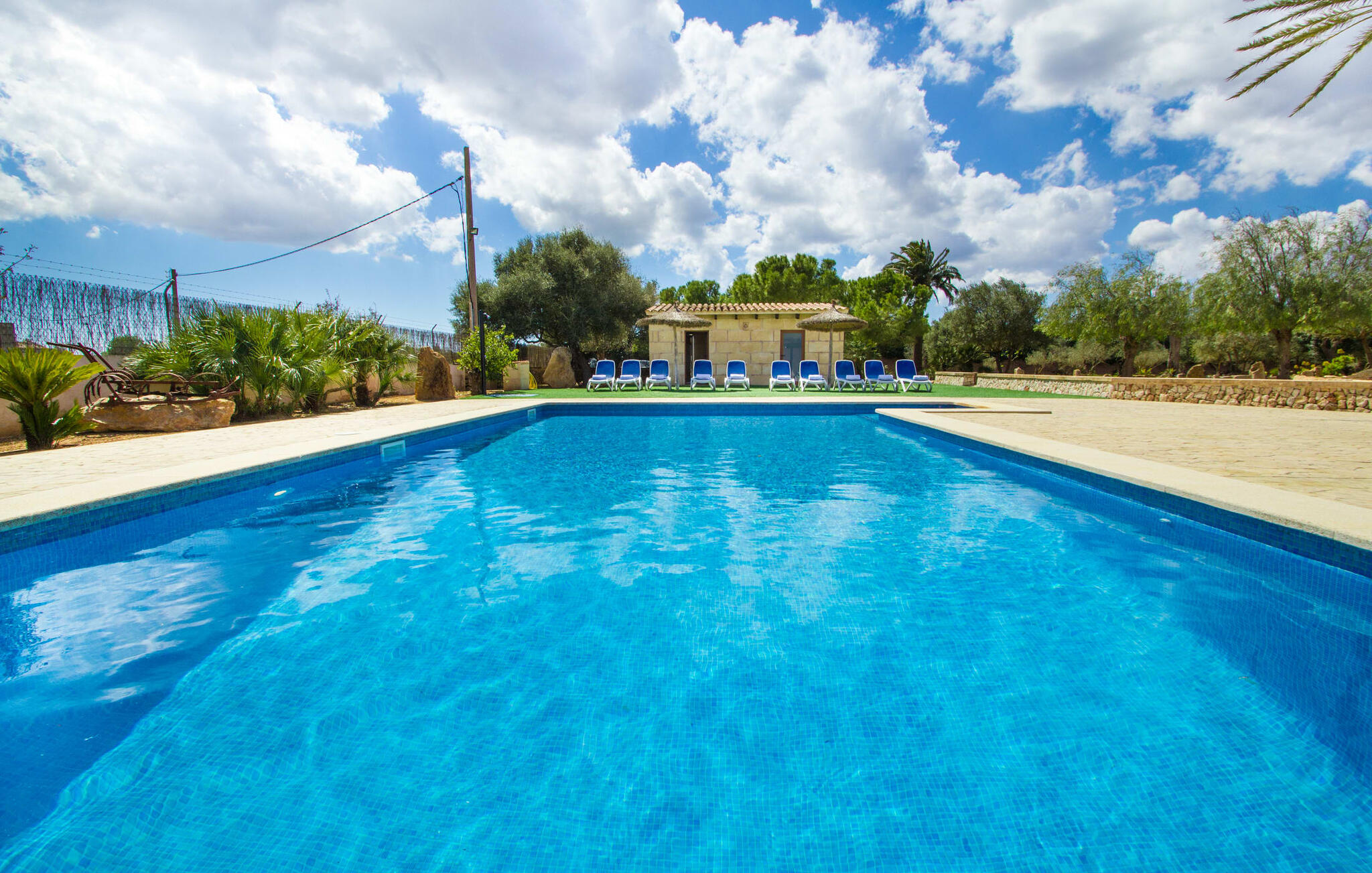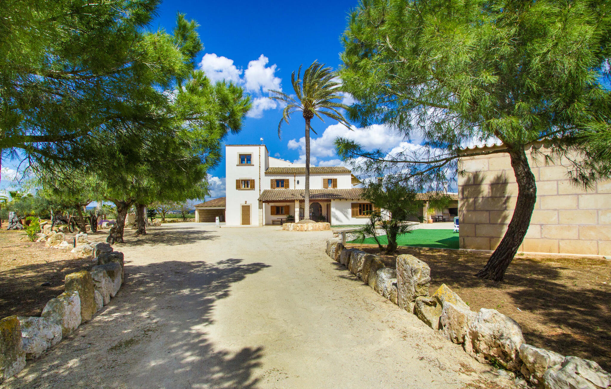 Zodra je Villa Sant Blai Nou bereikt na een rit van 40 minuten vanuit Palma, zul je versteld staan van de grootte van het huis: met een ongelooflijke oppervlakte van 12.474 m² zul je zeker niet in elke kamer passen, zelfs niet als je met z`n negenen in het huis woont. De afmetingen van het zwembad van 12 x 6 meter zijn ook indrukwekkend, dus je kunt de dag beginnen met een paar baantjes trekken bij zonsopgang. Een deel van het terras rond het zwembad is bedekt met kunstgras, waar je het jezelf comfortabel kunt maken op ligstoelen en kunt genieten van de overvloedige zon van het eiland. Dankzij de goede infrastructuur van de buitenruimte vind je naast een buitenzwembad ook een overdekte buitenkeuken, zodat je gemakkelijk het grootste deel van je tijd in de frisse lucht kunt doorbrengen. En tot laat in de avond kunt genieten van onvergetelijke barbecues. De afgelegen locatie garandeert een hoge mate van privacy. Een hoge palmboom domineert het voorplein van de villa, waar je ook een overblijfsel vindt uit de tijd dat paarden nog onmisbaar waren voor de landbouw op het eiland.