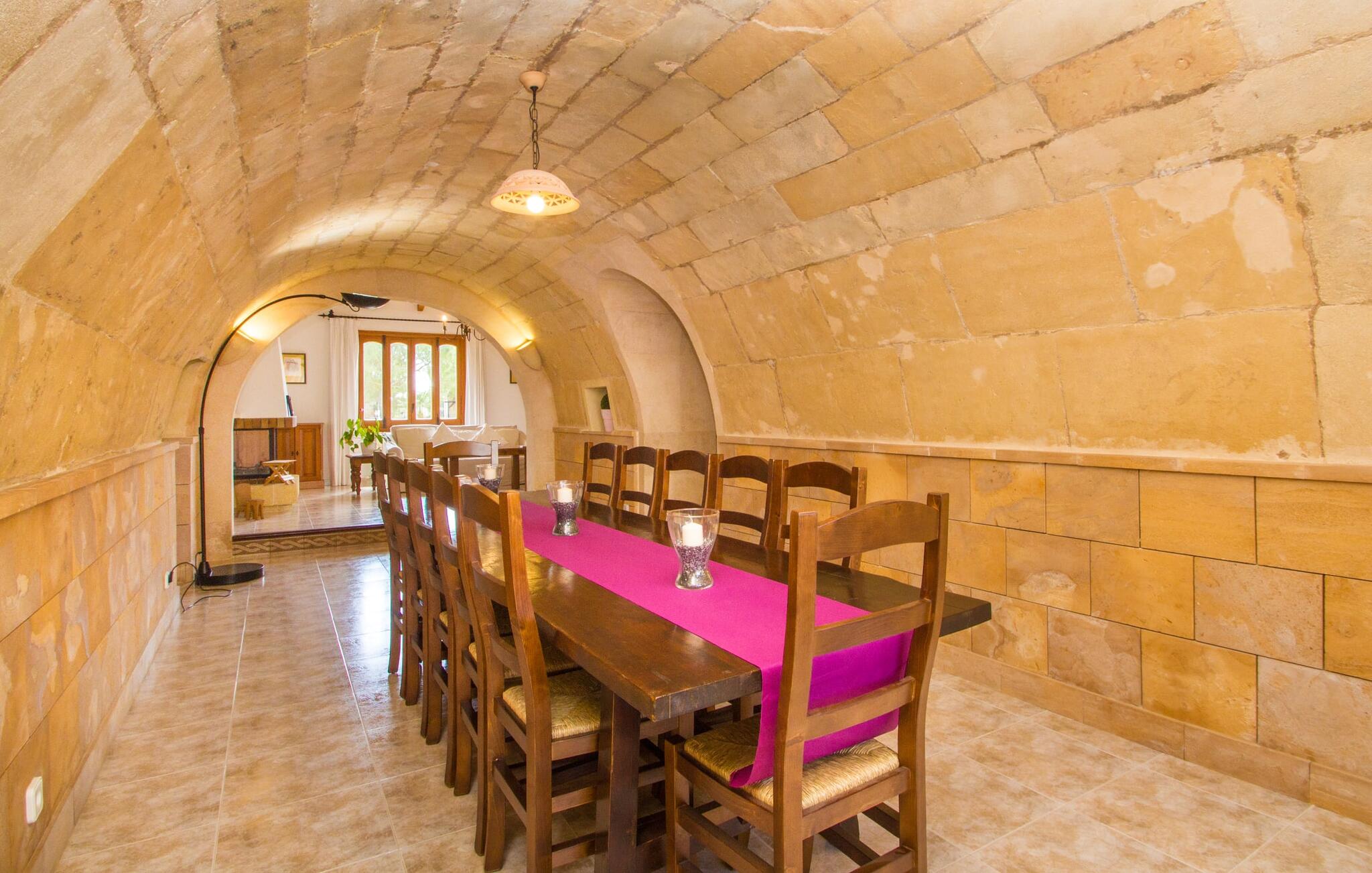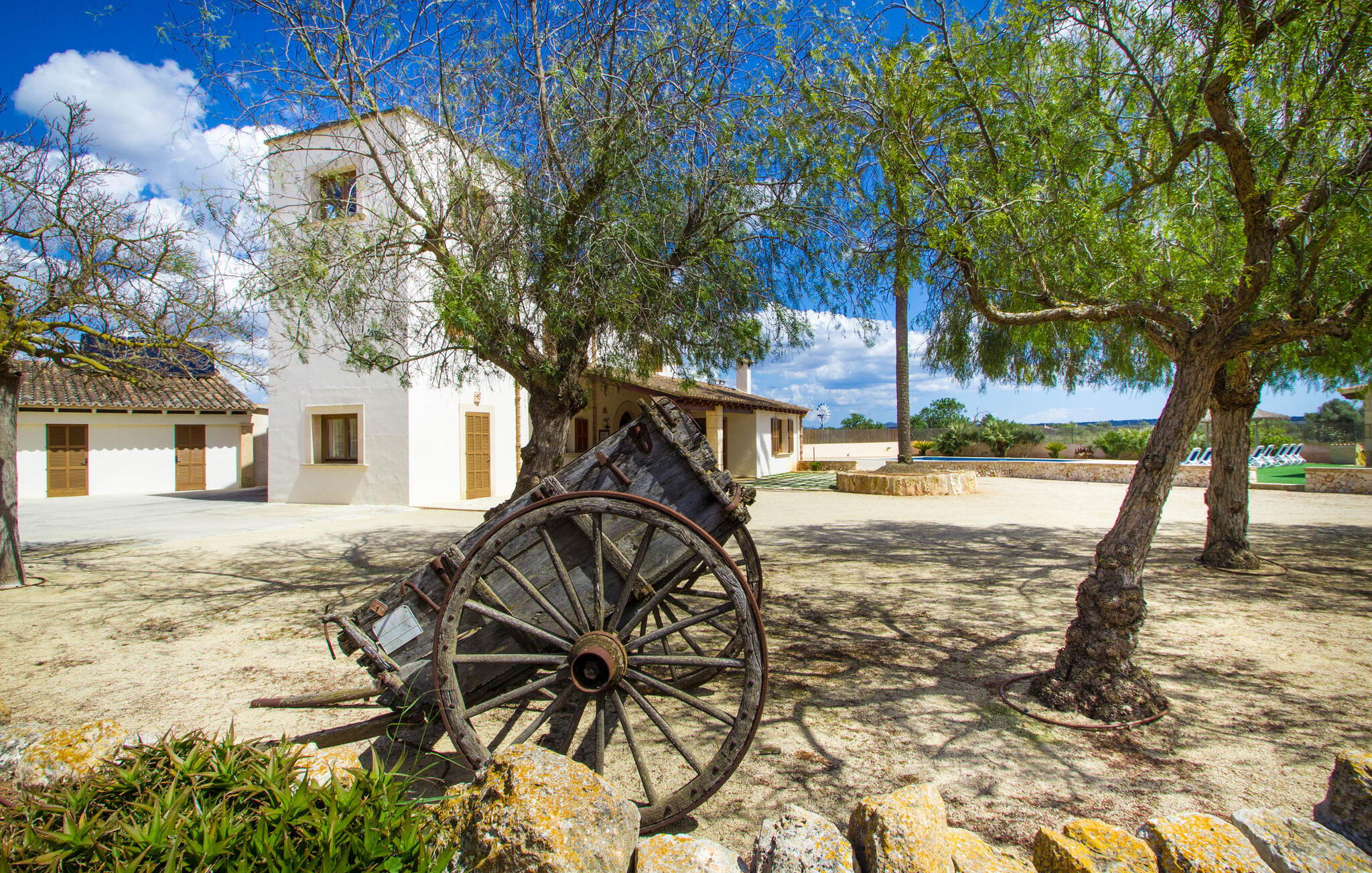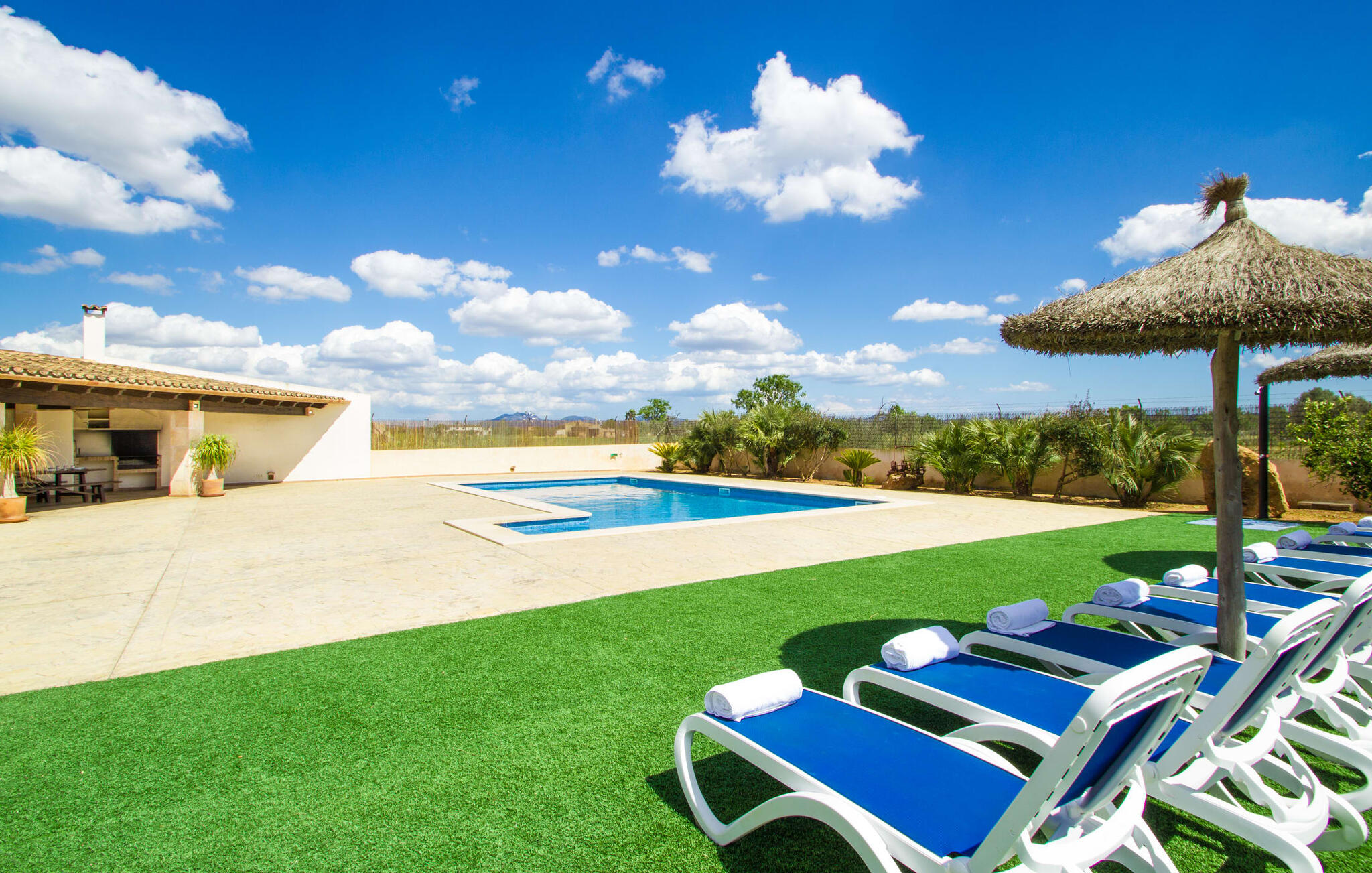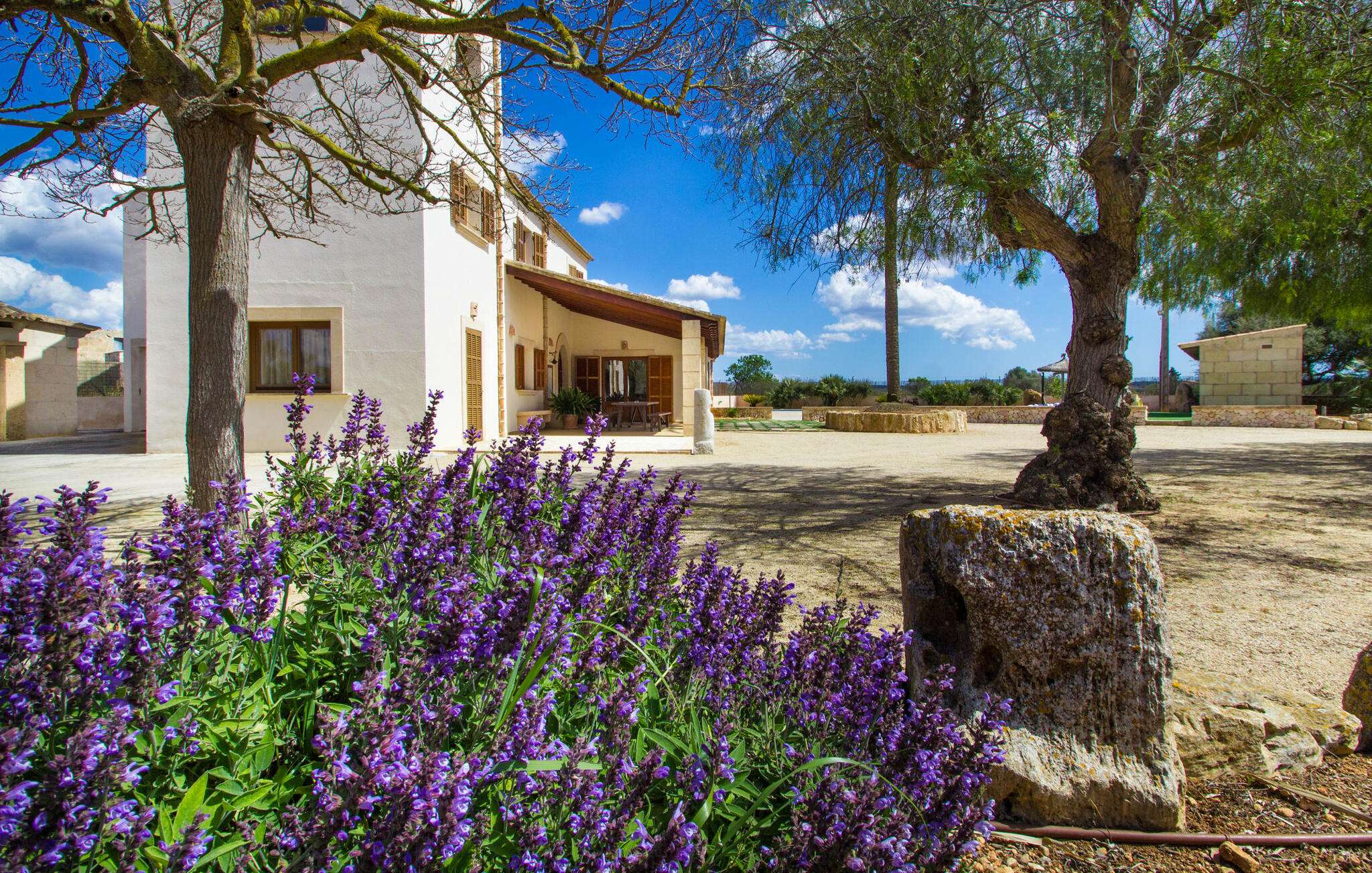 Zodra je Villa Sant Blai Nou bereikt na een rit van 40 minuten vanuit Palma, zul je versteld staan van de grootte van het huis: met een ongelooflijke oppervlakte van 12.474 m² zul je zeker niet in elke kamer passen, zelfs niet als je met z`n negenen in het huis woont. De afmetingen van het zwembad van 12 x 6 meter zijn ook indrukwekkend, dus je kunt de dag beginnen met een paar baantjes trekken bij zonsopgang. Een deel van het terras rond het zwembad is bedekt met kunstgras, waar je het jezelf comfortabel kunt maken op ligstoelen en kunt genieten van de overvloedige zon van het eiland. Dankzij de goede infrastructuur van de buitenruimte vind je naast een buitenzwembad ook een overdekte buitenkeuken, zodat je gemakkelijk het grootste deel van je tijd in de frisse lucht kunt doorbrengen. En tot laat in de avond kunt genieten van onvergetelijke barbecues. De afgelegen locatie garandeert een hoge mate van privacy. Een hoge palmboom domineert het voorplein van de villa, waar je ook een overblijfsel vindt uit de tijd dat paarden nog onmisbaar waren voor de landbouw op het eiland.