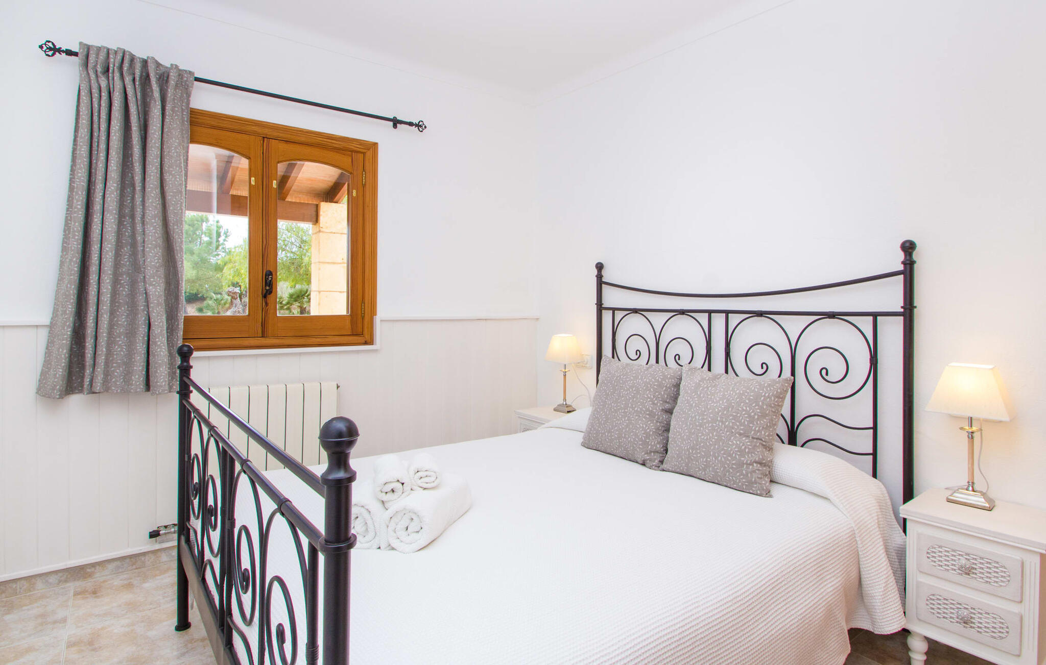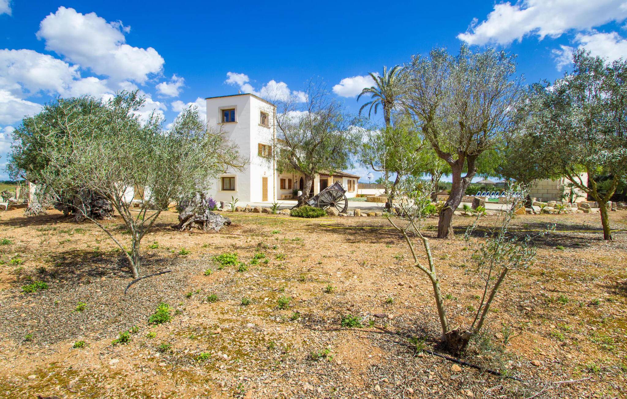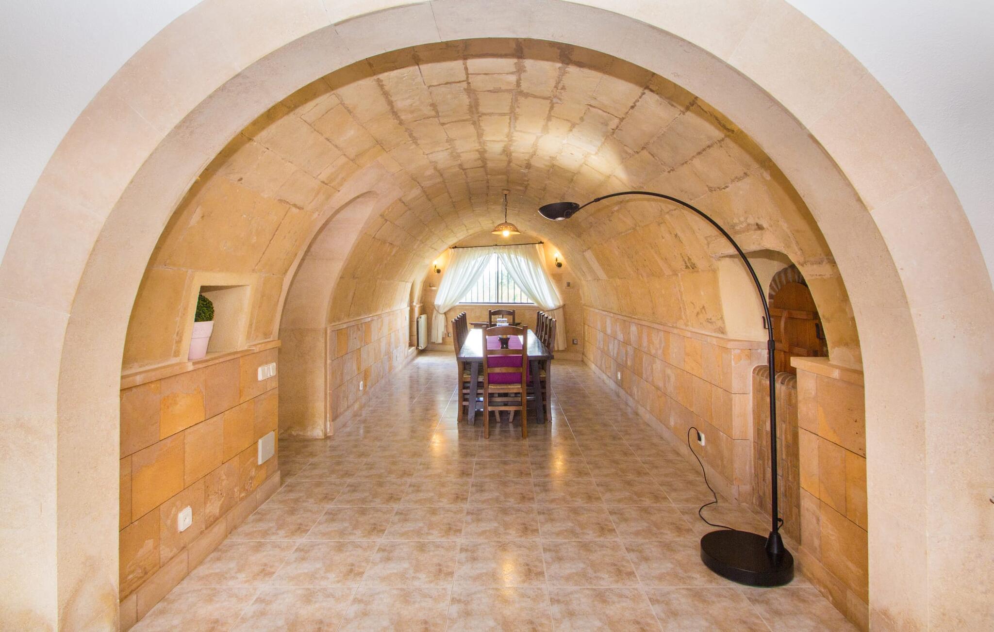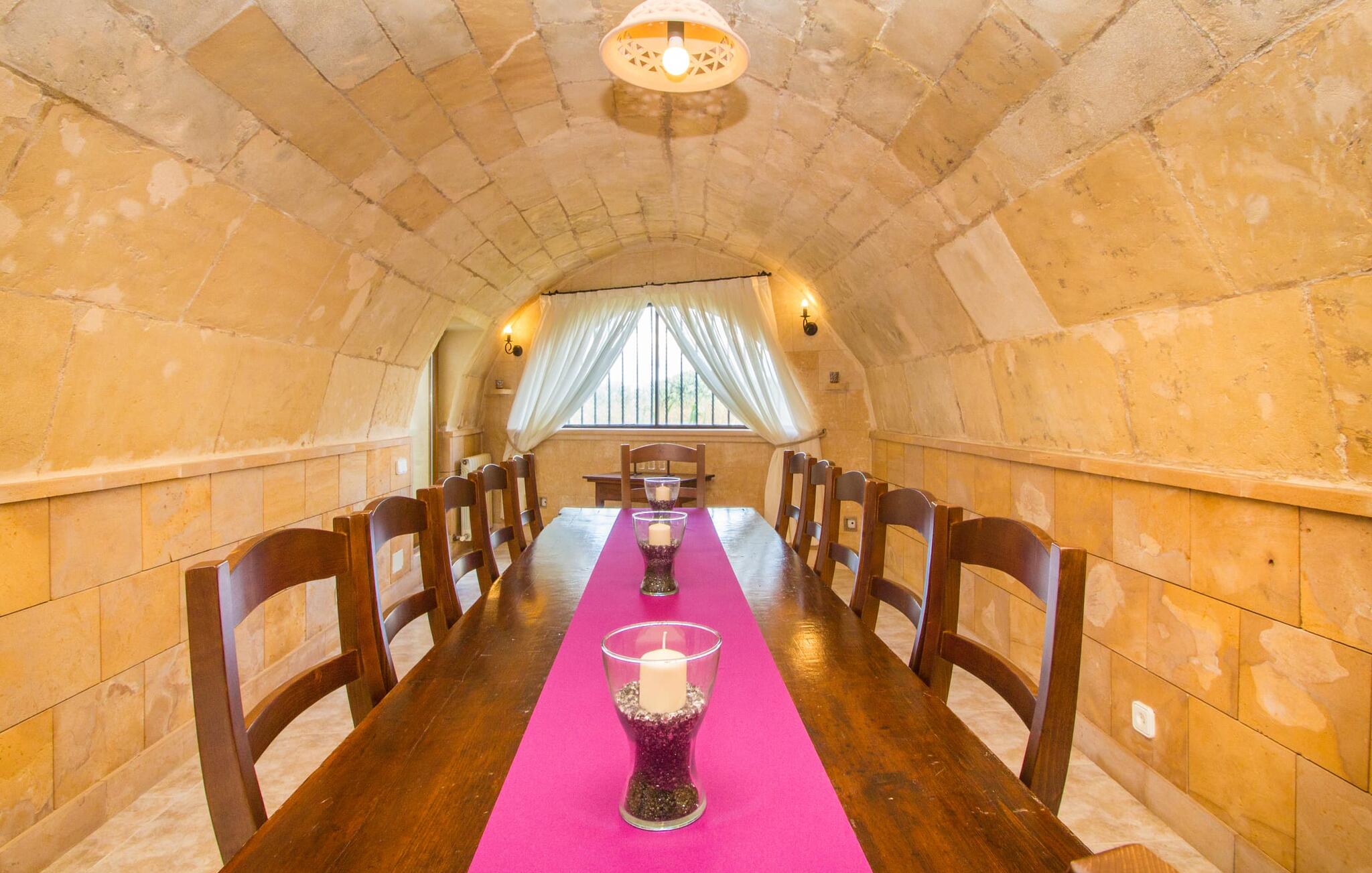 Zodra je Villa Sant Blai Nou bereikt na een rit van 40 minuten vanuit Palma, zul je versteld staan van de grootte van het huis: met een ongelooflijke oppervlakte van 12.474 m² zul je zeker niet in elke kamer passen, zelfs niet als je met z`n negenen in het huis woont. De afmetingen van het zwembad van 12 x 6 meter zijn ook indrukwekkend, dus je kunt de dag beginnen met een paar baantjes trekken bij zonsopgang. Een deel van het terras rond het zwembad is bedekt met kunstgras, waar je het jezelf comfortabel kunt maken op ligstoelen en kunt genieten van de overvloedige zon van het eiland. Dankzij de goede infrastructuur van de buitenruimte vind je naast een buitenzwembad ook een overdekte buitenkeuken, zodat je gemakkelijk het grootste deel van je tijd in de frisse lucht kunt doorbrengen. En tot laat in de avond kunt genieten van onvergetelijke barbecues. De afgelegen locatie garandeert een hoge mate van privacy. Een hoge palmboom domineert het voorplein van de villa, waar je ook een overblijfsel vindt uit de tijd dat paarden nog onmisbaar waren voor de landbouw op het eiland.