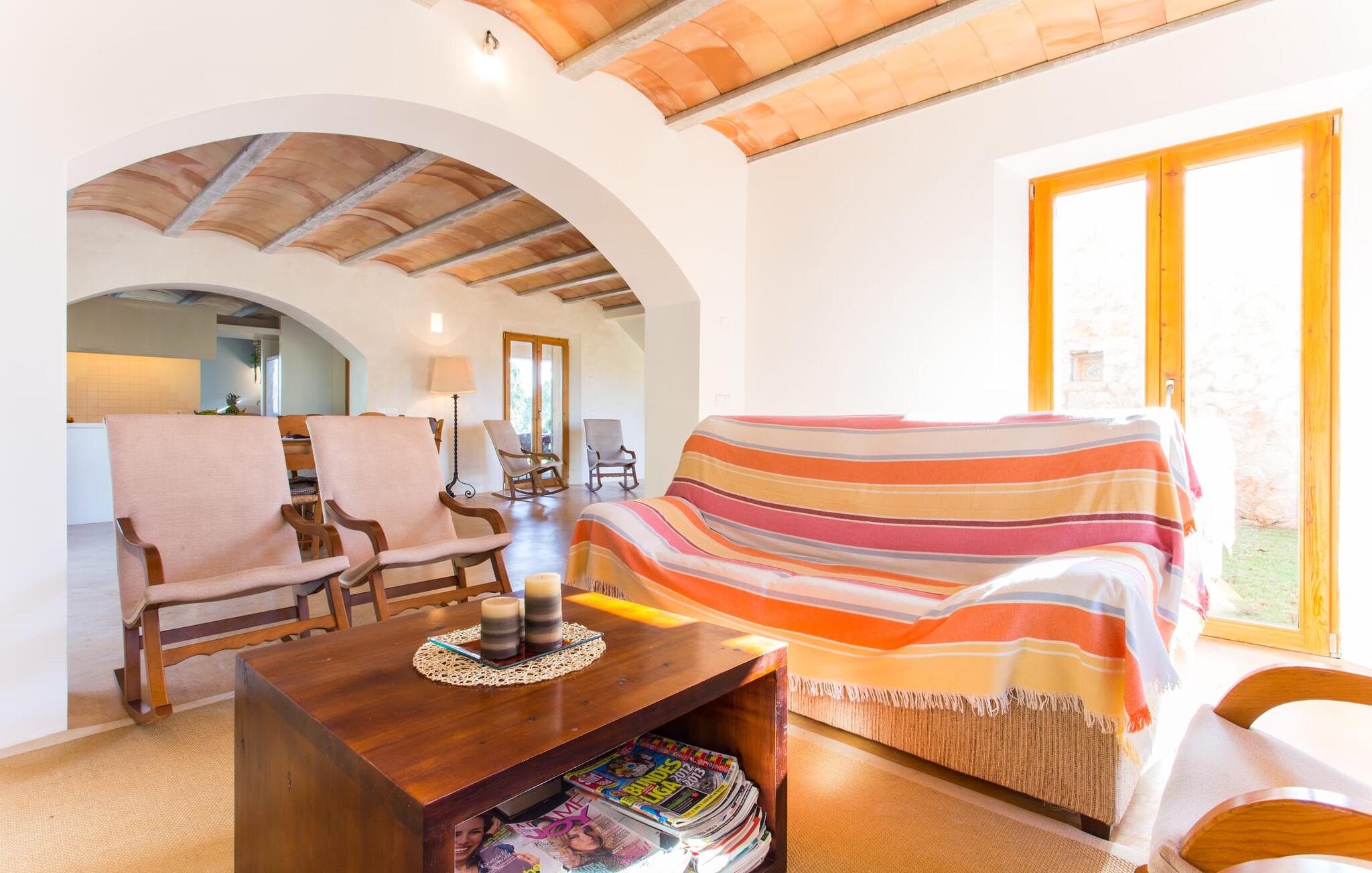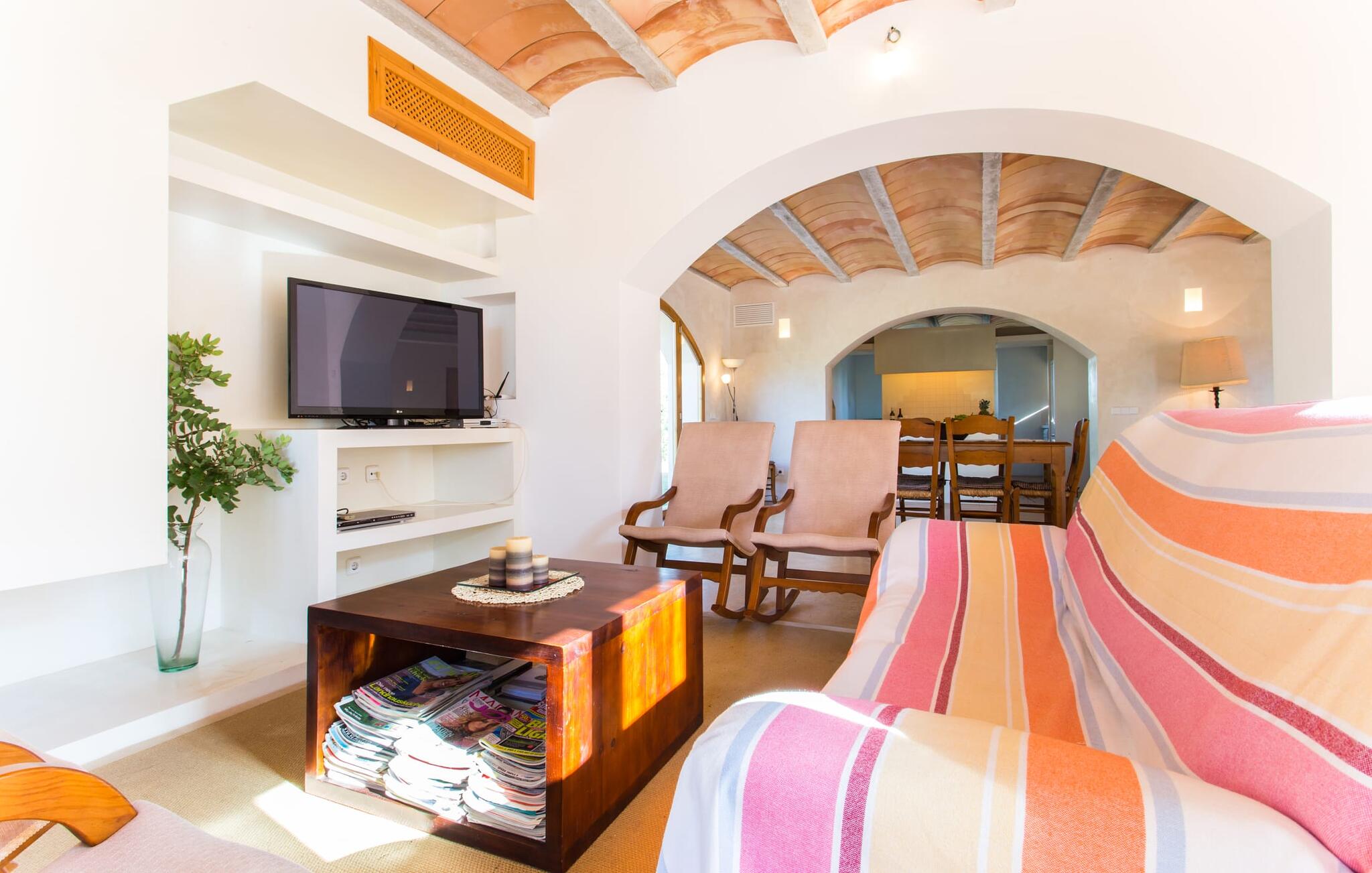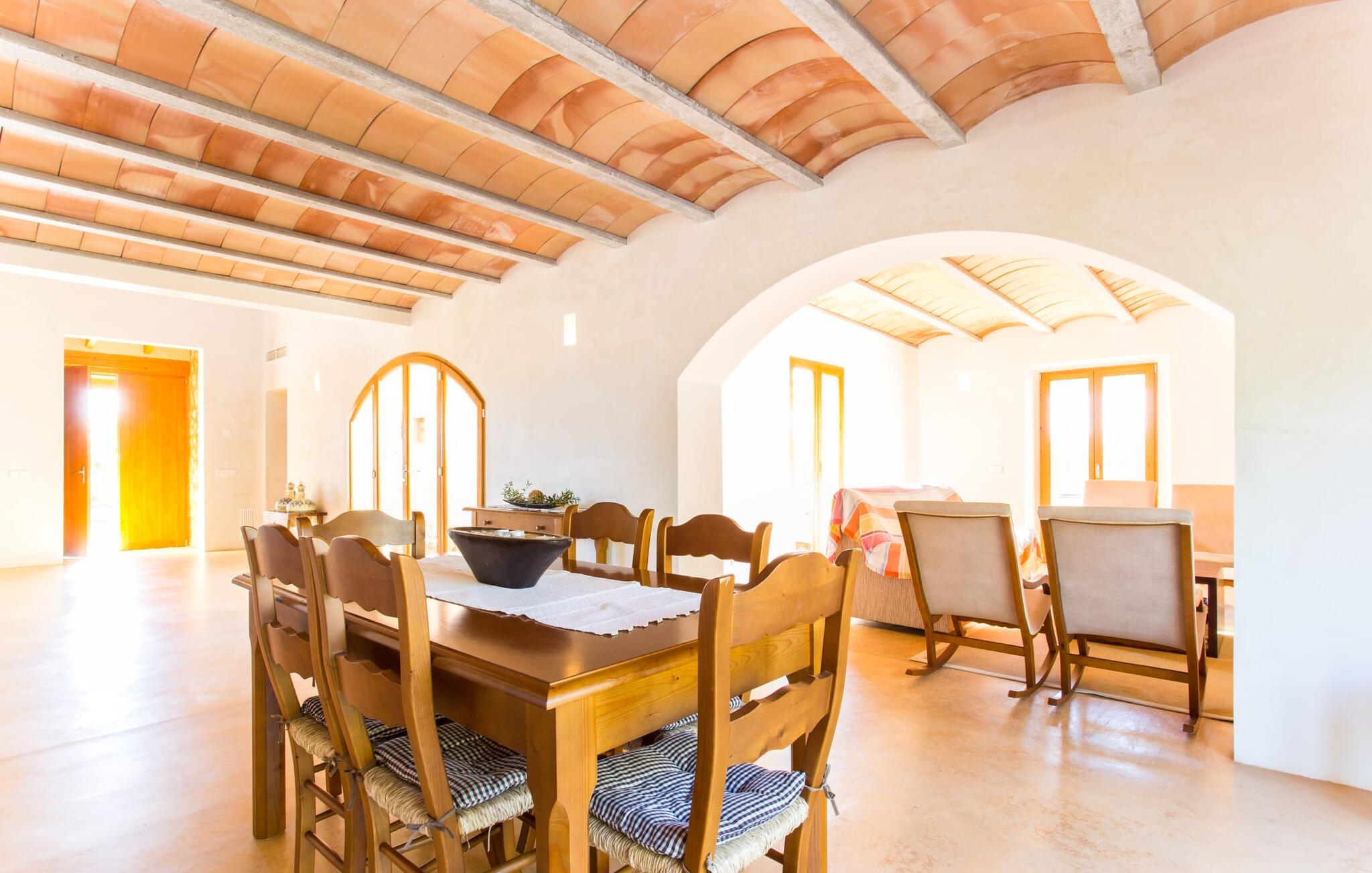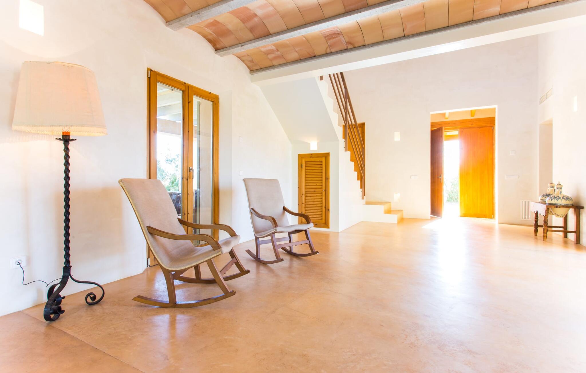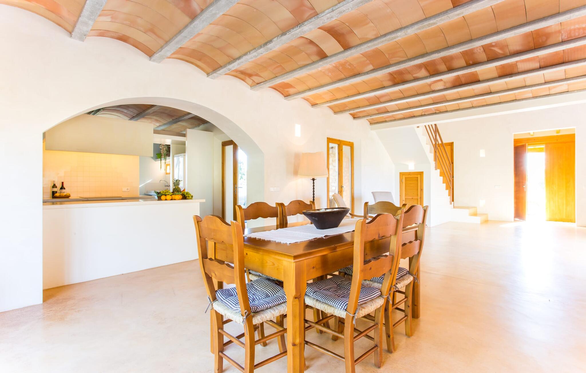 Het interieur van Villa Ses Fonolleres heeft een harmonieuze inrichting die modern en toch warm is. De villa wordt overspoeld met licht dankzij de vele ramen van vloer tot plafond en openslaande deuren naar de tuin. Vooral de ruimte op de begane grond is indrukwekkend. Hoge gewelfde plafonds benadrukken het royale gevoel van ruimte, terwijl ronde bogen de indruk geven van een vloeiende combinatie van wonen, eten en koken. In de muren ingebouwde rekken en verlichtingselementen vervullen een praktisch en esthetisch doel in de hele villa. De volledig uitgeruste keuken met kookeiland en aanrecht biedt ruimte voor iedereen om te helpen bij het bereiden van maaltijden. Als je zin hebt om te entertainen of als het weer niet meespeelt, kun je ontspannen op de bank voor de flatscreentelevisie of samen naar een spannende dvd kijken. Drie slaapkamers (1 x met tweepersoonsbed, 2 x met twee eenpersoonsbedden, veel bergruimte) bieden een rustige, vredige nachtrust. De kamers worden gekenmerkt door typische Mallorcaanse decorelementen met kalkwitte muren en traditionele houten balkenplafonds. Een van de twee badkamers met daglicht op de begane grond is apart en daarom ideaal als gastenbadkamer. Een brede trap leidt van de entree naar de bovenste verdieping. Er is een kleine galerij met een bank waar je van een boek kunt genieten. Achter de galerij ligt de derde slaapkamer met aangrenzende badkamer en directe toegang tot het balkon, dat een prachtig, vrij uitzicht biedt op het omliggende platteland.