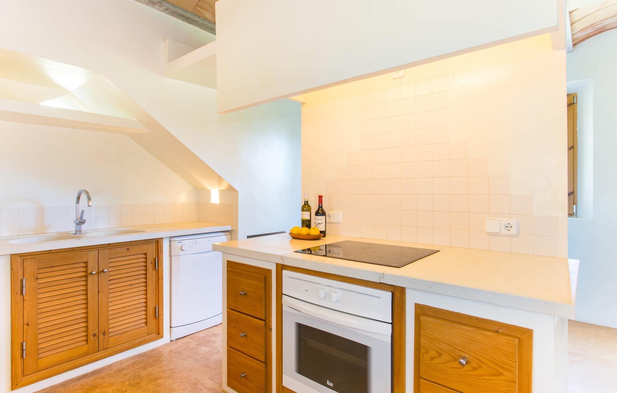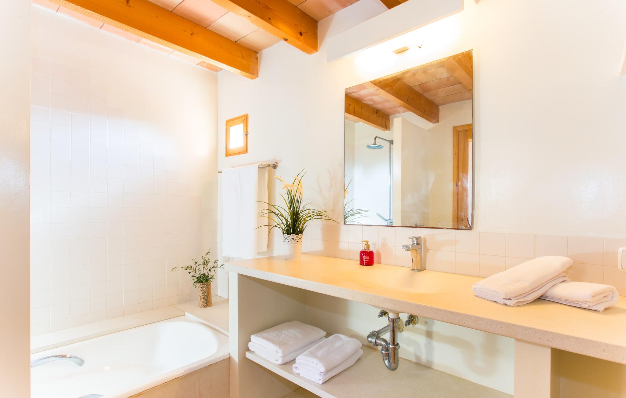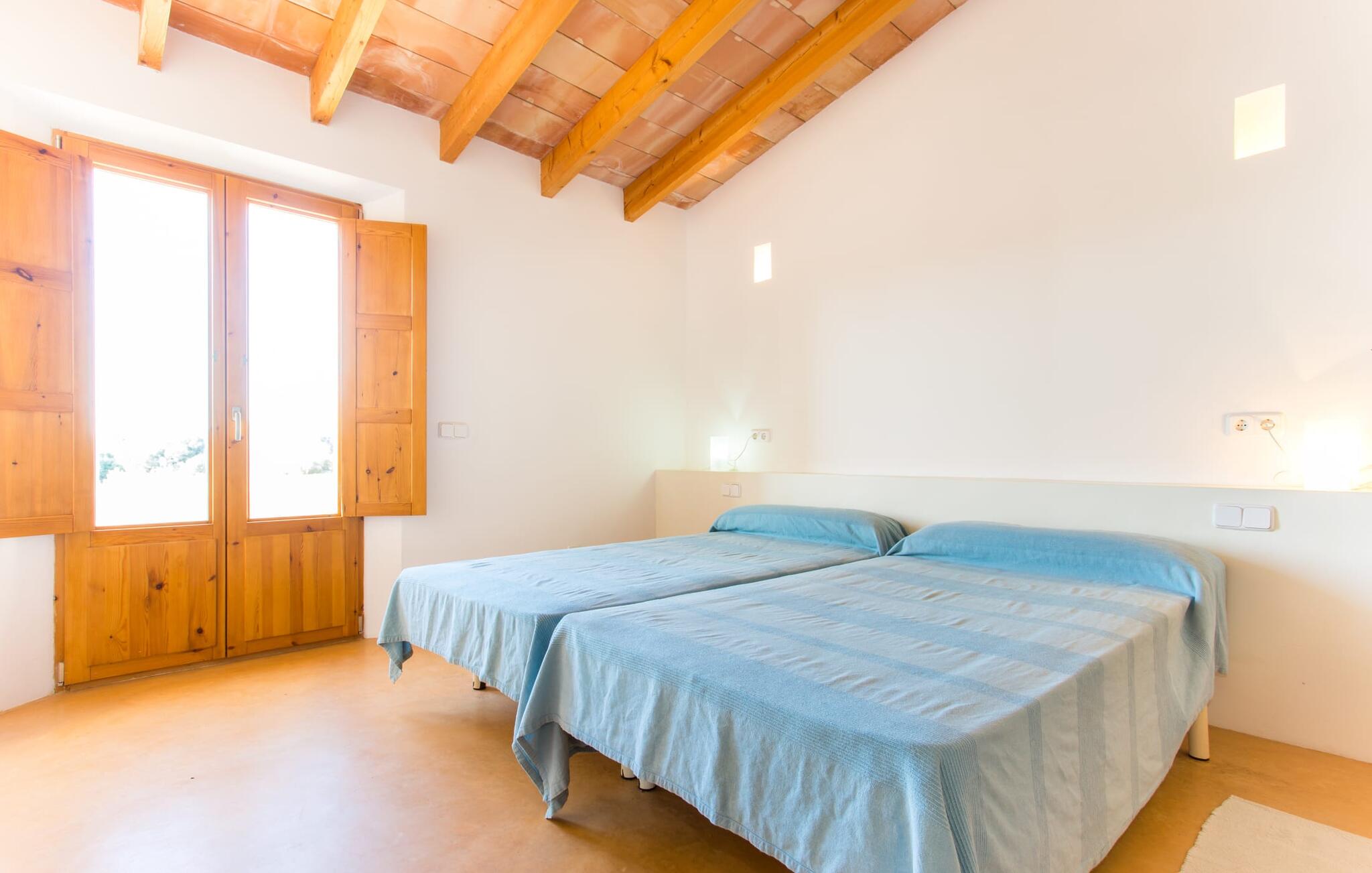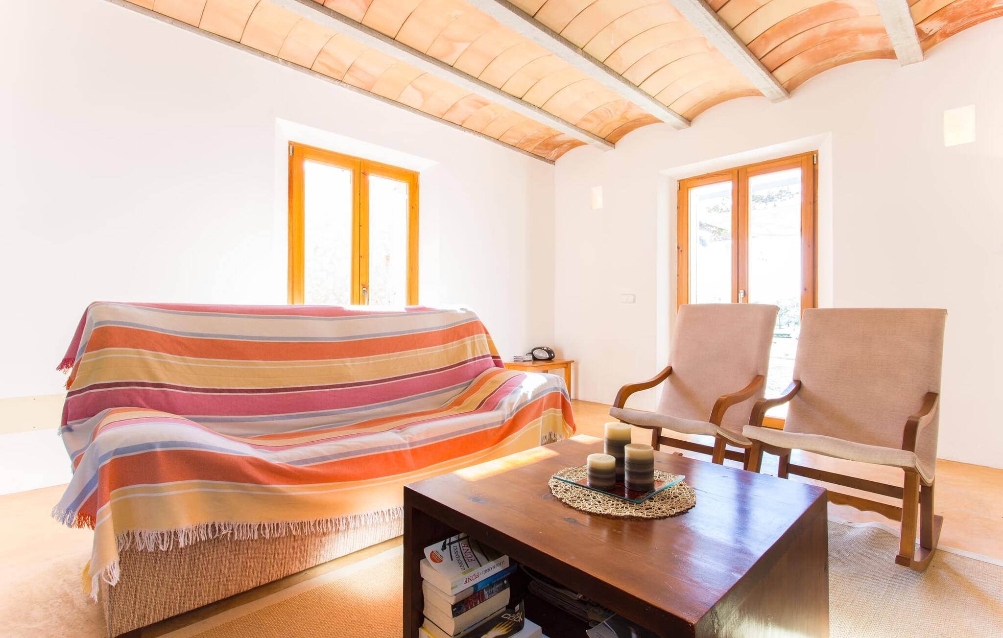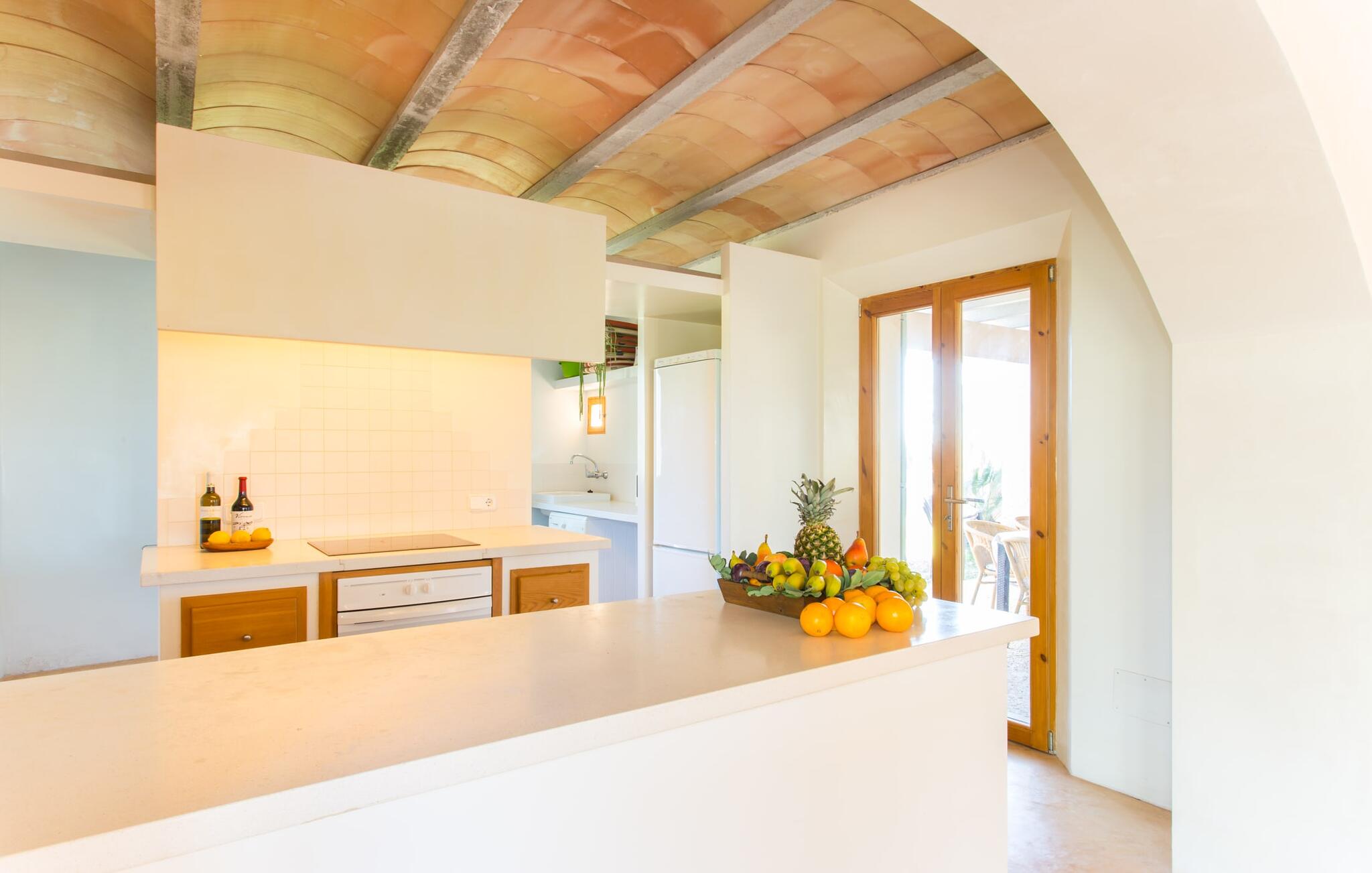 Het interieur van Villa Ses Fonolleres heeft een harmonieuze inrichting die modern en toch warm is. De villa wordt overspoeld met licht dankzij de vele ramen van vloer tot plafond en openslaande deuren naar de tuin. Vooral de ruimte op de begane grond is indrukwekkend. Hoge gewelfde plafonds benadrukken het royale gevoel van ruimte, terwijl ronde bogen de indruk geven van een vloeiende combinatie van wonen, eten en koken. In de muren ingebouwde rekken en verlichtingselementen vervullen een praktisch en esthetisch doel in de hele villa. De volledig uitgeruste keuken met kookeiland en aanrecht biedt ruimte voor iedereen om te helpen bij het bereiden van maaltijden. Als je zin hebt om te entertainen of als het weer niet meespeelt, kun je ontspannen op de bank voor de flatscreentelevisie of samen naar een spannende dvd kijken. Drie slaapkamers (1 x met tweepersoonsbed, 2 x met twee eenpersoonsbedden, veel bergruimte) bieden een rustige, vredige nachtrust. De kamers worden gekenmerkt door typische Mallorcaanse decorelementen met kalkwitte muren en traditionele houten balkenplafonds. Een van de twee badkamers met daglicht op de begane grond is apart en daarom ideaal als gastenbadkamer. Een brede trap leidt van de entree naar de bovenste verdieping. Er is een kleine galerij met een bank waar je van een boek kunt genieten. Achter de galerij ligt de derde slaapkamer met aangrenzende badkamer en directe toegang tot het balkon, dat een prachtig, vrij uitzicht biedt op het omliggende platteland.