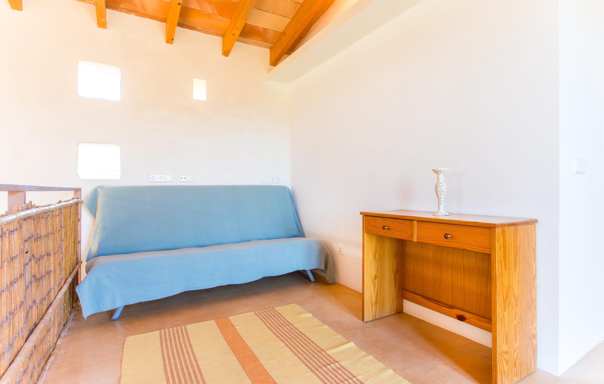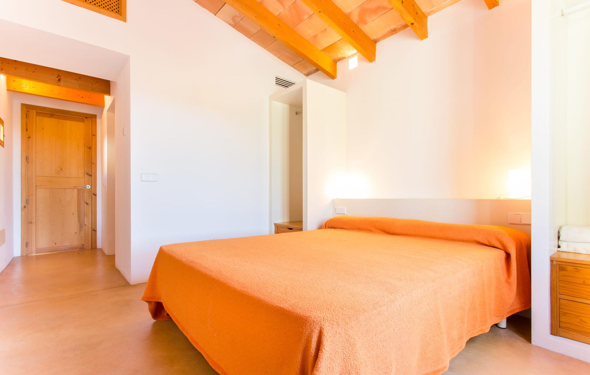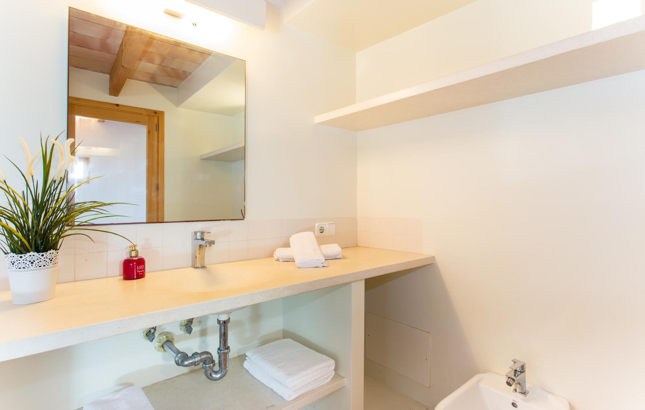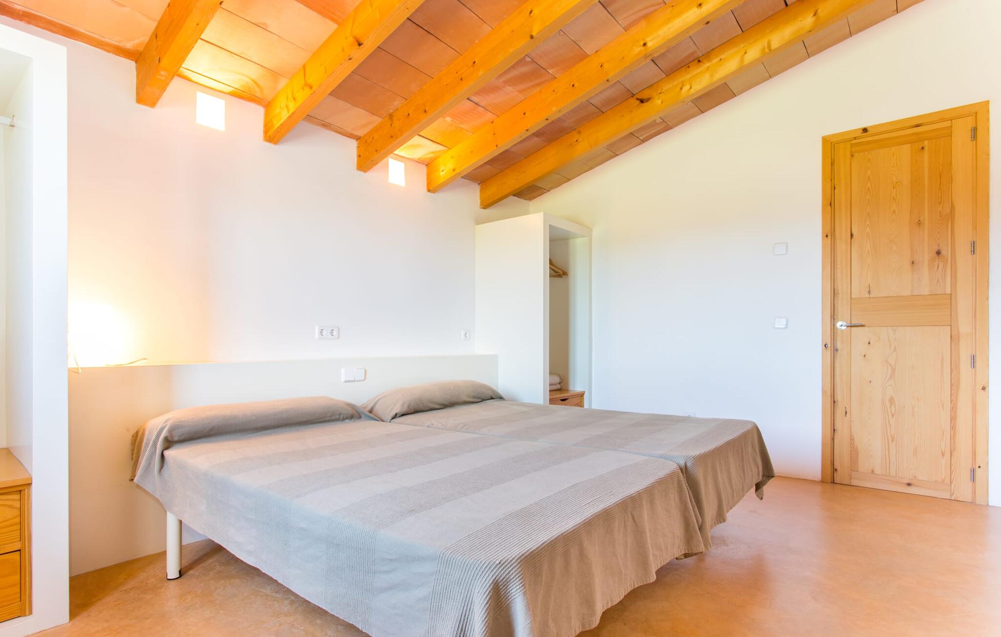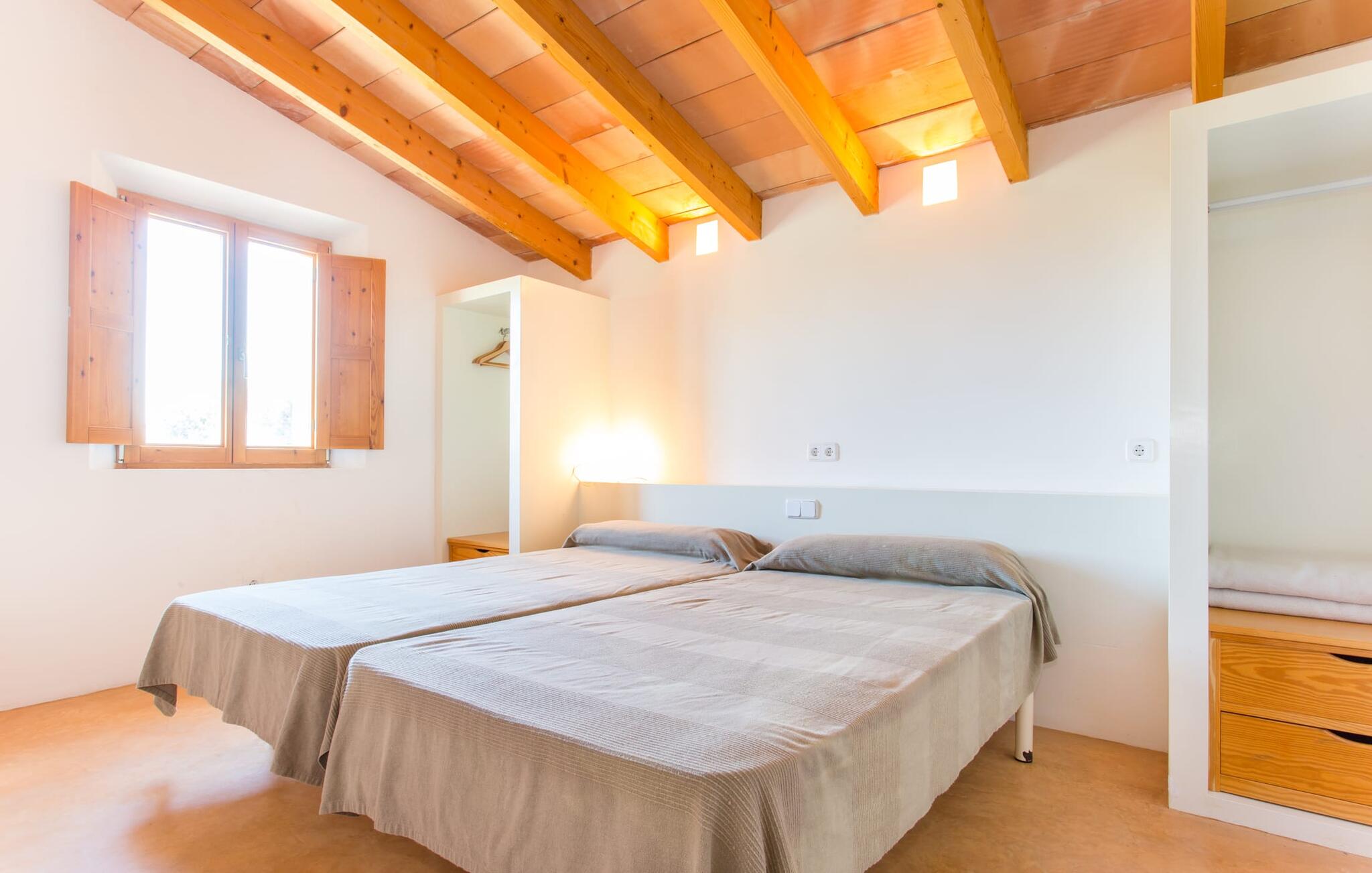 Het interieur van Villa Ses Fonolleres heeft een harmonieuze inrichting die modern en toch warm is. De villa wordt overspoeld met licht dankzij de vele ramen van vloer tot plafond en openslaande deuren naar de tuin. Vooral de ruimte op de begane grond is indrukwekkend. Hoge gewelfde plafonds benadrukken het royale gevoel van ruimte, terwijl ronde bogen de indruk geven van een vloeiende combinatie van wonen, eten en koken. In de muren ingebouwde rekken en verlichtingselementen vervullen een praktisch en esthetisch doel in de hele villa. De volledig uitgeruste keuken met kookeiland en aanrecht biedt ruimte voor iedereen om te helpen bij het bereiden van maaltijden. Als je zin hebt om te entertainen of als het weer niet meespeelt, kun je ontspannen op de bank voor de flatscreentelevisie of samen naar een spannende dvd kijken. Drie slaapkamers (1 x met tweepersoonsbed, 2 x met twee eenpersoonsbedden, veel bergruimte) bieden een rustige, vredige nachtrust. De kamers worden gekenmerkt door typische Mallorcaanse decorelementen met kalkwitte muren en traditionele houten balkenplafonds. Een van de twee badkamers met daglicht op de begane grond is apart en daarom ideaal als gastenbadkamer. Een brede trap leidt van de entree naar de bovenste verdieping. Er is een kleine galerij met een bank waar je van een boek kunt genieten. Achter de galerij ligt de derde slaapkamer met aangrenzende badkamer en directe toegang tot het balkon, dat een prachtig, vrij uitzicht biedt op het omliggende platteland.
