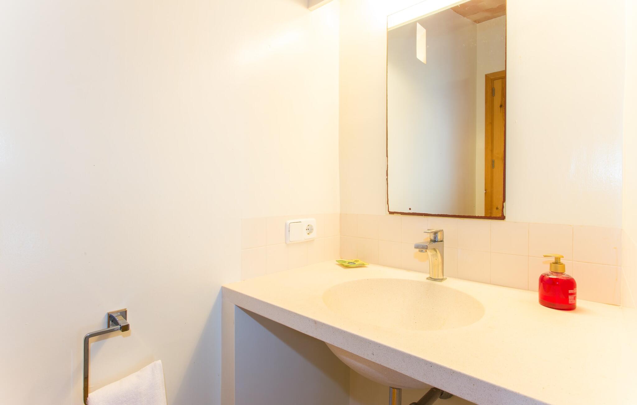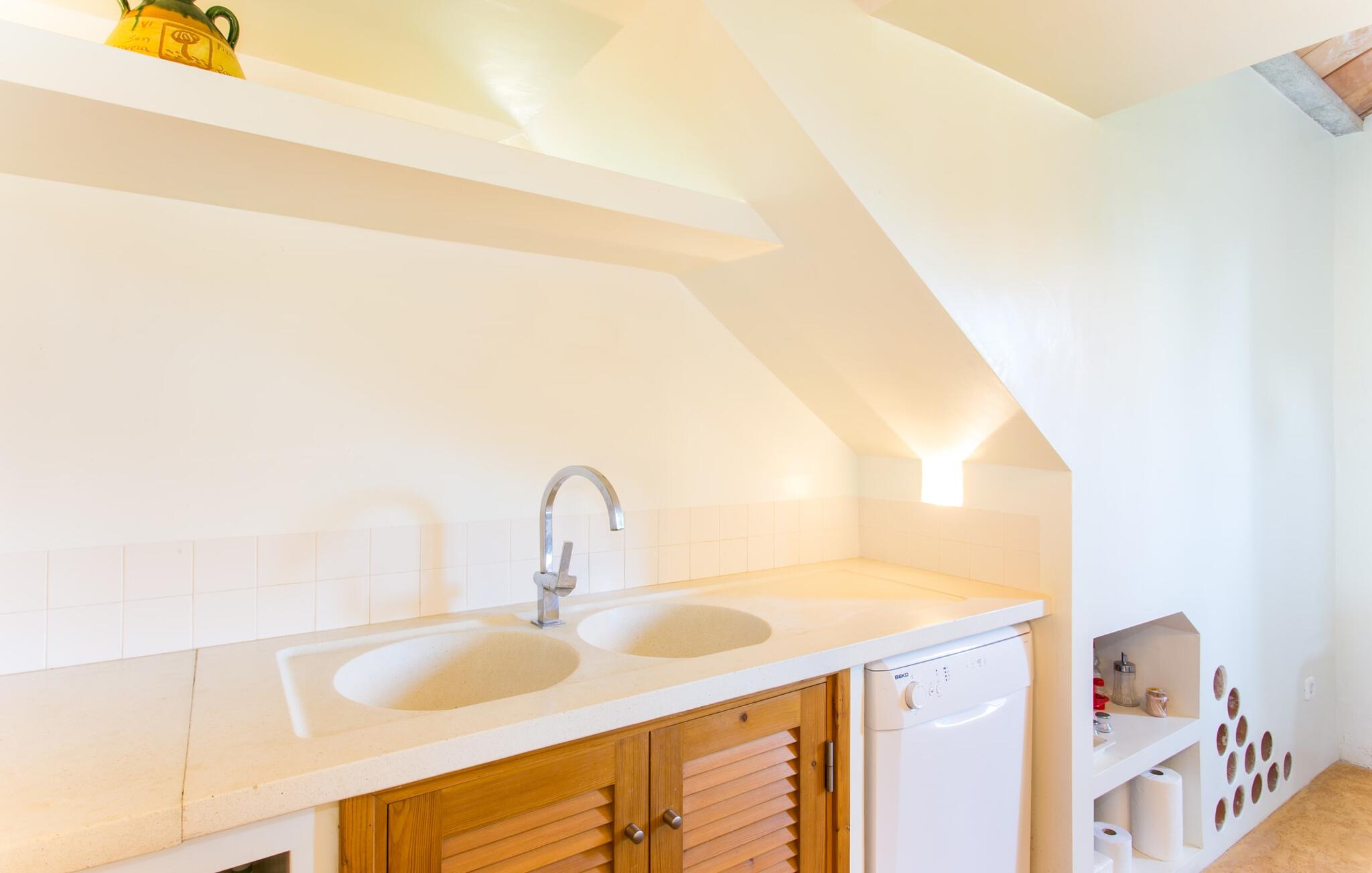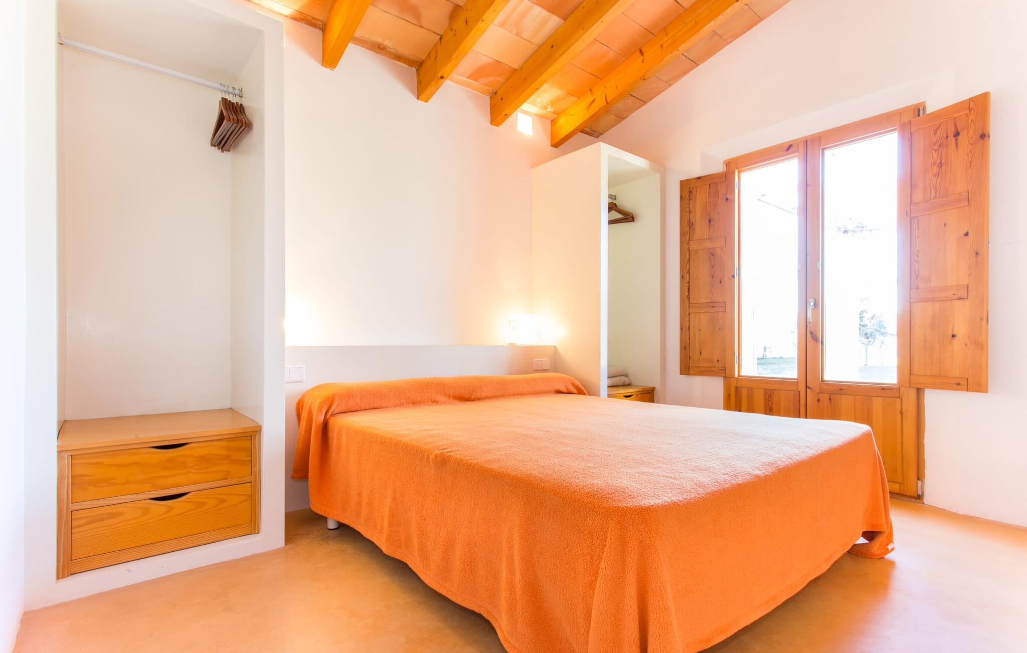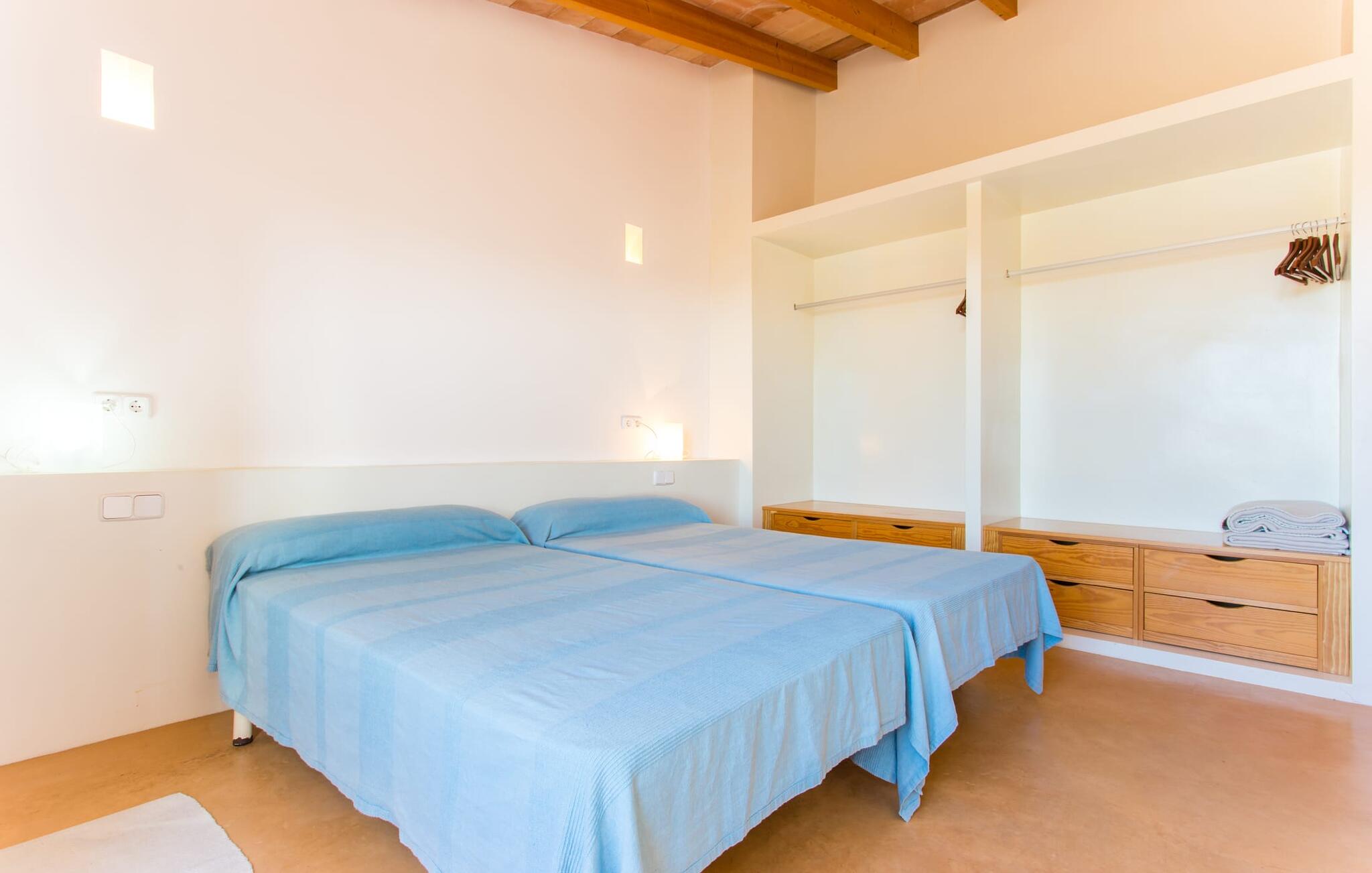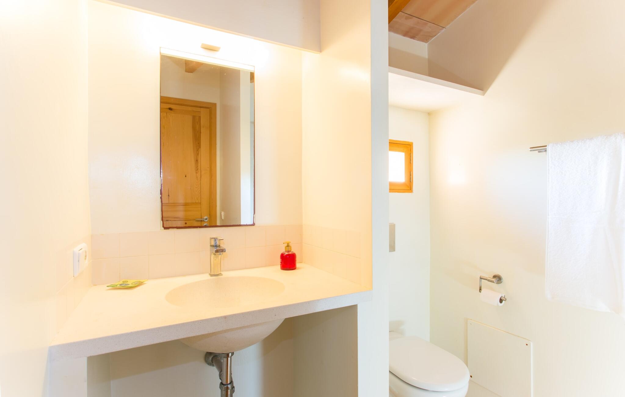 Het interieur van Villa Ses Fonolleres heeft een harmonieuze inrichting die modern en toch warm is. De villa wordt overspoeld met licht dankzij de vele ramen van vloer tot plafond en openslaande deuren naar de tuin. Vooral de ruimte op de begane grond is indrukwekkend. Hoge gewelfde plafonds benadrukken het royale gevoel van ruimte, terwijl ronde bogen de indruk geven van een vloeiende combinatie van wonen, eten en koken. In de muren ingebouwde rekken en verlichtingselementen vervullen een praktisch en esthetisch doel in de hele villa. De volledig uitgeruste keuken met kookeiland en aanrecht biedt ruimte voor iedereen om te helpen bij het bereiden van maaltijden. Als je zin hebt om te entertainen of als het weer niet meespeelt, kun je ontspannen op de bank voor de flatscreentelevisie of samen naar een spannende dvd kijken. Drie slaapkamers (1 x met tweepersoonsbed, 2 x met twee eenpersoonsbedden, veel bergruimte) bieden een rustige, vredige nachtrust. De kamers worden gekenmerkt door typische Mallorcaanse decorelementen met kalkwitte muren en traditionele houten balkenplafonds. Een van de twee badkamers met daglicht op de begane grond is apart en daarom ideaal als gastenbadkamer. Een brede trap leidt van de entree naar de bovenste verdieping. Er is een kleine galerij met een bank waar je van een boek kunt genieten. Achter de galerij ligt de derde slaapkamer met aangrenzende badkamer en directe toegang tot het balkon, dat een prachtig, vrij uitzicht biedt op het omliggende platteland.