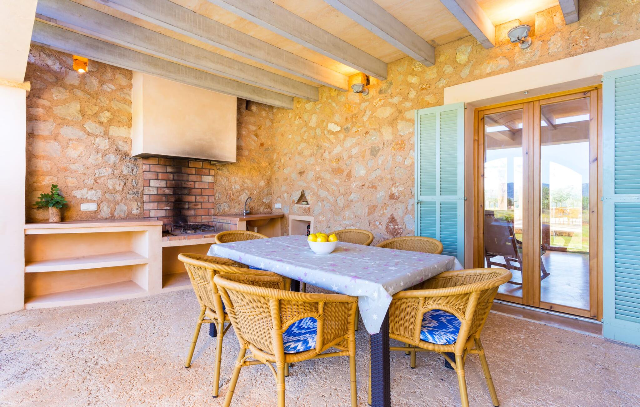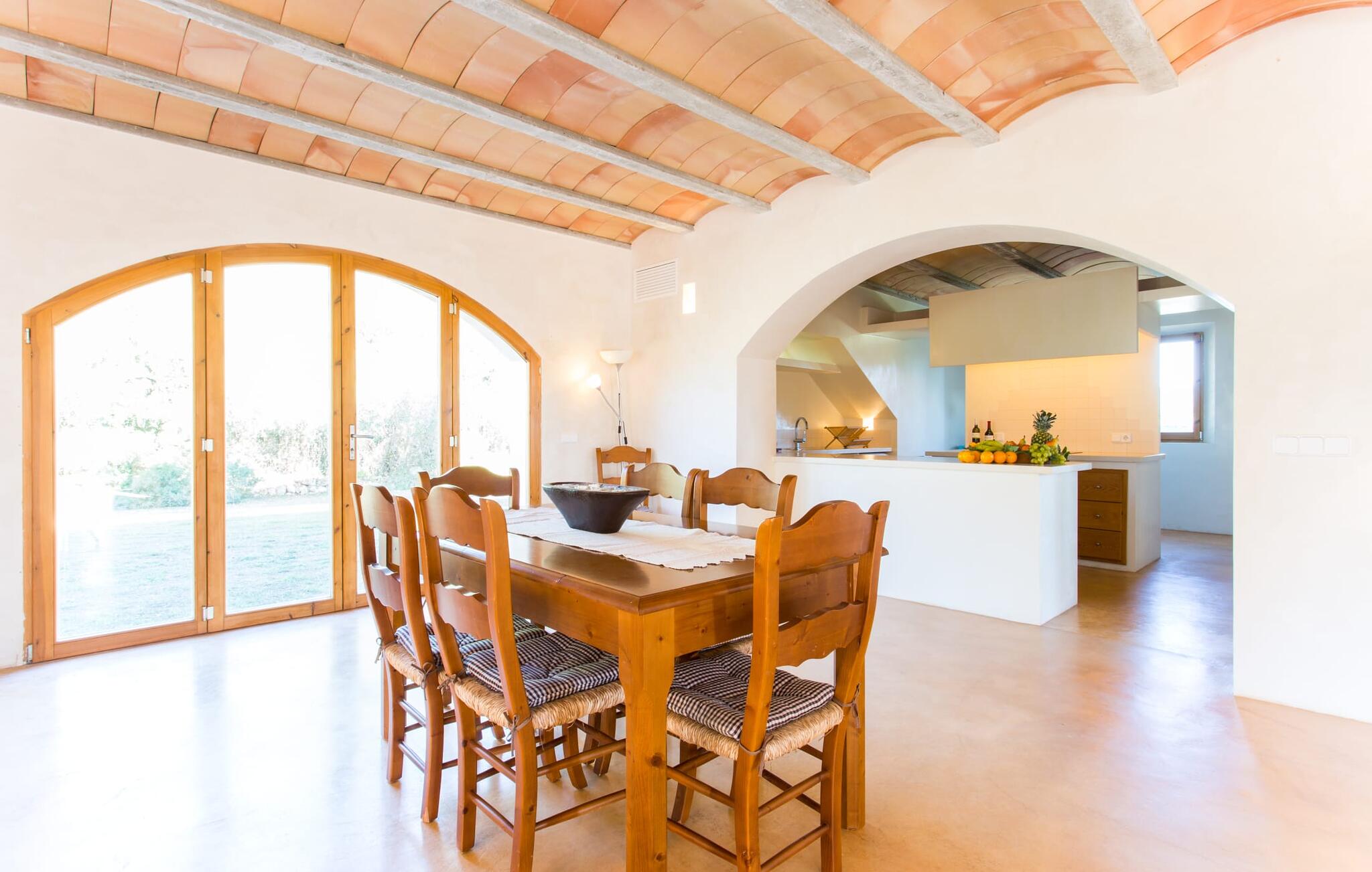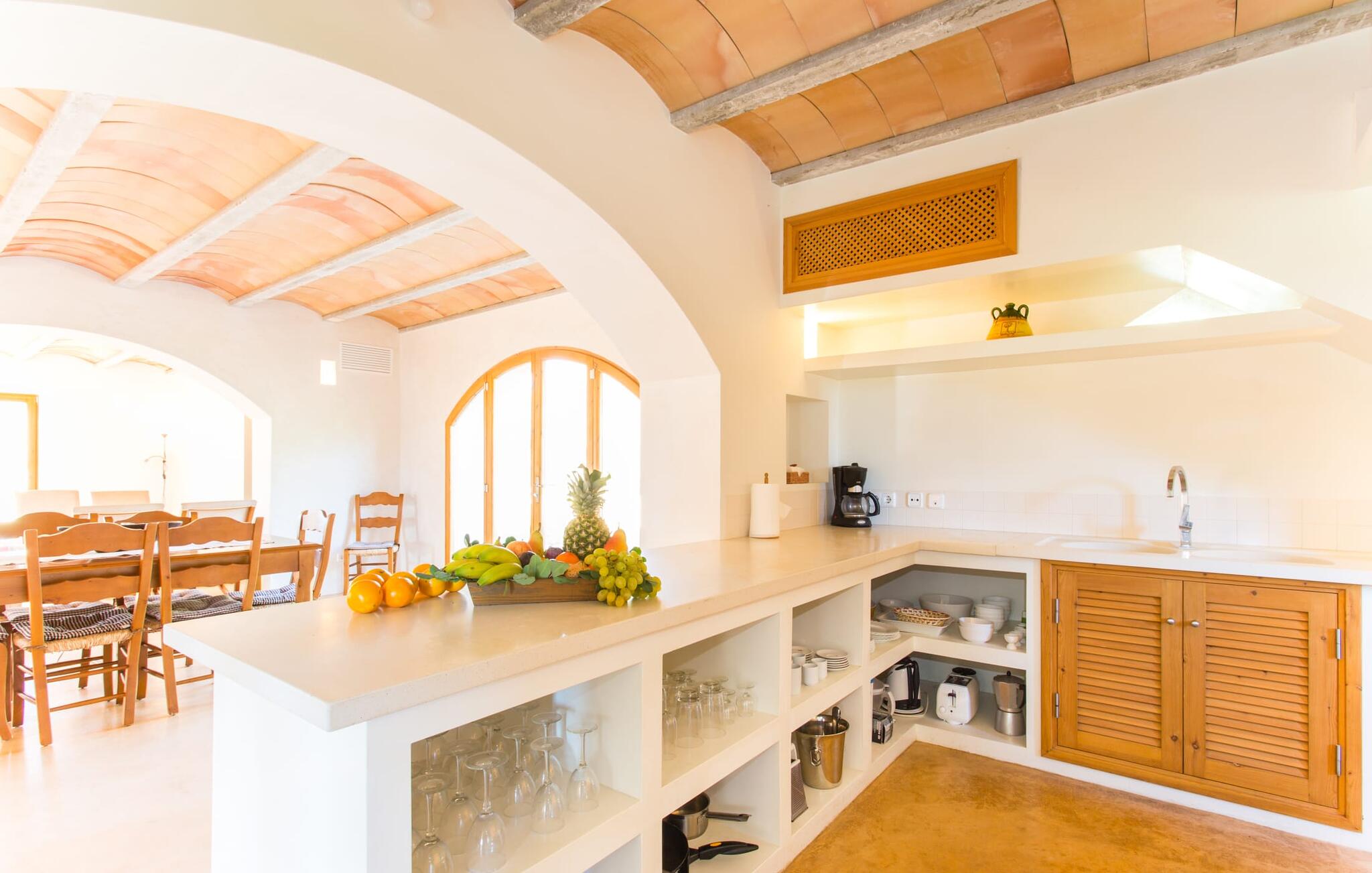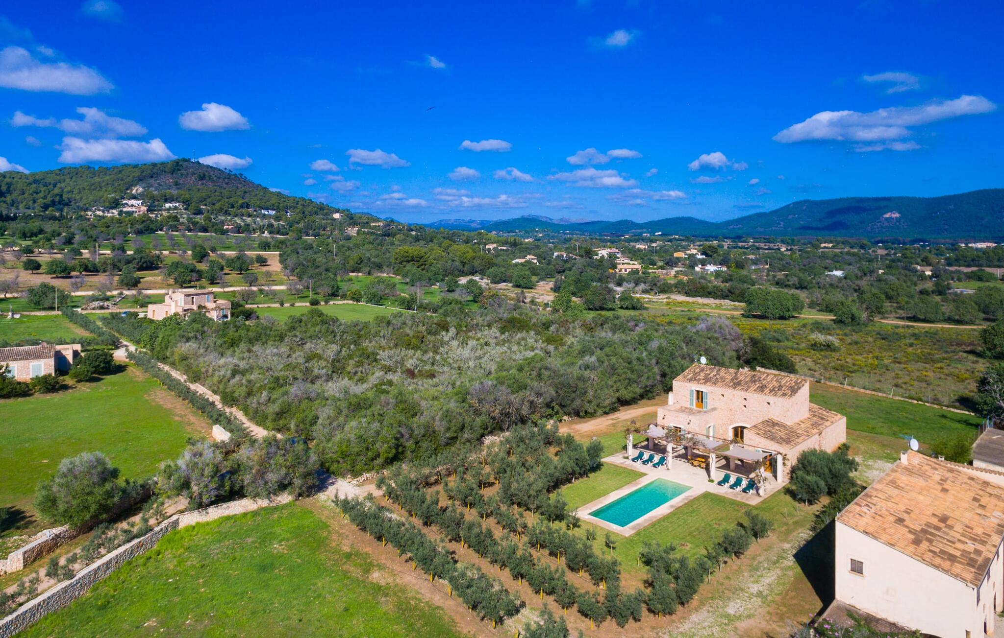 Deze moderne villa ligt schilderachtig genesteld in het groene landschap van de kustgemeente Son Servera en biedt het ideale toevluchtsoord voor vakantiegangers die op zoek zijn naar rust en ontspanning in een landelijke omgeving, maar die ook de binnenwegen willen nemen naar de prachtige badplaatsen aan de oostkust van het eiland met een breed scala aan activiteiten. Het zeer goed onderhouden landgoed is omzoomd met olijfbomen, die de mediterrane sfeer van de natuurstenen finca benadrukken. Het mooie, open gebied is ook geschikt als zonneweide waar je de zonnestralen kunt opvangen, maar het is ook een geweldige plek voor kinderen om rond te rennen. Het grote hoogtepunt van de buitenruimte is natuurlijk het glinsterende turquoise zwembad, dat perfect gelegen is op het grote zonneterras (10 m lang, toegankelijk via brede treden, maximale diepte tussen 0,60 m en 1,60 m). Hier kun je het dagelijkse leven ver achter je laten, een paar verfrissende baantjes trekken en daarna ontspannen op een van de ligstoelen bij het zwembad in de Mallorcaanse zon. Na het zwembad kun je het jezelf gemakkelijk maken op het terras onder de met wijnranken overdekte luifels en een vakantieboek lezen of een hapje eten. Aan de zijkant van het huis is er nog een halfopen terras met een eettafel en een fantastisch uitzicht op de glooiende heuvels in de verte. Naast de keuken en met een grote barbecue is dit een heerlijke plek, perfect om buiten te eten.