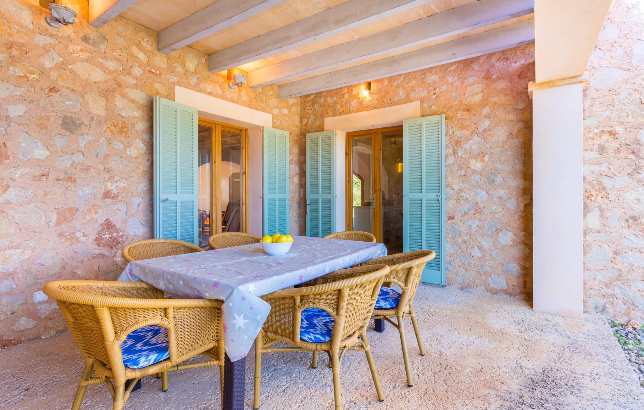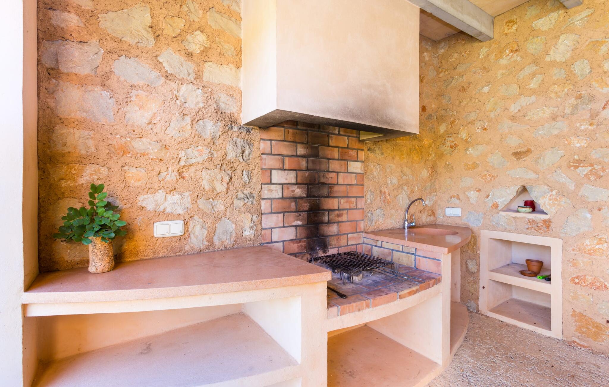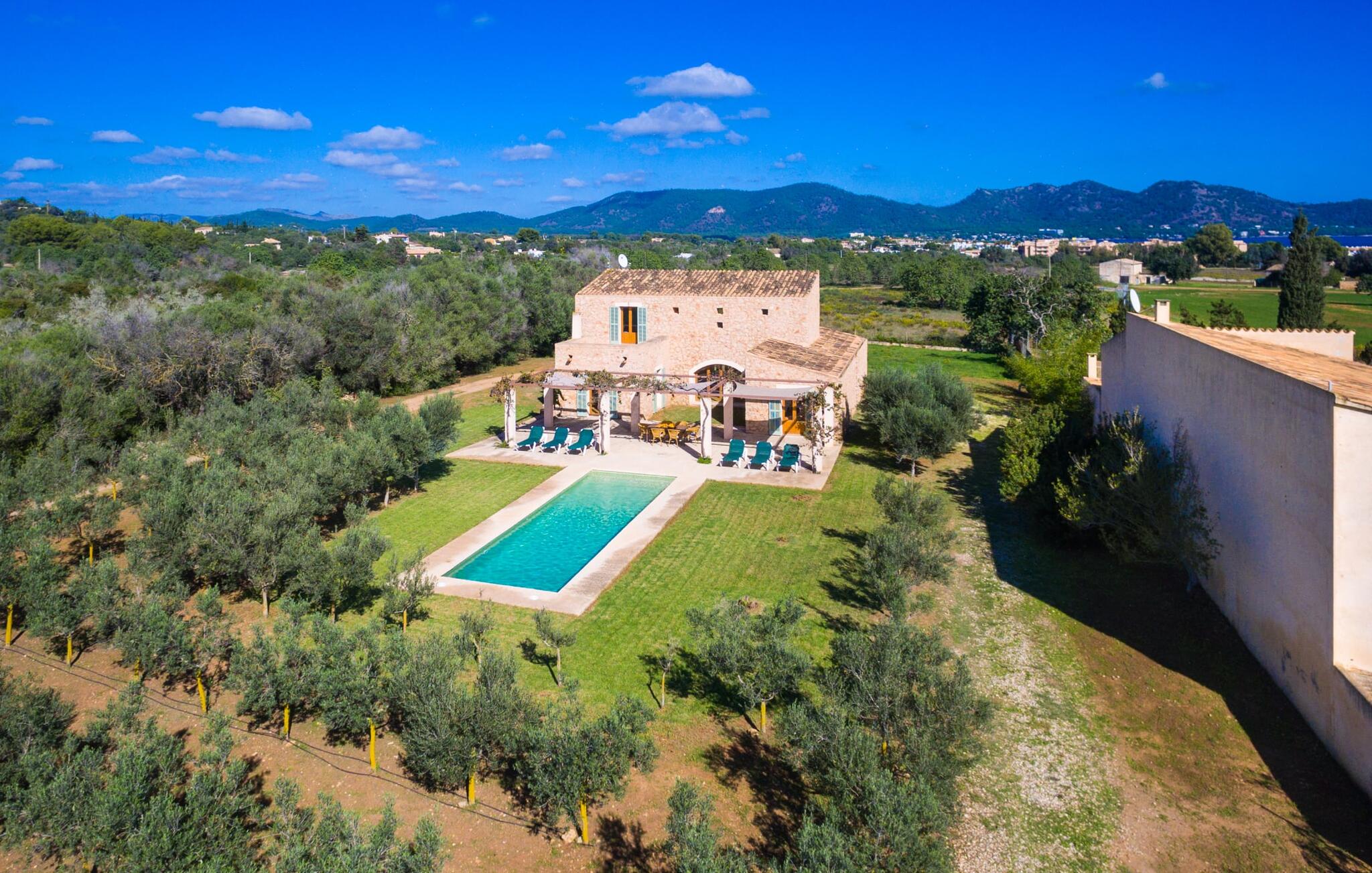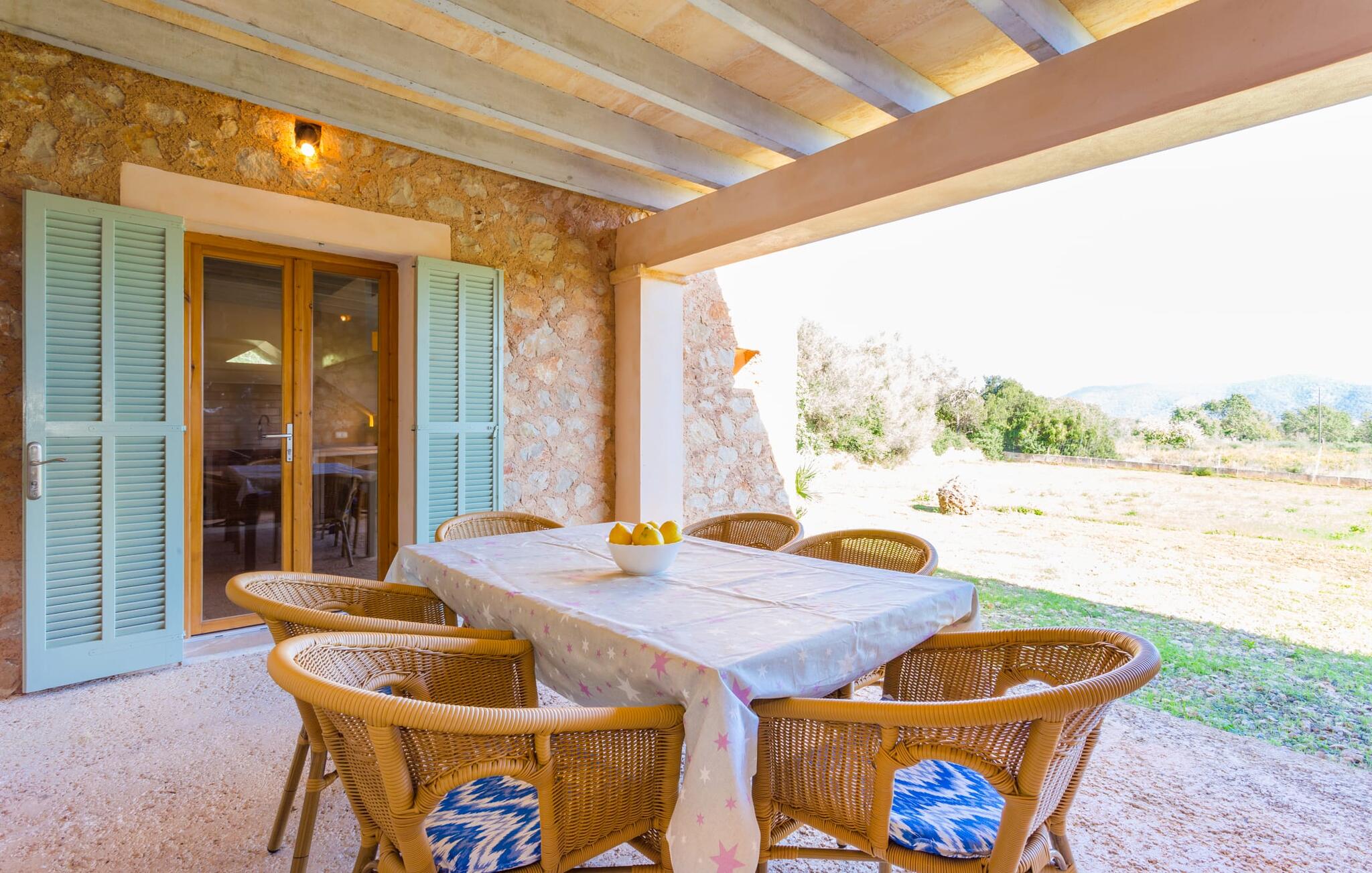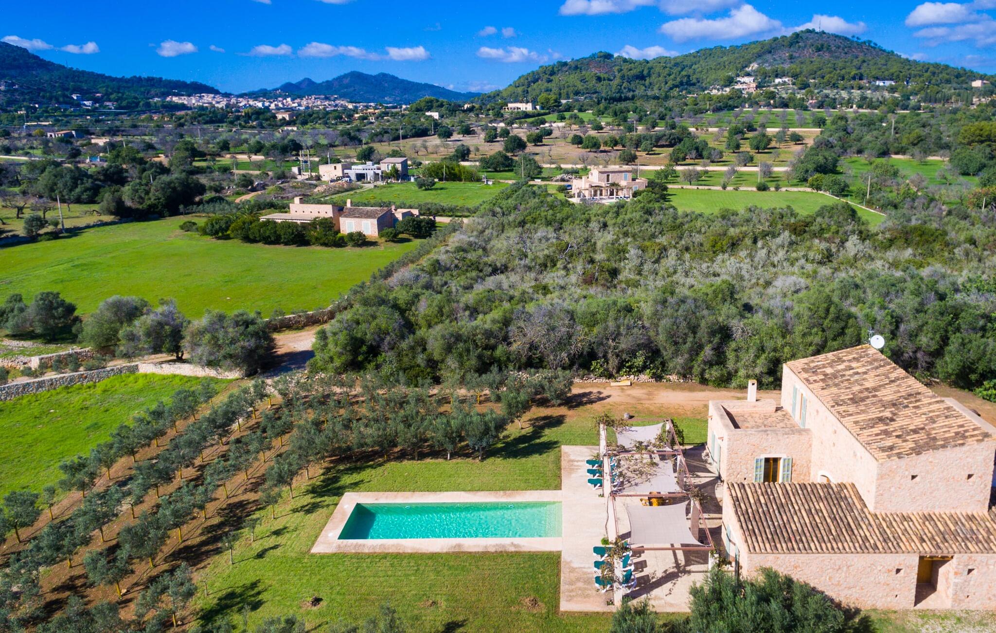 Deze moderne villa ligt schilderachtig genesteld in het groene landschap van de kustgemeente Son Servera en biedt het ideale toevluchtsoord voor vakantiegangers die op zoek zijn naar rust en ontspanning in een landelijke omgeving, maar die ook de binnenwegen willen nemen naar de prachtige badplaatsen aan de oostkust van het eiland met een breed scala aan activiteiten. Het zeer goed onderhouden landgoed is omzoomd met olijfbomen, die de mediterrane sfeer van de natuurstenen finca benadrukken. Het mooie, open gebied is ook geschikt als zonneweide waar je de zonnestralen kunt opvangen, maar het is ook een geweldige plek voor kinderen om rond te rennen. Het grote hoogtepunt van de buitenruimte is natuurlijk het glinsterende turquoise zwembad, dat perfect gelegen is op het grote zonneterras (10 m lang, toegankelijk via brede treden, maximale diepte tussen 0,60 m en 1,60 m). Hier kun je het dagelijkse leven ver achter je laten, een paar verfrissende baantjes trekken en daarna ontspannen op een van de ligstoelen bij het zwembad in de Mallorcaanse zon. Na het zwembad kun je het jezelf gemakkelijk maken op het terras onder de met wijnranken overdekte luifels en een vakantieboek lezen of een hapje eten. Aan de zijkant van het huis is er nog een halfopen terras met een eettafel en een fantastisch uitzicht op de glooiende heuvels in de verte. Naast de keuken en met een grote barbecue is dit een heerlijke plek, perfect om buiten te eten.