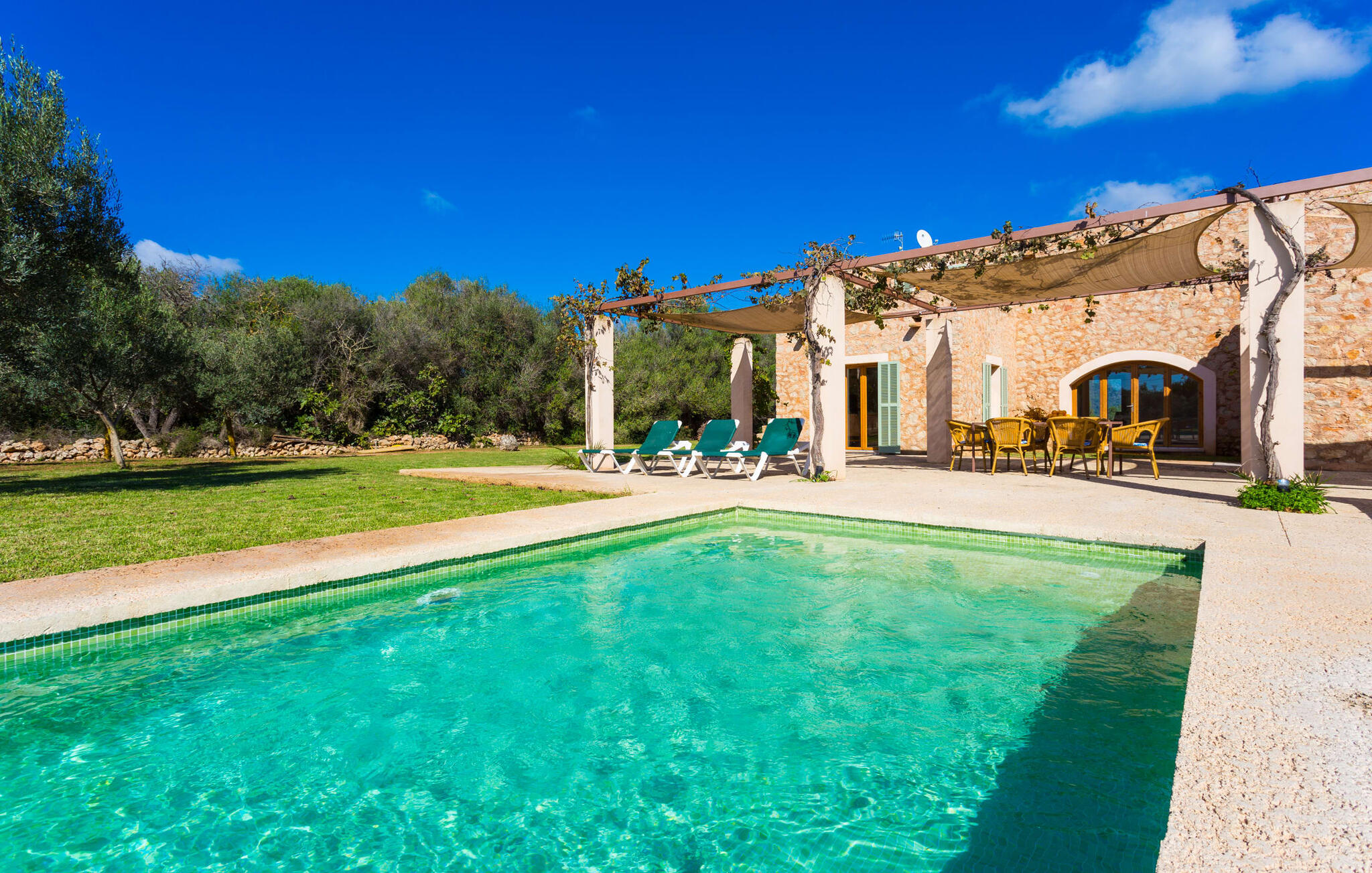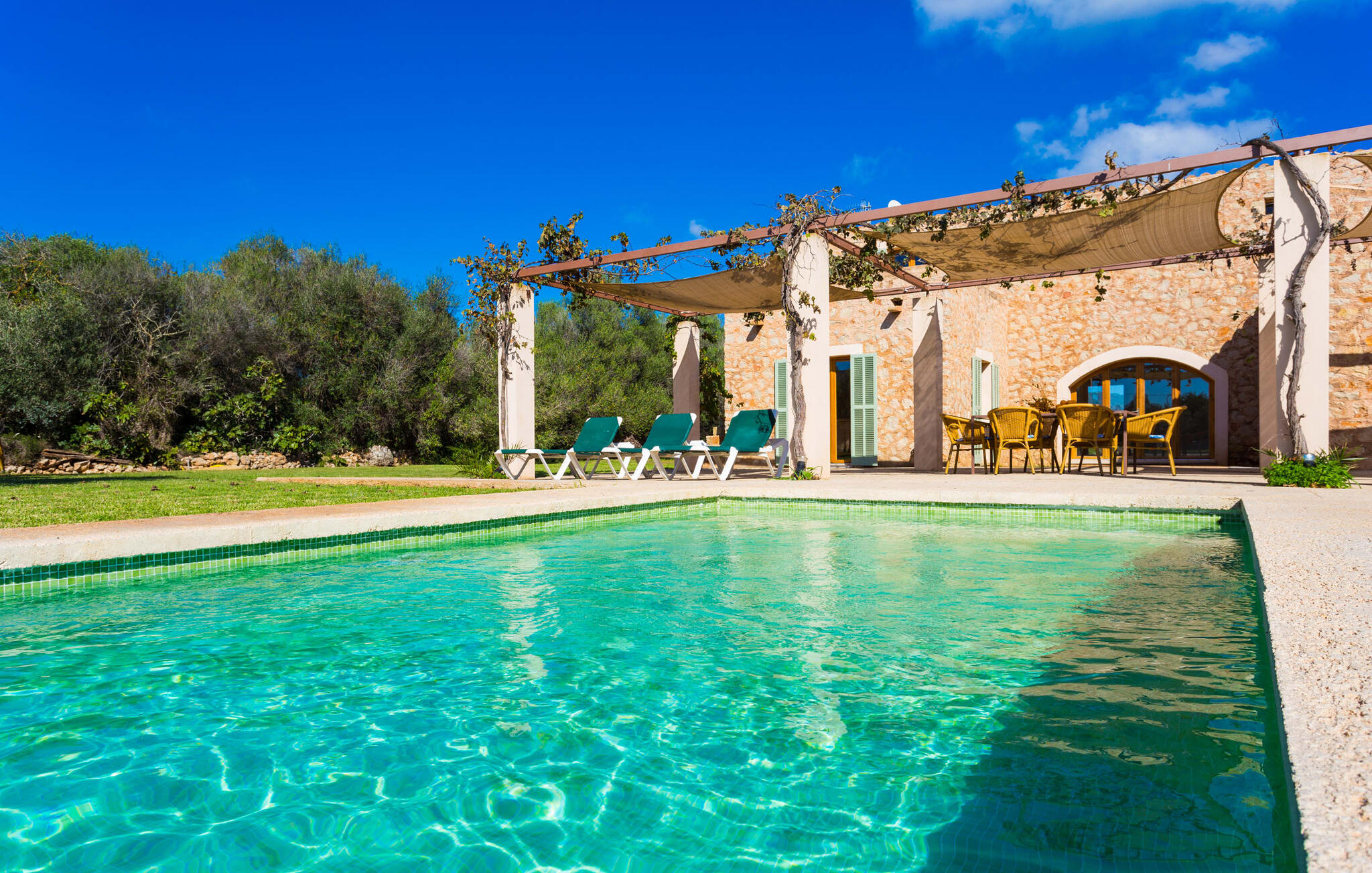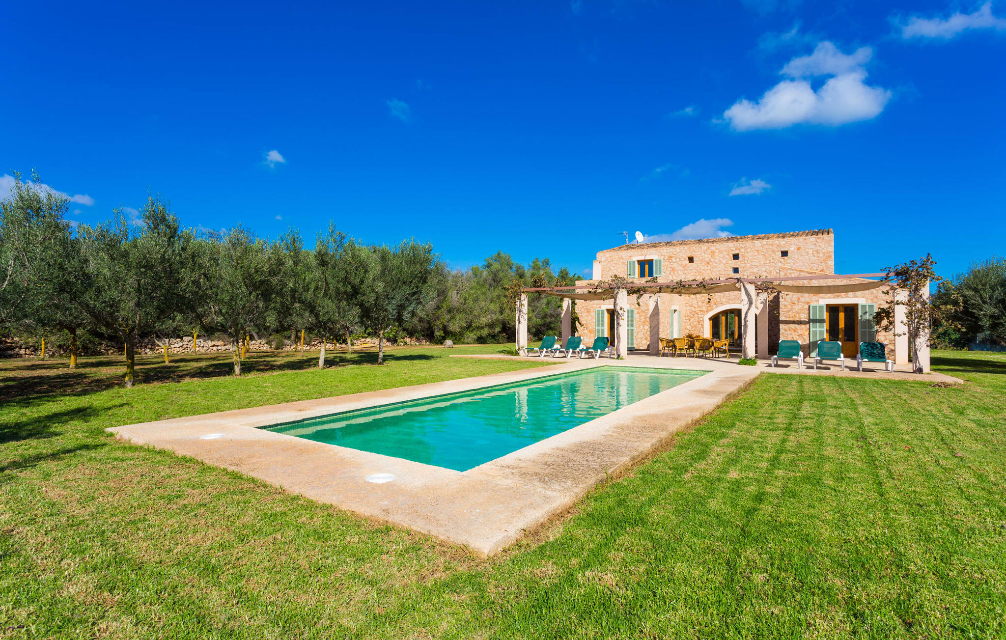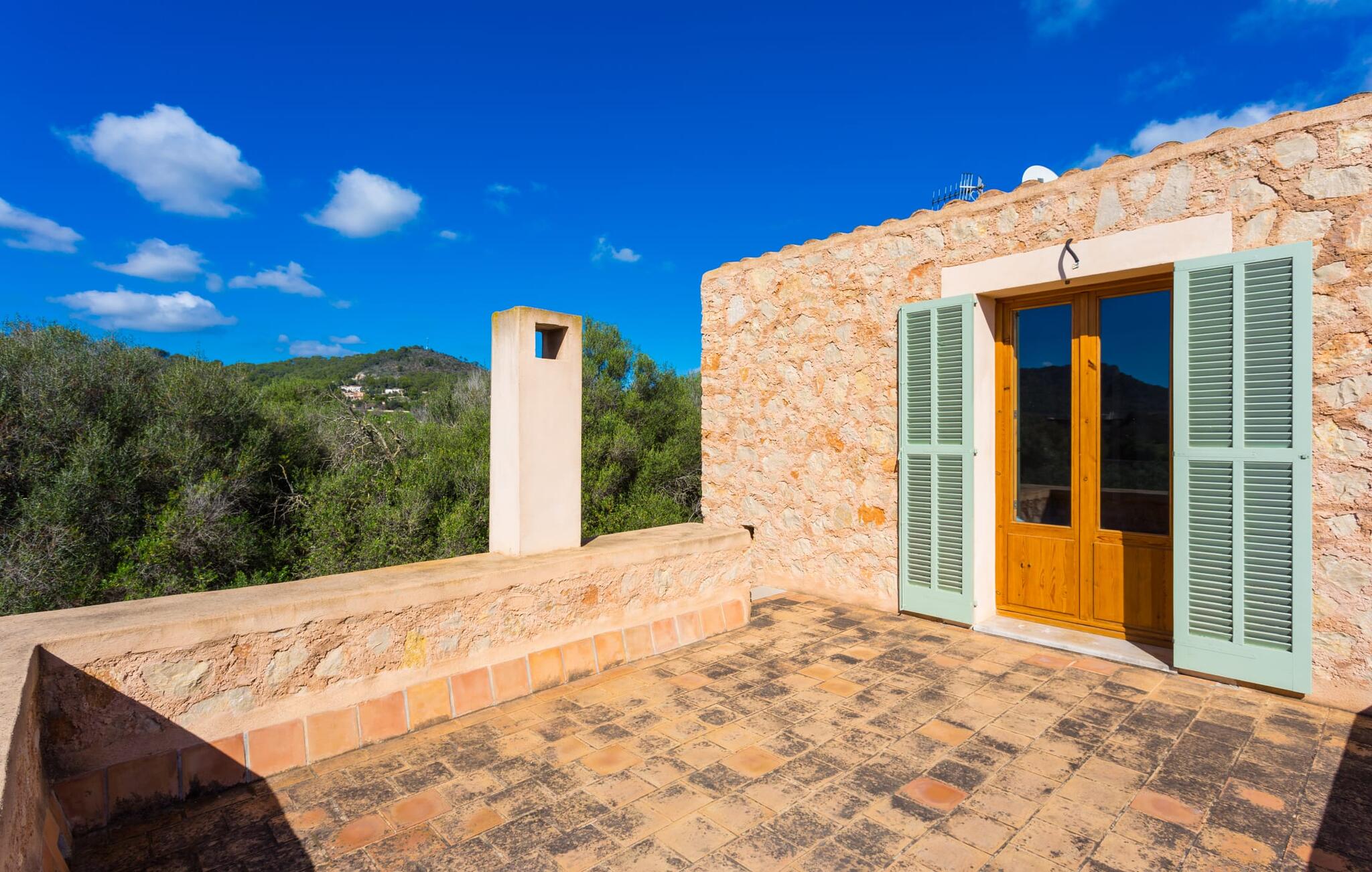 Deze moderne villa ligt schilderachtig genesteld in het groene landschap van de kustgemeente Son Servera en biedt het ideale toevluchtsoord voor vakantiegangers die op zoek zijn naar rust en ontspanning in een landelijke omgeving, maar die ook de binnenwegen willen nemen naar de prachtige badplaatsen aan de oostkust van het eiland met een breed scala aan activiteiten. Het zeer goed onderhouden landgoed is omzoomd met olijfbomen, die de mediterrane sfeer van de natuurstenen finca benadrukken. Het mooie, open gebied is ook geschikt als zonneweide waar je de zonnestralen kunt opvangen, maar het is ook een geweldige plek voor kinderen om rond te rennen. Het grote hoogtepunt van de buitenruimte is natuurlijk het glinsterende turquoise zwembad, dat perfect gelegen is op het grote zonneterras (10 m lang, toegankelijk via brede treden, maximale diepte tussen 0,60 m en 1,60 m). Hier kun je het dagelijkse leven ver achter je laten, een paar verfrissende baantjes trekken en daarna ontspannen op een van de ligstoelen bij het zwembad in de Mallorcaanse zon. Na het zwembad kun je het jezelf gemakkelijk maken op het terras onder de met wijnranken overdekte luifels en een vakantieboek lezen of een hapje eten. Aan de zijkant van het huis is er nog een halfopen terras met een eettafel en een fantastisch uitzicht op de glooiende heuvels in de verte. Naast de keuken en met een grote barbecue is dit een heerlijke plek, perfect om buiten te eten.