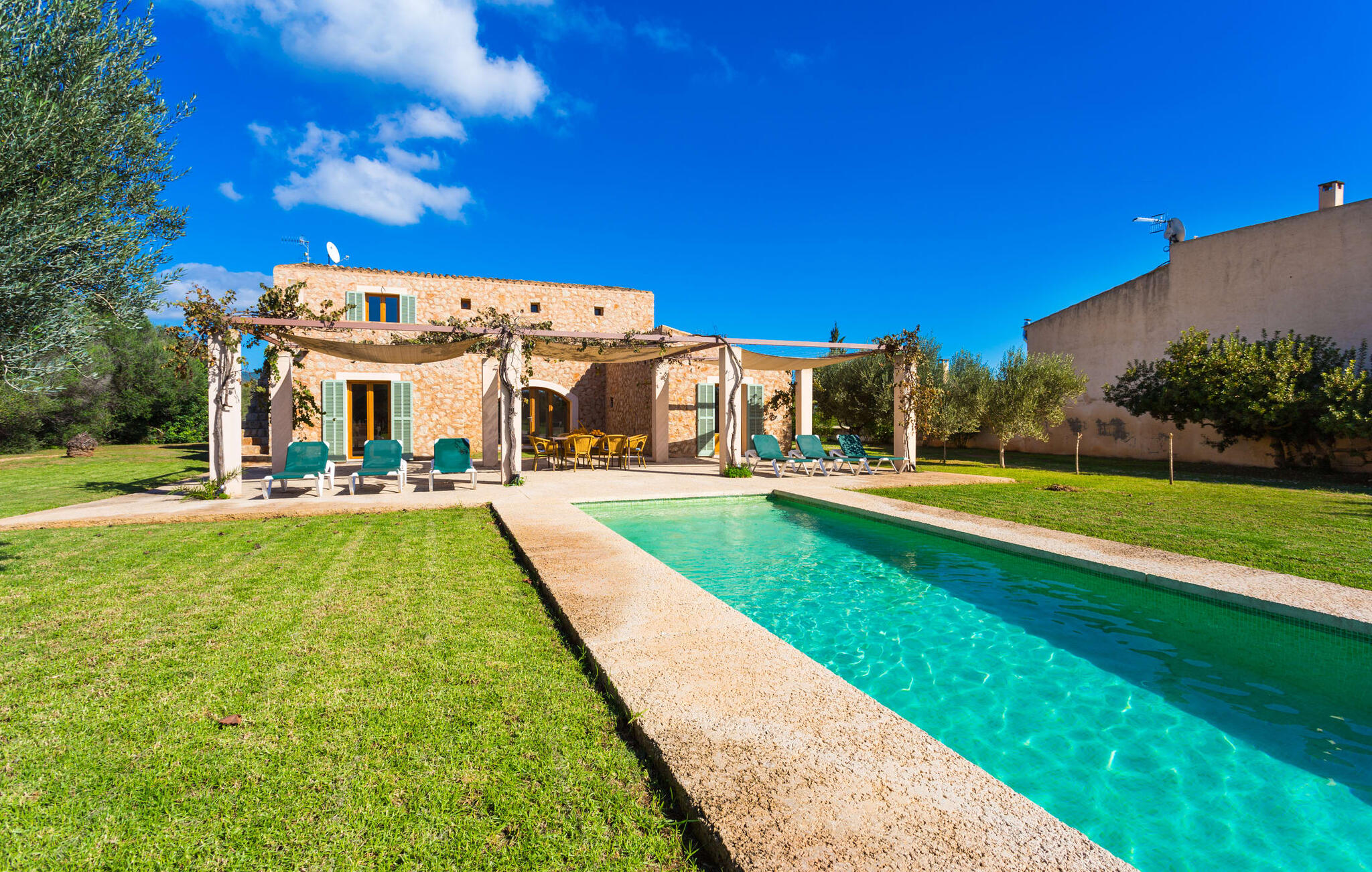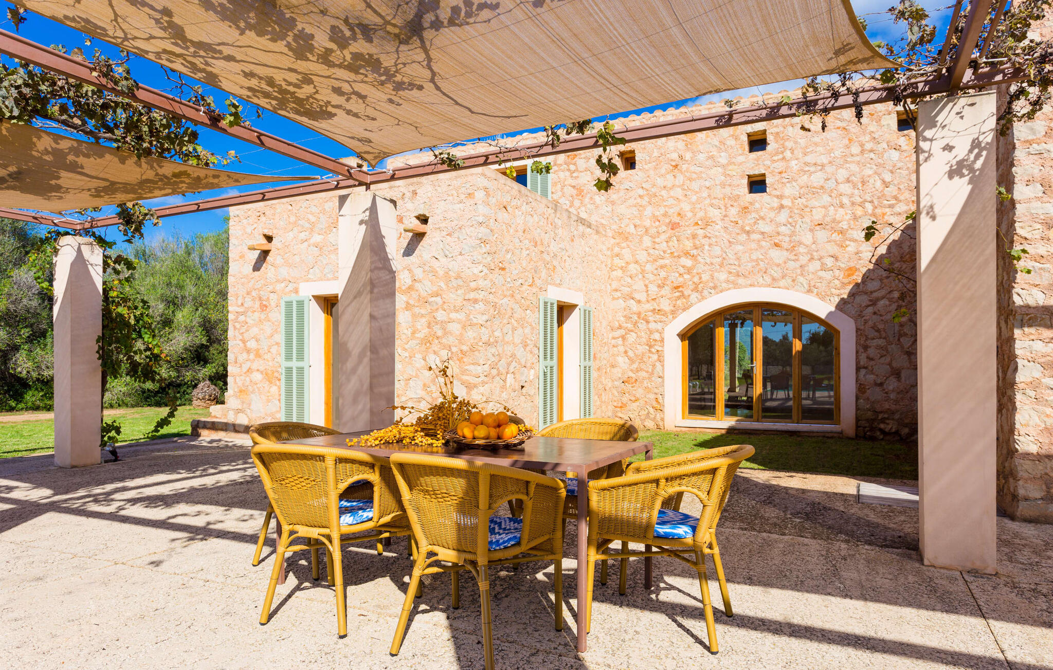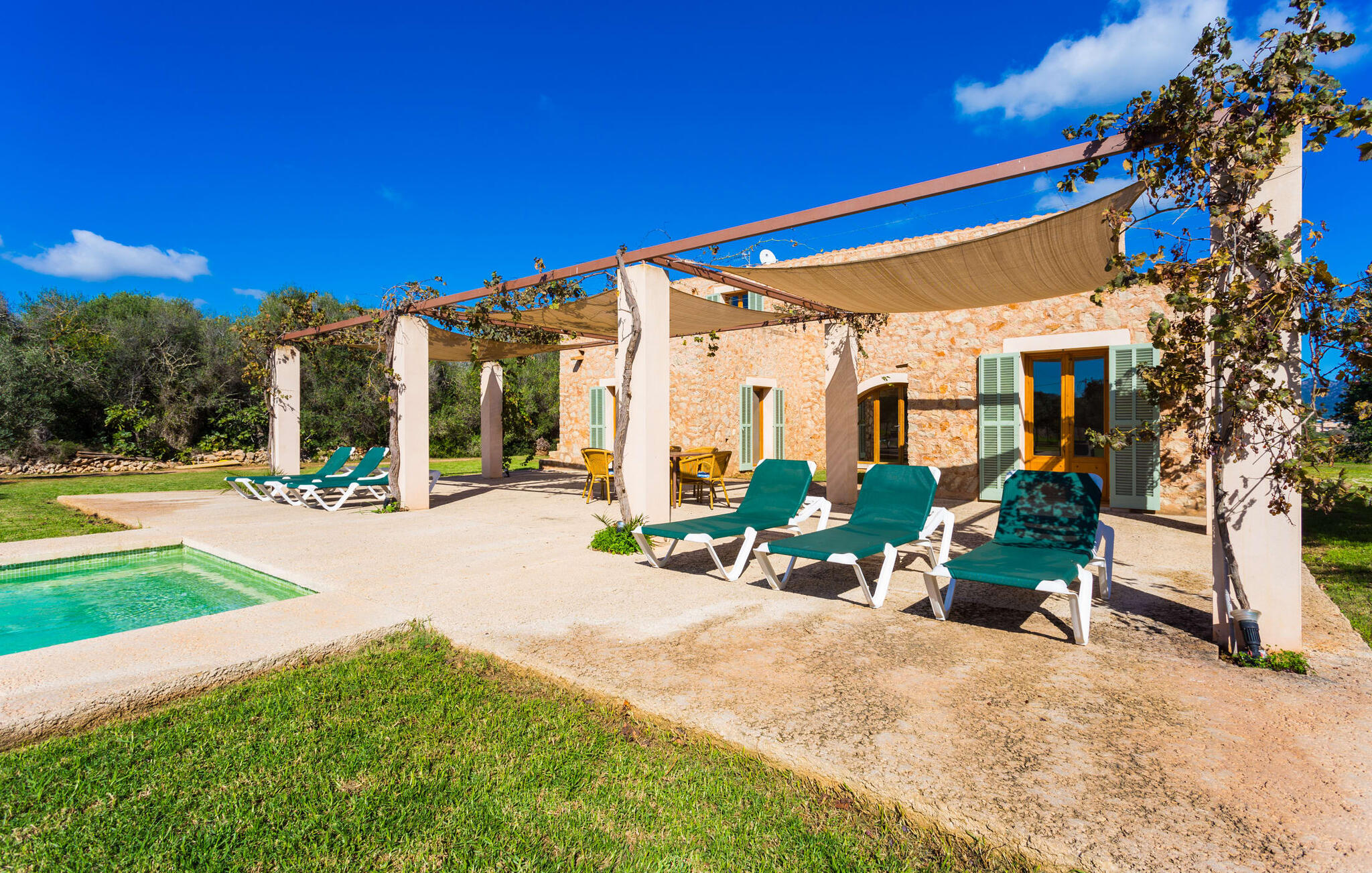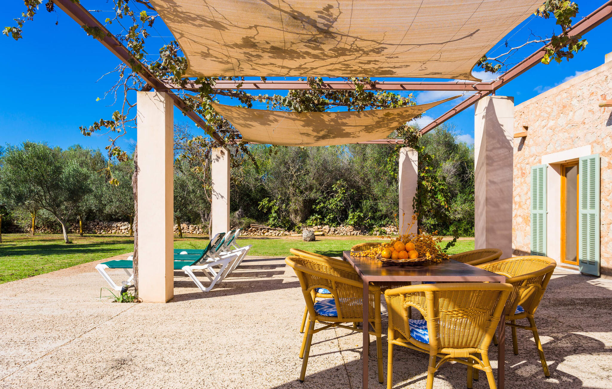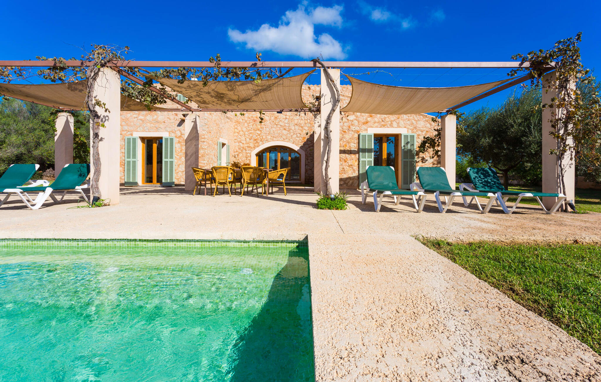Deze moderne villa ligt schilderachtig genesteld in het groene landschap van de kustgemeente Son Servera en biedt het ideale toevluchtsoord voor vakantiegangers die op zoek zijn naar rust en ontspanning in een landelijke omgeving, maar die ook de binnenwegen willen nemen naar de prachtige badplaatsen aan de oostkust van het eiland met een breed scala aan activiteiten. Het zeer goed onderhouden landgoed is omzoomd met olijfbomen, die de mediterrane sfeer van de natuurstenen finca benadrukken. Het mooie, open gebied is ook geschikt als zonneweide waar je de zonnestralen kunt opvangen, maar het is ook een geweldige plek voor kinderen om rond te rennen. Het grote hoogtepunt van de buitenruimte is natuurlijk het glinsterende turquoise zwembad, dat perfect gelegen is op het grote zonneterras (10 m lang, toegankelijk via brede treden, maximale diepte tussen 0,60 m en 1,60 m). Hier kun je het dagelijkse leven ver achter je laten, een paar verfrissende baantjes trekken en daarna ontspannen op een van de ligstoelen bij het zwembad in de Mallorcaanse zon. Na het zwembad kun je het jezelf gemakkelijk maken op het terras onder de met wijnranken overdekte luifels en een vakantieboek lezen of een hapje eten. Aan de zijkant van het huis is er nog een halfopen terras met een eettafel en een fantastisch uitzicht op de glooiende heuvels in de verte. Naast de keuken en met een grote barbecue is dit een heerlijke plek, perfect om buiten te eten.