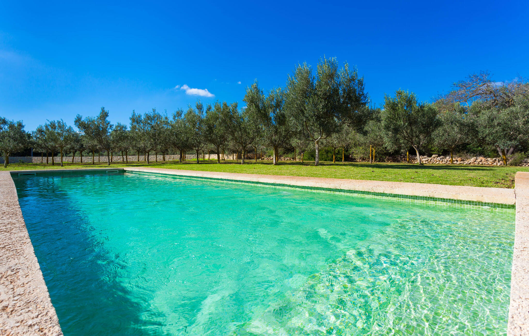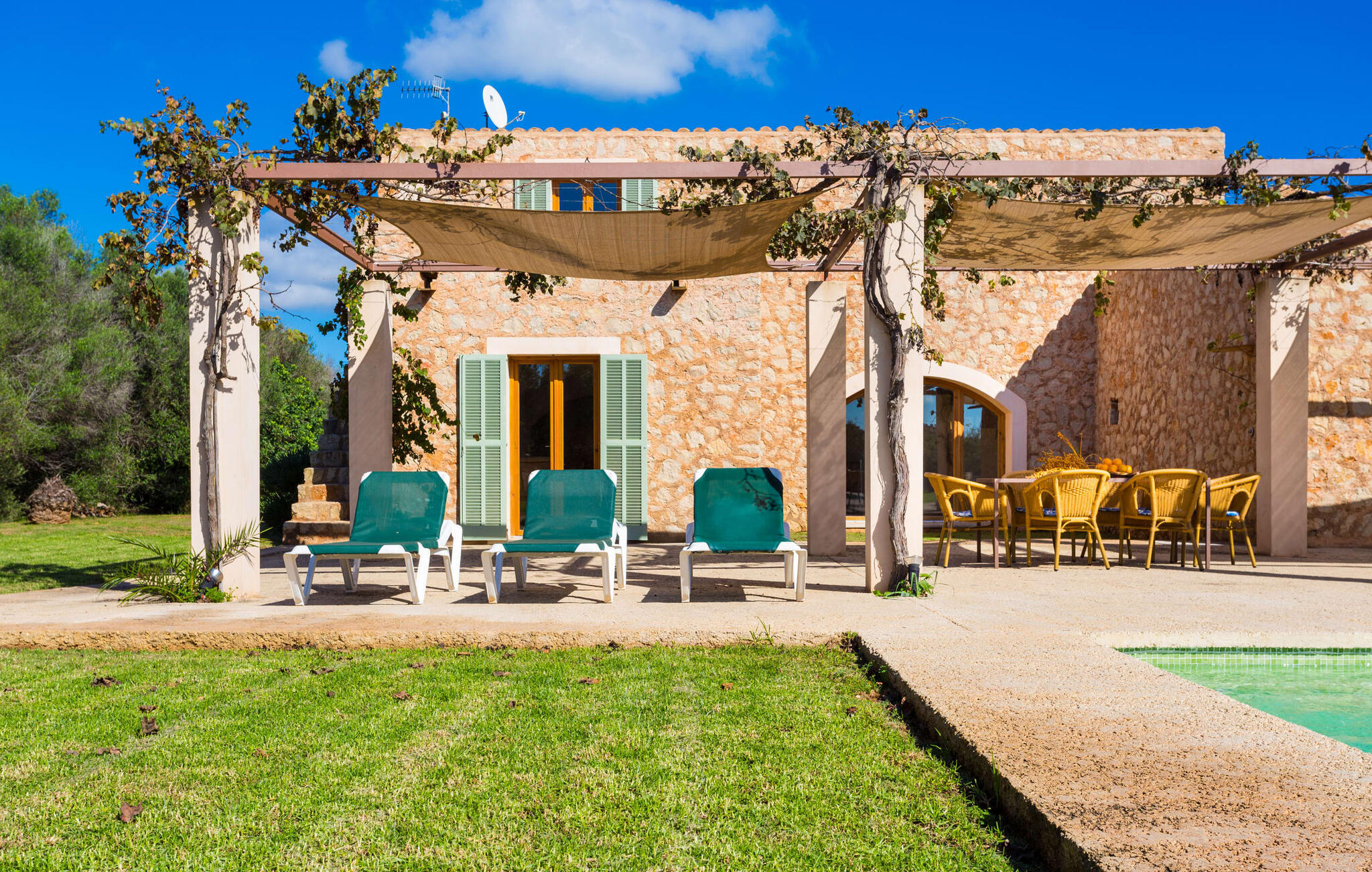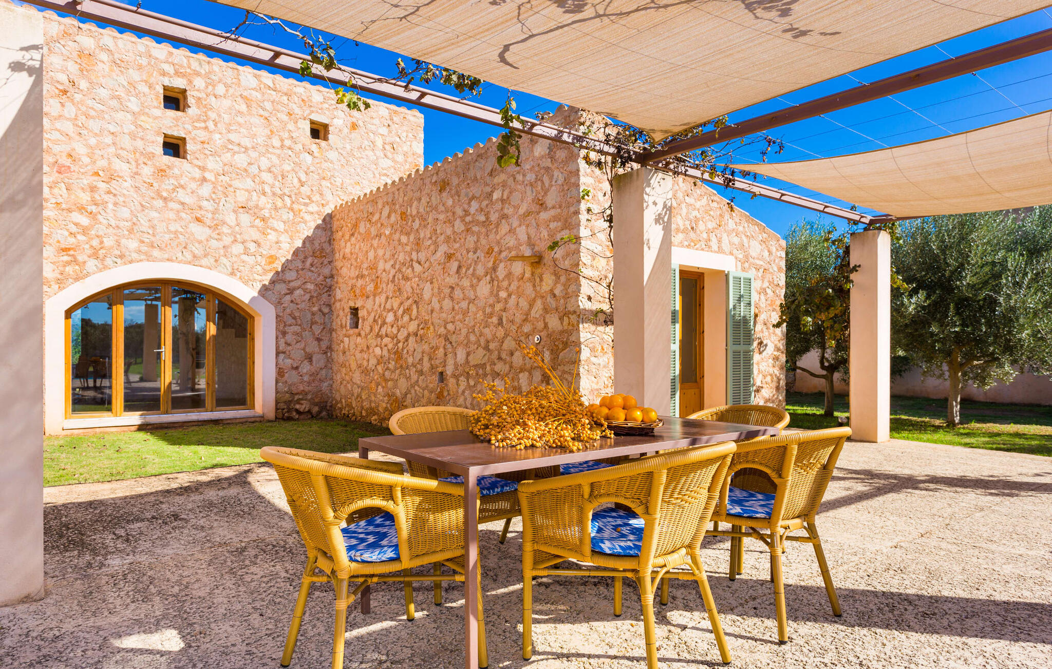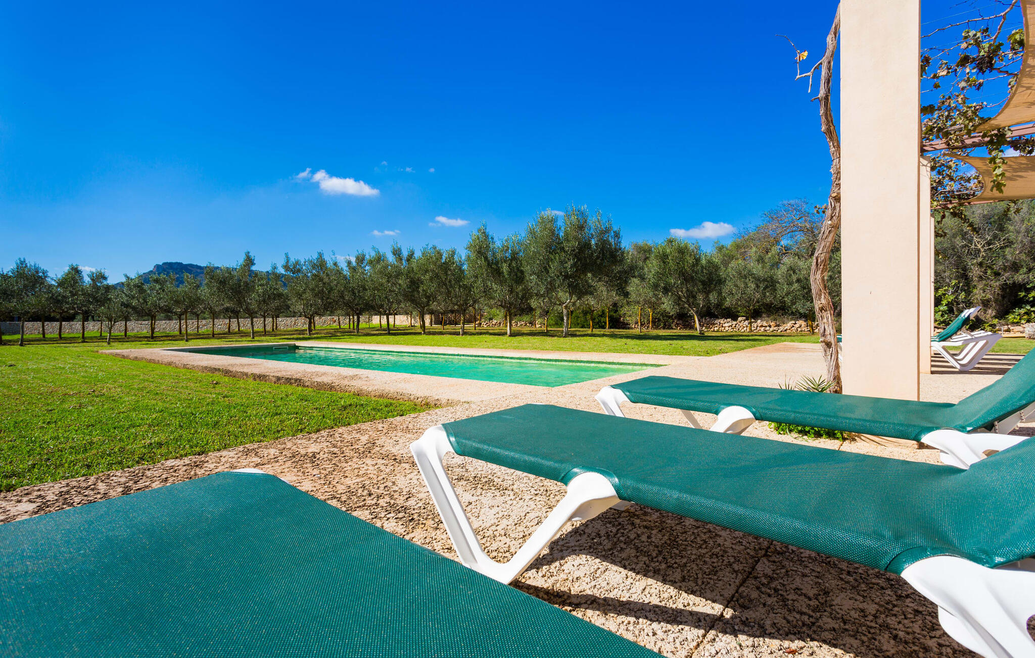Deze moderne villa ligt schilderachtig genesteld in het groene landschap van de kustgemeente Son Servera en biedt het ideale toevluchtsoord voor vakantiegangers die op zoek zijn naar rust en ontspanning in een landelijke omgeving, maar die ook de binnenwegen willen nemen naar de prachtige badplaatsen aan de oostkust van het eiland met een breed scala aan activiteiten. Het zeer goed onderhouden landgoed is omzoomd met olijfbomen, die de mediterrane sfeer van de natuurstenen finca benadrukken. Het mooie, open gebied is ook geschikt als zonneweide waar je de zonnestralen kunt opvangen, maar het is ook een geweldige plek voor kinderen om rond te rennen. Het grote hoogtepunt van de buitenruimte is natuurlijk het glinsterende turquoise zwembad, dat perfect gelegen is op het grote zonneterras (10 m lang, toegankelijk via brede treden, maximale diepte tussen 0,60 m en 1,60 m). Hier kun je het dagelijkse leven ver achter je laten, een paar verfrissende baantjes trekken en daarna ontspannen op een van de ligstoelen bij het zwembad in de Mallorcaanse zon. Na het zwembad kun je het jezelf gemakkelijk maken op het terras onder de met wijnranken overdekte luifels en een vakantieboek lezen of een hapje eten. Aan de zijkant van het huis is er nog een halfopen terras met een eettafel en een fantastisch uitzicht op de glooiende heuvels in de verte. Naast de keuken en met een grote barbecue is dit een heerlijke plek, perfect om buiten te eten.