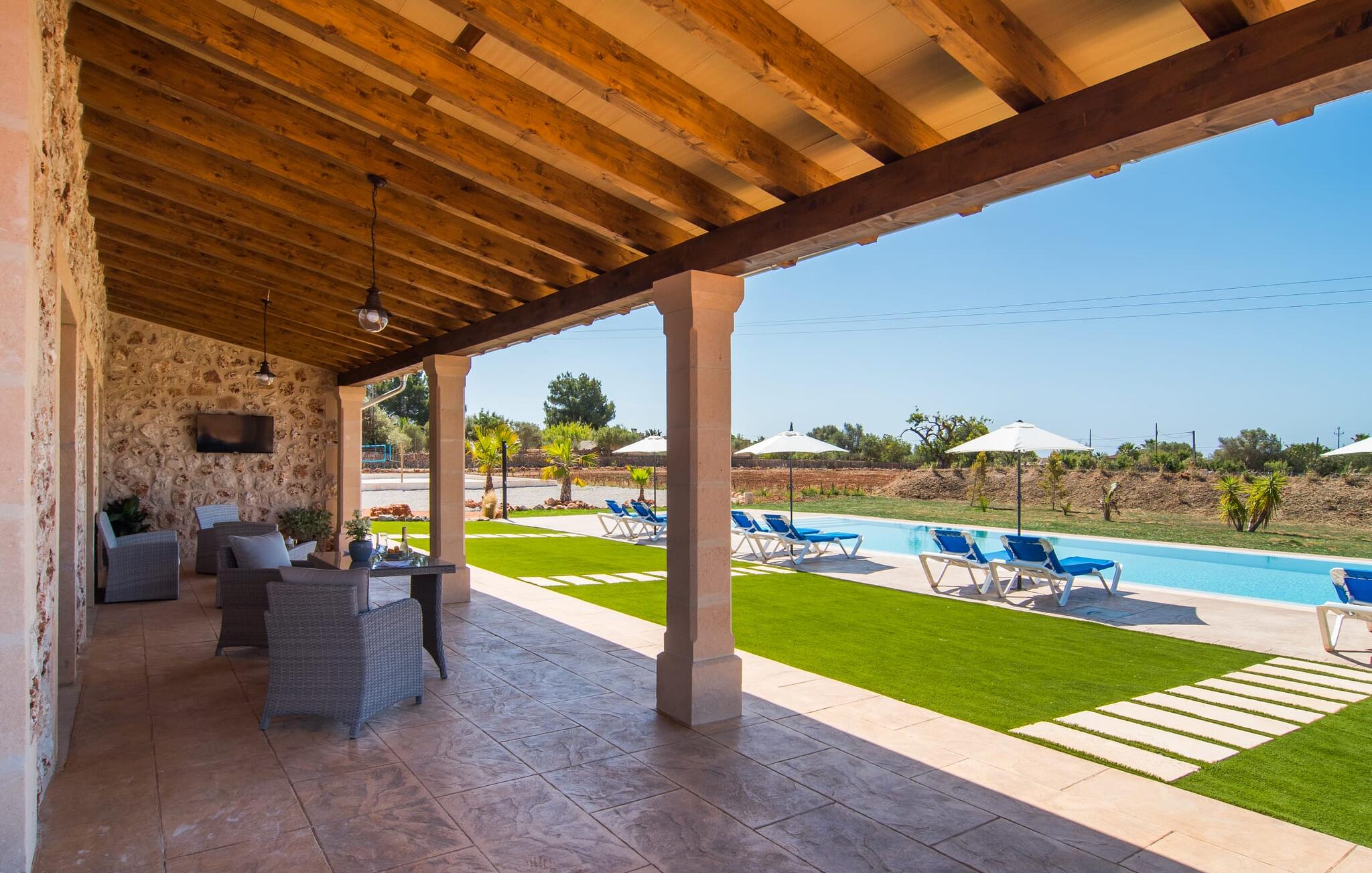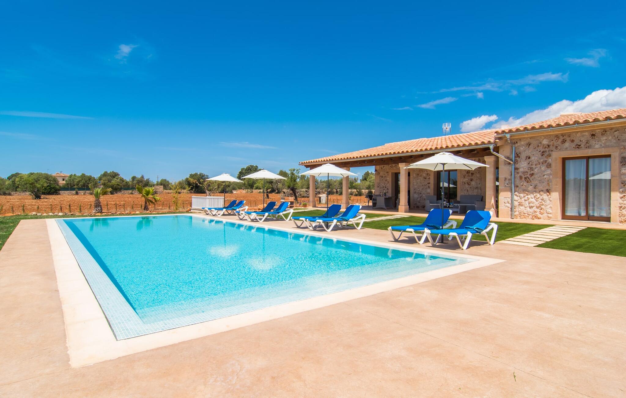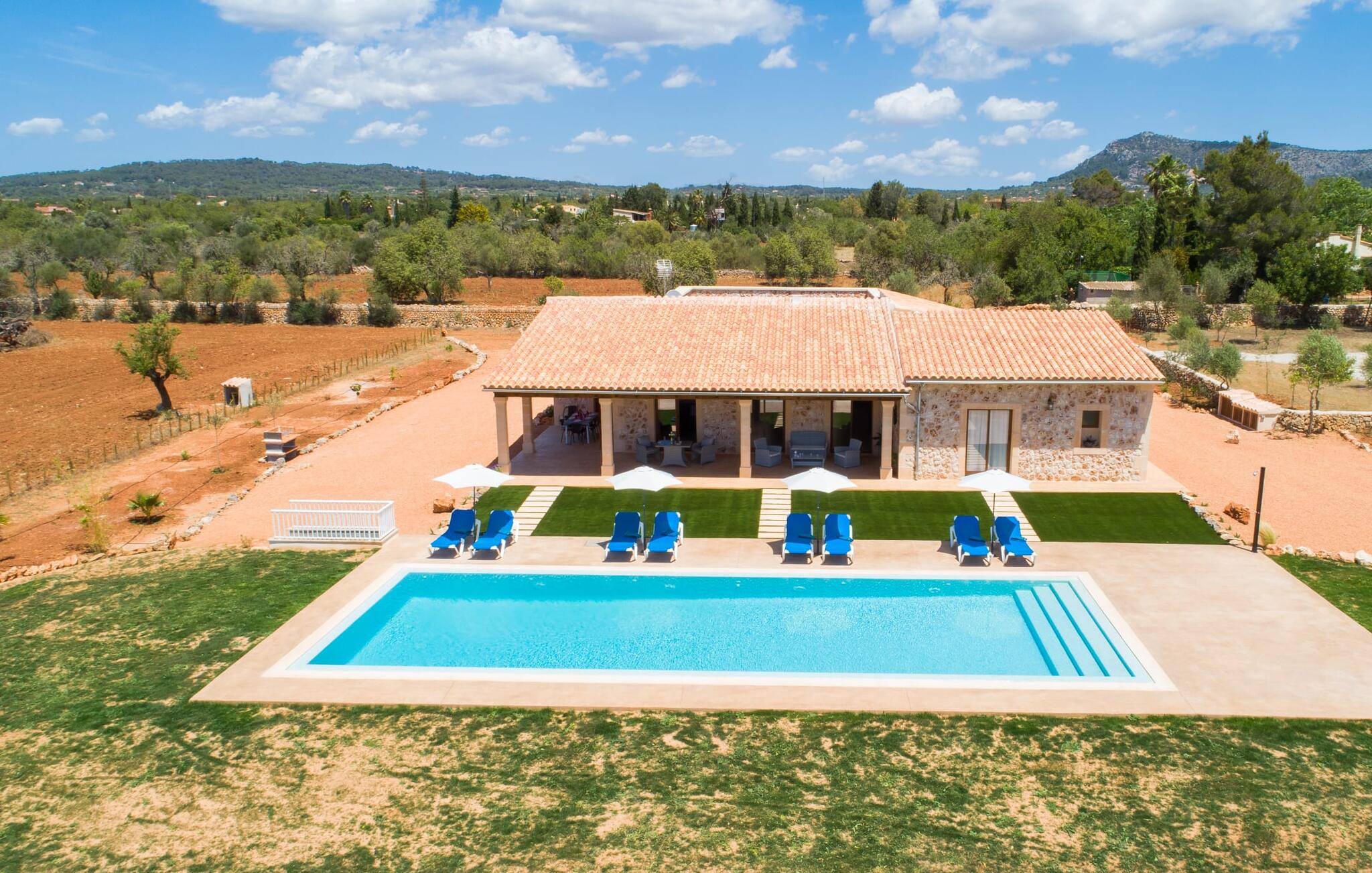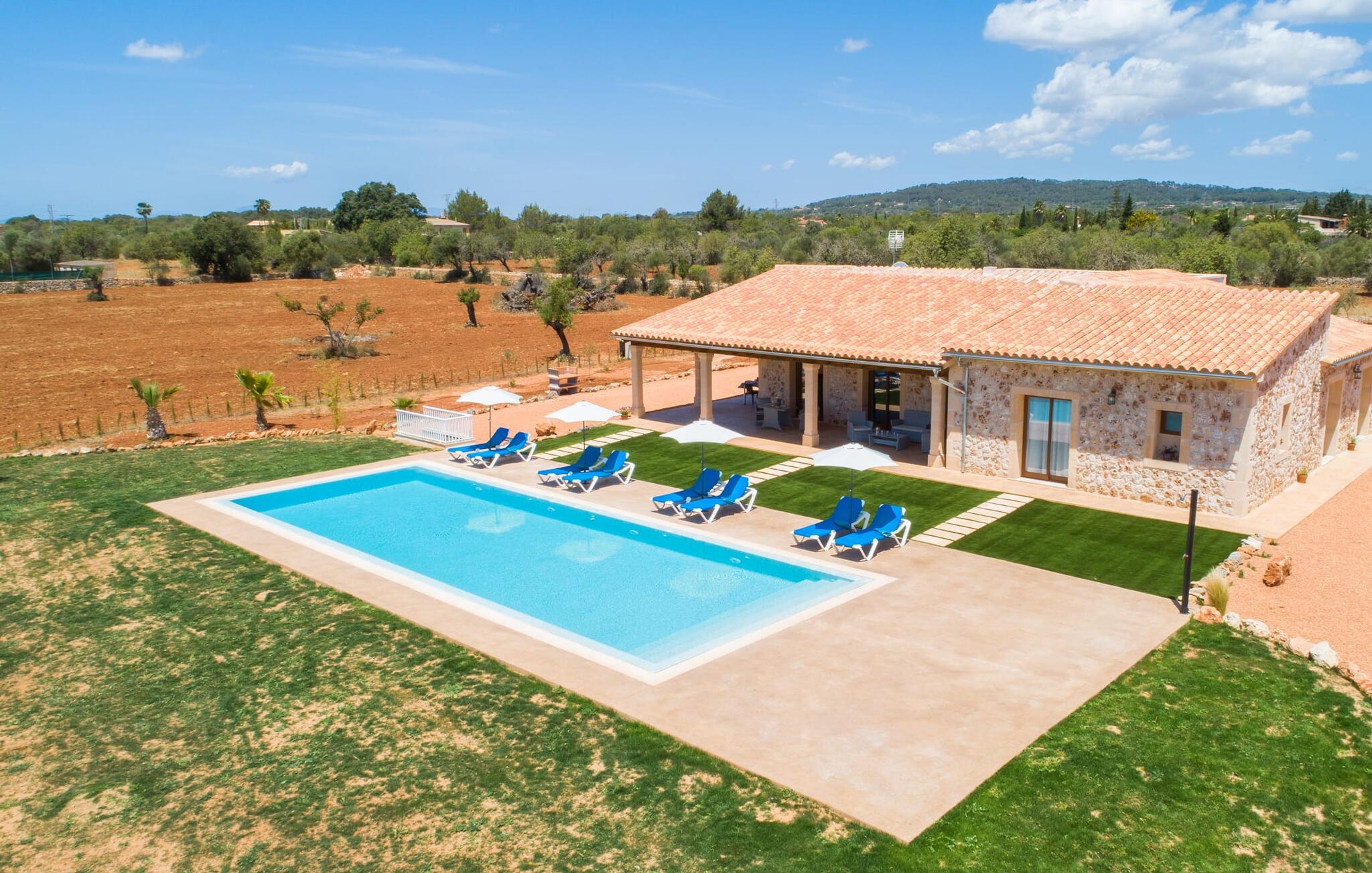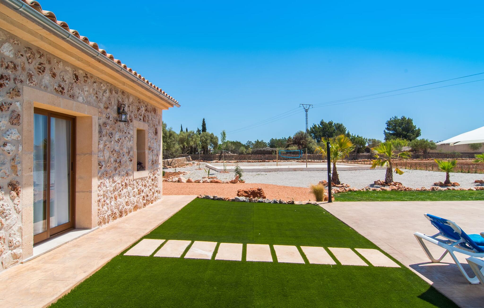 Heerlijk comfortabel en op een geweldige afgelegen locatie omgeven door groen: Villa Son Pieras Nou ligt op slechts een paar kilometer van Llucmajor. In deze prachtige hoek in het zuiden van Mallorca zijn er geen buren of auto`s in zicht: hier kun je genieten van absolute rust en stilte midden in de natuur en naar hartenlust tot rust komen. Het nieuw gebouwde natuurstenen huis ligt op een perceel van 28.000 m² met gazons en veel olijfbomen. Als je graag actief bezig bent, kun je gaan wandelen met je medereizigers of je uitleven met volleybal op het eigen volleybalveld van het huis. Daarna kun je afkoelen in het grote, rechthoekige zwembad met buitendouche, waar kinderen ook graag spetteren en zwemmen. Om een oogje in het zeil te houden, kunnen ouders neerstrijken op een van de comfortabele ligstoelen of in de schaduw zitten op het overdekte terras met verschillende uitnodigende zitjes.