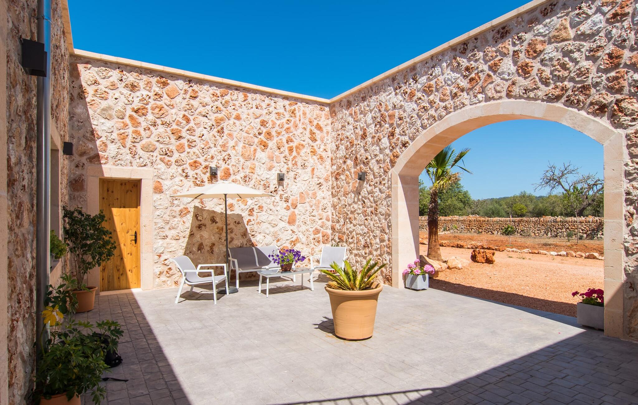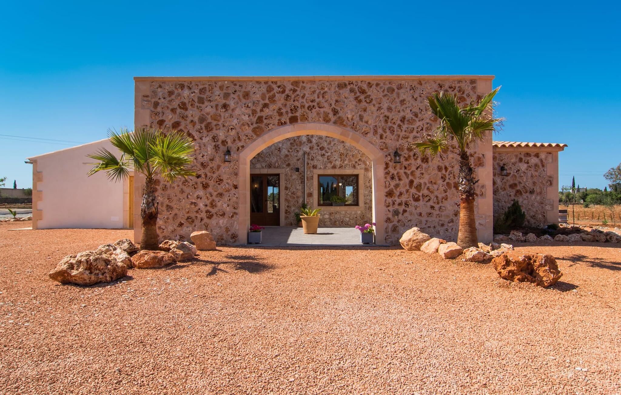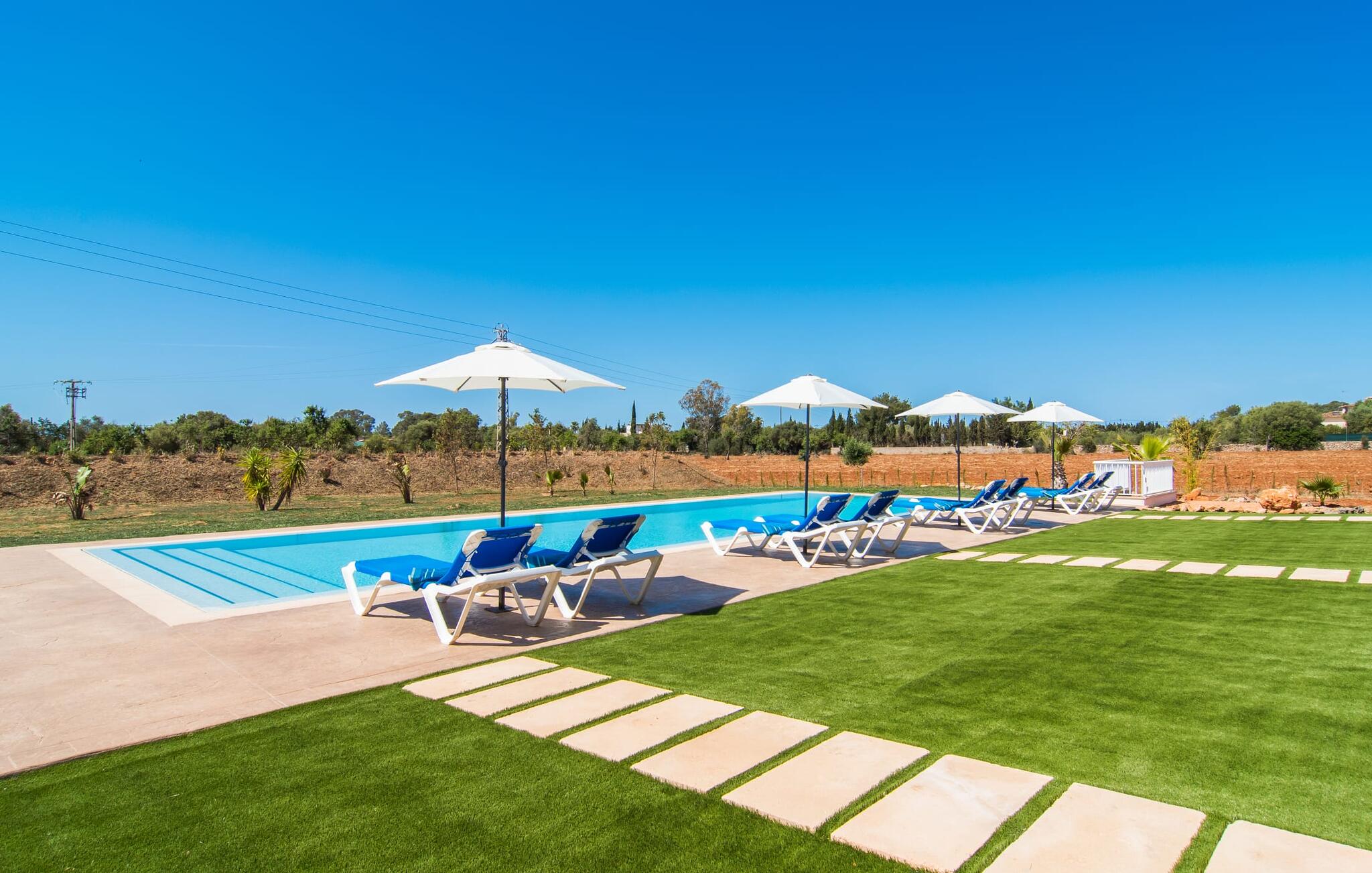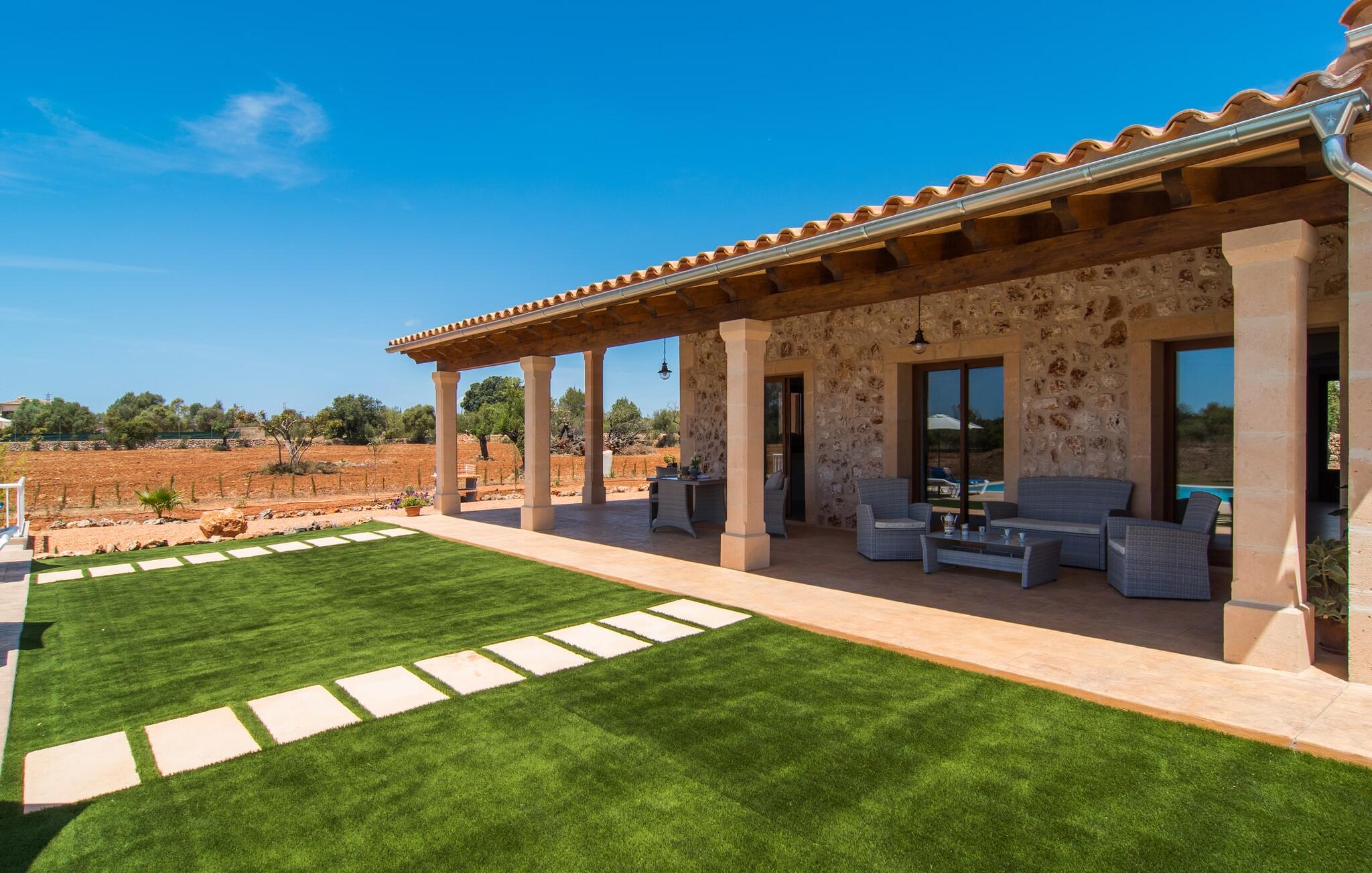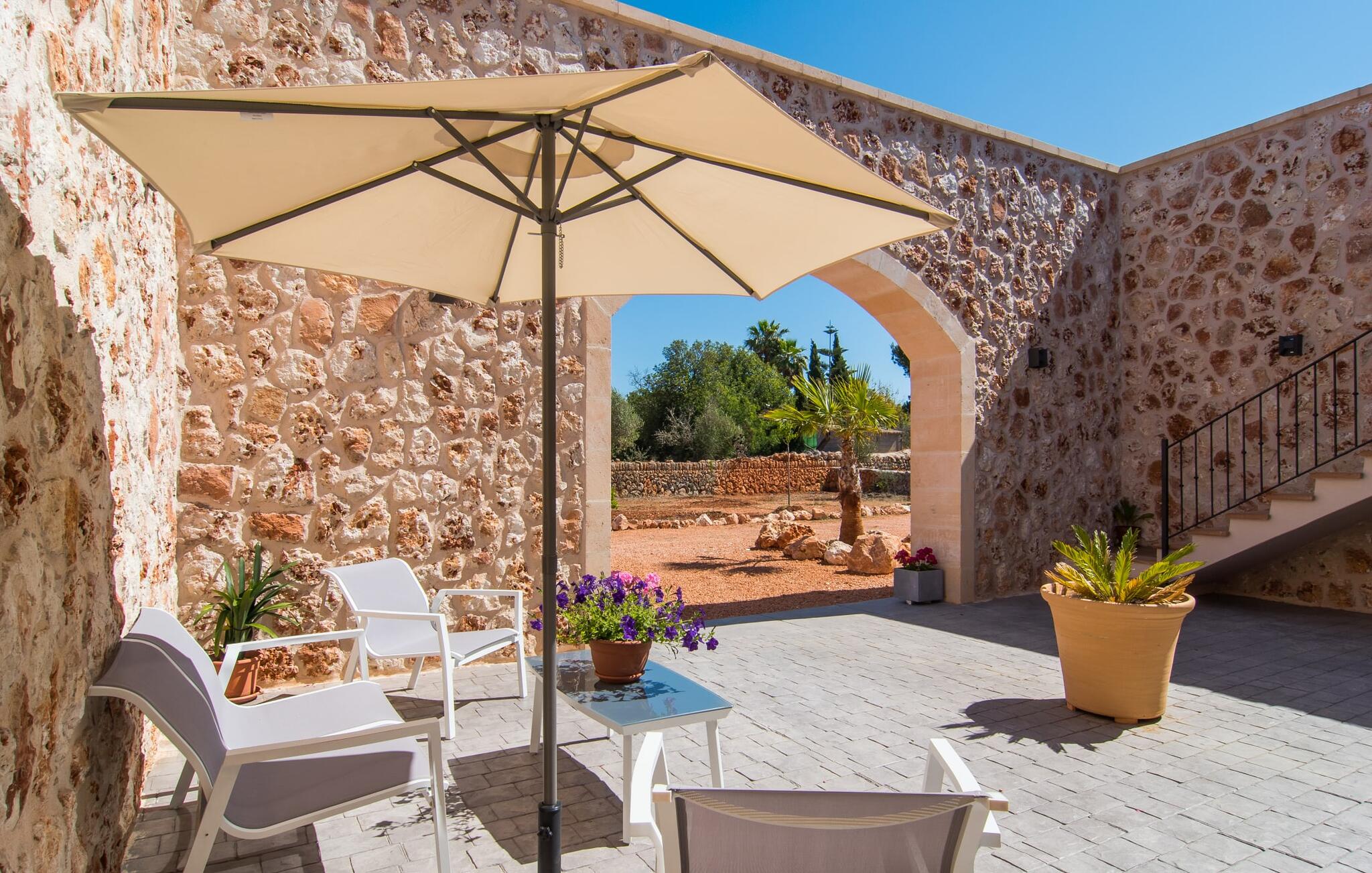 Heerlijk comfortabel en op een geweldige afgelegen locatie omgeven door groen: Villa Son Pieras Nou ligt op slechts een paar kilometer van Llucmajor. In deze prachtige hoek in het zuiden van Mallorca zijn er geen buren of auto`s in zicht: hier kun je genieten van absolute rust en stilte midden in de natuur en naar hartenlust tot rust komen. Het nieuw gebouwde natuurstenen huis ligt op een perceel van 28.000 m² met gazons en veel olijfbomen. Als je graag actief bezig bent, kun je gaan wandelen met je medereizigers of je uitleven met volleybal op het eigen volleybalveld van het huis. Daarna kun je afkoelen in het grote, rechthoekige zwembad met buitendouche, waar kinderen ook graag spetteren en zwemmen. Om een oogje in het zeil te houden, kunnen ouders neerstrijken op een van de comfortabele ligstoelen of in de schaduw zitten op het overdekte terras met verschillende uitnodigende zitjes.