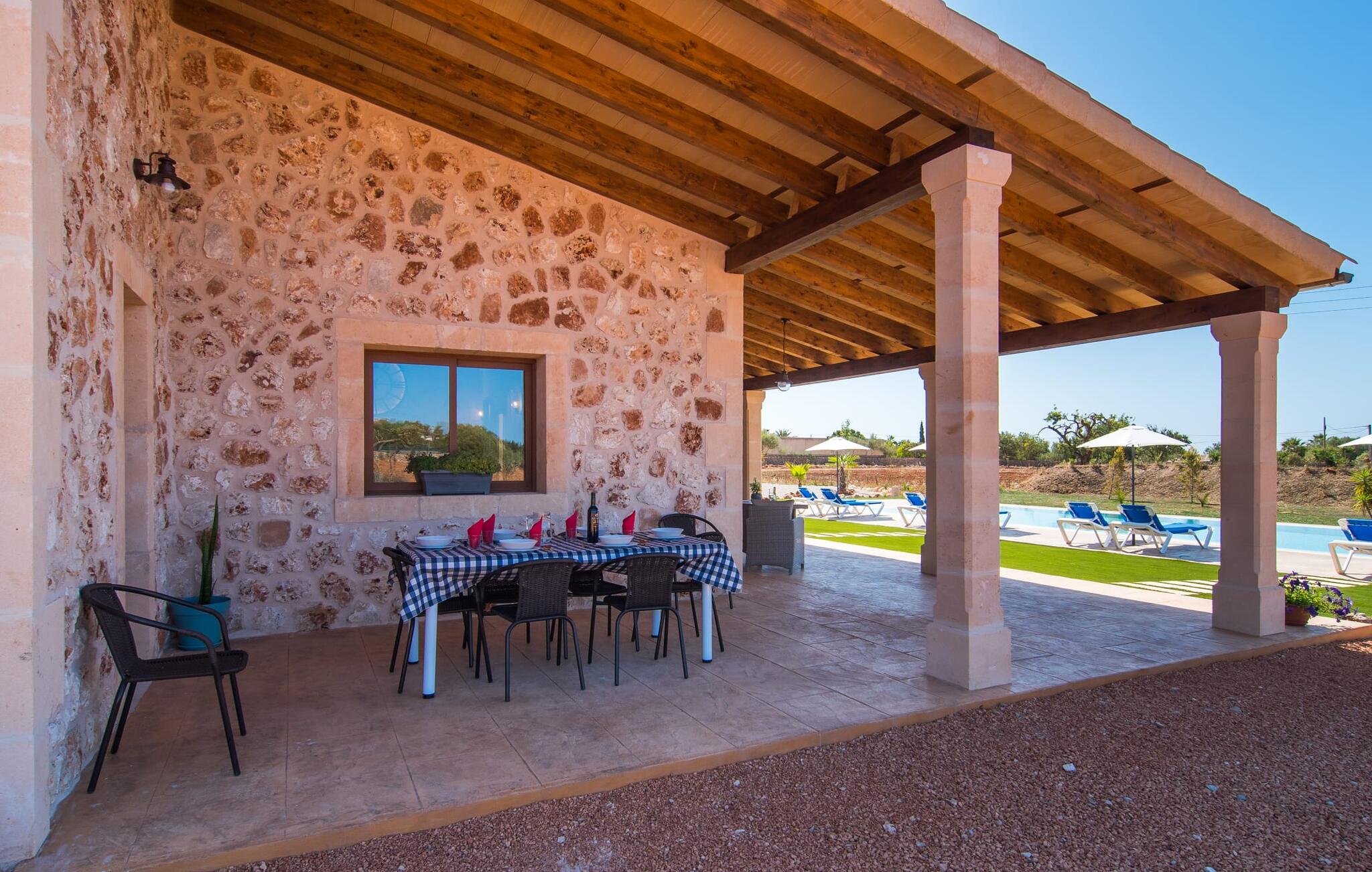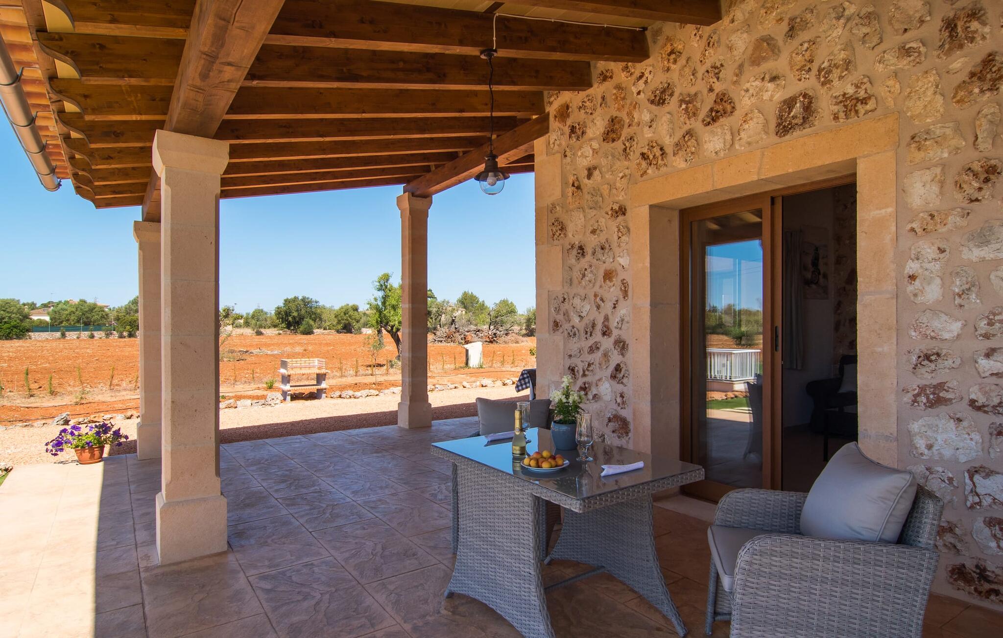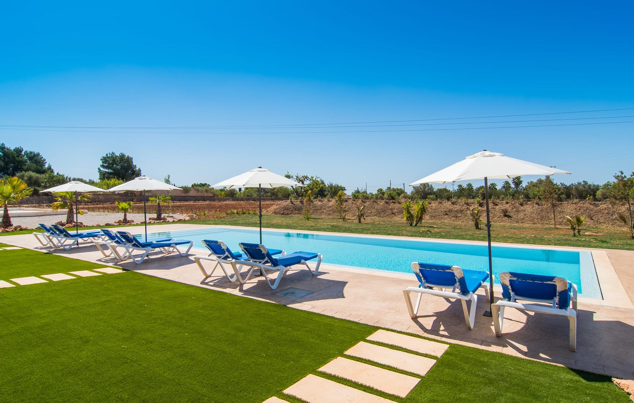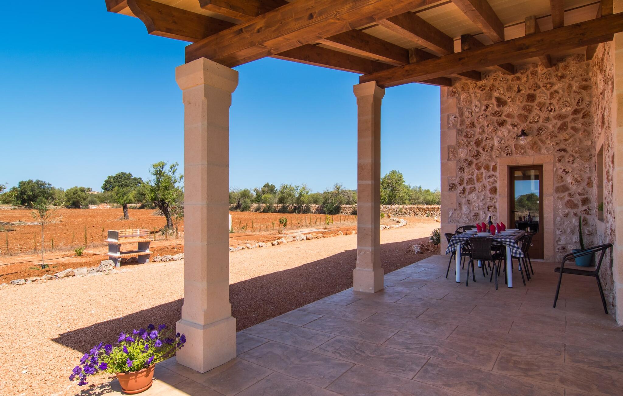 Heerlijk comfortabel en op een geweldige afgelegen locatie omgeven door groen: Villa Son Pieras Nou ligt op slechts een paar kilometer van Llucmajor. In deze prachtige hoek in het zuiden van Mallorca zijn er geen buren of auto`s in zicht: hier kun je genieten van absolute rust en stilte midden in de natuur en naar hartenlust tot rust komen. Het nieuw gebouwde natuurstenen huis ligt op een perceel van 28.000 m² met gazons en veel olijfbomen. Als je graag actief bezig bent, kun je gaan wandelen met je medereizigers of je uitleven met volleybal op het eigen volleybalveld van het huis. Daarna kun je afkoelen in het grote, rechthoekige zwembad met buitendouche, waar kinderen ook graag spetteren en zwemmen. Om een oogje in het zeil te houden, kunnen ouders neerstrijken op een van de comfortabele ligstoelen of in de schaduw zitten op het overdekte terras met verschillende uitnodigende zitjes.