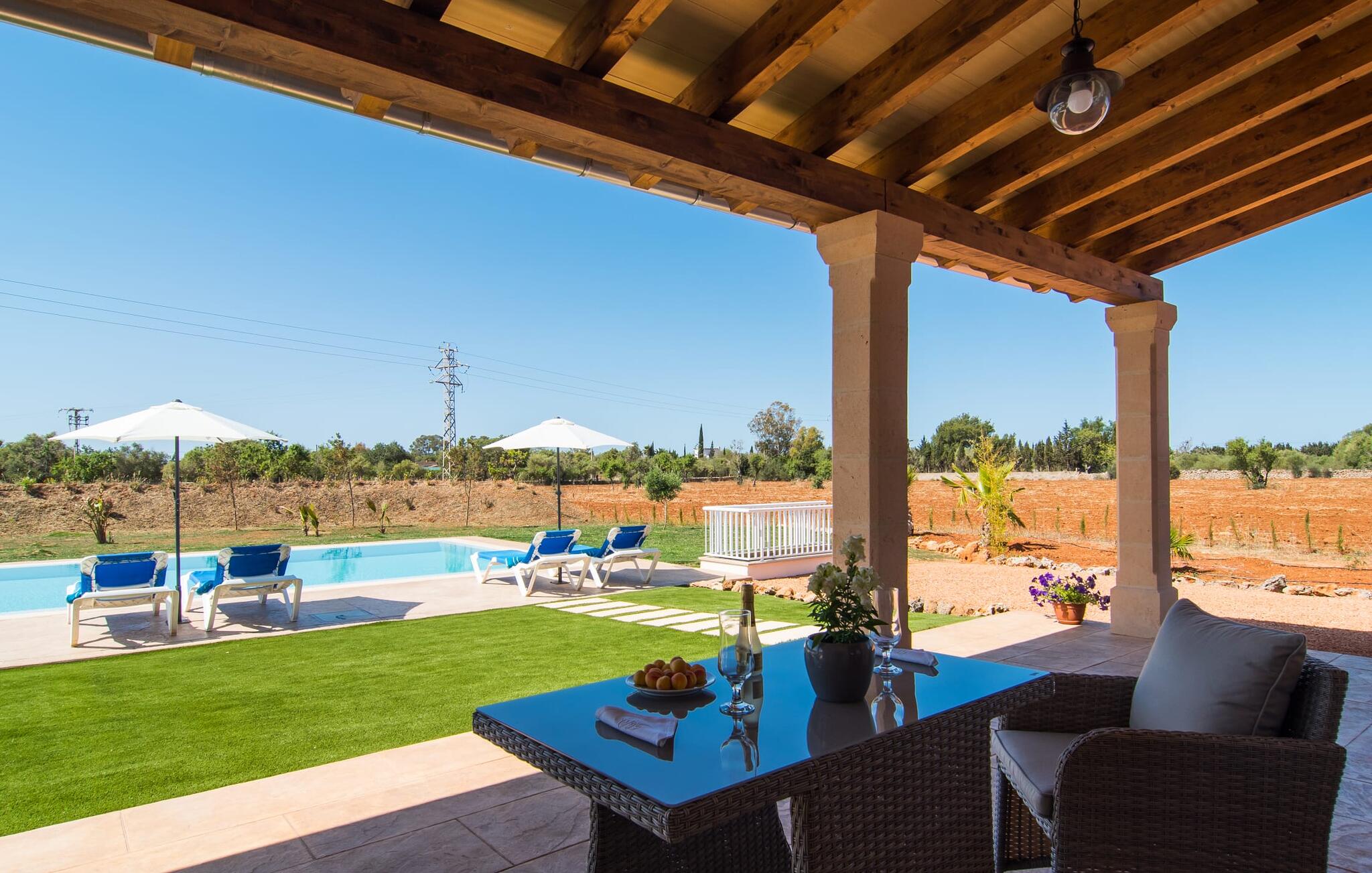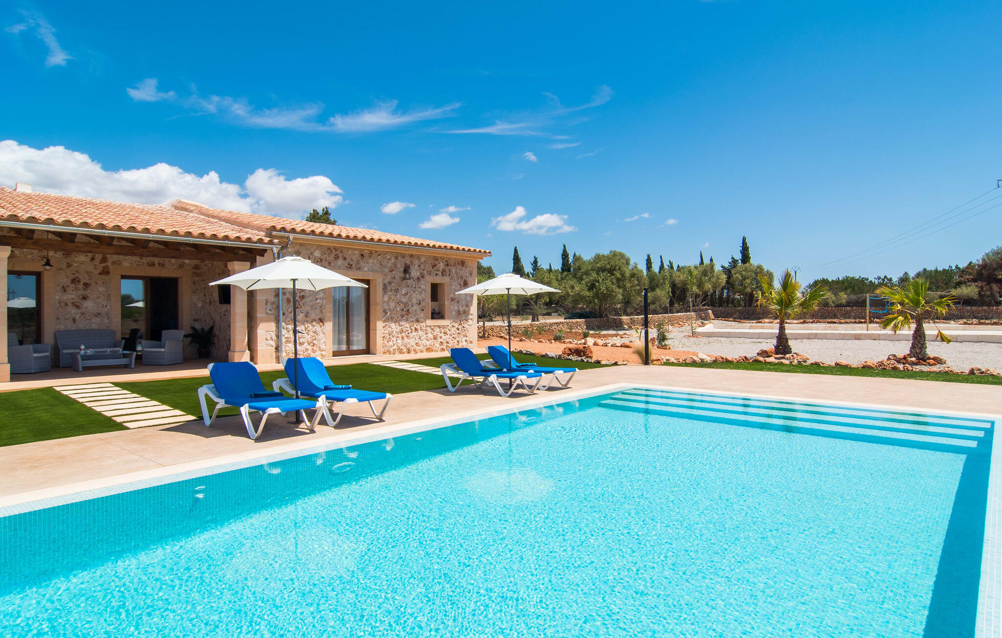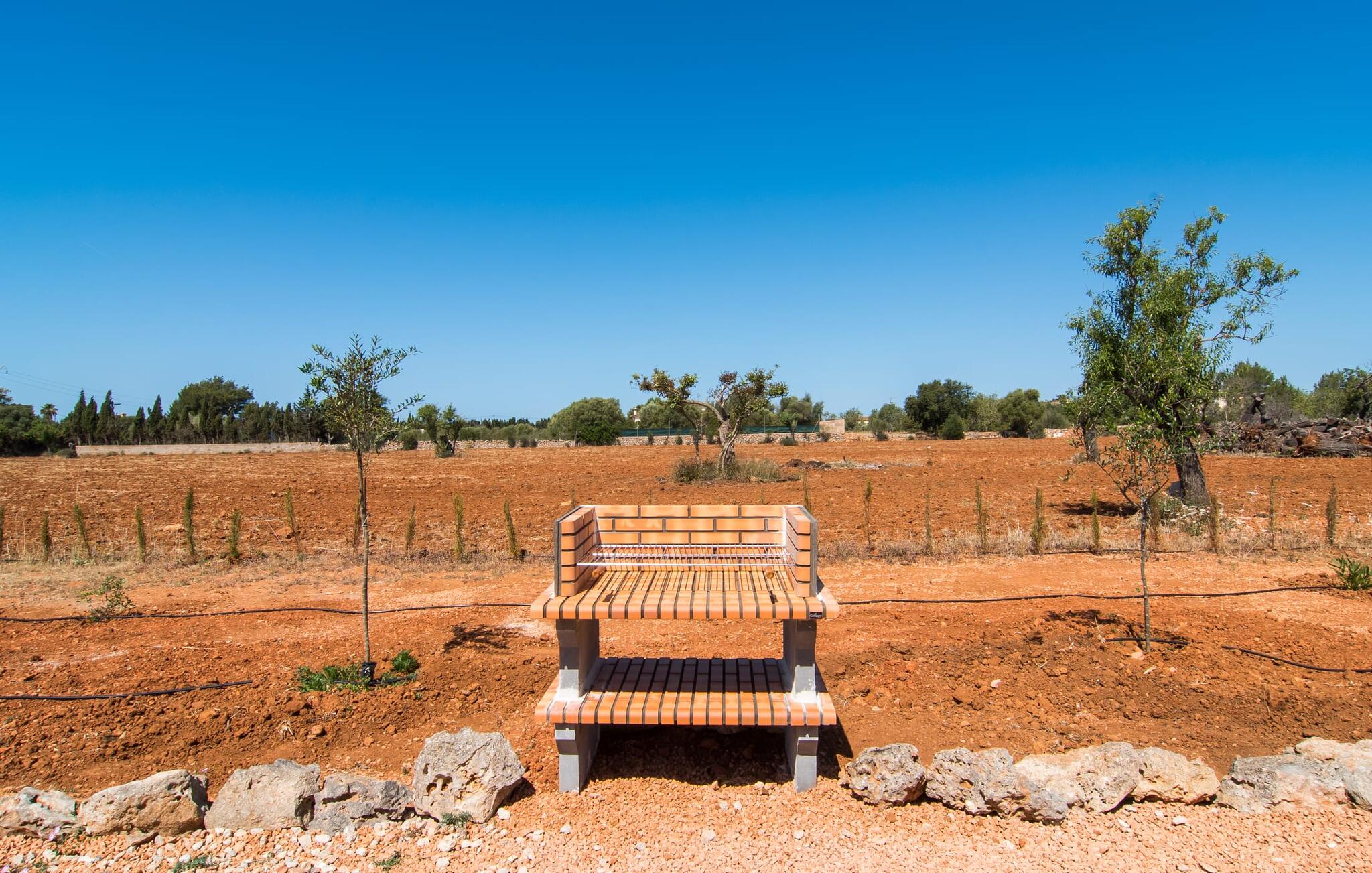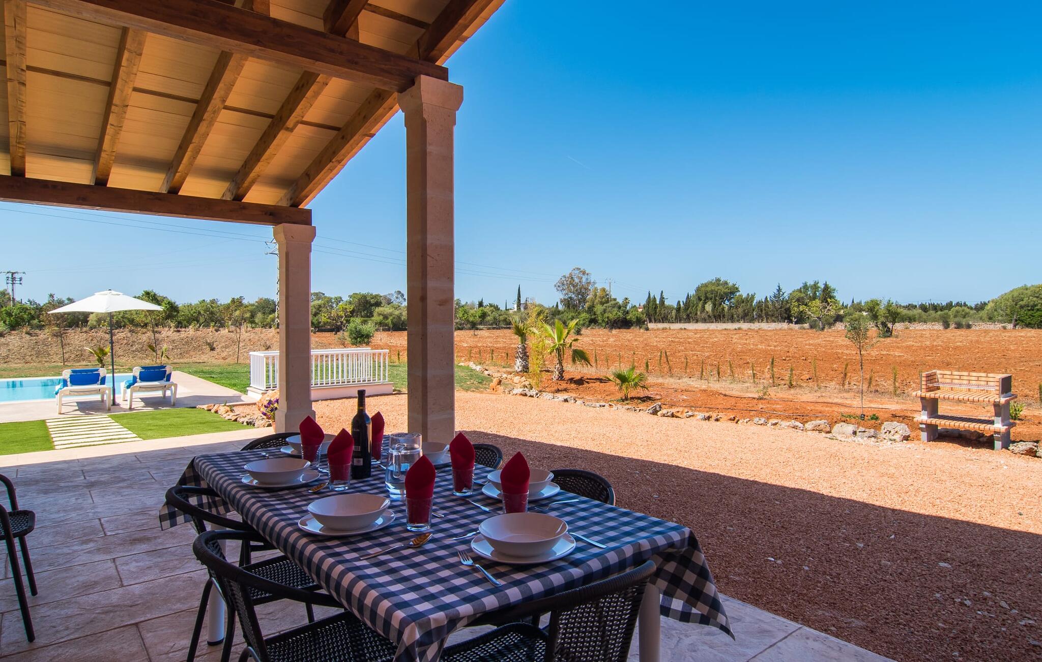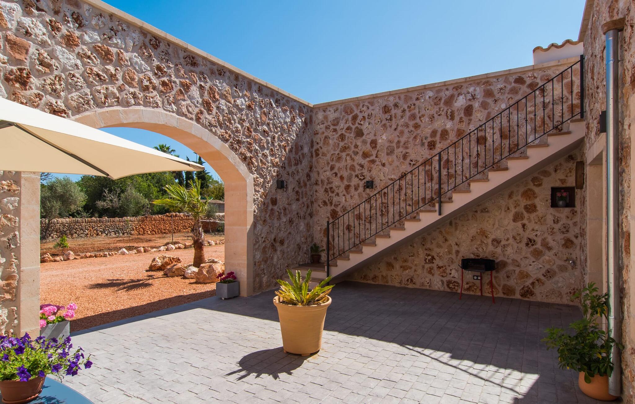 Heerlijk comfortabel en op een geweldige afgelegen locatie omgeven door groen: Villa Son Pieras Nou ligt op slechts een paar kilometer van Llucmajor. In deze prachtige hoek in het zuiden van Mallorca zijn er geen buren of auto`s in zicht: hier kun je genieten van absolute rust en stilte midden in de natuur en naar hartenlust tot rust komen. Het nieuw gebouwde natuurstenen huis ligt op een perceel van 28.000 m² met gazons en veel olijfbomen. Als je graag actief bezig bent, kun je gaan wandelen met je medereizigers of je uitleven met volleybal op het eigen volleybalveld van het huis. Daarna kun je afkoelen in het grote, rechthoekige zwembad met buitendouche, waar kinderen ook graag spetteren en zwemmen. Om een oogje in het zeil te houden, kunnen ouders neerstrijken op een van de comfortabele ligstoelen of in de schaduw zitten op het overdekte terras met verschillende uitnodigende zitjes.
